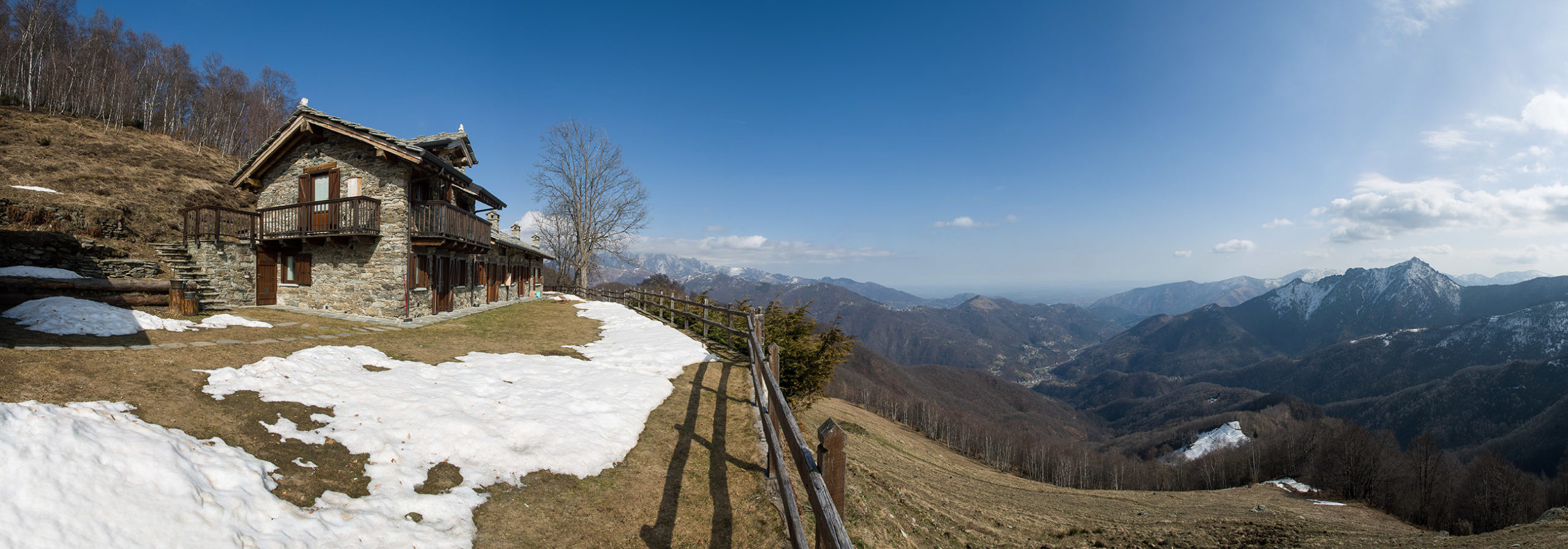 Am Ausgangspunkt kommt man an dem kleinen Weiler Giardino di Mezzenile vorbei. Der Ort war früher dauerhaft bewohnt, die Menschen lebten von der Berglandwirtschaft. Ein grösseres Anwesen wurde vor einigen Jahren renoviert und wird heute noch als Wochenendhaus genutzt, andere Häuser wiederum wurden bereits vor Jahrzehnten ihrem Schicksal überlassen und verfallen oder liegen bereits in Ruinen. Wenige Schritte entfernt auf einer kleiner Lichtung im Wald befindet sich die Cappella del Giardino (1059 m), die sehenswerte Kirche wurde im Jahr 2005 von Einheimischen in ehrenamtlicher Arbeit restauriert. Die Wanderung beginnt gemütlich. Hinter den Häusern von Giardino geht man an der Gabelung vor der Kirche rechts und folgt dem unbefestigten Alpsträsschen bis Sart (1151 m), eine ehemalige Alp, die Hütten werden noch instandgehalten und als Wochenenddomizil genutzt. Dort zweigt ein markierter Weg ab, auf diesem durch lauschigen Buchenwald zu der im Sommer bewohnten Alp von Baudè (1240 m, in manchen Karten auch Baudet genannt), mit schöner Aussicht auf das Bassa Valle und die Tiefebene. Durch Buchen- und Birkenwald geht es weiterhin bergauf, nach einer Weile geht der Pfad in einen grasigen Fahrweg über, den man ein wenig oberhalb bei den Ruinen von L‘Orgeri (1320 m) wieder verlässt. Kurz darauf erreicht man offenes Gelände und steigt über Wiesen und Weiden hinauf zur wunderschön gelegenen Alpe Belvedere (1452 m). Das ehemalige Alpgebäude wurde vor einigen Jahren mit grossem Aufwand restauriert und zu Ferienwohnungen umgebaut. Menschen trifft man hier oben jedoch nur selten. Der klangvolle Name ist schlichtweg Programm, von der aussichtsreichen Sonnenterrasse geniesst man fantastische Weitblicke. Wem das Panorama noch nicht reicht, von hier lohnt ein Abstecher auf den nahen Gipfel der Testa della Cialma (+1,5 Std. hin und zurück, > siehe hier).