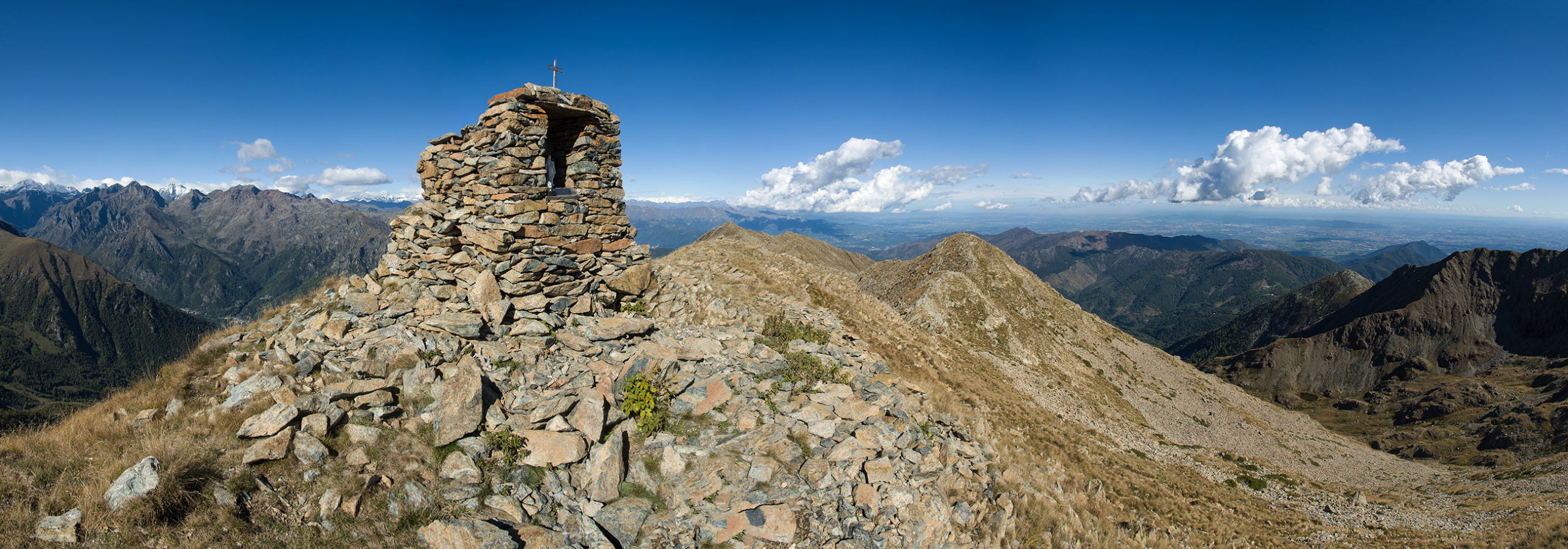 Jenseits des Dorfes verschwindet der Weg alsbald im Wald, durch verwildertes Kulturland geht es zunächst gemächlich bergauf. Bei den Ruinen der Muande Costassa (1295 m) erreicht man eine kleine Hochebene, vor einem liegt das menschenleere Vallone del Civrari, durch das der weitere Aufstiegsweg führt. Zunächst macht der Weg jedoch einen Schlenker Richtung Süden, zwischen verstreuten Birken wandert man durch Weideland hinauf zur Alpe Frestè (1431 m), die sich auf einer aussichtsreichen Alphochfläche befindet. Das Gebimmel der Kuhglocken begrüsst einen schon von weitem. Die bellenden Hütehunde erledigen prompt die „Anmeldung“ bei der hier in den Sommermonaten lebenden Familie. Eine wunderbare Begegnung mit freundlichen und aufgeschlossenen Menschen. Nach einer gemütlichen Rast lässt man die Zivilisation hinter sich, die Marschrichtung der nächsten Stunden lautet bergwärts. Der Weg windet sich durch zunächst lichten Birkenwald nach oben, das Ziel bereits vor Augen, der lange flache Gipfelgrat des Monte Civrari. Aber bis dahin ist noch gutes Stück des Weges. Jenseits der Baumgrenze wird der Weg steiler und steiniger, an einigen Stellen führt er über schräge Felsplatten, die bei Nässe rutschig sind. Nach etwa zwei Stunden erreicht man eine weite Hochfläche mit dem idyllischen Laghetto del Civrari (1956 m). Der Weg knickt Richtung Westen ab und schraubt sich in unzähligen Kehren durch viel Geröll in einer weiteren Stunde hinauf zur Punta Imperatoria, dem Westgipfel des Monte Civrari (2302 m). Von hier oben sieht man die Welt, wie bereits eingangs erwähnt. Im Norden der Gran Paradiso (4061 m), im Westen der Alpenhauptkamm vom Rocciamelone (3538 m) bis zur Bessanese (3604 m), im Nordosten zeigt sich das Monte Rosa-Massiv (4634 m). Im Osten erstreckt sich die piemontesische Tiefebene, mit etwas Glück sieht man die Millionenmetropole von Turin. Im Süden grüsst der Monviso (3841 m), bei klarem Wetter reicht der Blick bis in die Seealpen.