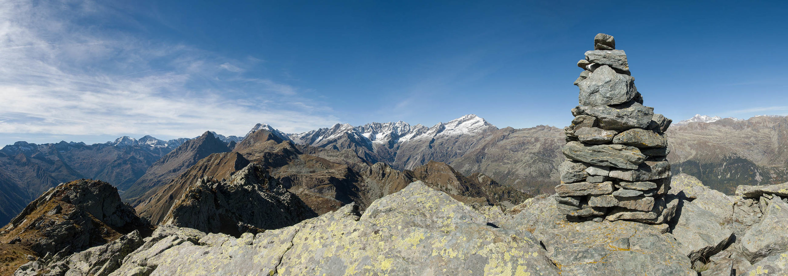 Der weitere Aufstieg verläuft entlang der Südflanke des Monte Doubia durch teils verbuschendes Weideland, am Wegesrand verstreute Birken, Alpenrosen und Heidelbeeren. Hier und da windet sich die Pfad durch hohes Gras, bei warmem Sommerwetter ziemlich schweisstreibend. Nach einer guten Stunde und weiteren 360 Höhenmetern erreicht man den Colle d‘Attia (2104 m). Am Pass verlässt man bei einem auffälligen freistehenden Felsbrocken den markierten Weg. Der Schlussanstieg durch die grasige Südostflanke des Monte Doubia ist steil und abschnittsweise mühsam, Steinmännchen weisen den richtigen Weg. Zwischendurch müssen eine paar kleinere Blockfelder überquert werden, ab und zu benötigt man die Hände zur Hilfe, hier ist Trittsicherheit erforderlich. Weiter oben erwartet einen ein aprupter Landschaftswechsel, vor einem das weite und sanft gewellte Gipfelplateau des Monte Doubia. Die restlichen Meter bis zum eigentlichen Gipfel sind eindeutig und bei normalen Sichtverhältnissen leicht zu finden. Als Orientierungshilfe dient der riesige Steinmann auf dem nördlich einer von Steinen und Felsbrocken übersäten Hochfläche befindlichen langen Grat, den man in einer weiteren Viertelstunde ohne weitere Schwierigkeiten erreicht. 2463 m Seehöhe. Ein Ort zwischen Himmel und Erde, wohltuende Stille, die Gedanken sind frei. Das Panorama auf die Gipfelkulisse der Valli di Lanzo ist umfassend und eindrücklich. Im Westen der Alpenhauptkamm, auf dem die Grenze zwischen Italien und Frankreich verläuft, im Norden erhebt sich die Gran-Paradiso-Gruppe (4061 m). Im Süden zeigt sich der Monviso (3841 m), der höchste Berg der Südalpen. Bei klarem Wetter blickt man bis in die Po-Ebene und in die Seealpen.