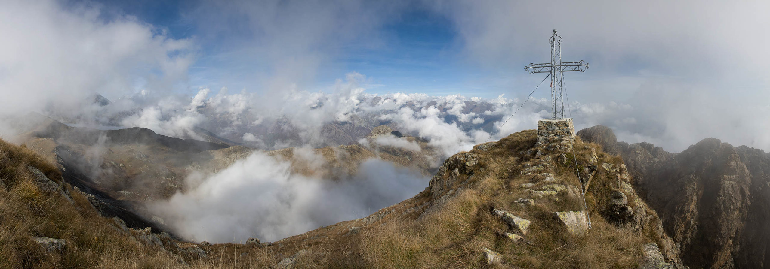 Wem das tolle Panorama noch nicht reicht, macht sich auf den Weiterweg. Am Colle Pian Fium beginnt eine anfangs undeutliche Wegspur, auf der man Richtung Osten über einen grasigen Rücken zunächst etwa 50 Höhenmeter absteigt. Der verbleibende halbstündige Aufstieg zum Gipfel führt auf nun klar erkennbaren und gut markiertem Pfad entlang des Westgrats. Der Weg ist an keiner Stelle ausgesetzt, zwischendurch müssen lediglich zwei kleinere Blockfelder überquert werden, was bei trockener Witterung unschwierig ist. Nach einem steilen Schlussanstieg erreicht man schliesslich das grosse, im Jahr 2021 neu errichtete Gipfelkreuz auf der Rocca Moross (2135 m). Zur Belohnung gibt es ein atemberaubendes 360°-Panorama, fern am Horizont verlieren sich Zeit und Raum. Im Nordwesten dominiert die Uja di Ciamarella (3676 m), der höchste Gipfel der drei Lanzo-Täler. Im Norden erhebt sich majestätisch der Gran Paradiso (4061 m) mit all seinen Trabanten, im Nordosten das vergletscherte Monte Rosa-Massiv. Im Süden zeigt sich der Monviso (3841 m), die höchste Erhebung der Südalpen, bei klarem Wetter blickt man bis in die Seealpen. Im Osten erstreckt sich die piemontesische Tiefebene. Höhen und Tiefen, soweit das Auge reicht.