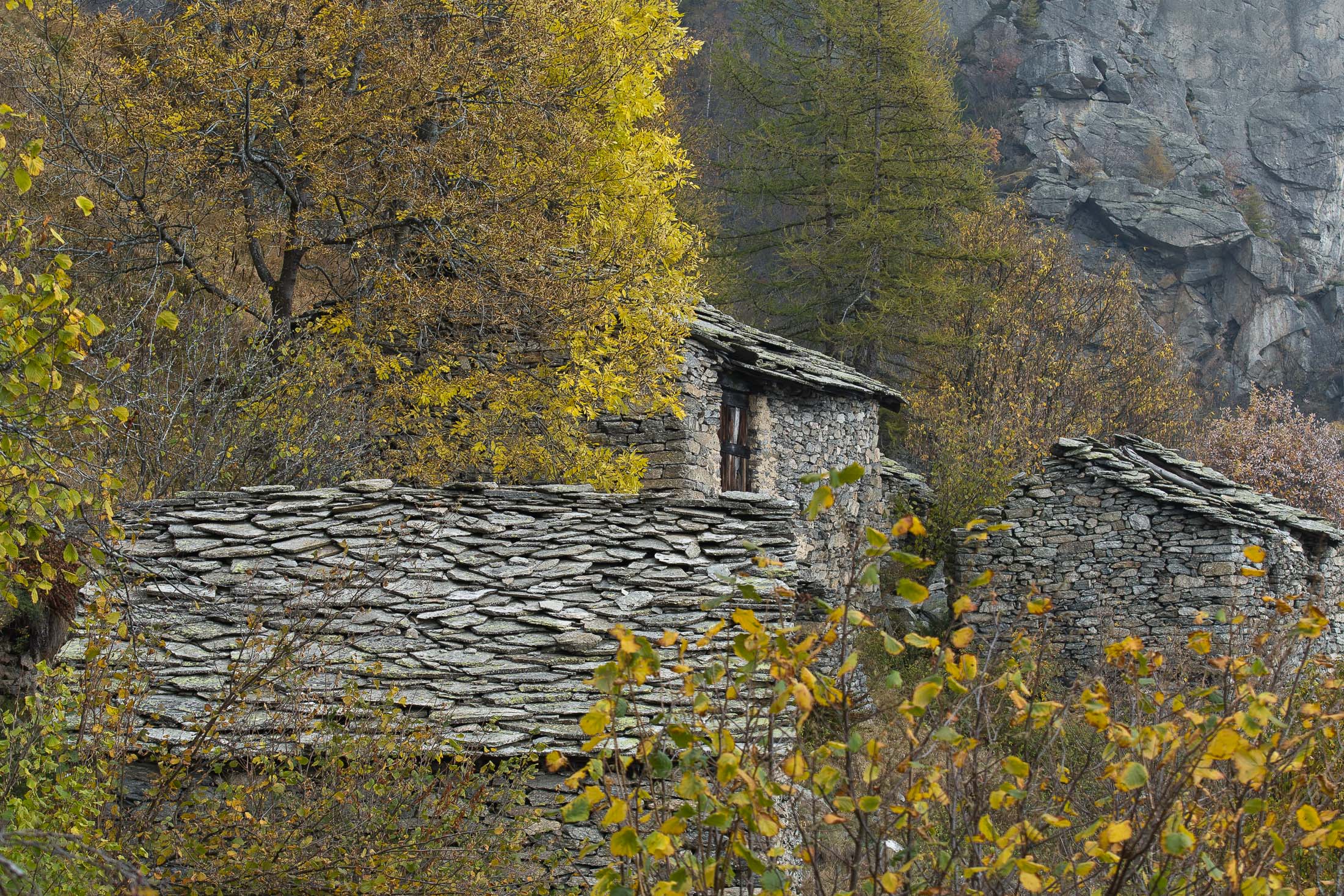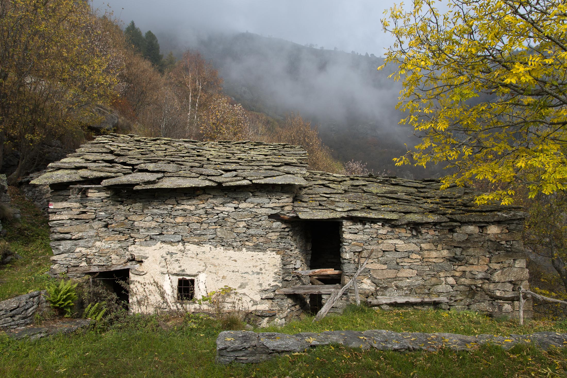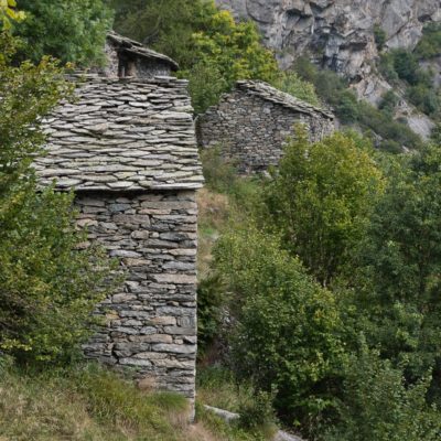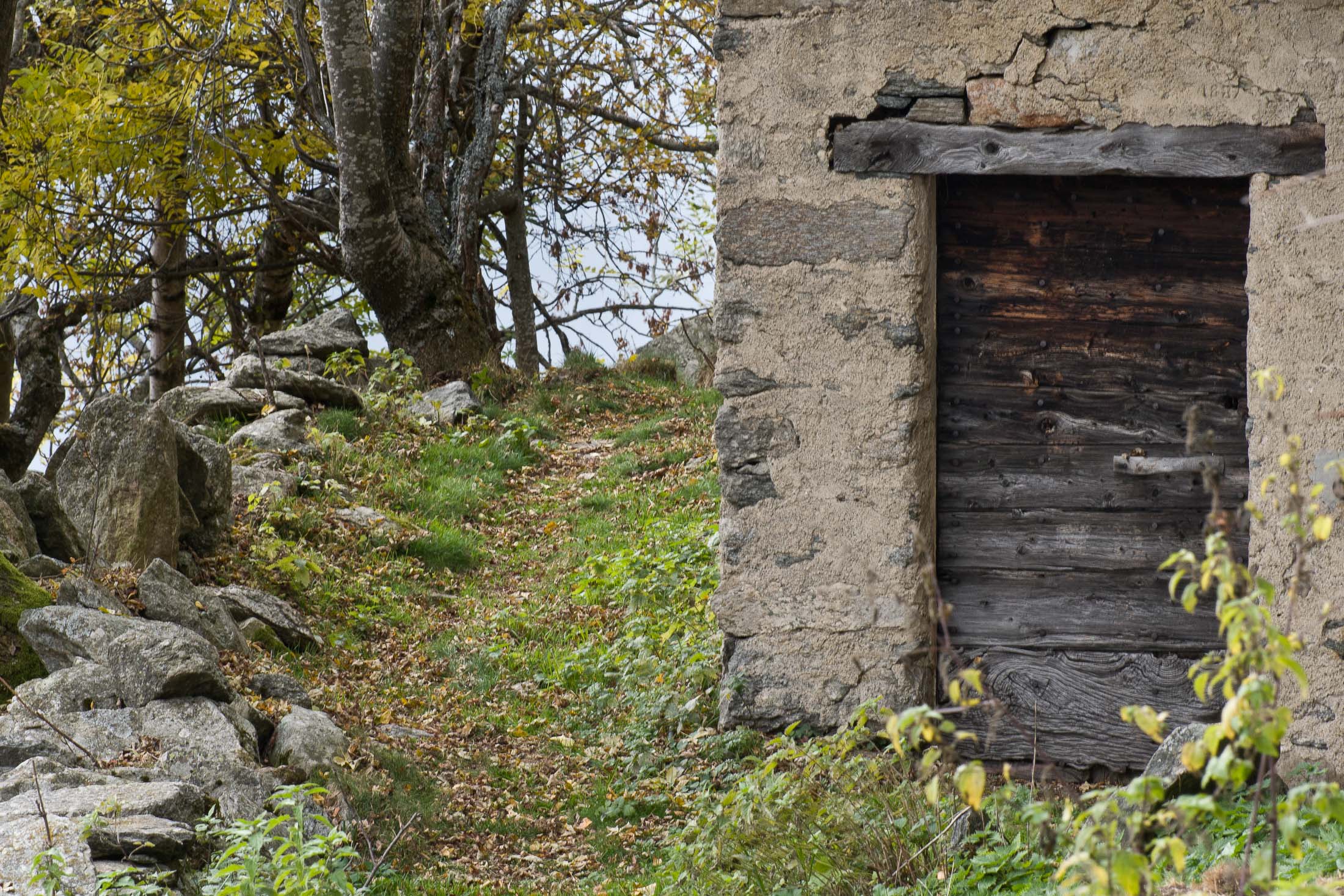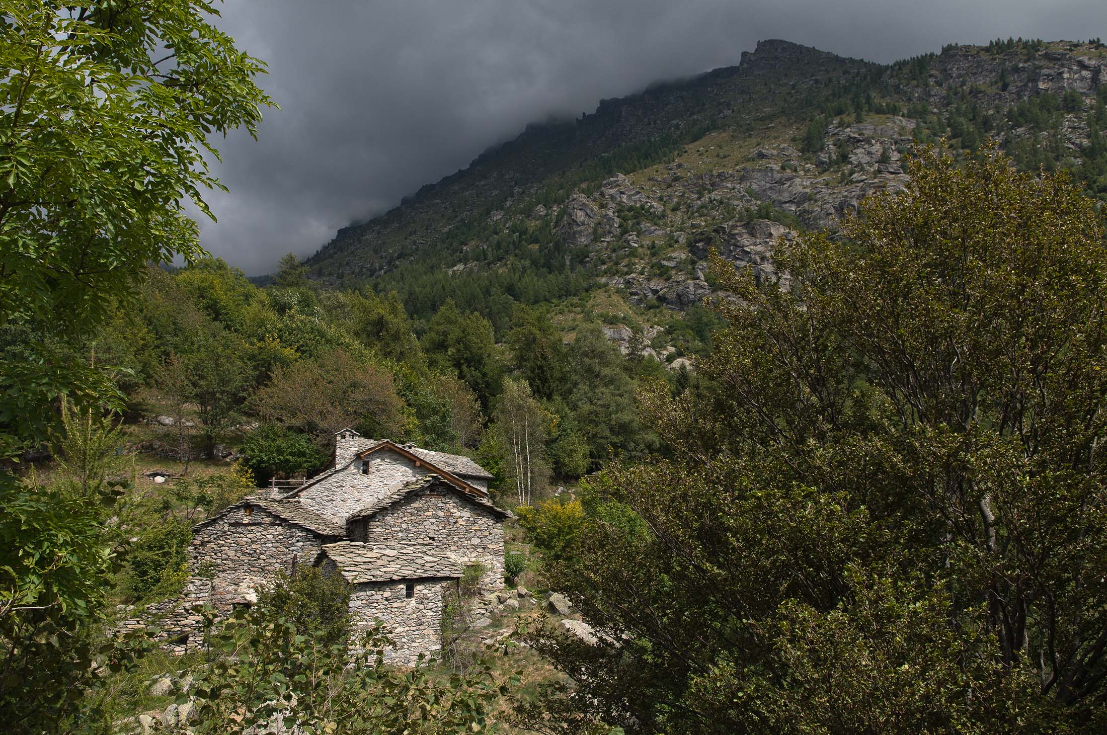 Von Mea geht es wenige Höhenmeter abwärts bis zu einer hölzernen Brücke, die über den Rio Unghiasse führt. Schäumendes Gewässer und viel Getöse, ringsherum riesige Felsbrocken. Etwas unterhalb des Wasserfalls, unweit der Hütten von Mansonetta, befinden sich einige herrliche Badegumpen, die zu einer eiskalten Erfrischung einladen. Jenseits des Bergbaches steigt der Weg nun im Buchenwald an, am Wegesrand die beiden Alpgebäude von La Foggi (1541 m), im Gelände und in den einschlägigen Karten fälschlicherweise als Mansonetta bezeichnet. Weiter hinauf nach Biollè (1598 m), eine heute aufgegebene kleine Temporärsiedlung auf einer grossen Lichtung. Einige der verstreuten Hütten und Ställe liegen bereits in Ruinen, das umliegende Kulturland liegt brach und verbuscht im Laufe der Jahre infolge der Nichtnutzung. Eine vergessene Welt. Man blickt auf morsches Gebälk, was eines Tages unter der Last der schweren Dachplatten zusammenbricht. Die Stille ist wohltuend und macht zugleich nachdenklich.