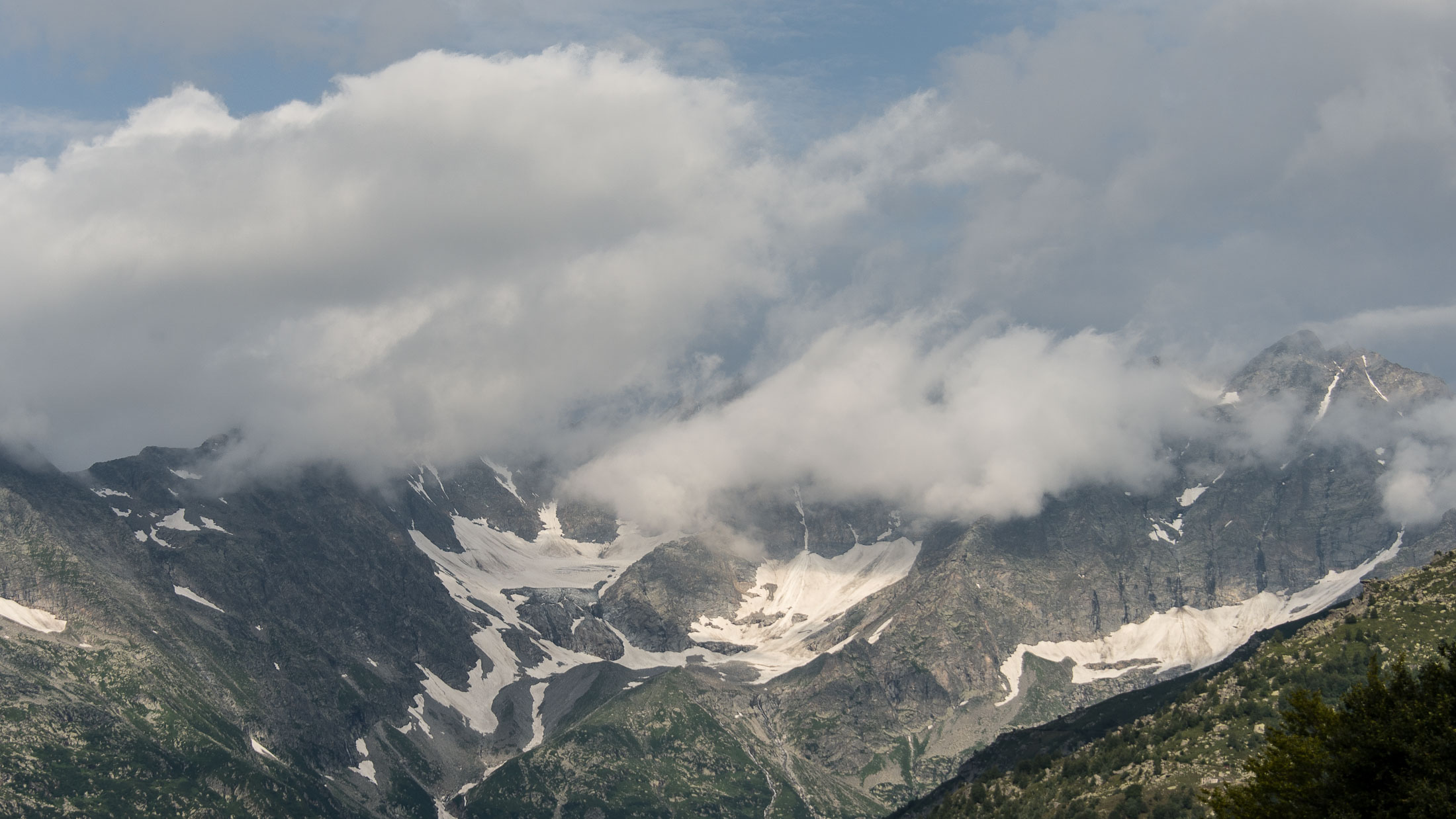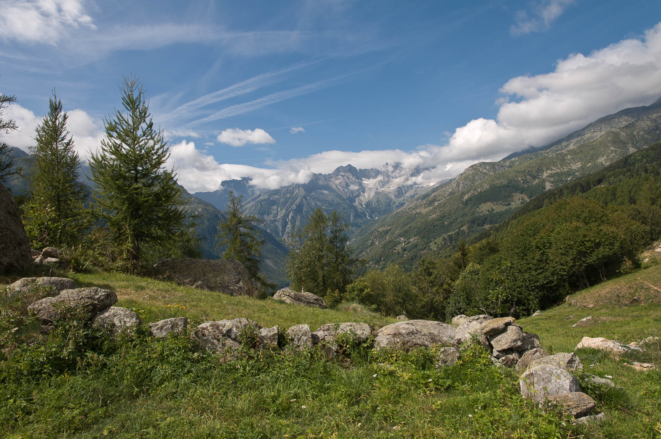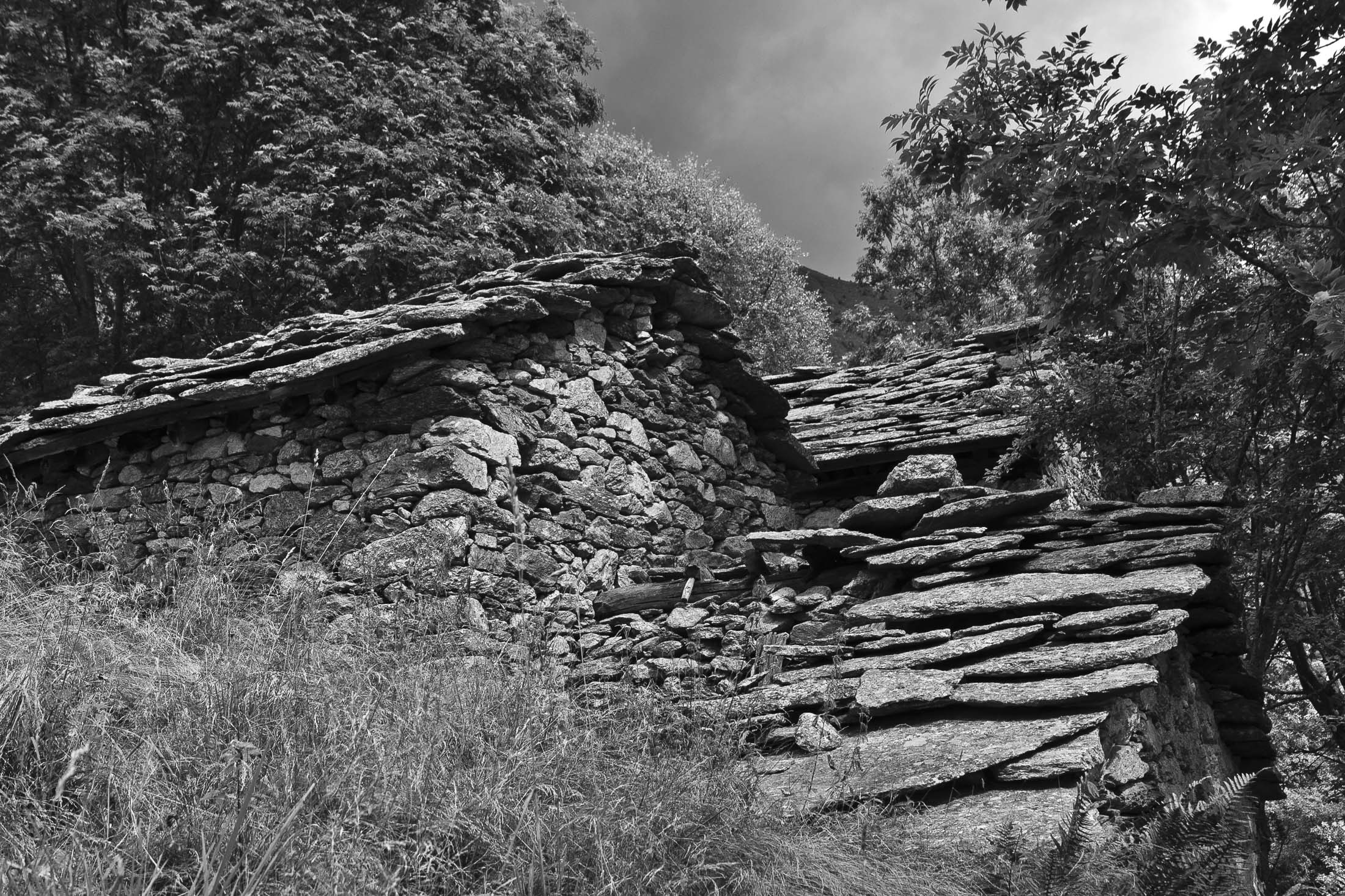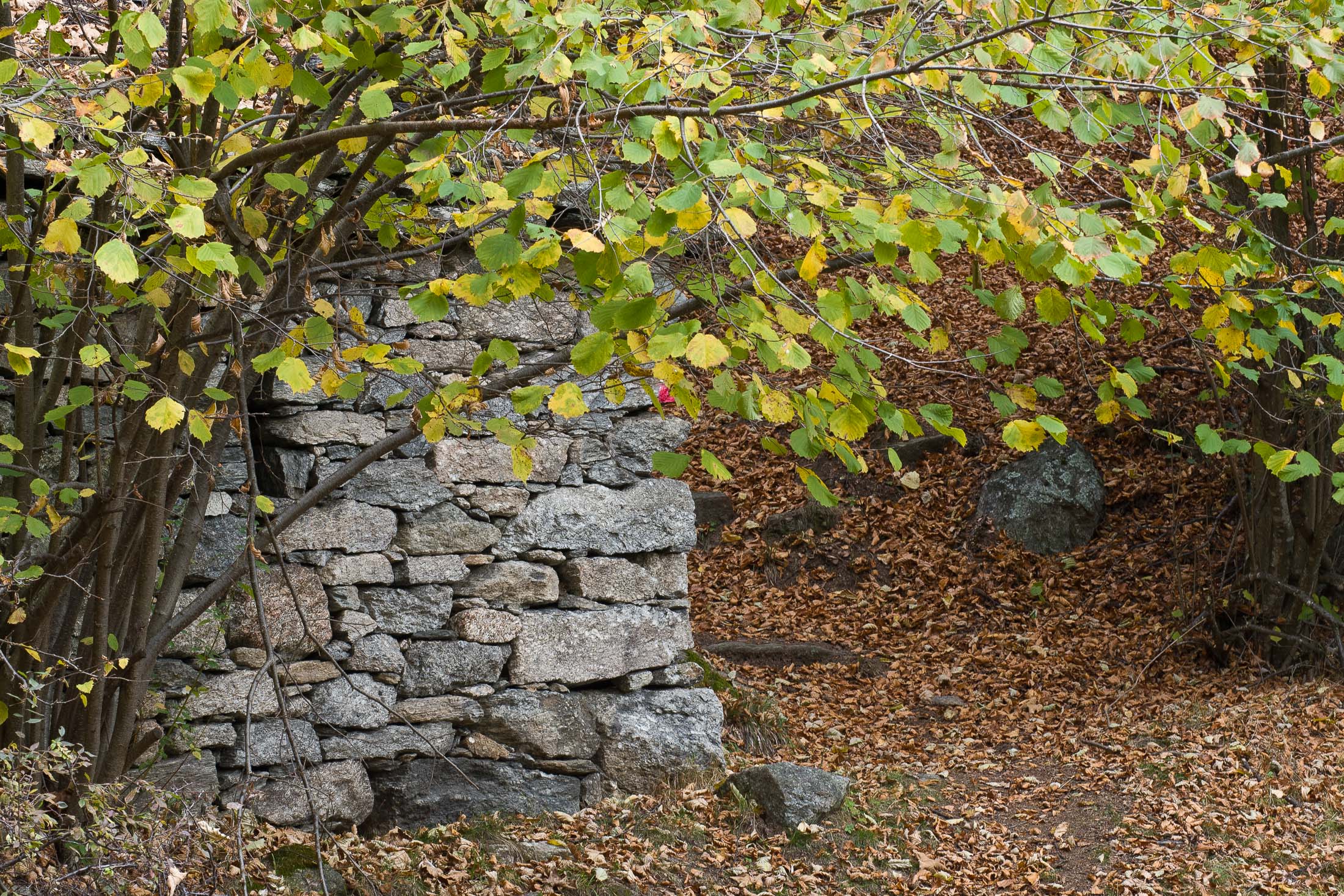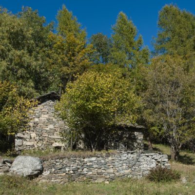 Von Mea geht es wenige Höhenmeter abwärts bis zu einer hölzernen Brücke, die über den Rio Unghiasse führt. Schäumendes Gewässer und viel Getöse, ringsherum riesige Felsbrocken. Etwas unterhalb des Wasserfalls, unweit der Hütten von Mansonetta, befinden sich einige herrliche Badegumpen, die zu einer eiskalten Erfrischung einladen. Jenseits des Bergbaches steigt der Weg nun im Buchenwald an, am Wegesrand die beiden Alpgebäude von La Foggi (1541 m), im Gelände und in den einschlägigen Karten fälschlicherweise als Mansonetta bezeichnet. Weiter hinauf nach Biollè (1598 m), eine heute aufgegebene kleine Temporärsiedlung auf einer grossen Lichtung. Einige der verstreuten Hütten und Ställe liegen bereits in Ruinen, das umliegende Kulturland liegt brach und verbuscht im Laufe der Jahre infolge der Nichtnutzung. Eine vergessene Welt. Man blickt auf morsches Gebälk, was eines Tages unter der Last der schweren Dachplatten zusammenbricht. Die Stille ist wohltuend und macht zugleich nachdenklich.