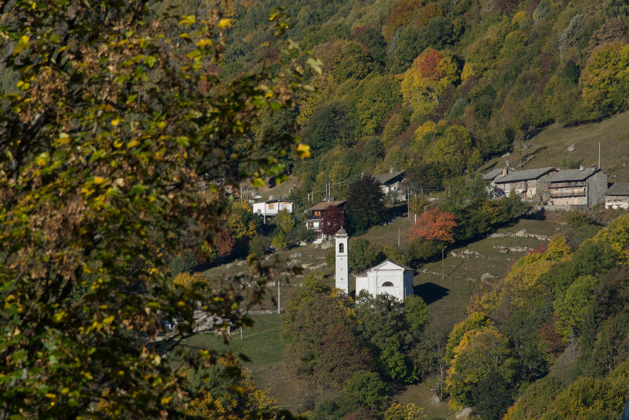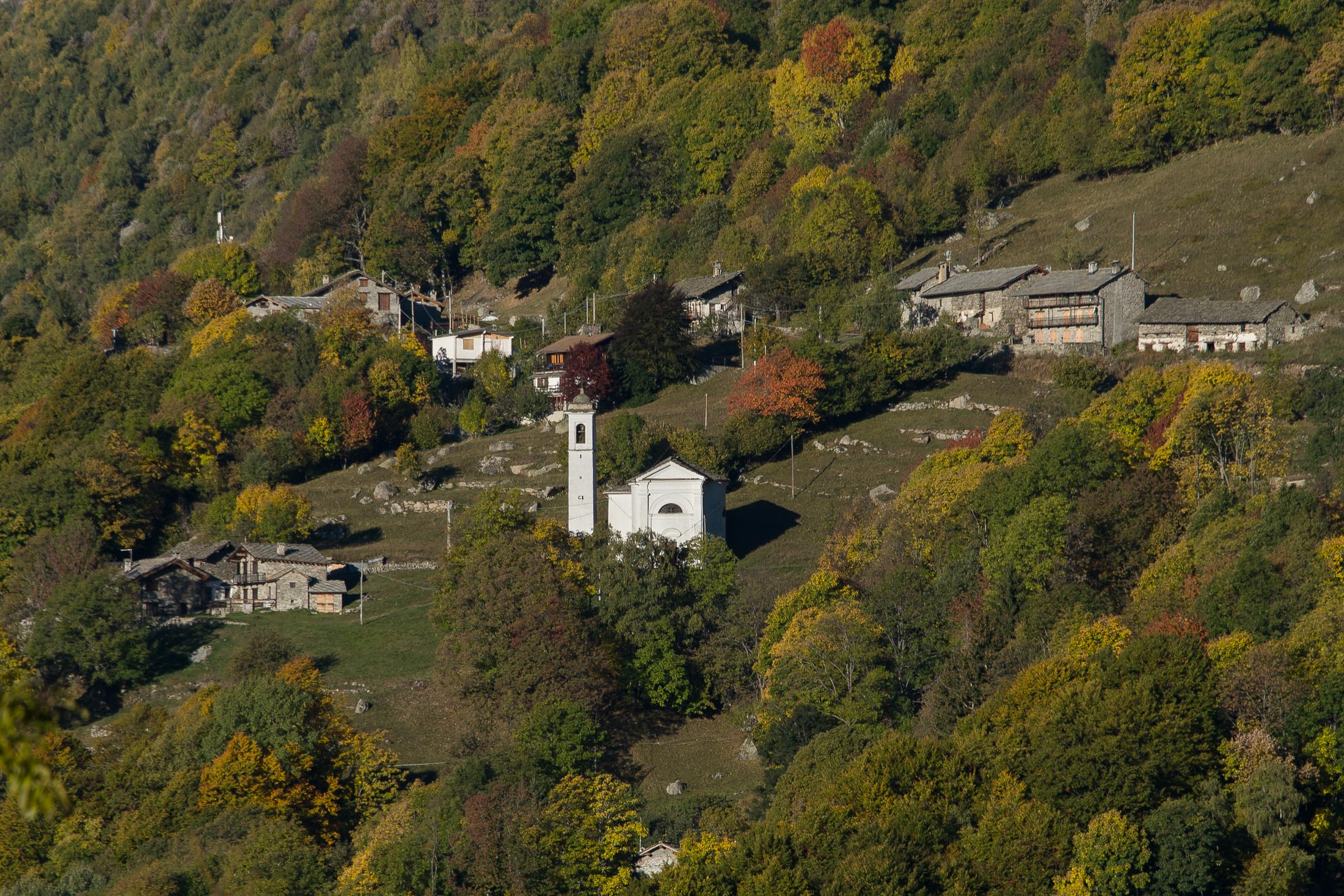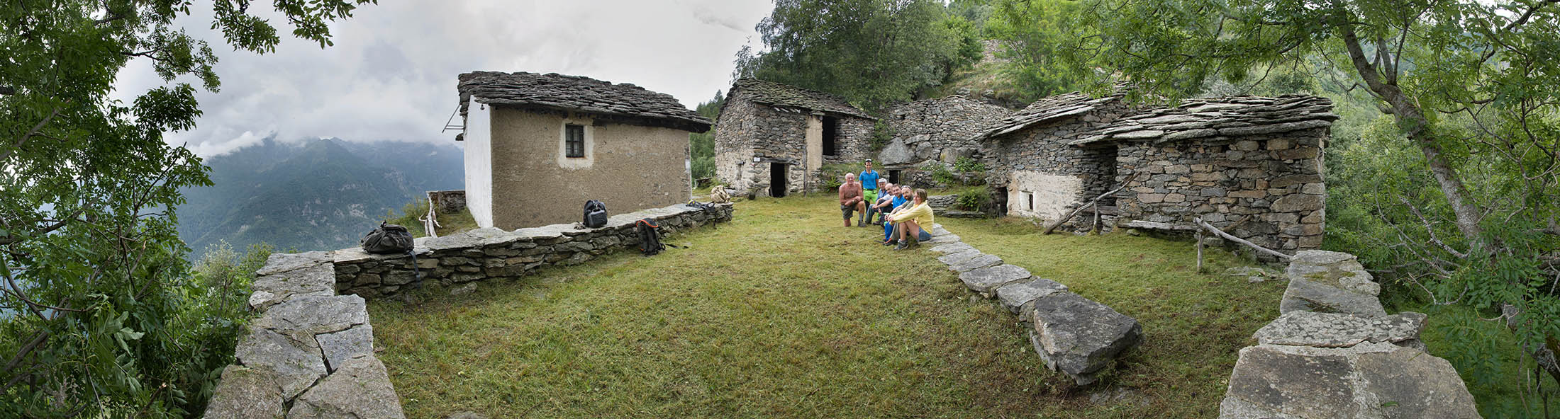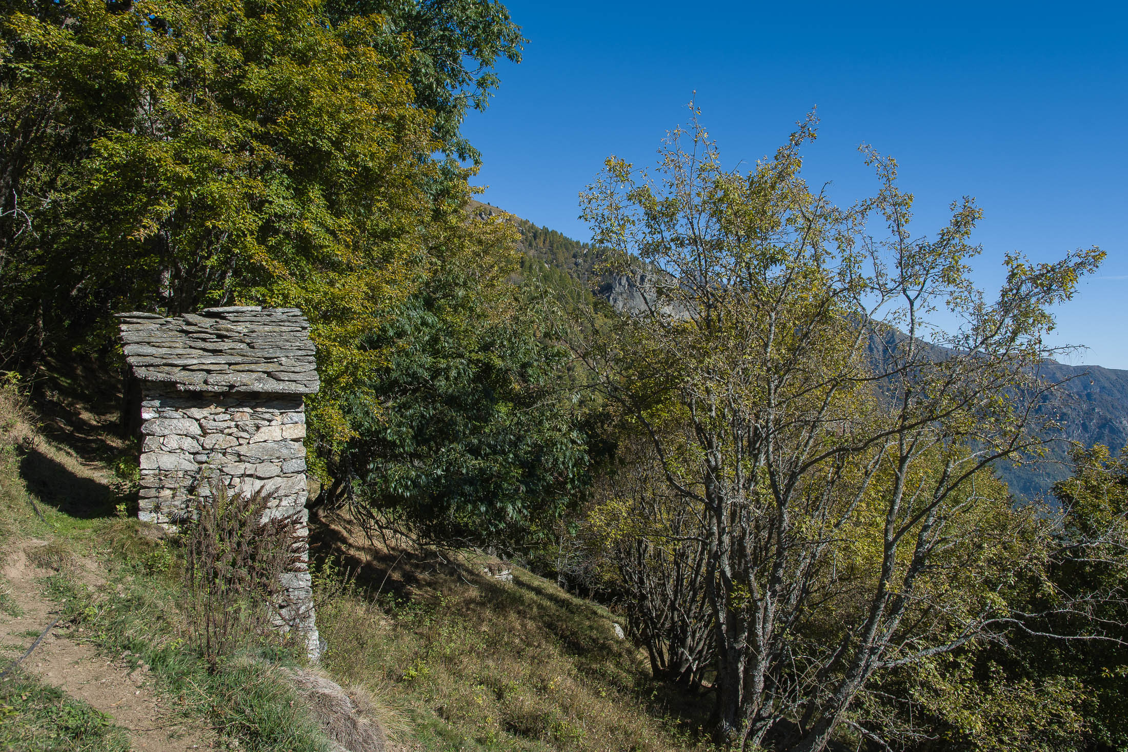 Der Weiterweg verschwindet zunächst wieder im Wald. Nach einer felsigen Geländestufe, die auf einer Treppe überwunden wird, überquert man einen kleinen Seitenbach. In einigem Auf und Ab erreicht man schliesslich den heute verlassenen Ort La Frassa (1601 m) mit seiner kleinen Kirchenkapelle, die auf einem Felsvorsprung unmittelbar am Abgrund steht. Vor hundert Jahren blühte hier das Leben. Auch La Frassa ist eine sogenannte Temporärsiedlung und war bis vom Frühjahr bis zum Herbst von zahlreichen Familien dauerhaft bewohnt, die von der Berglandwirtschaft lebten. Heute steht man in einem Geisterdorf, was von der immer näher rückenden üppigen Vegetation bedrängt wird. Die meisten der Häuser und Ställe sind dem Verfall preisgegeben. Die in der Nähe befindlichen einst mühsam kultivierten Ackerbauterrassen sind völlig verwildert, die umliegenden Viehweiden sind bereits von Gestrüpp und vielen Birken überwuchert und werden eines Tages völlig im Wald verschwunden sein.