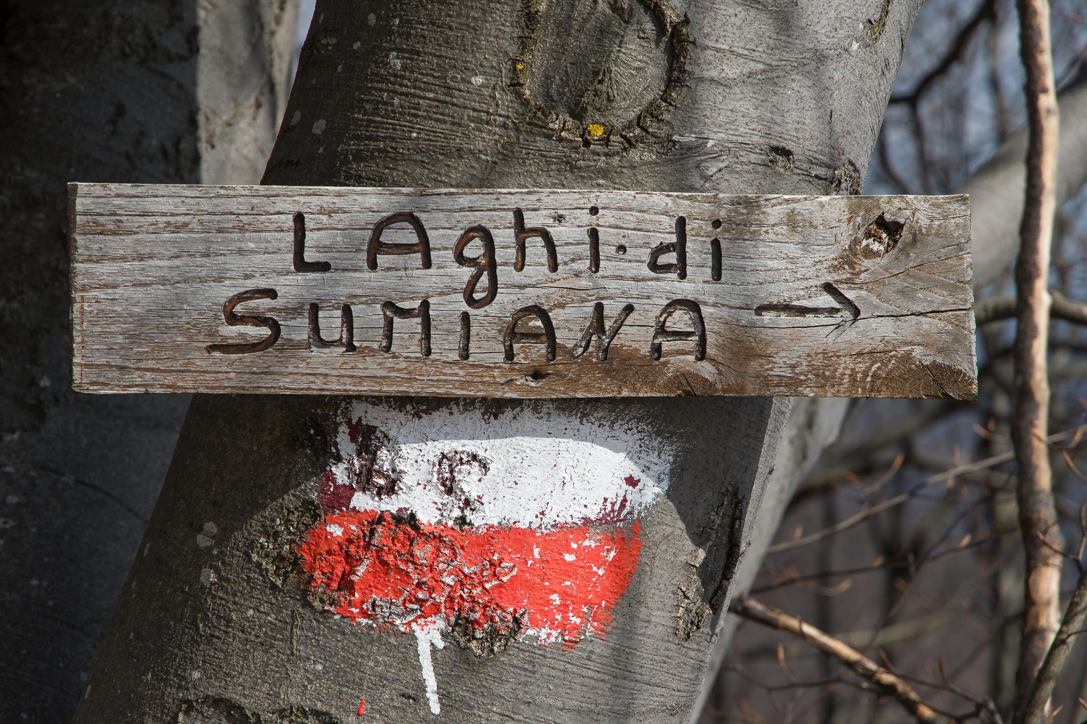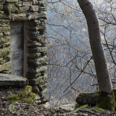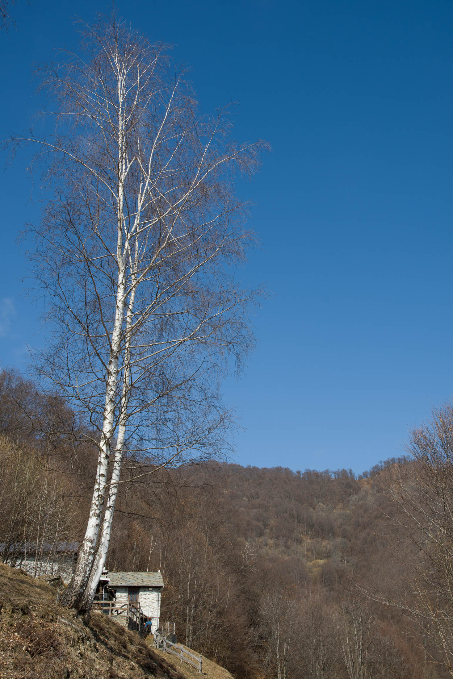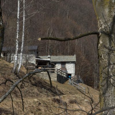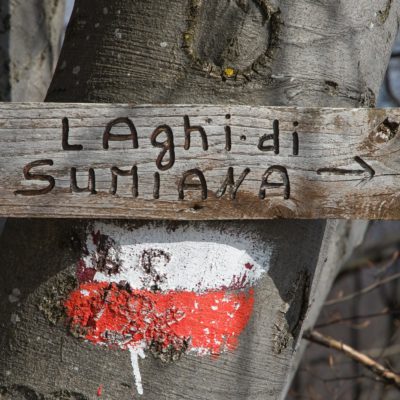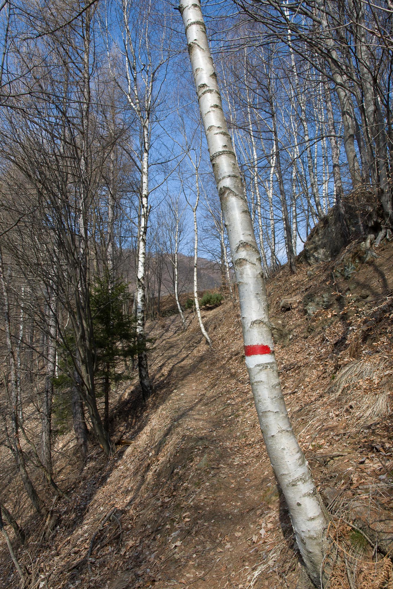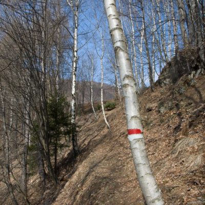 Von der Alpe Belvedere geht es zunächst auf dem Aufstiegsweg zurück zu den Hütten von Baudet (1240 m). Nun folgt ein etwas unwegsamer Abschnitt, an manchen Stellen ist hier Trittsicherheit erforderlich, besonders bei Nässe. Der schmale und überwachsene Pfad ist hier und da ein wenig abschüssig, manchenorts versperre umgestürzte Bäume den Weg, bisweilen stapft man durch rutschiges Laub. Der Weg ist ein ständiges Auf und Ab, unterwegs trifft man immer wieder auf aufgegebene Alpgebäude. Nach einer Weile kommt man zu einer grösseren Lichtung mit den Ruinen von Biondetti, eine bereits vor langer Zeit aufgegebene Alp. Hier sieht man recht anschaulich, was an Orten geschieht, wo sich der Mensch zurückgezogen hat und einst mühsam bewirtschaftetes Kulturland über Jahrzehnte sich selbst überlassen wird. Die umliegenden Weiden sind völlig verwildert und von unzähligen Birken überwachsen. Man blickt auf eine vergessene Welt, hier steht die Zeit still, für immer. Man überquert einige kleinere Seitenbäche und wenig später den Rio Saulera. Dann führt der Weg hinab zu den Laghi di Sumiana (1165 m), zwei herrlich gelegene kleine Seen in einer waldreichen Umgebung, besonders eindrücklich im Frühling zur Schneeschmelze, wenn die Wasseroberfläche allmählich auftaut und die Eisschollen darauf herumschwimmen.