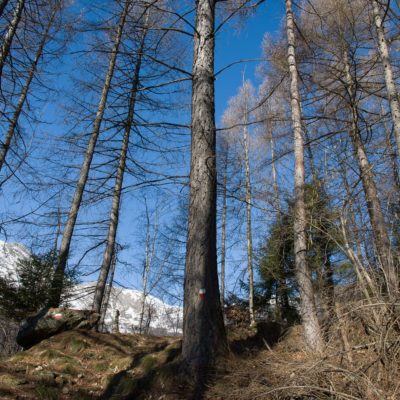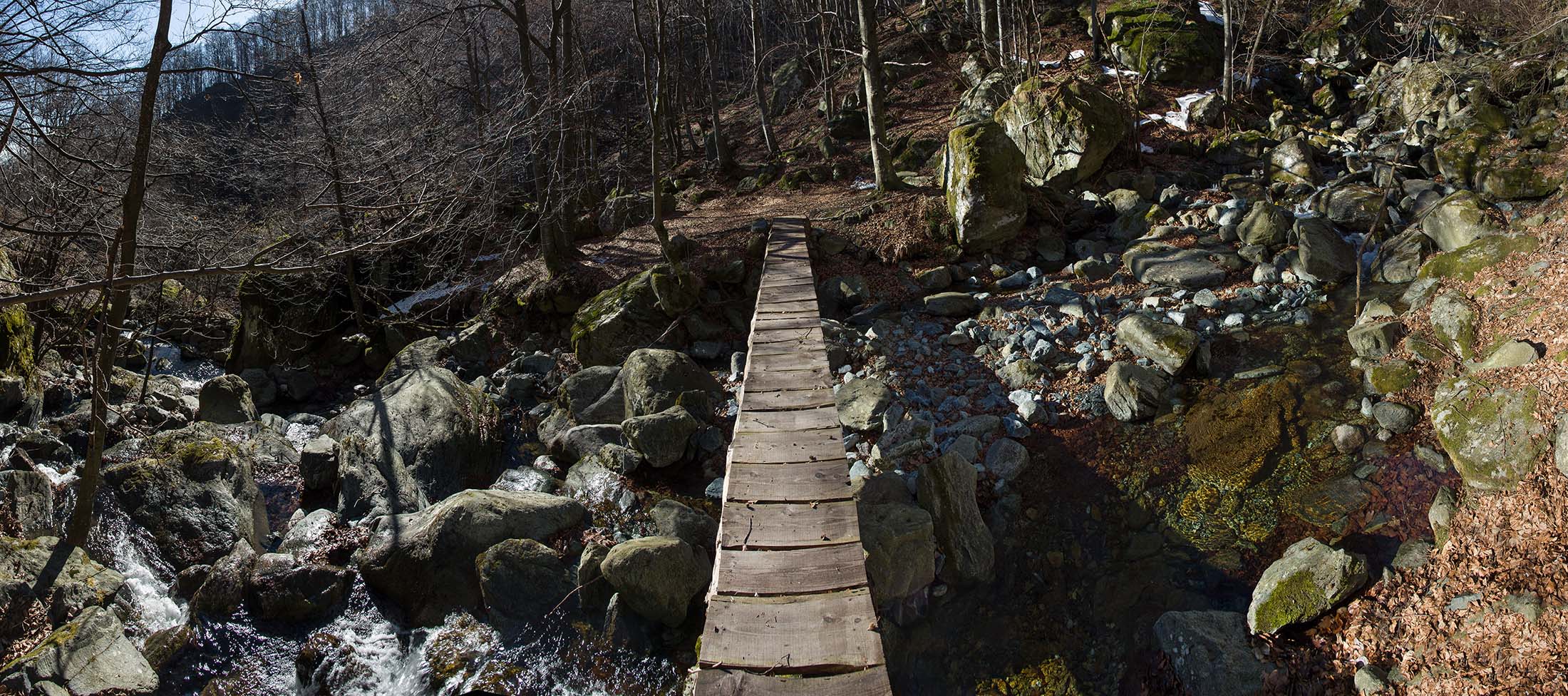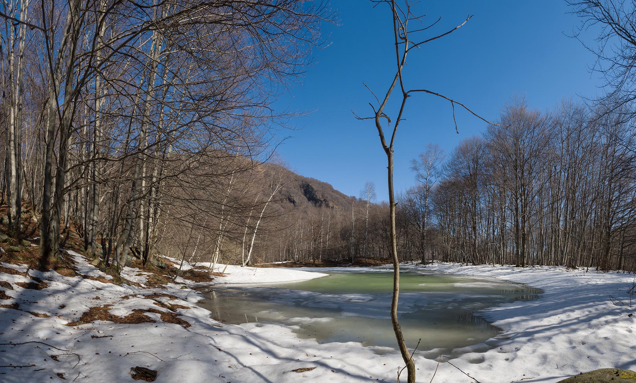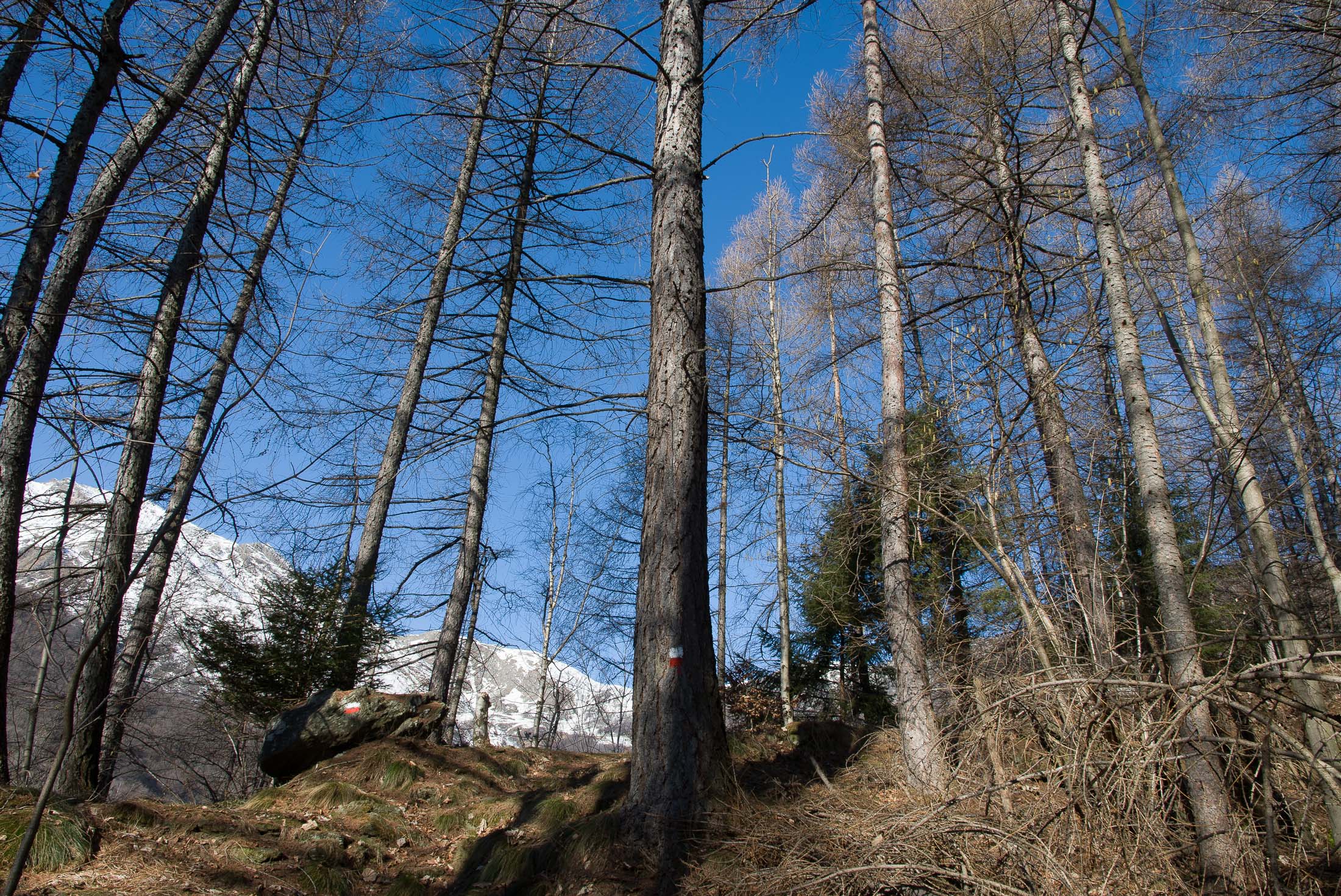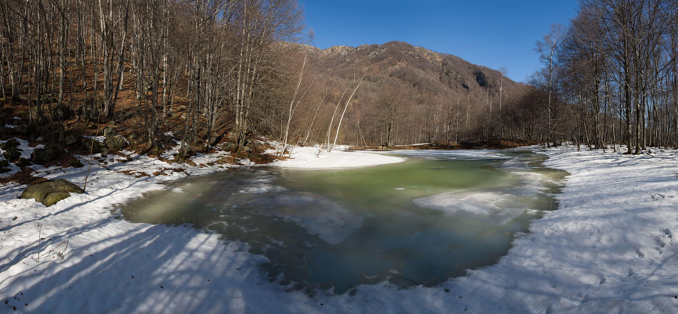 Von der Alpe Belvedere geht es zunächst auf dem Aufstiegsweg zurück zu den Hütten von Baudet (1240 m). Nun folgt ein etwas unwegsamer Abschnitt, an manchen Stellen ist hier Trittsicherheit erforderlich, besonders bei Nässe. Der schmale und überwachsene Pfad ist hier und da ein wenig abschüssig, manchenorts versperre umgestürzte Bäume den Weg, bisweilen stapft man durch rutschiges Laub. Der Weg ist ein ständiges Auf und Ab, unterwegs trifft man immer wieder auf aufgegebene Alpgebäude. Nach einer Weile kommt man zu einer grösseren Lichtung mit den Ruinen von Biondetti, eine bereits vor langer Zeit aufgegebene Alp. Hier sieht man recht anschaulich, was an Orten geschieht, wo sich der Mensch zurückgezogen hat und einst mühsam bewirtschaftetes Kulturland über Jahrzehnte sich selbst überlassen wird. Die umliegenden Weiden sind völlig verwildert und von unzähligen Birken überwachsen. Man blickt auf eine vergessene Welt, hier steht die Zeit still, für immer. Man überquert einige kleinere Seitenbäche und wenig später den Rio Saulera. Dann führt der Weg hinab zu den Laghi di Sumiana (1165 m), zwei herrlich gelegene kleine Seen in einer waldreichen Umgebung, besonders eindrücklich im Frühling zur Schneeschmelze, wenn die Wasseroberfläche allmählich auftaut und die Eisschollen darauf herumschwimmen.