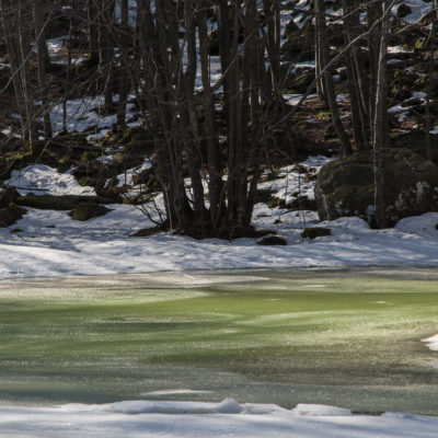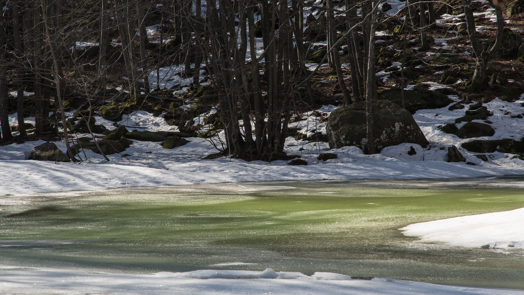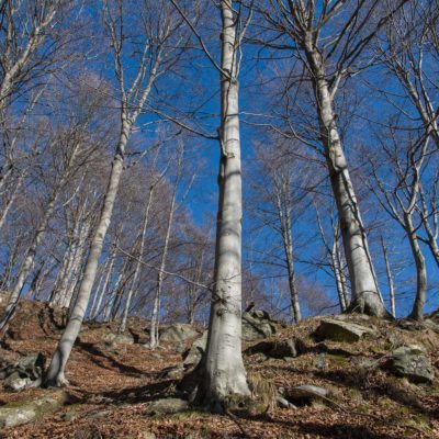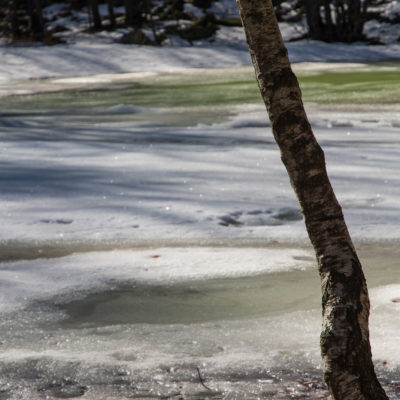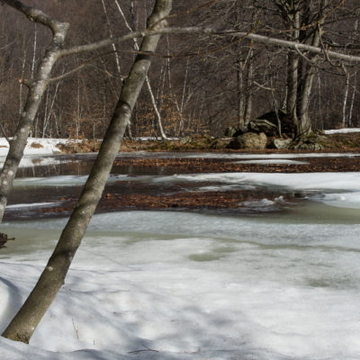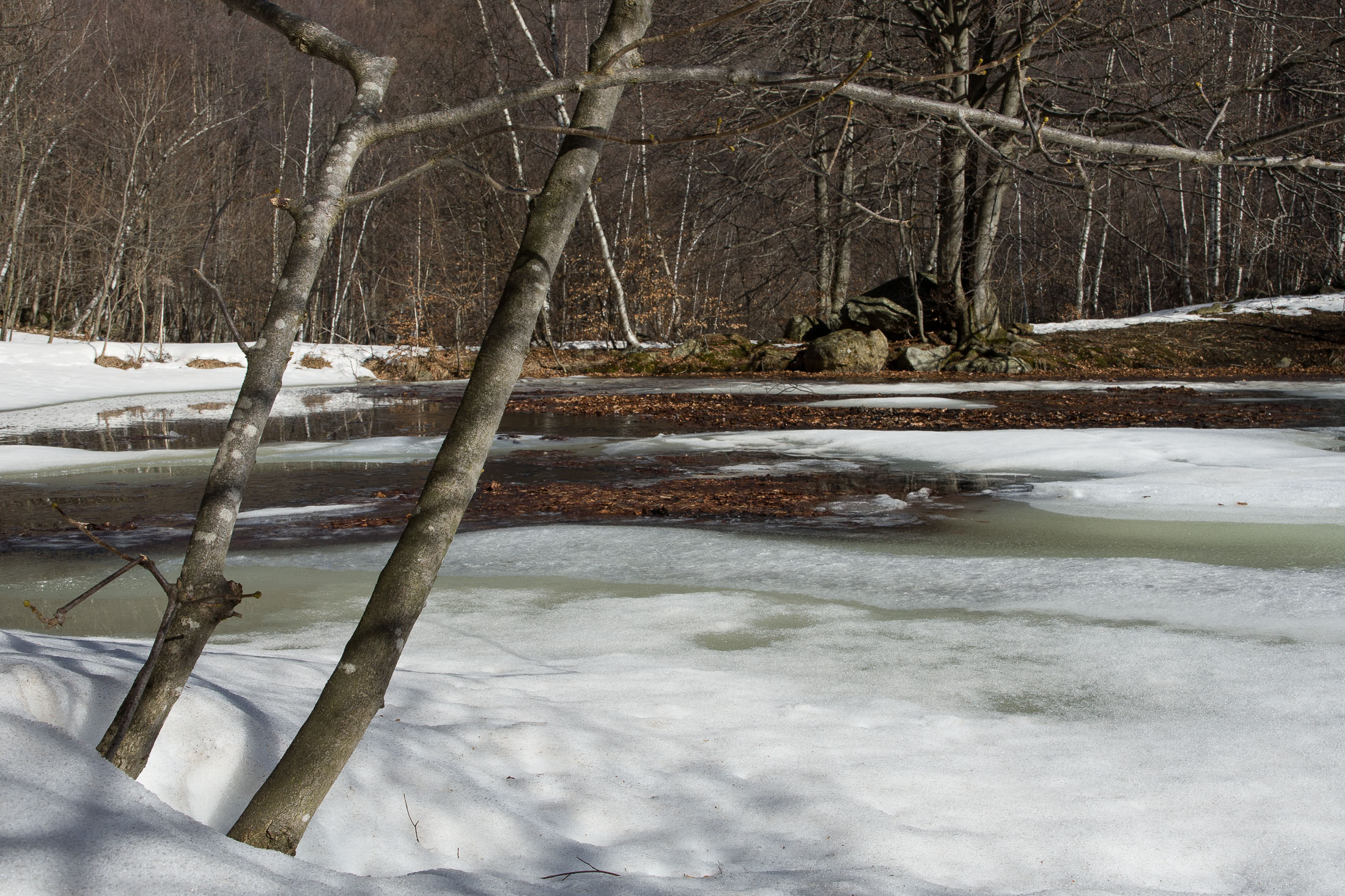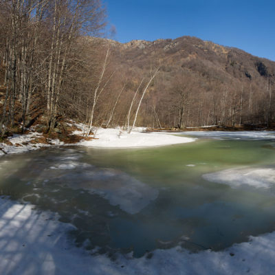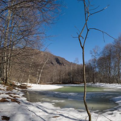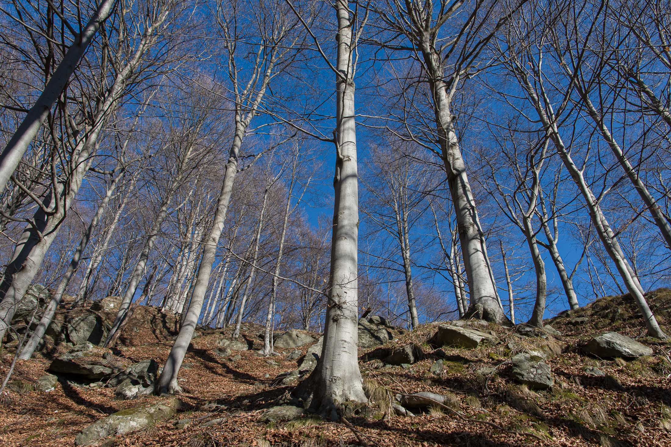Von der Alpe Belvedere geht es zunächst auf dem Aufstiegsweg zurück zu den Hütten von Baudet (1240 m). Nun folgt ein etwas unwegsamer Abschnitt, an manchen Stellen ist hier Trittsicherheit erforderlich, besonders bei Nässe. Der schmale und überwachsene Pfad ist hier und da ein wenig abschüssig, manchenorts versperre umgestürzte Bäume den Weg, bisweilen stapft man durch rutschiges Laub. Der Weg ist ein ständiges Auf und Ab, unterwegs trifft man immer wieder auf aufgegebene Alpgebäude. Nach einer Weile kommt man zu einer grösseren Lichtung mit den Ruinen von Biondetti, eine bereits vor langer Zeit aufgegebene Alp. Hier sieht man recht anschaulich, was an Orten geschieht, wo sich der Mensch zurückgezogen hat und einst mühsam bewirtschaftetes Kulturland über Jahrzehnte sich selbst überlassen wird. Die umliegenden Weiden sind völlig verwildert und von unzähligen Birken überwachsen. Man blickt auf eine vergessene Welt, hier steht die Zeit still, für immer. Man überquert einige kleinere Seitenbäche und wenig später den Rio Saulera. Dann führt der Weg hinab zu den Laghi di Sumiana (1165 m), zwei herrlich gelegene kleine Seen in einer waldreichen Umgebung, besonders eindrücklich im Frühling zur Schneeschmelze, wenn die Wasseroberfläche allmählich auftaut und die Eisschollen darauf herumschwimmen.