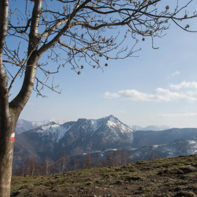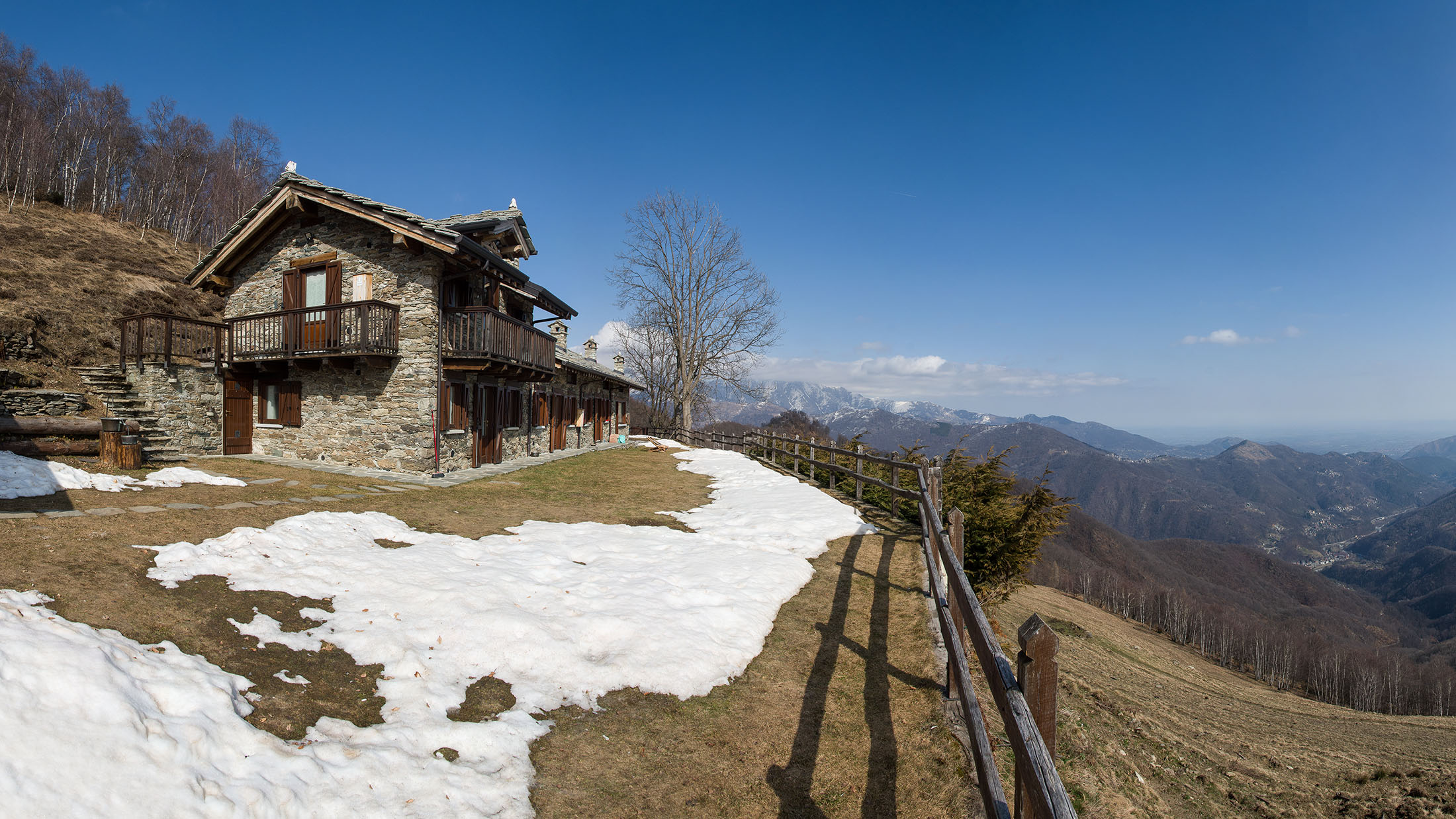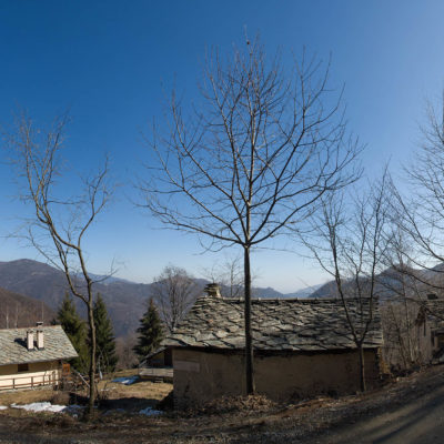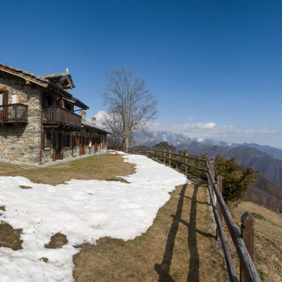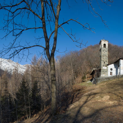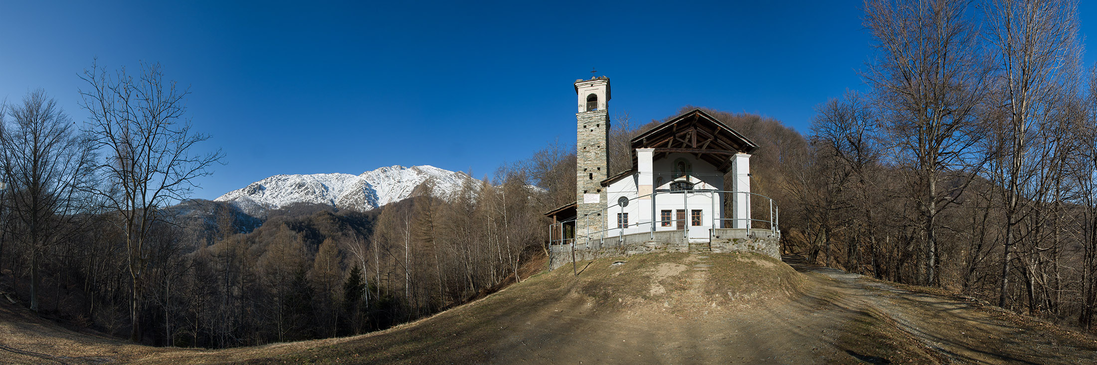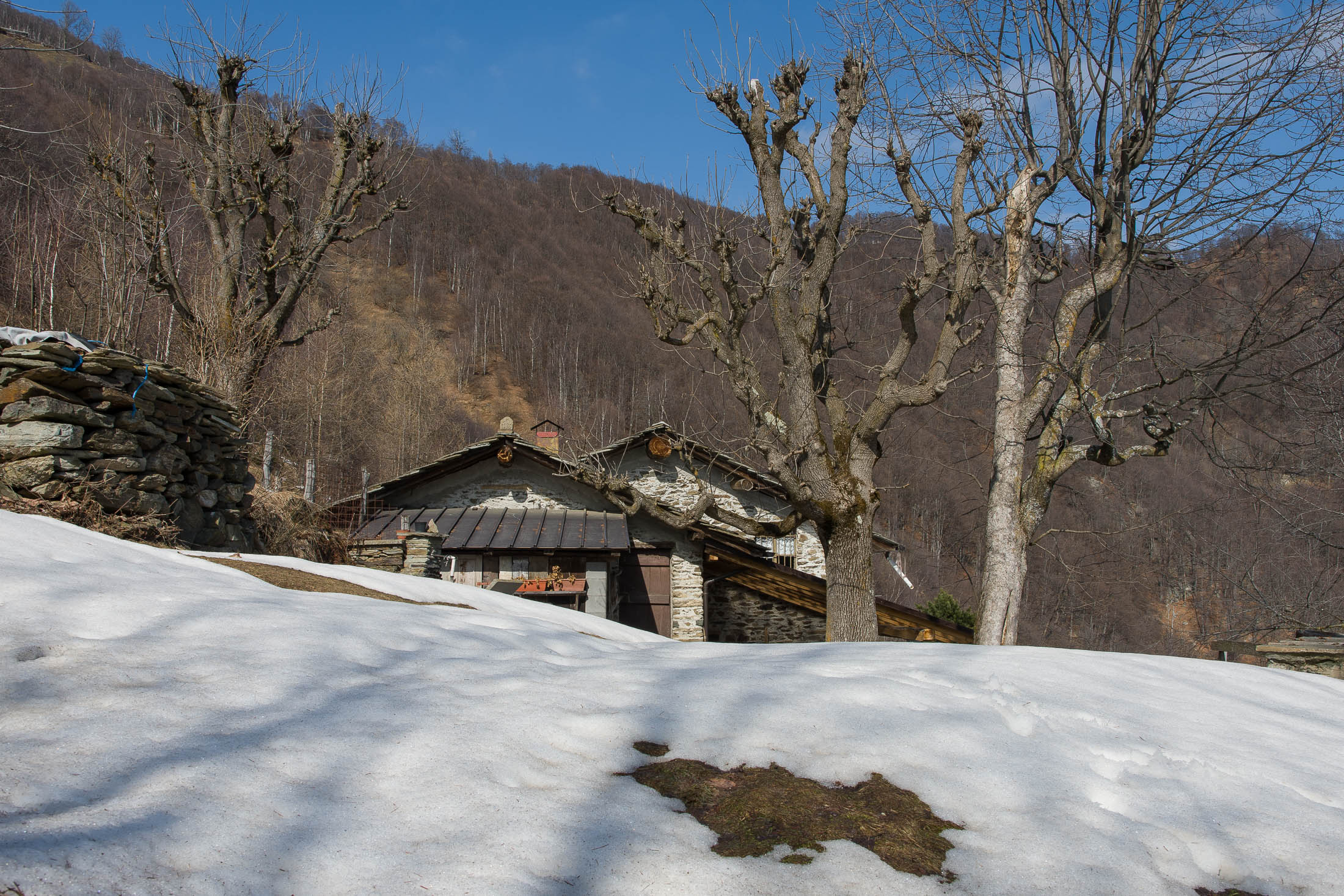 Am Ausgangspunkt kommt man an dem kleinen Weiler Giardino di Mezzenile vorbei. Der Ort war früher dauerhaft bewohnt, die Menschen lebten von der Berglandwirtschaft. Ein grösseres Anwesen wurde vor einigen Jahren renoviert und wird heute noch als Wochenendhaus genutzt, andere Häuser wiederum wurden bereits vor Jahrzehnten ihrem Schicksal überlassen und verfallen oder liegen bereits in Ruinen. Wenige Schritte entfernt auf einer kleiner Lichtung im Wald befindet sich die Cappella del Giardino (1059 m), die sehenswerte Kirche wurde im Jahr 2005 von Einheimischen in ehrenamtlicher Arbeit restauriert. Die Wanderung beginnt gemütlich. Hinter den Häusern von Giardino geht man an der Gabelung vor der Kirche rechts und folgt dem unbefestigten Alpsträsschen bis Sart (1151 m), eine ehemalige Alp, die Hütten werden noch instandgehalten und als Wochenenddomizil genutzt. Dort zweigt ein markierter Weg ab, auf diesem durch lauschigen Buchenwald zu der im Sommer bewohnten Alp von Baudè (1240 m, in manchen Karten auch Baudet genannt), mit schöner Aussicht auf das Bassa Valle und die Tiefebene. Durch Buchen- und Birkenwald geht es weiterhin bergauf, nach einer Weile geht der Pfad in einen grasigen Fahrweg über, den man ein wenig oberhalb bei den Ruinen von L‘Orgeri (1320 m) wieder verlässt. Kurz darauf erreicht man offenes Gelände und steigt über Wiesen und Weiden hinauf zur wunderschön gelegenen Alpe Belvedere (1452 m). Das ehemalige Alpgebäude wurde vor einigen Jahren mit grossem Aufwand restauriert und zu Ferienwohnungen umgebaut. Menschen trifft man hier oben jedoch nur selten. Der klangvolle Name ist schlichtweg Programm, von der aussichtsreichen Sonnenterrasse geniesst man fantastische Weitblicke. Wem das Panorama noch nicht reicht, von hier lohnt ein Abstecher auf den nahen Gipfel der Testa della Cialma (+1,5 Std. hin und zurück, > siehe hier).