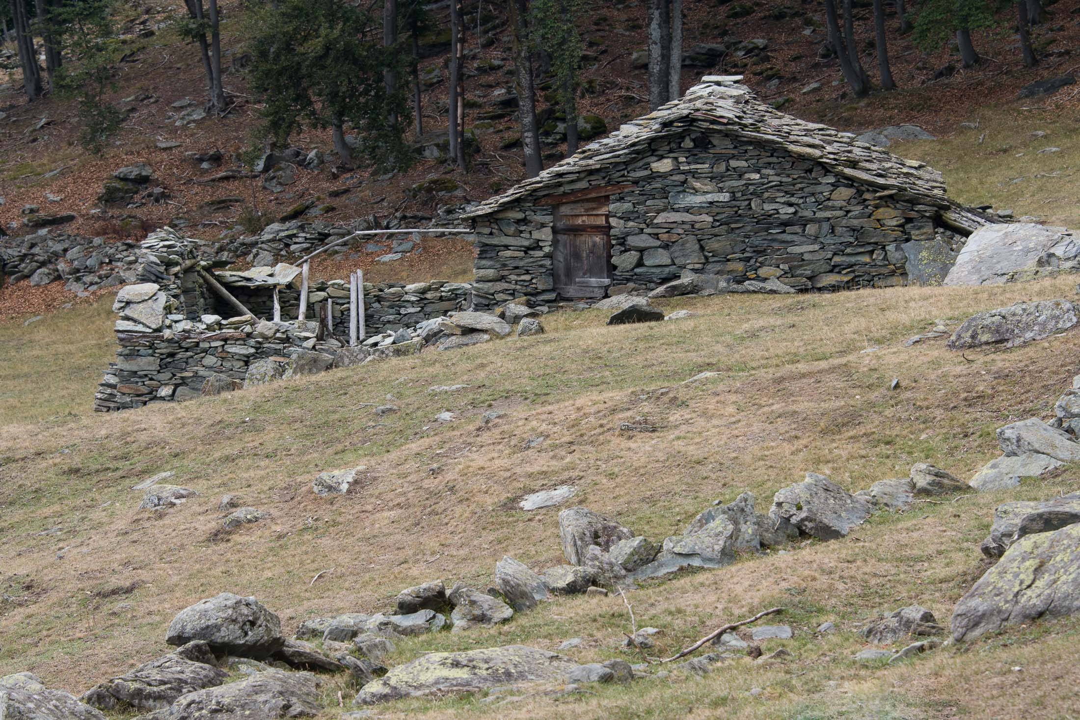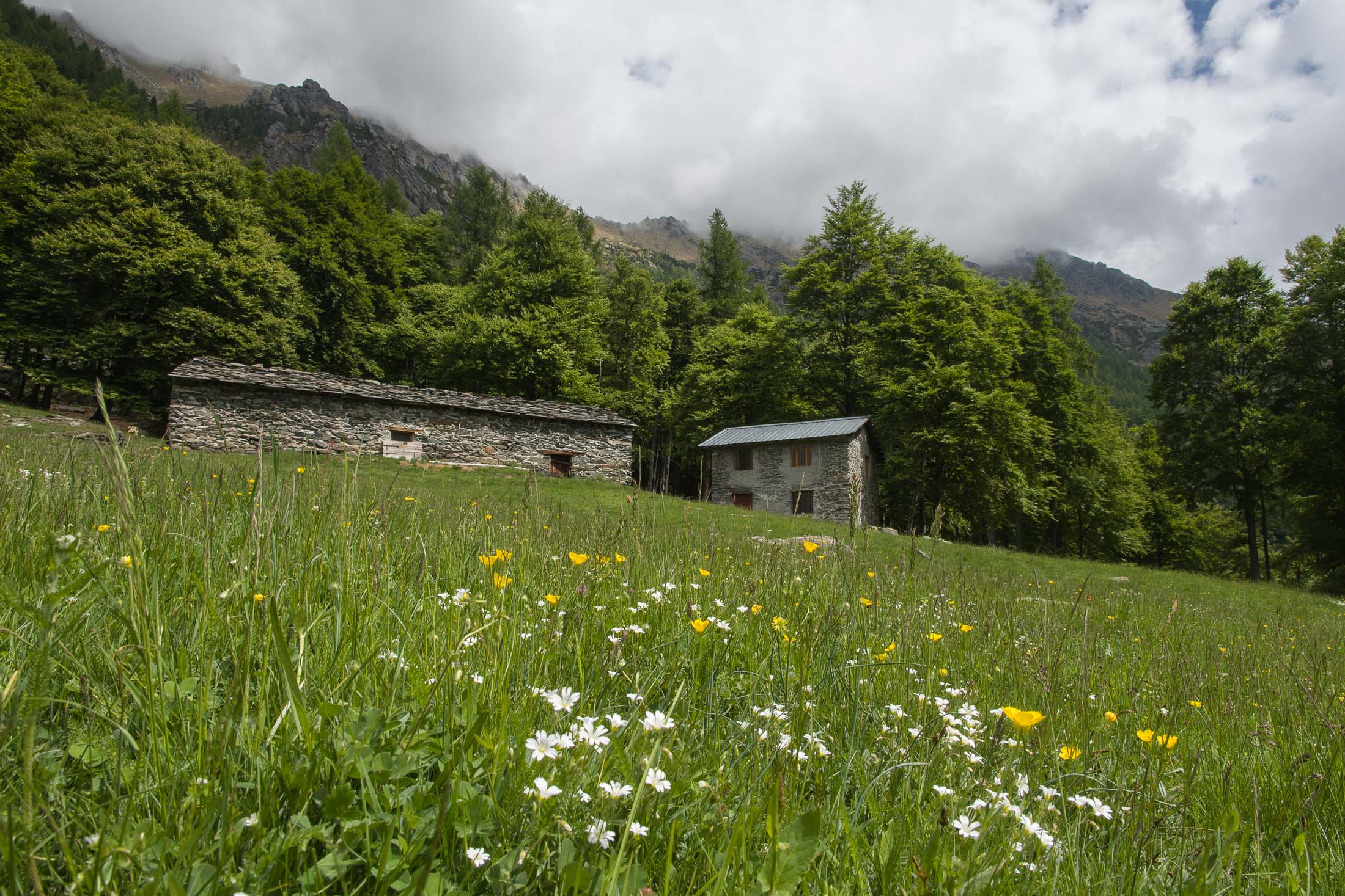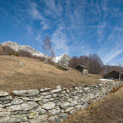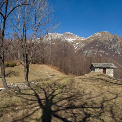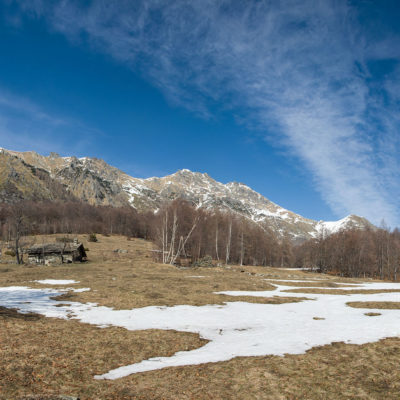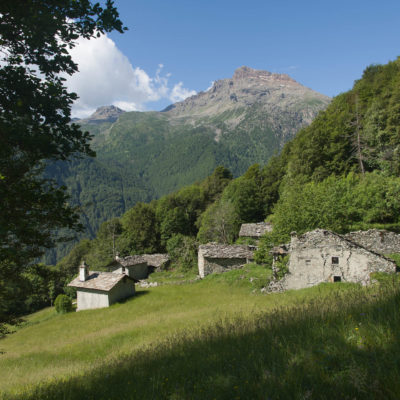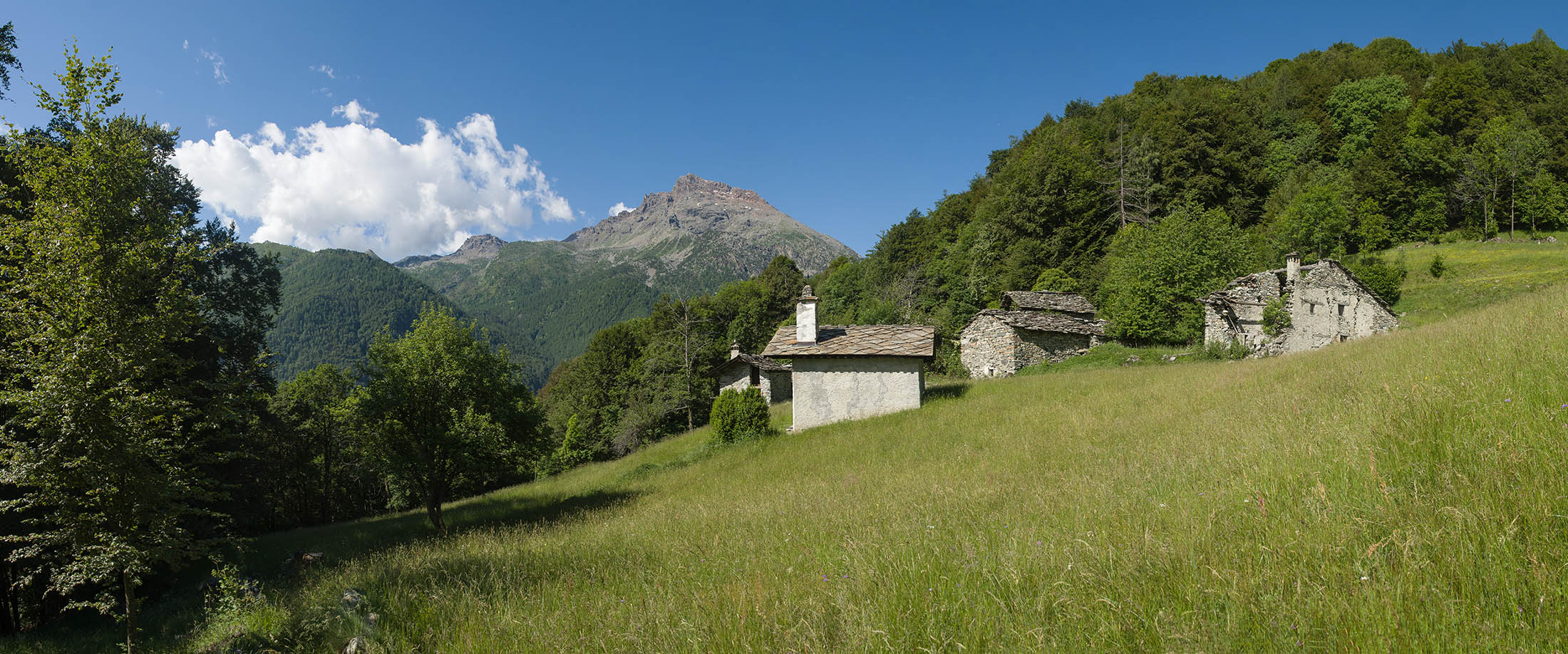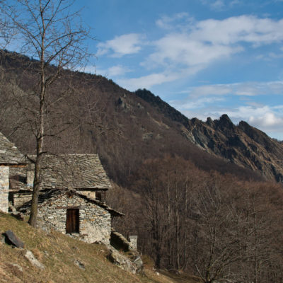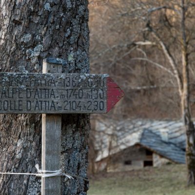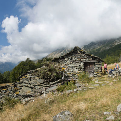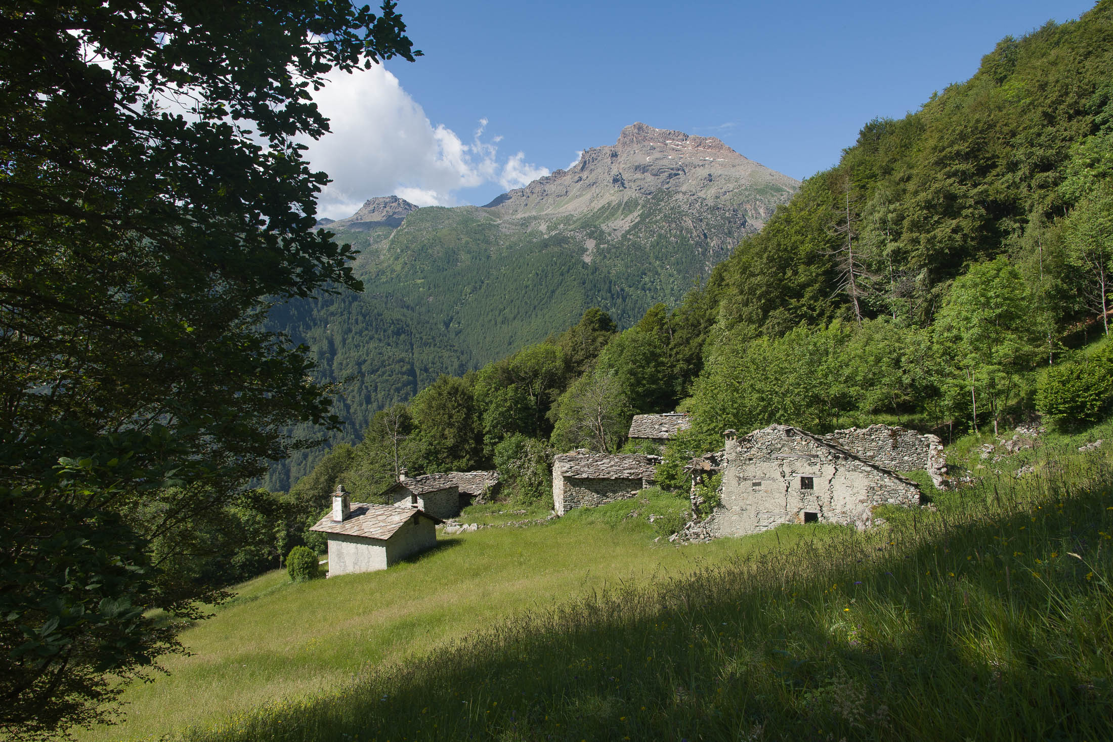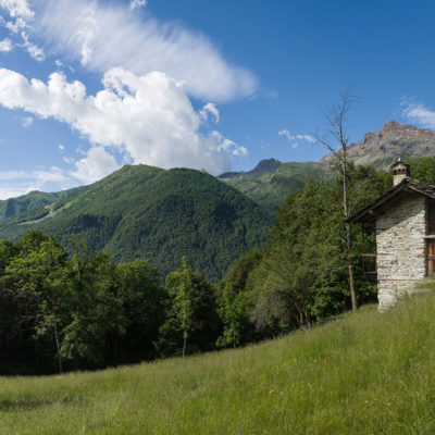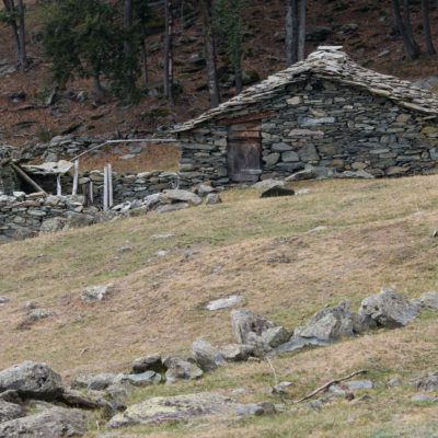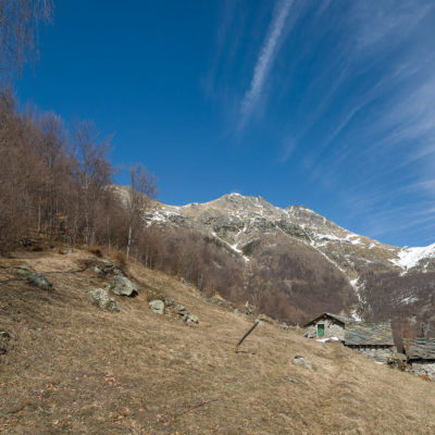 Vom grossen Dorfplatz im Ortskern von Ala di Stura (1075 m) folgt man zunächst etwa 500 m der Strasse talaufwärts bis zu einem restaurierten Bildstock. Dort beginnt ein unmarkierter alter Saumweg, der anfangs über kunstvoll angelegte Treppenstufen durch den Wald in einem Viertelstündchen nach Lombarda (1182 m) führt. Hier scheinen die Uhren stillzustehen, uralte Gemäuer, bröckelnder Putz, meterhohes Unkraut vor den Türen und Fenstern. Die meisten der Bauernhäuser wurden bereits vor Jahrzehnten verlassen, lediglich ein Anwesen ist noch dauerhaft bewohnt. Hinter den oberen Gebäuden mündet der Weg in ein unbefestigten Fahrweg, den man nur wenig später bei einem Wegweiser wieder verlässt. Auf einer wunderschönen alten Mulattiera (= Saumweg oder Maultierweg) geht es entlang von Trockensteinmauern in Kürze hinauf zur grossen Lichtung von Chiottero (1270 m), von den Einheimischen auch Ciautè genannt. Auch hier blickt man auf Ruinen, nur noch das kleine Kirchlein und ein einziges Gebäude werden heute noch instand gehalten. Der Weiterweg führt durch den Wald zum Pian d‘Attia (1382 m), eine ehemalige Temporärsiedlung am Rande einer aussichtsreichen kleine Hochfläche. Einige der Häuser und Ställe wurden bereits vor langer Zeit aufgegeben, andere wiederum sind hübsch renoviert und werden von den Einheimischen noch als Wochenendhäuschen genutzt. Wenige Schritte oberhalb am Waldrand kommt man zu einer unbeschilderten Weggabelung, wo es geradeaus (Richtung Norden) weitergeht, der Abzweig links Richtung Pianfè bleibt unbeachtet. Der Weiterweg führt nun durch dichten Buchenwald einen abschnittsweise steilen Rücken hinauf. Nach einer knappen Stunde liegt der Wald hinter einem und man erreicht die weitläufige Alpe d‘Attia (1740 m). Ein traumhaft schönes Fleckchen, hier kann man stundenlang verweilen und das tolle Panorama auf die Berge des Val d‘Ala geniessen. Die obere der beiden Gebäudegruppen wird auch heute noch in den Sommermonaten von einer sympathischen Familie aus dem Tal bewirtschaftet.