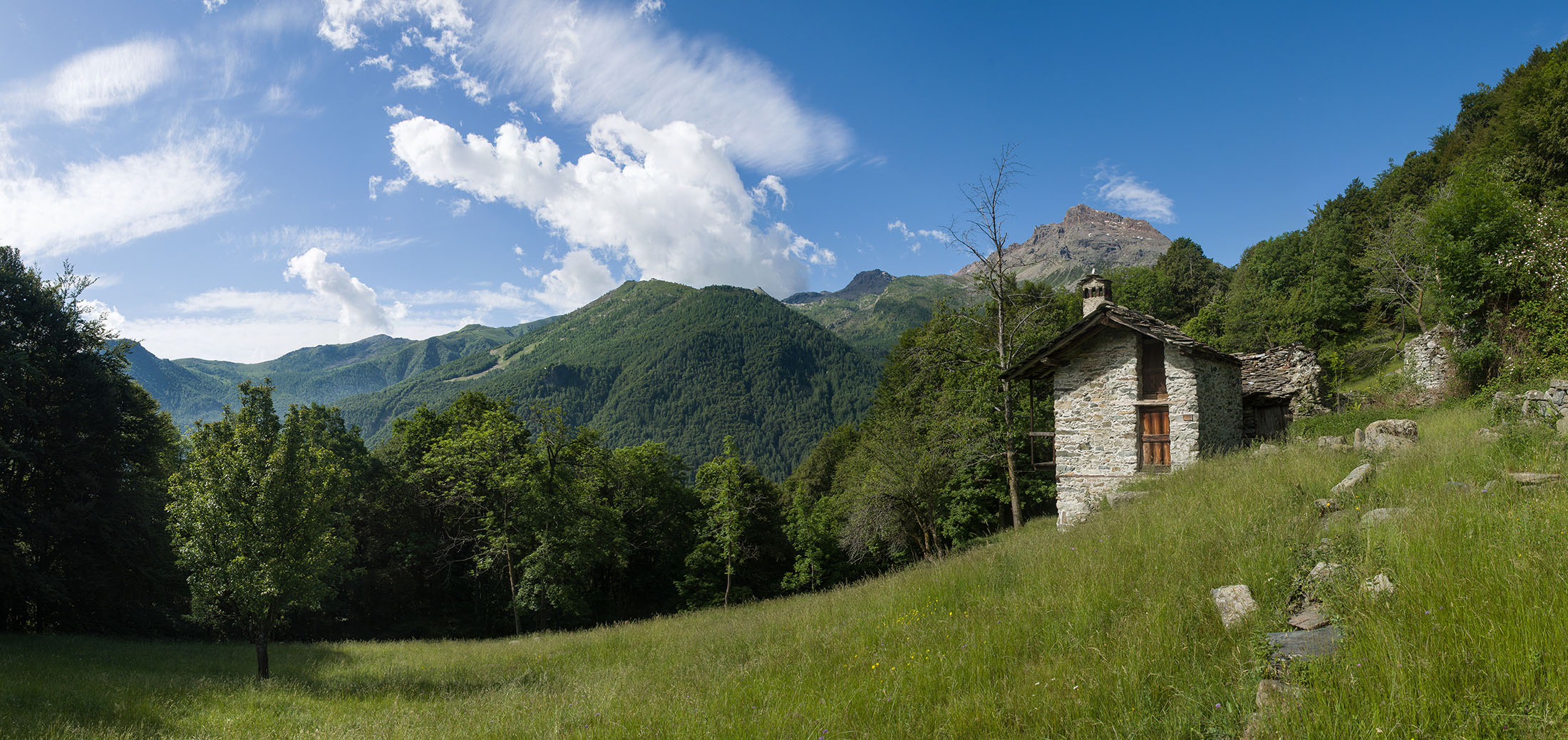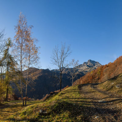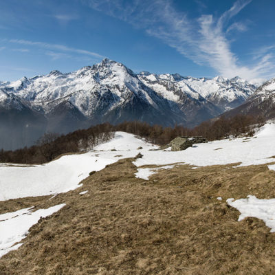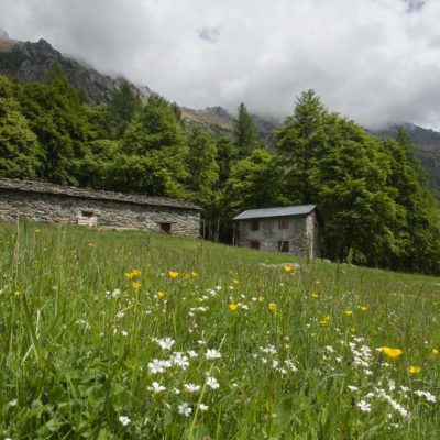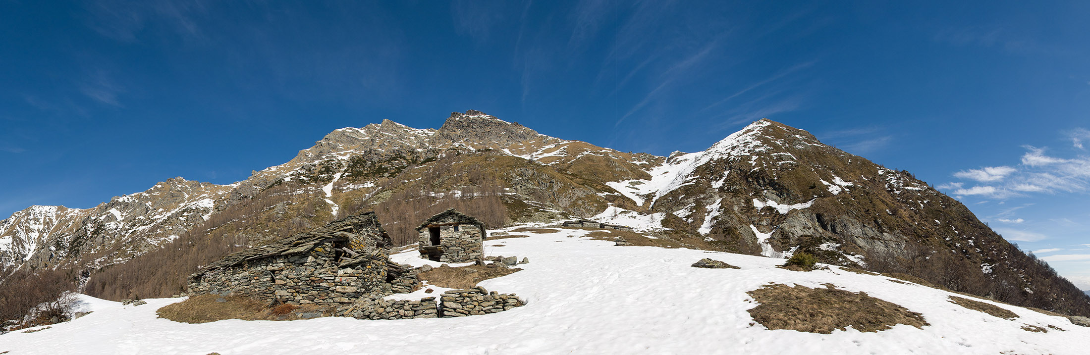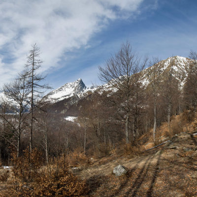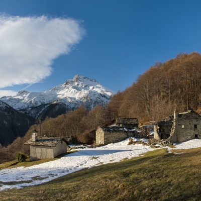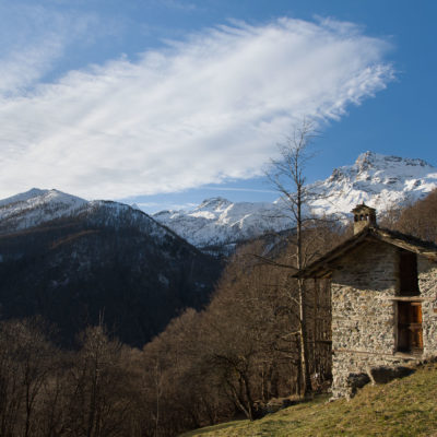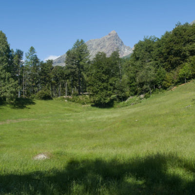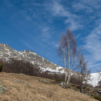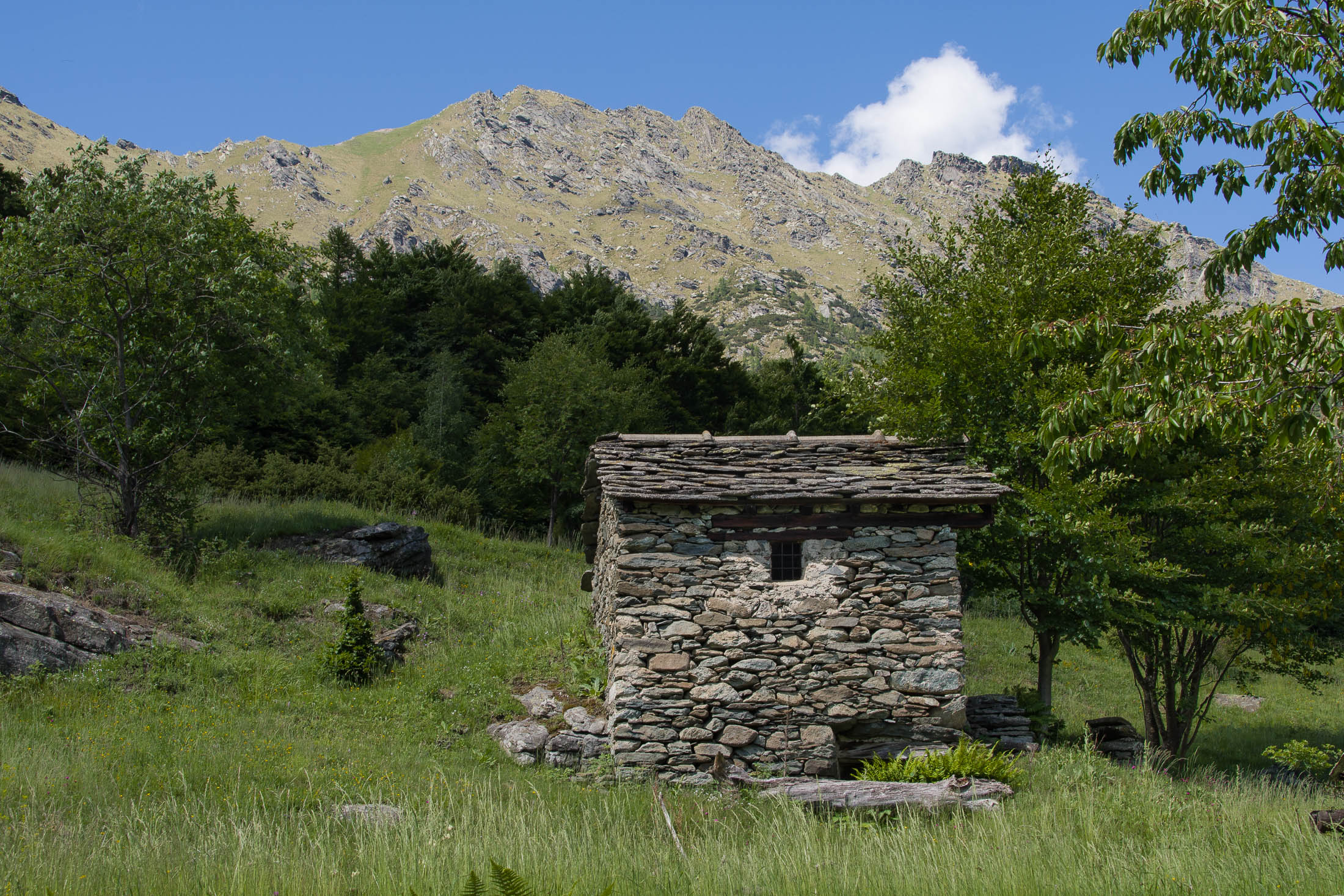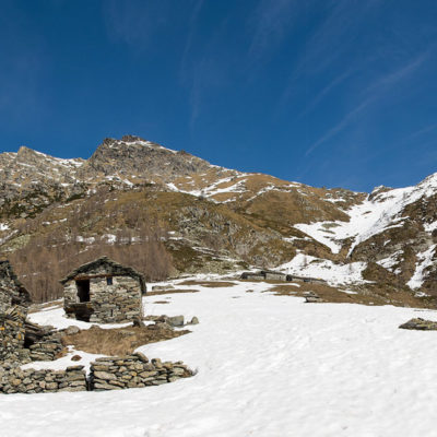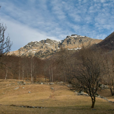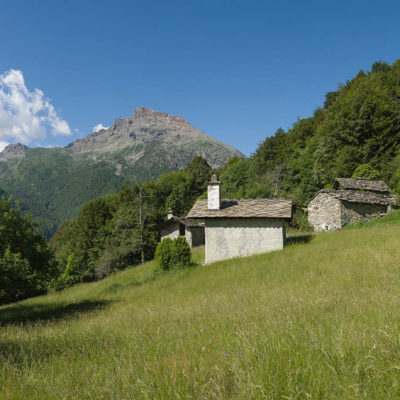 Vom grossen Dorfplatz im Ortskern von Ala di Stura (1075 m) folgt man zunächst etwa 500 m der Strasse talaufwärts bis zu einem restaurierten Bildstock. Dort beginnt ein unmarkierter alter Saumweg, der anfangs über kunstvoll angelegte Treppenstufen durch den Wald in einem Viertelstündchen nach Lombarda (1182 m) führt. Hier scheinen die Uhren stillzustehen, uralte Gemäuer, bröckelnder Putz, meterhohes Unkraut vor den Türen und Fenstern. Die meisten der Bauernhäuser wurden bereits vor Jahrzehnten verlassen, lediglich ein Anwesen ist noch dauerhaft bewohnt. Hinter den oberen Gebäuden mündet der Weg in ein unbefestigten Fahrweg, den man nur wenig später bei einem Wegweiser wieder verlässt. Auf einer wunderschönen alten Mulattiera (= Saumweg oder Maultierweg) geht es entlang von Trockensteinmauern in Kürze hinauf zur grossen Lichtung von Chiottero (1270 m), von den Einheimischen auch Ciautè genannt. Auch hier blickt man auf Ruinen, nur noch das kleine Kirchlein und ein einziges Gebäude werden heute noch instand gehalten. Der Weiterweg führt durch den Wald zum Pian d‘Attia (1382 m), eine ehemalige Temporärsiedlung am Rande einer aussichtsreichen kleine Hochfläche. Einige der Häuser und Ställe wurden bereits vor langer Zeit aufgegeben, andere wiederum sind hübsch renoviert und werden von den Einheimischen noch als Wochenendhäuschen genutzt. Wenige Schritte oberhalb am Waldrand kommt man zu einer unbeschilderten Weggabelung, wo es geradeaus (Richtung Norden) weitergeht, der Abzweig links Richtung Pianfè bleibt unbeachtet. Der Weiterweg führt nun durch dichten Buchenwald einen abschnittsweise steilen Rücken hinauf. Nach einer knappen Stunde liegt der Wald hinter einem und man erreicht die weitläufige Alpe d‘Attia (1740 m). Ein traumhaft schönes Fleckchen, hier kann man stundenlang verweilen und das tolle Panorama auf die Berge des Val d‘Ala geniessen. Die obere der beiden Gebäudegruppen wird auch heute noch in den Sommermonaten von einer sympathischen Familie aus dem Tal bewirtschaftet.