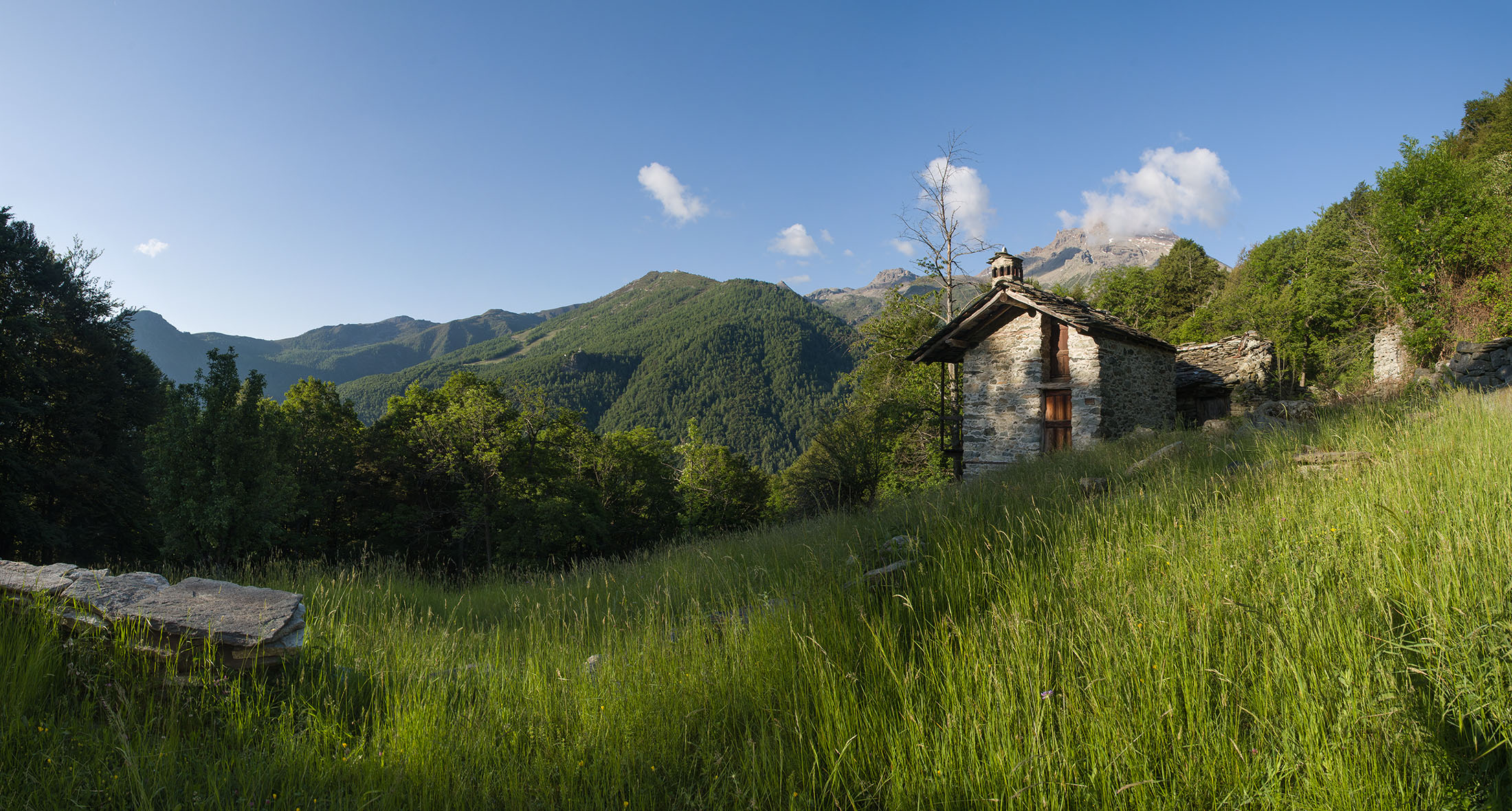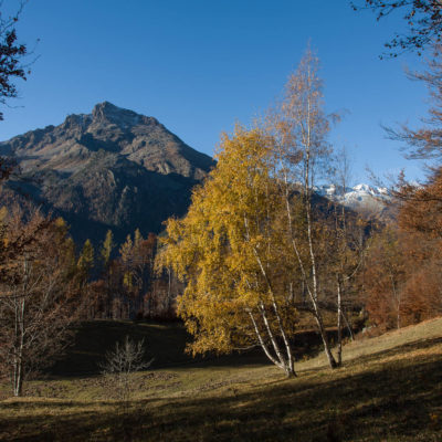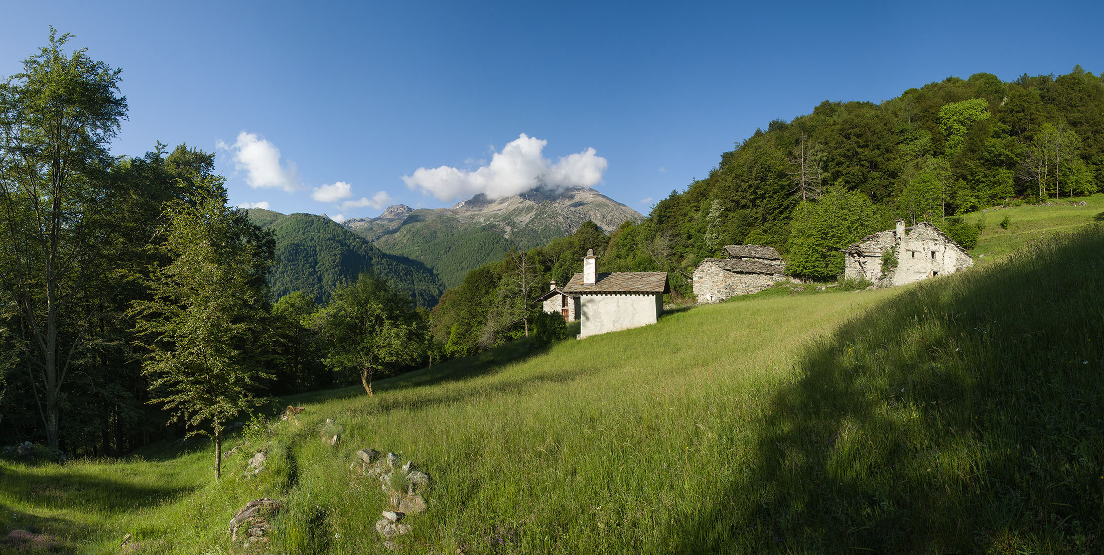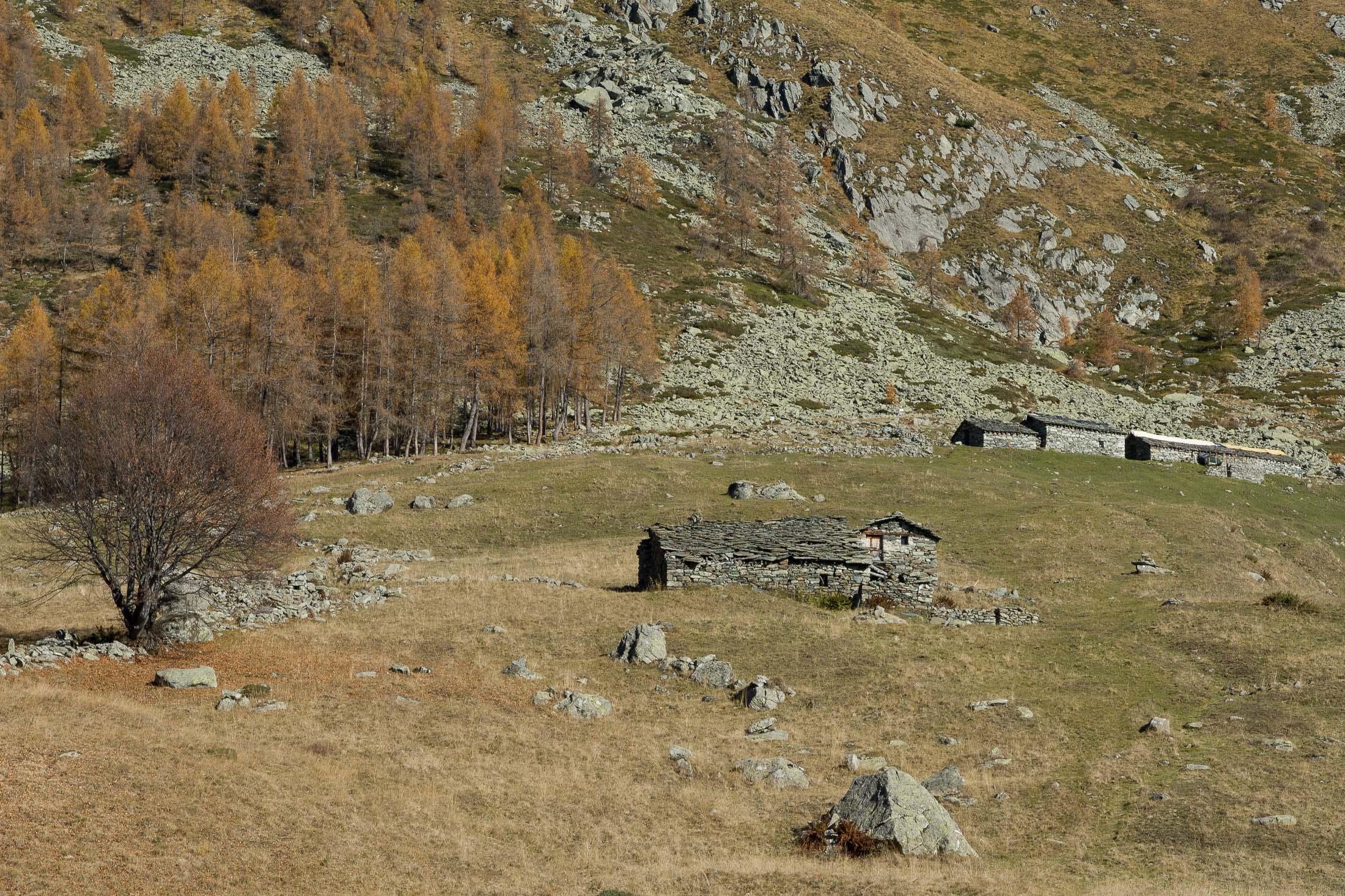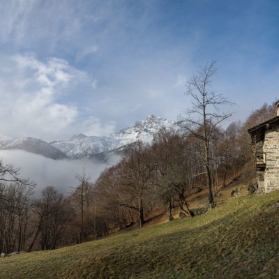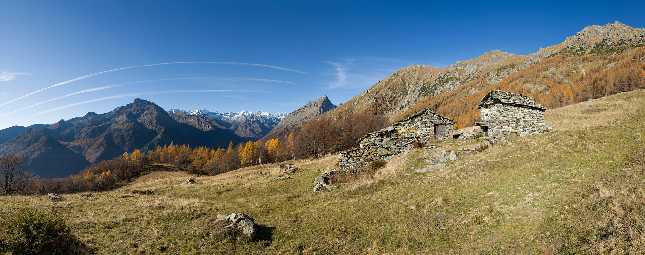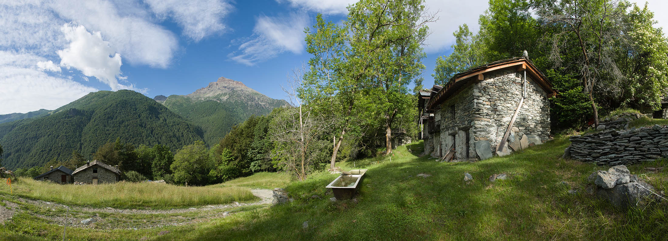 Vom grossen Dorfplatz im Ortskern von Ala di Stura (1075 m) folgt man zunächst etwa 500 m der Strasse talaufwärts bis zu einem restaurierten Bildstock. Dort beginnt ein unmarkierter alter Saumweg, der anfangs über kunstvoll angelegte Treppenstufen durch den Wald in einem Viertelstündchen nach Lombarda (1182 m) führt. Hier scheinen die Uhren stillzustehen, uralte Gemäuer, bröckelnder Putz, meterhohes Unkraut vor den Türen und Fenstern. Die meisten der Bauernhäuser wurden bereits vor Jahrzehnten verlassen, lediglich ein Anwesen ist noch dauerhaft bewohnt. Hinter den oberen Gebäuden mündet der Weg in ein unbefestigten Fahrweg, den man nur wenig später bei einem Wegweiser wieder verlässt. Auf einer wunderschönen alten Mulattiera (= Saumweg oder Maultierweg) geht es entlang von Trockensteinmauern in Kürze hinauf zur grossen Lichtung von Chiottero (1270 m), von den Einheimischen auch Ciautè genannt. Auch hier blickt man auf Ruinen, nur noch das kleine Kirchlein und ein einziges Gebäude werden heute noch instand gehalten. Der Weiterweg führt durch den Wald zum Pian d‘Attia (1382 m), eine ehemalige Temporärsiedlung am Rande einer aussichtsreichen kleine Hochfläche. Einige der Häuser und Ställe wurden bereits vor langer Zeit aufgegeben, andere wiederum sind hübsch renoviert und werden von den Einheimischen noch als Wochenendhäuschen genutzt. Wenige Schritte oberhalb am Waldrand kommt man zu einer unbeschilderten Weggabelung, wo es geradeaus (Richtung Norden) weitergeht, der Abzweig links Richtung Pianfè bleibt unbeachtet. Der Weiterweg führt nun durch dichten Buchenwald einen abschnittsweise steilen Rücken hinauf. Nach einer knappen Stunde liegt der Wald hinter einem und man erreicht die weitläufige Alpe d‘Attia (1740 m). Ein traumhaft schönes Fleckchen, hier kann man stundenlang verweilen und das tolle Panorama auf die Berge des Val d‘Ala geniessen. Die obere der beiden Gebäudegruppen wird auch heute noch in den Sommermonaten von einer sympathischen Familie aus dem Tal bewirtschaftet.