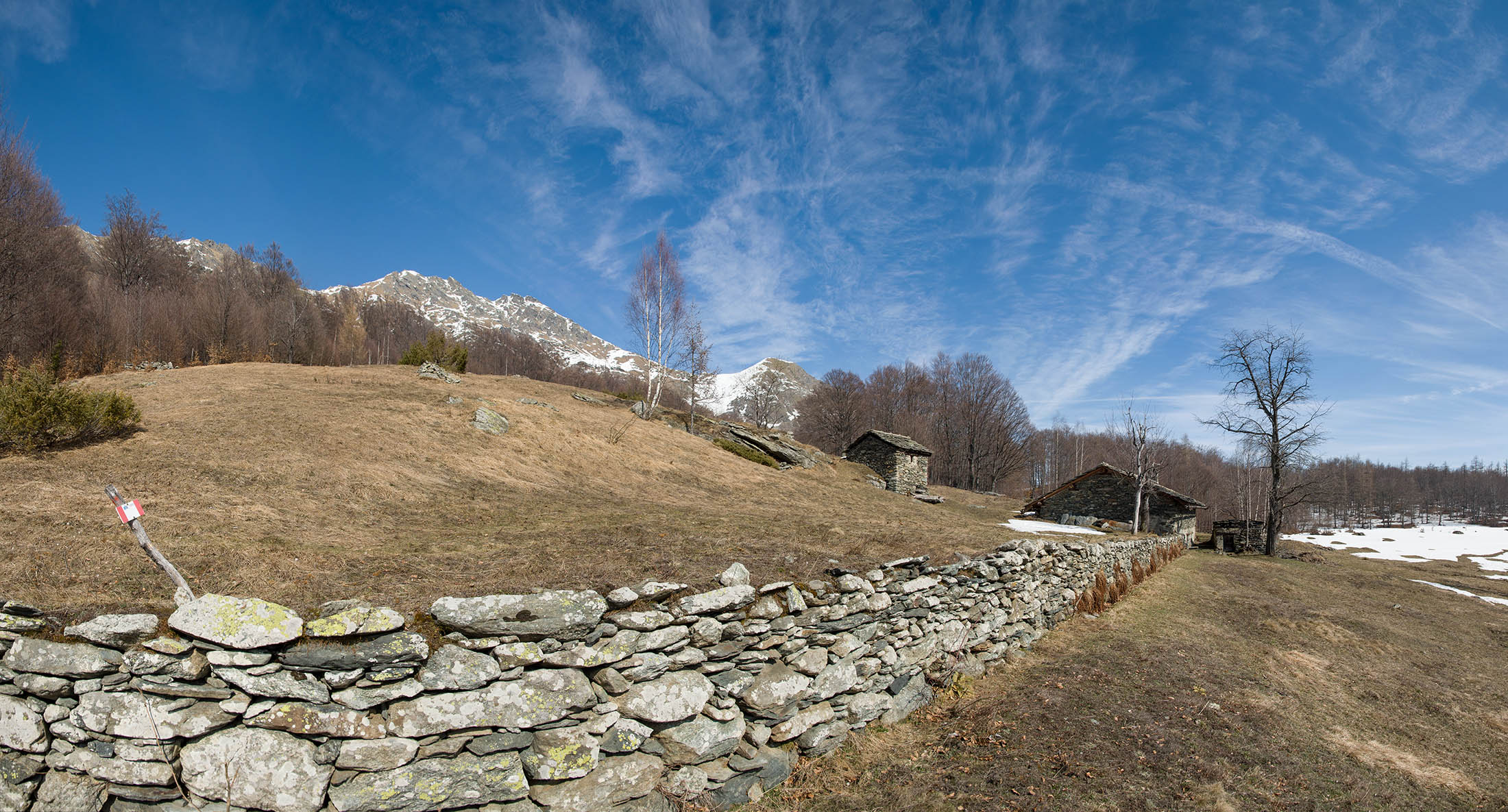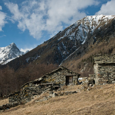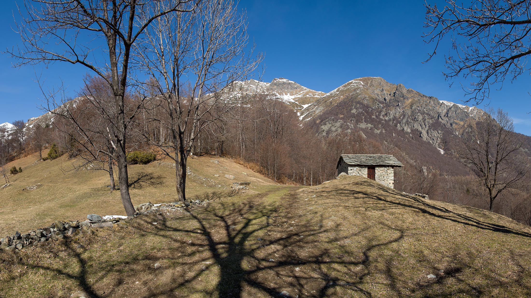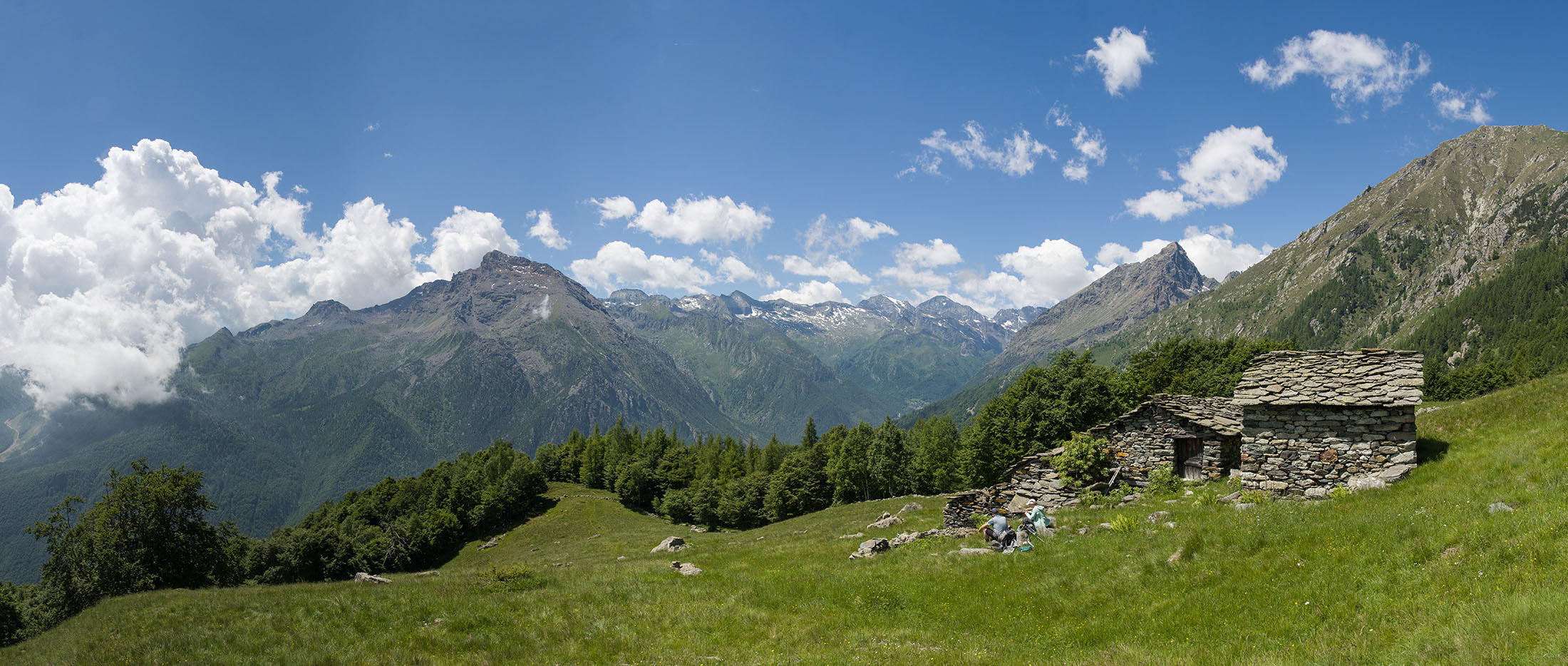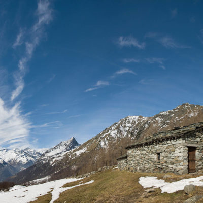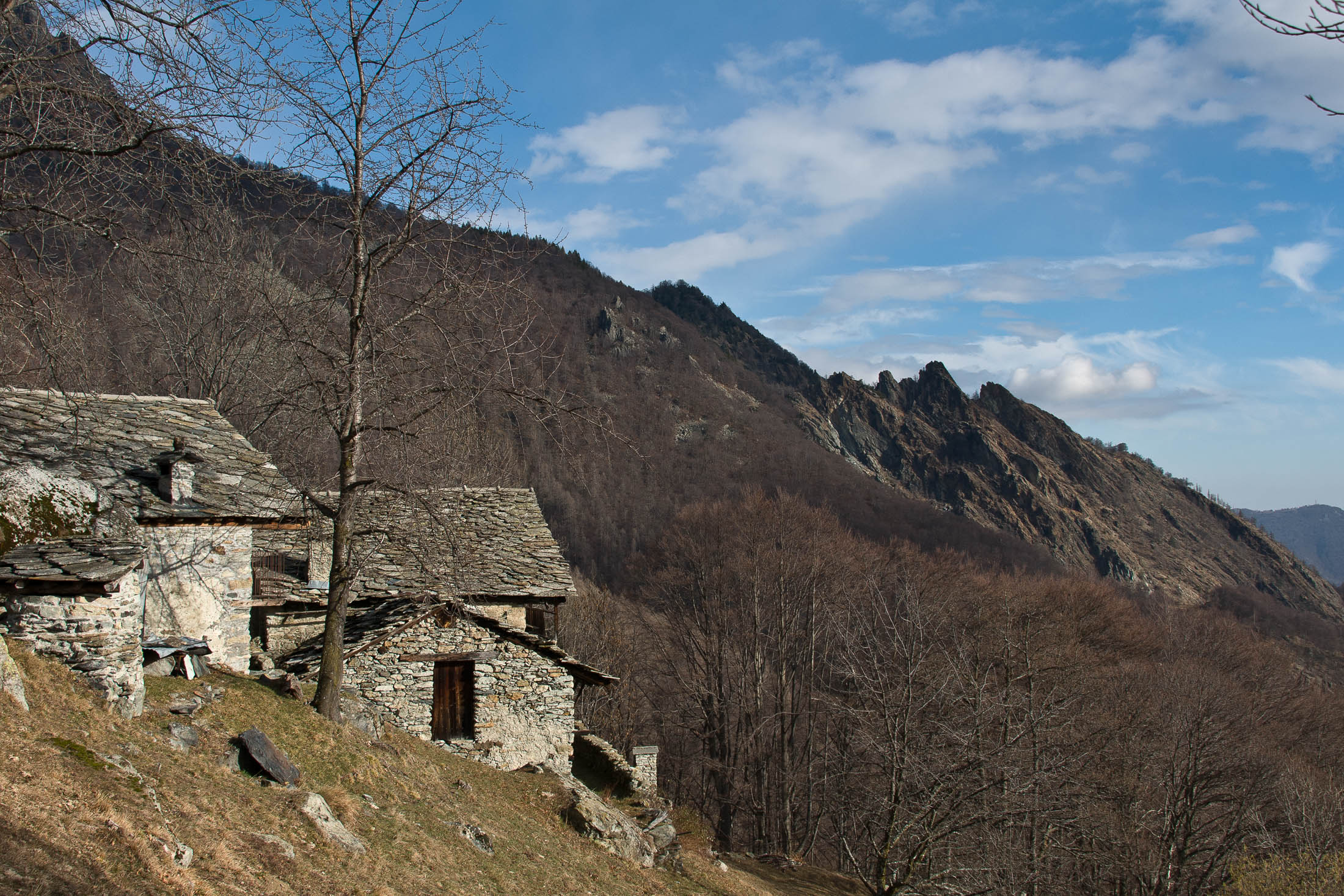 Vom grossen Dorfplatz im Ortskern von Ala di Stura (1075 m) folgt man zunächst etwa 500 m der Strasse talaufwärts bis zu einem restaurierten Bildstock. Dort beginnt ein unmarkierter alter Saumweg, der anfangs über kunstvoll angelegte Treppenstufen durch den Wald in einem Viertelstündchen nach Lombarda (1182 m) führt. Hier scheinen die Uhren stillzustehen, uralte Gemäuer, bröckelnder Putz, meterhohes Unkraut vor den Türen und Fenstern. Die meisten der Bauernhäuser wurden bereits vor Jahrzehnten verlassen, lediglich ein Anwesen ist noch dauerhaft bewohnt. Hinter den oberen Gebäuden mündet der Weg in ein unbefestigten Fahrweg, den man nur wenig später bei einem Wegweiser wieder verlässt. Auf einer wunderschönen alten Mulattiera (= Saumweg oder Maultierweg) geht es entlang von Trockensteinmauern in Kürze hinauf zur grossen Lichtung von Chiottero (1270 m), von den Einheimischen auch Ciautè genannt. Auch hier blickt man auf Ruinen, nur noch das kleine Kirchlein und ein einziges Gebäude werden heute noch instand gehalten. Der Weiterweg führt durch den Wald zum Pian d‘Attia (1382 m), eine ehemalige Temporärsiedlung am Rande einer aussichtsreichen kleine Hochfläche. Einige der Häuser und Ställe wurden bereits vor langer Zeit aufgegeben, andere wiederum sind hübsch renoviert und werden von den Einheimischen noch als Wochenendhäuschen genutzt. Wenige Schritte oberhalb am Waldrand kommt man zu einer unbeschilderten Weggabelung, wo es geradeaus (Richtung Norden) weitergeht, der Abzweig links Richtung Pianfè bleibt unbeachtet. Der Weiterweg führt nun durch dichten Buchenwald einen abschnittsweise steilen Rücken hinauf. Nach einer knappen Stunde liegt der Wald hinter einem und man erreicht die weitläufige Alpe d‘Attia (1740 m). Ein traumhaft schönes Fleckchen, hier kann man stundenlang verweilen und das tolle Panorama auf die Berge des Val d‘Ala geniessen. Die obere der beiden Gebäudegruppen wird auch heute noch in den Sommermonaten von einer sympathischen Familie aus dem Tal bewirtschaftet.