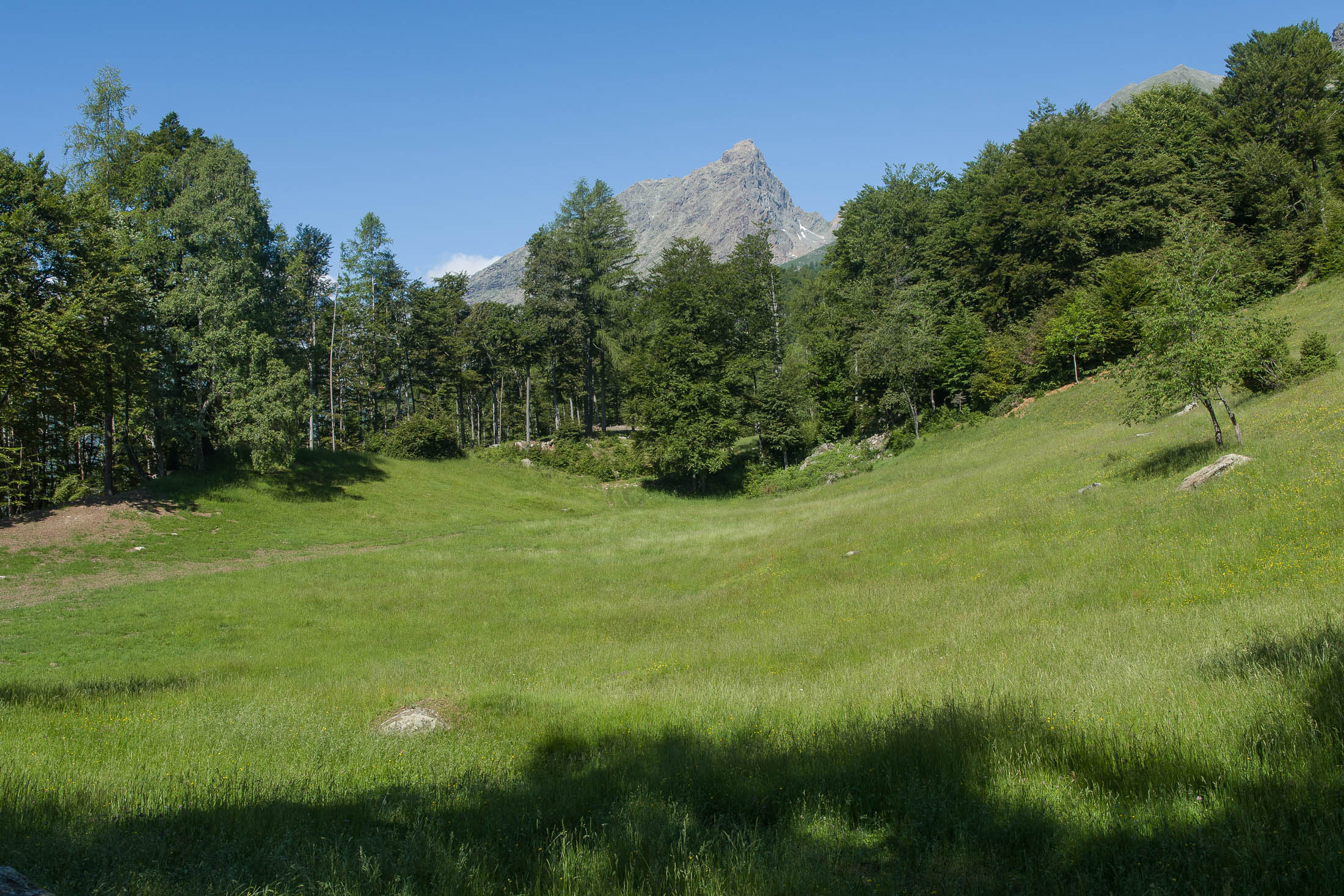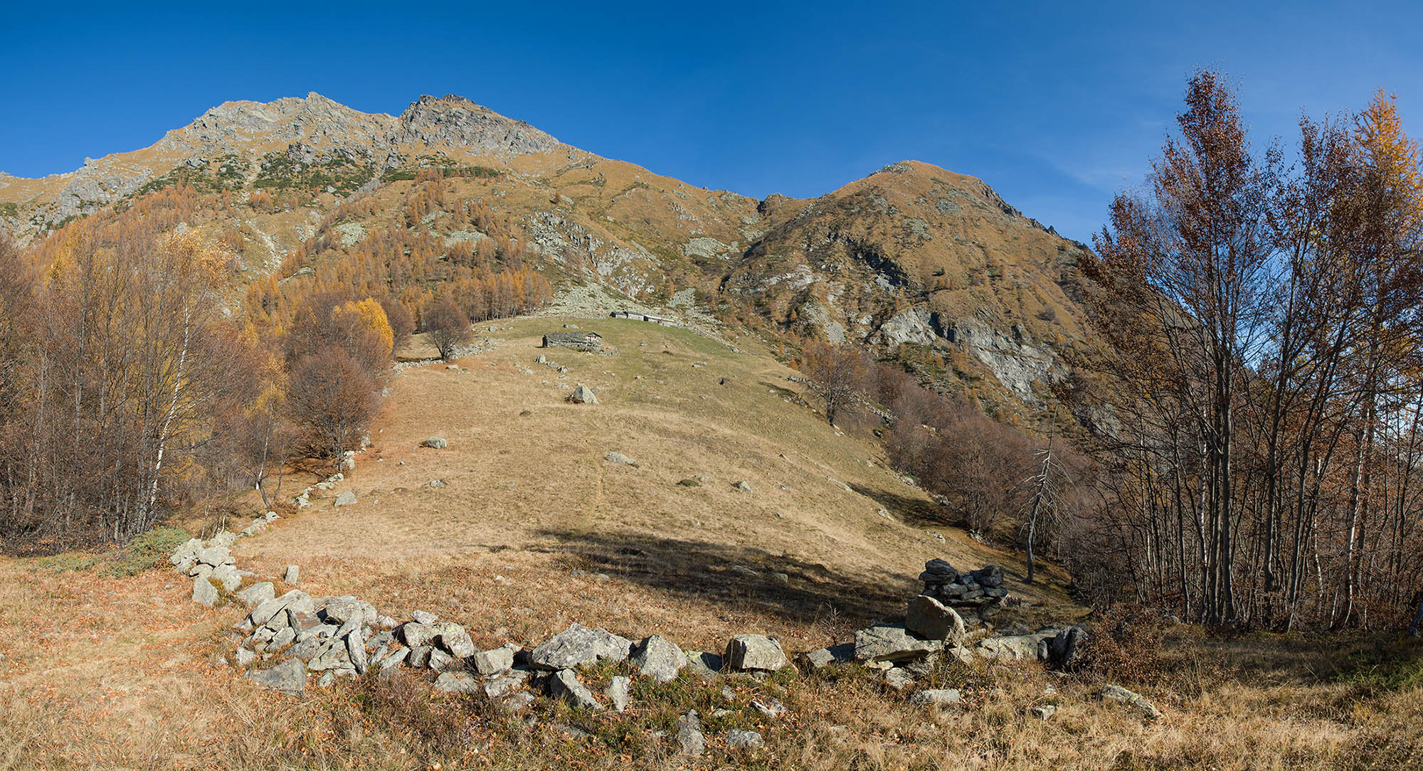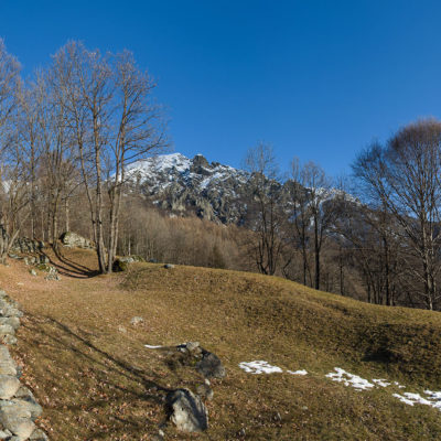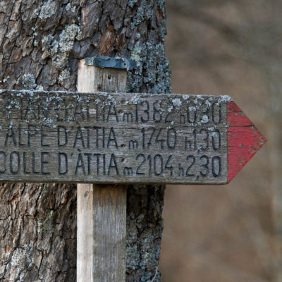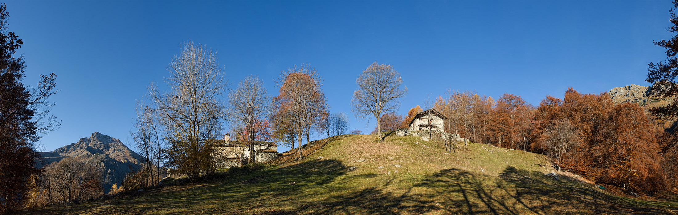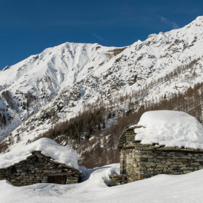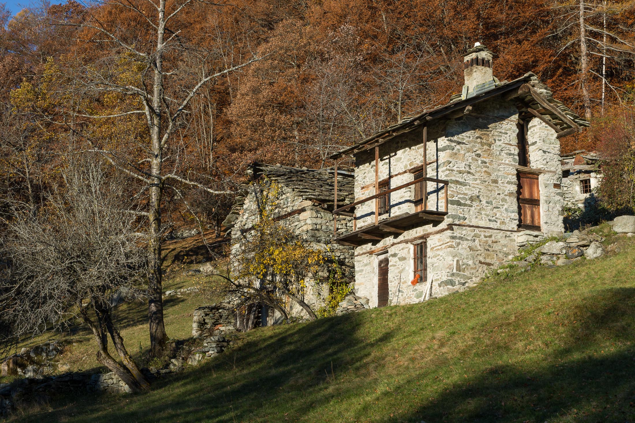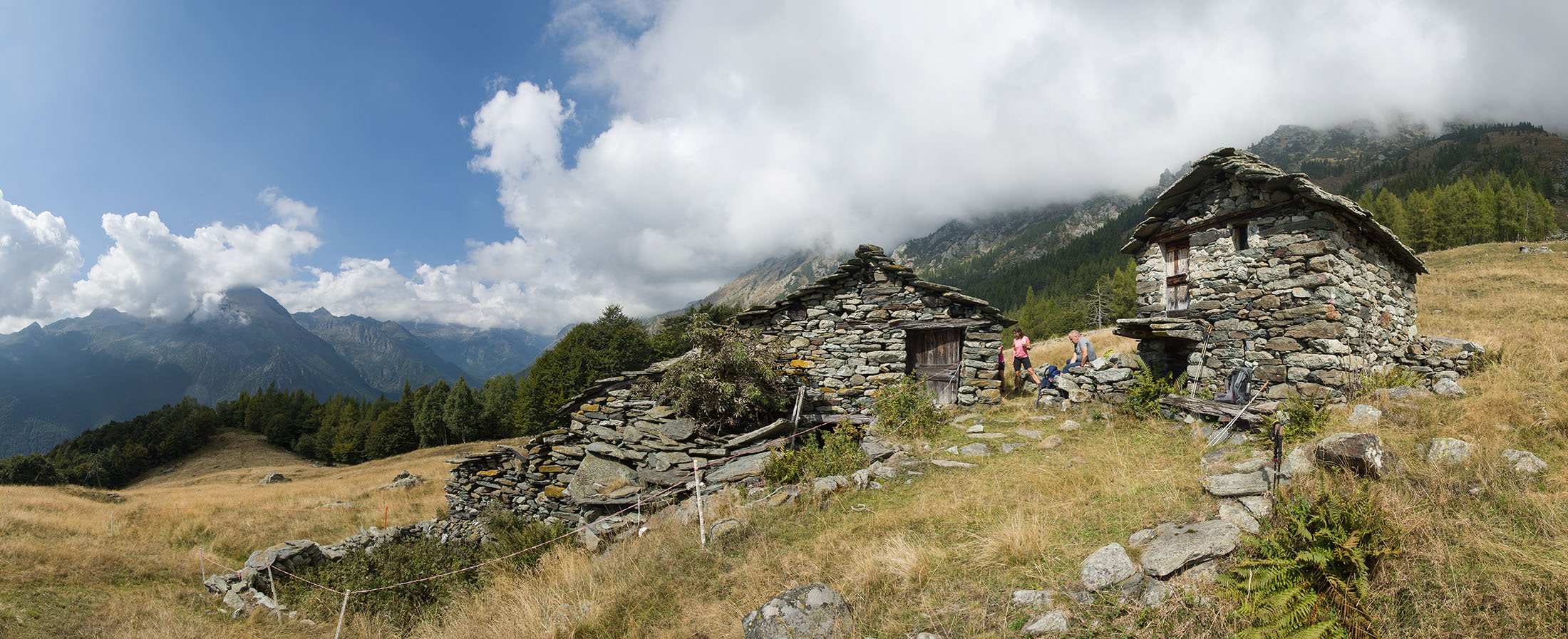 Vom grossen Dorfplatz im Ortskern von Ala di Stura (1075 m) folgt man zunächst etwa 500 m der Strasse talaufwärts bis zu einem restaurierten Bildstock. Dort beginnt ein unmarkierter alter Saumweg, der anfangs über kunstvoll angelegte Treppenstufen durch den Wald in einem Viertelstündchen nach Lombarda (1182 m) führt. Hier scheinen die Uhren stillzustehen, uralte Gemäuer, bröckelnder Putz, meterhohes Unkraut vor den Türen und Fenstern. Die meisten der Bauernhäuser wurden bereits vor Jahrzehnten verlassen, lediglich ein Anwesen ist noch dauerhaft bewohnt. Hinter den oberen Gebäuden mündet der Weg in ein unbefestigten Fahrweg, den man nur wenig später bei einem Wegweiser wieder verlässt. Auf einer wunderschönen alten Mulattiera (= Saumweg oder Maultierweg) geht es entlang von Trockensteinmauern in Kürze hinauf zur grossen Lichtung von Chiottero (1270 m), von den Einheimischen auch Ciautè genannt. Auch hier blickt man auf Ruinen, nur noch das kleine Kirchlein und ein einziges Gebäude werden heute noch instand gehalten. Der Weiterweg führt durch den Wald zum Pian d‘Attia (1382 m), eine ehemalige Temporärsiedlung am Rande einer aussichtsreichen kleine Hochfläche. Einige der Häuser und Ställe wurden bereits vor langer Zeit aufgegeben, andere wiederum sind hübsch renoviert und werden von den Einheimischen noch als Wochenendhäuschen genutzt. Wenige Schritte oberhalb am Waldrand kommt man zu einer unbeschilderten Weggabelung, wo es geradeaus (Richtung Norden) weitergeht, der Abzweig links Richtung Pianfè bleibt unbeachtet. Der Weiterweg führt nun durch dichten Buchenwald einen abschnittsweise steilen Rücken hinauf. Nach einer knappen Stunde liegt der Wald hinter einem und man erreicht die weitläufige Alpe d‘Attia (1740 m). Ein traumhaft schönes Fleckchen, hier kann man stundenlang verweilen und das tolle Panorama auf die Berge des Val d‘Ala geniessen. Die obere der beiden Gebäudegruppen wird auch heute noch in den Sommermonaten von einer sympathischen Familie aus dem Tal bewirtschaftet.