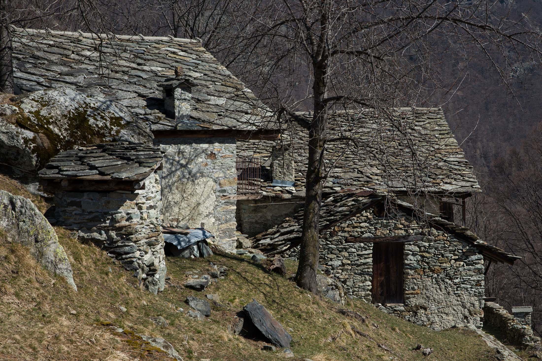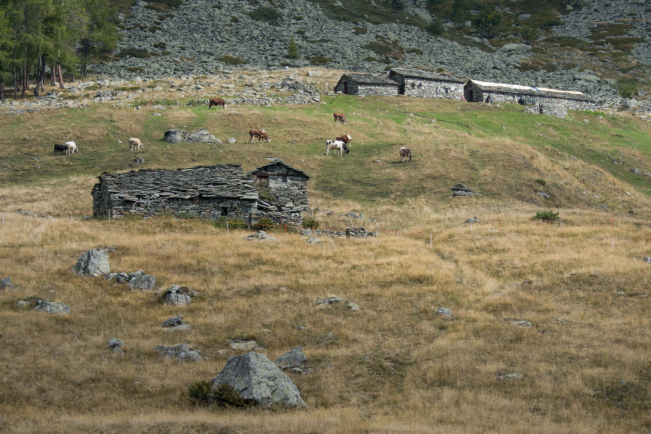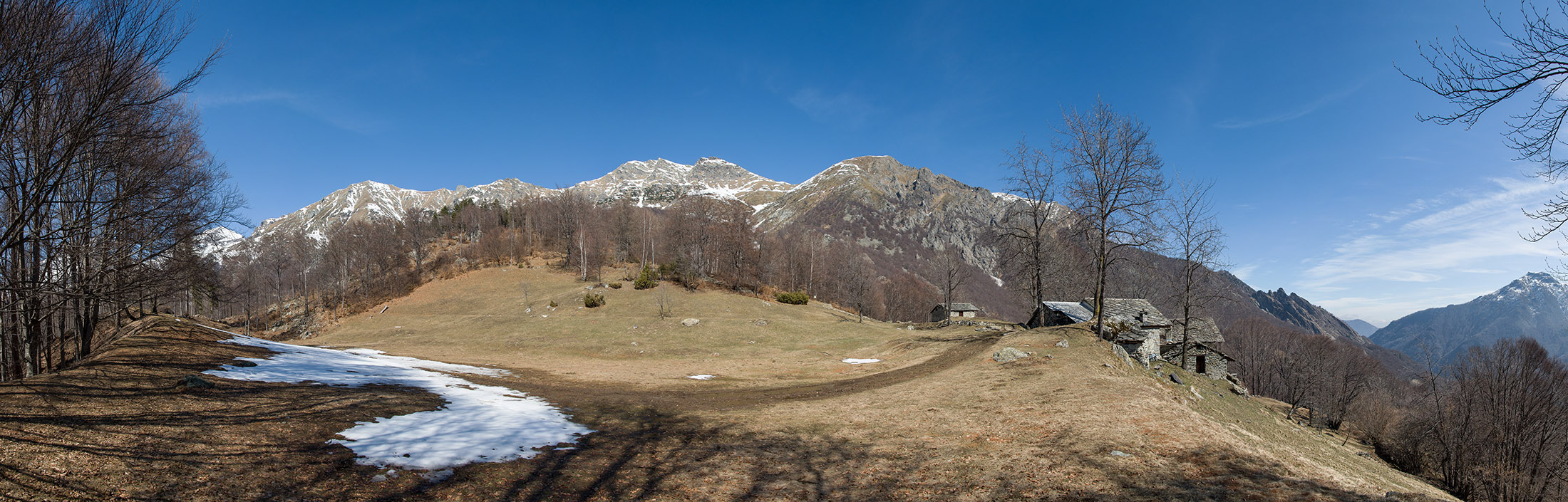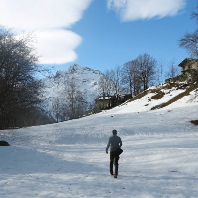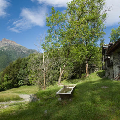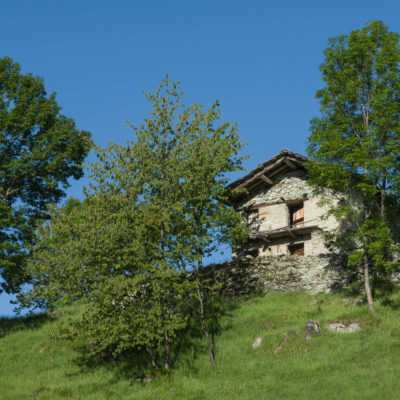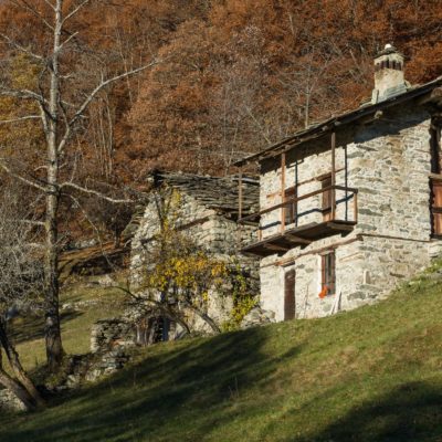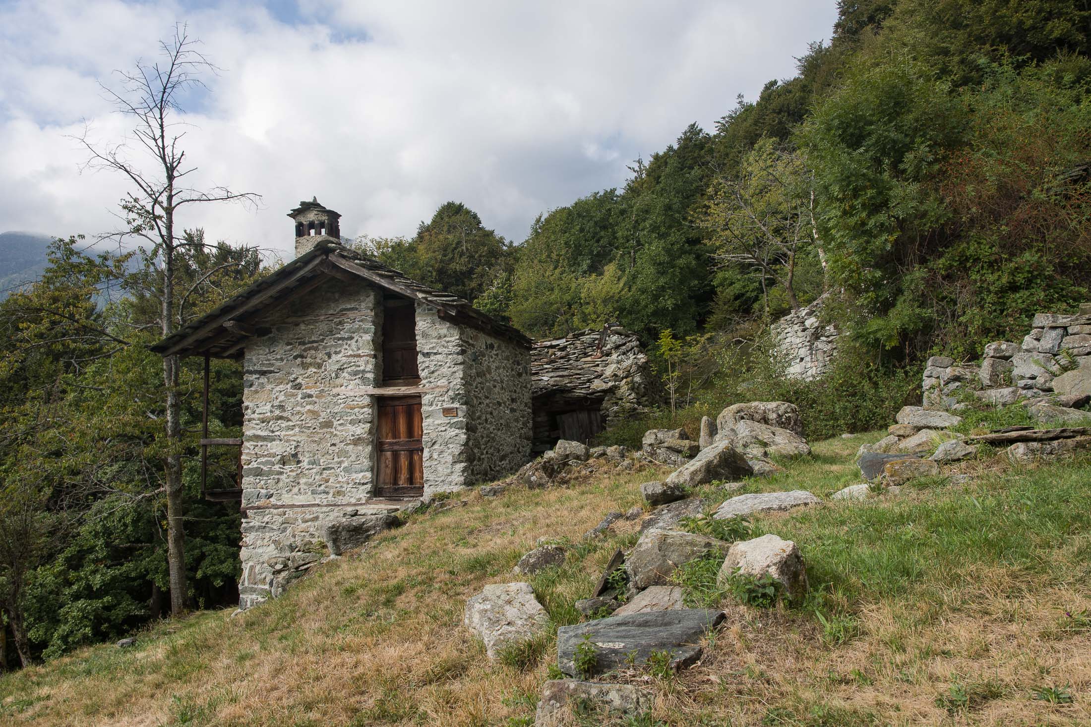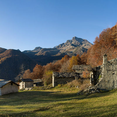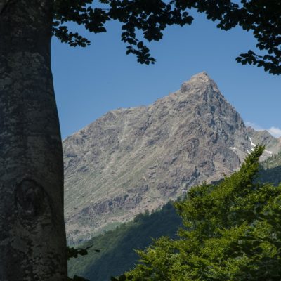 Vom grossen Dorfplatz im Ortskern von Ala di Stura (1075 m) folgt man zunächst etwa 500 m der Strasse talaufwärts bis zu einem restaurierten Bildstock. Dort beginnt ein unmarkierter alter Saumweg, der anfangs über kunstvoll angelegte Treppenstufen durch den Wald in einem Viertelstündchen nach Lombarda (1182 m) führt. Hier scheinen die Uhren stillzustehen, uralte Gemäuer, bröckelnder Putz, meterhohes Unkraut vor den Türen und Fenstern. Die meisten der Bauernhäuser wurden bereits vor Jahrzehnten verlassen, lediglich ein Anwesen ist noch dauerhaft bewohnt. Hinter den oberen Gebäuden mündet der Weg in ein unbefestigten Fahrweg, den man nur wenig später bei einem Wegweiser wieder verlässt. Auf einer wunderschönen alten Mulattiera (= Saumweg oder Maultierweg) geht es entlang von Trockensteinmauern in Kürze hinauf zur grossen Lichtung von Chiottero (1270 m), von den Einheimischen auch Ciautè genannt. Auch hier blickt man auf Ruinen, nur noch das kleine Kirchlein und ein einziges Gebäude werden heute noch instand gehalten. Der Weiterweg führt durch den Wald zum Pian d‘Attia (1382 m), eine ehemalige Temporärsiedlung am Rande einer aussichtsreichen kleine Hochfläche. Einige der Häuser und Ställe wurden bereits vor langer Zeit aufgegeben, andere wiederum sind hübsch renoviert und werden von den Einheimischen noch als Wochenendhäuschen genutzt. Wenige Schritte oberhalb am Waldrand kommt man zu einer unbeschilderten Weggabelung, wo es geradeaus (Richtung Norden) weitergeht, der Abzweig links Richtung Pianfè bleibt unbeachtet. Der Weiterweg führt nun durch dichten Buchenwald einen abschnittsweise steilen Rücken hinauf. Nach einer knappen Stunde liegt der Wald hinter einem und man erreicht die weitläufige Alpe d‘Attia (1740 m). Ein traumhaft schönes Fleckchen, hier kann man stundenlang verweilen und das tolle Panorama auf die Berge des Val d‘Ala geniessen. Die obere der beiden Gebäudegruppen wird auch heute noch in den Sommermonaten von einer sympathischen Familie aus dem Tal bewirtschaftet.