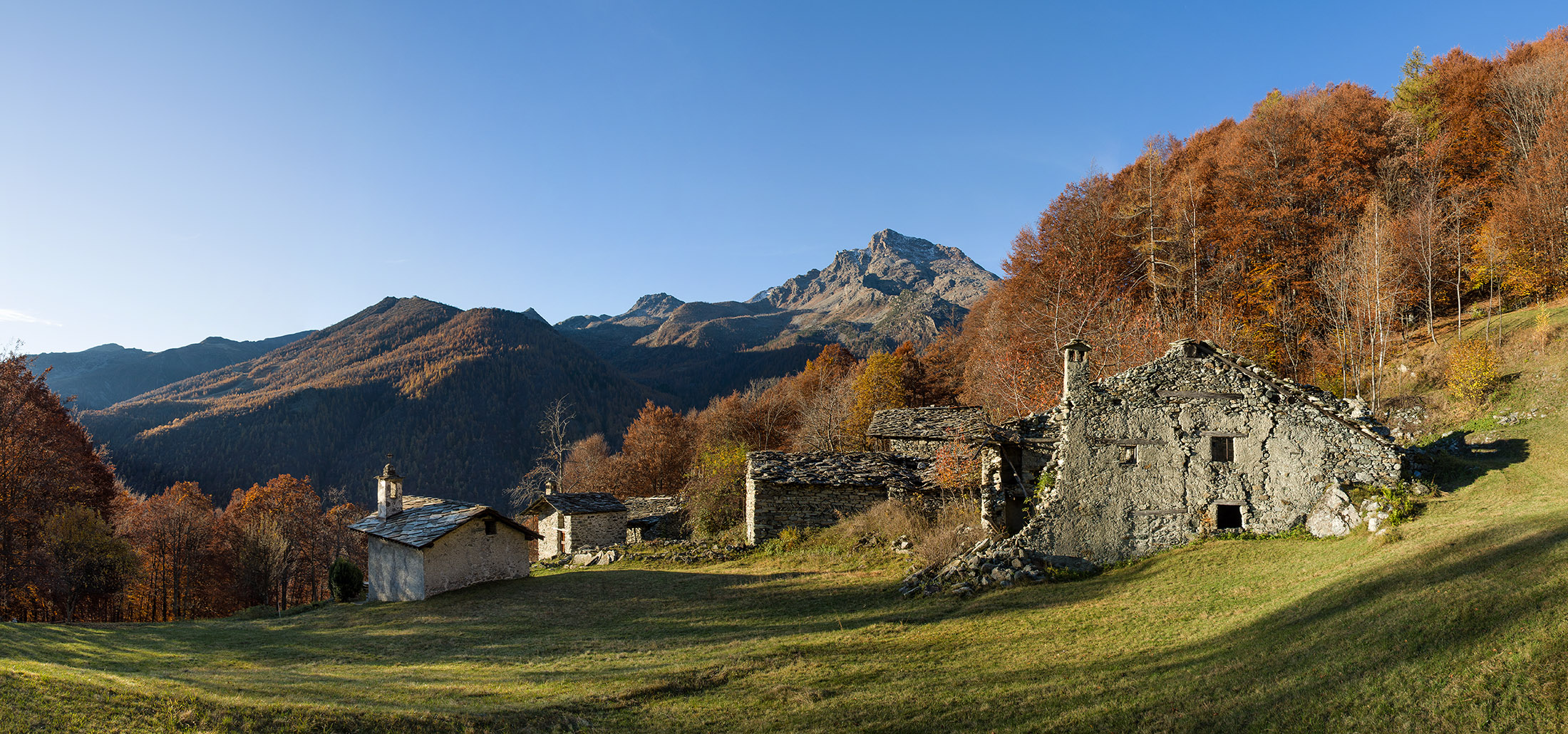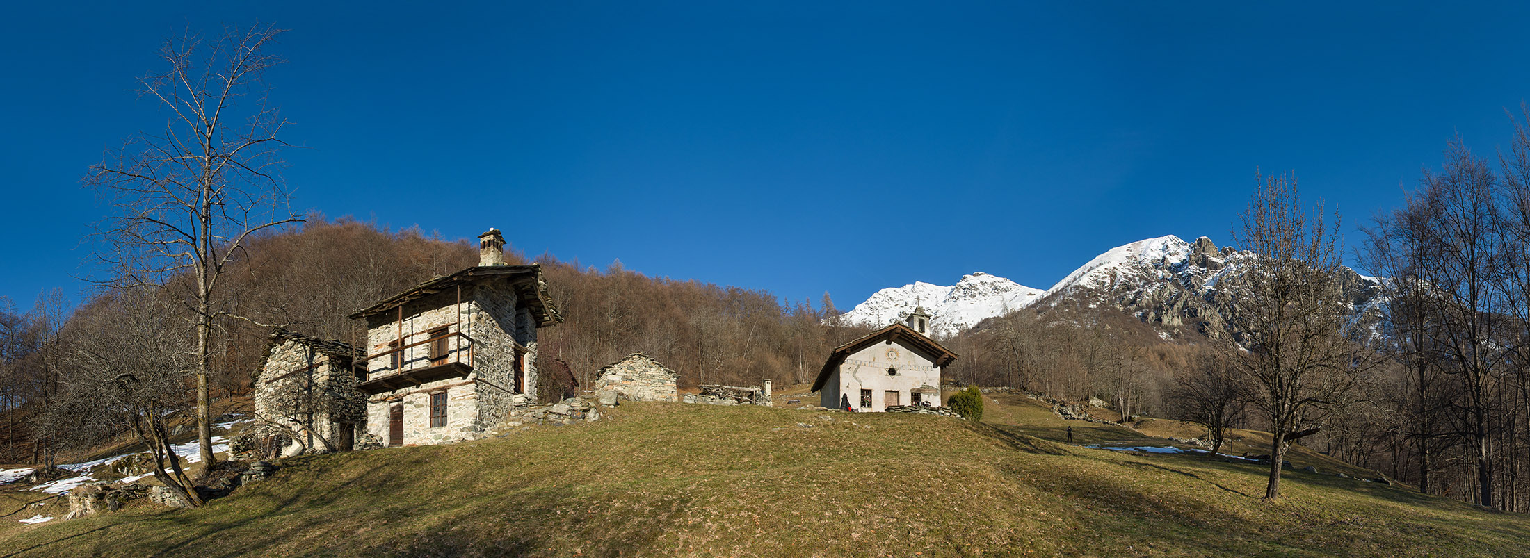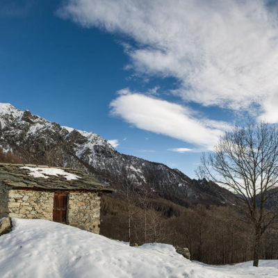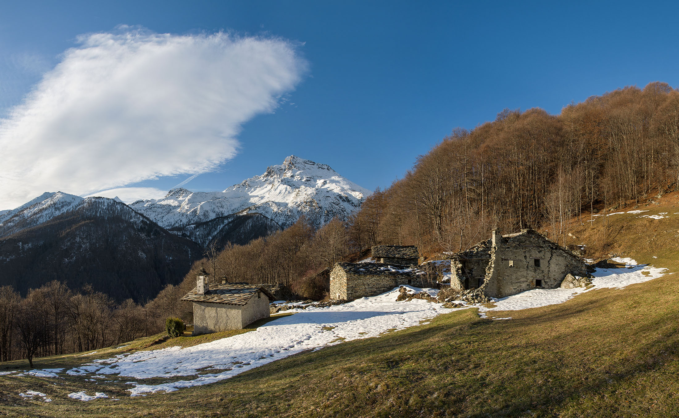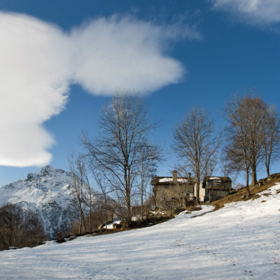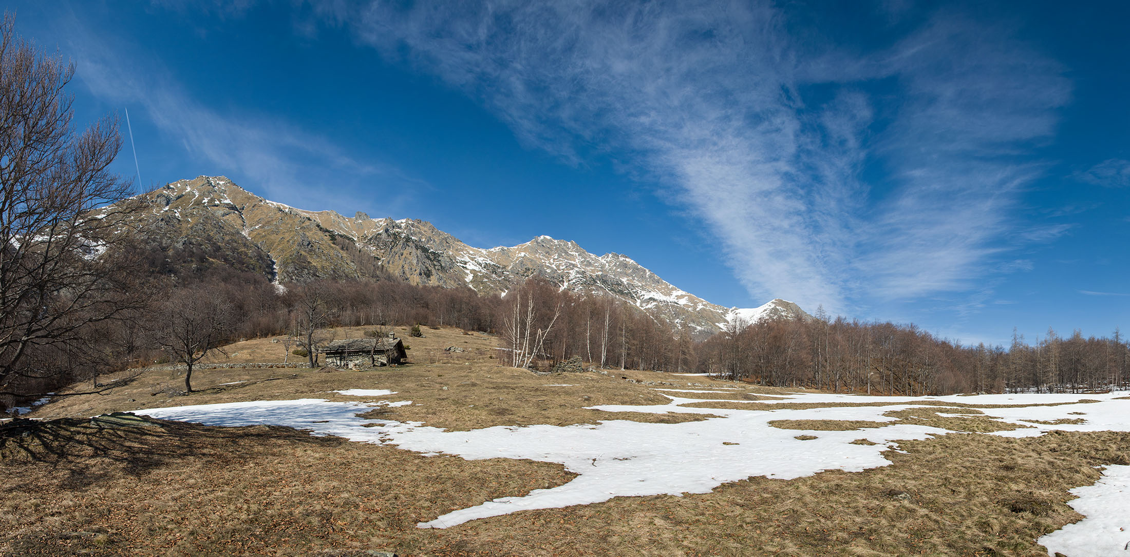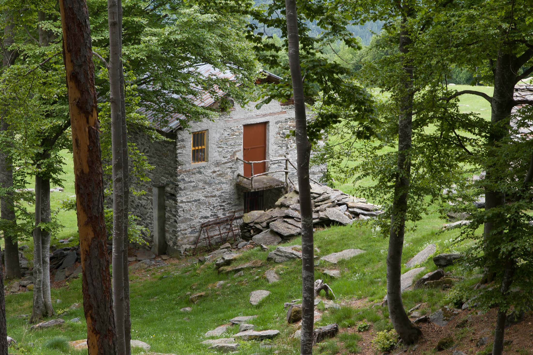 Vom grossen Dorfplatz im Ortskern von Ala di Stura (1075 m) folgt man zunächst etwa 500 m der Strasse talaufwärts bis zu einem restaurierten Bildstock. Dort beginnt ein unmarkierter alter Saumweg, der anfangs über kunstvoll angelegte Treppenstufen durch den Wald in einem Viertelstündchen nach Lombarda (1182 m) führt. Hier scheinen die Uhren stillzustehen, uralte Gemäuer, bröckelnder Putz, meterhohes Unkraut vor den Türen und Fenstern. Die meisten der Bauernhäuser wurden bereits vor Jahrzehnten verlassen, lediglich ein Anwesen ist noch dauerhaft bewohnt. Hinter den oberen Gebäuden mündet der Weg in ein unbefestigten Fahrweg, den man nur wenig später bei einem Wegweiser wieder verlässt. Auf einer wunderschönen alten Mulattiera (= Saumweg oder Maultierweg) geht es entlang von Trockensteinmauern in Kürze hinauf zur grossen Lichtung von Chiottero (1270 m), von den Einheimischen auch Ciautè genannt. Auch hier blickt man auf Ruinen, nur noch das kleine Kirchlein und ein einziges Gebäude werden heute noch instand gehalten. Der Weiterweg führt durch den Wald zum Pian d‘Attia (1382 m), eine ehemalige Temporärsiedlung am Rande einer aussichtsreichen kleine Hochfläche. Einige der Häuser und Ställe wurden bereits vor langer Zeit aufgegeben, andere wiederum sind hübsch renoviert und werden von den Einheimischen noch als Wochenendhäuschen genutzt. Wenige Schritte oberhalb am Waldrand kommt man zu einer unbeschilderten Weggabelung, wo es geradeaus (Richtung Norden) weitergeht, der Abzweig links Richtung Pianfè bleibt unbeachtet. Der Weiterweg führt nun durch dichten Buchenwald einen abschnittsweise steilen Rücken hinauf. Nach einer knappen Stunde liegt der Wald hinter einem und man erreicht die weitläufige Alpe d‘Attia (1740 m). Ein traumhaft schönes Fleckchen, hier kann man stundenlang verweilen und das tolle Panorama auf die Berge des Val d‘Ala geniessen. Die obere der beiden Gebäudegruppen wird auch heute noch in den Sommermonaten von einer sympathischen Familie aus dem Tal bewirtschaftet.