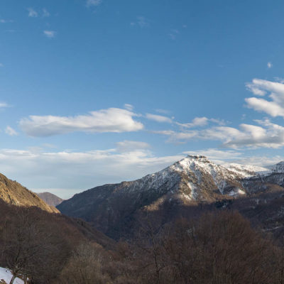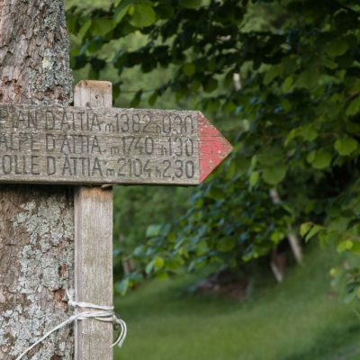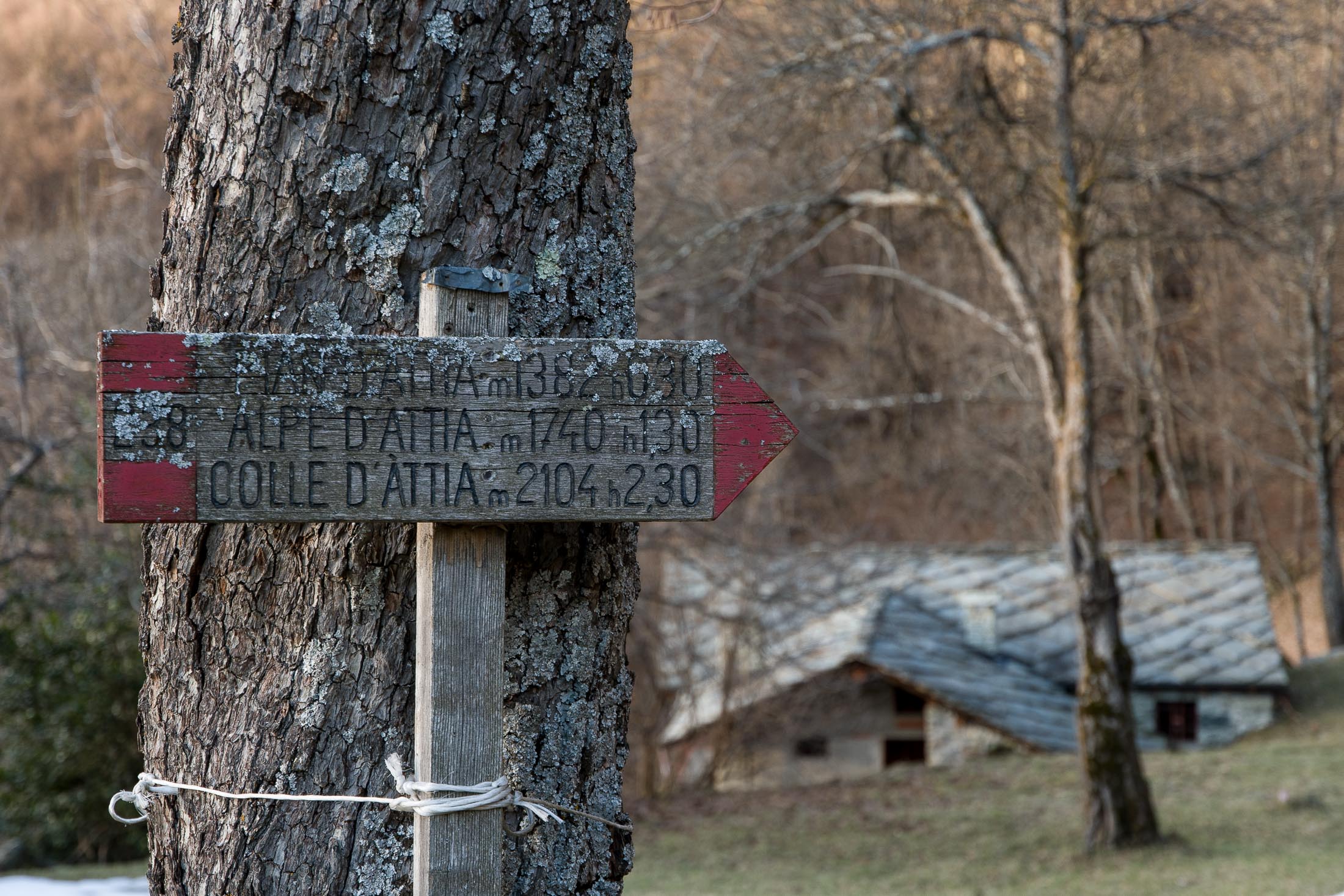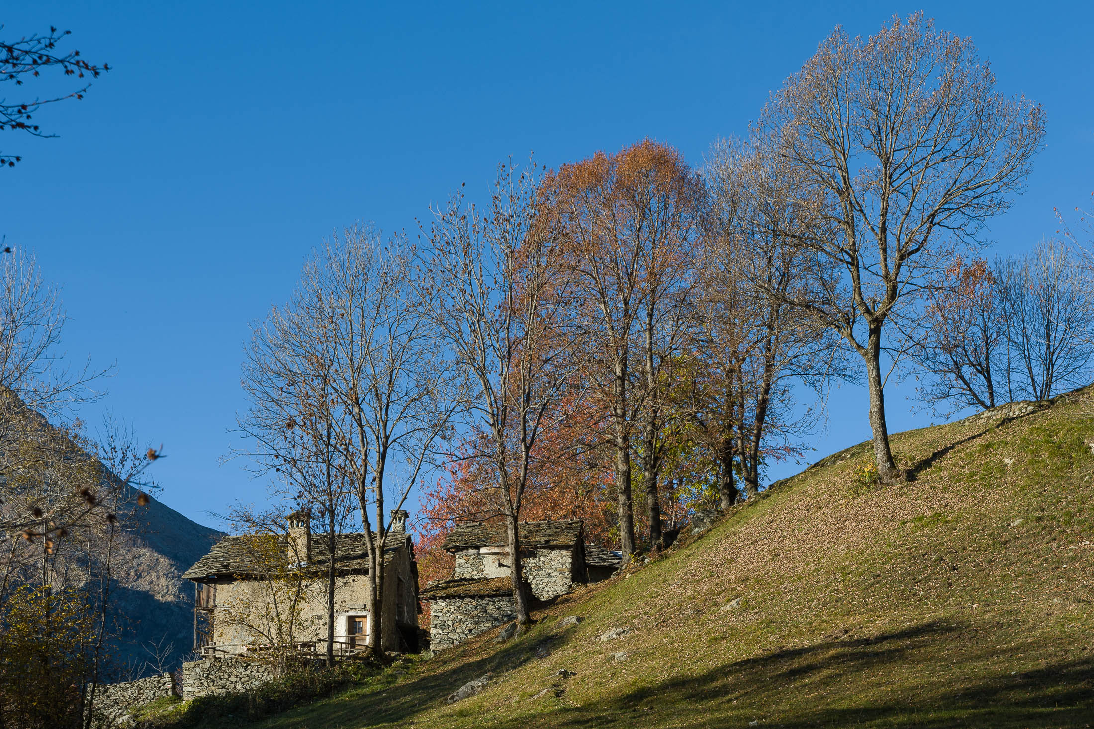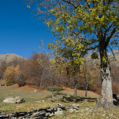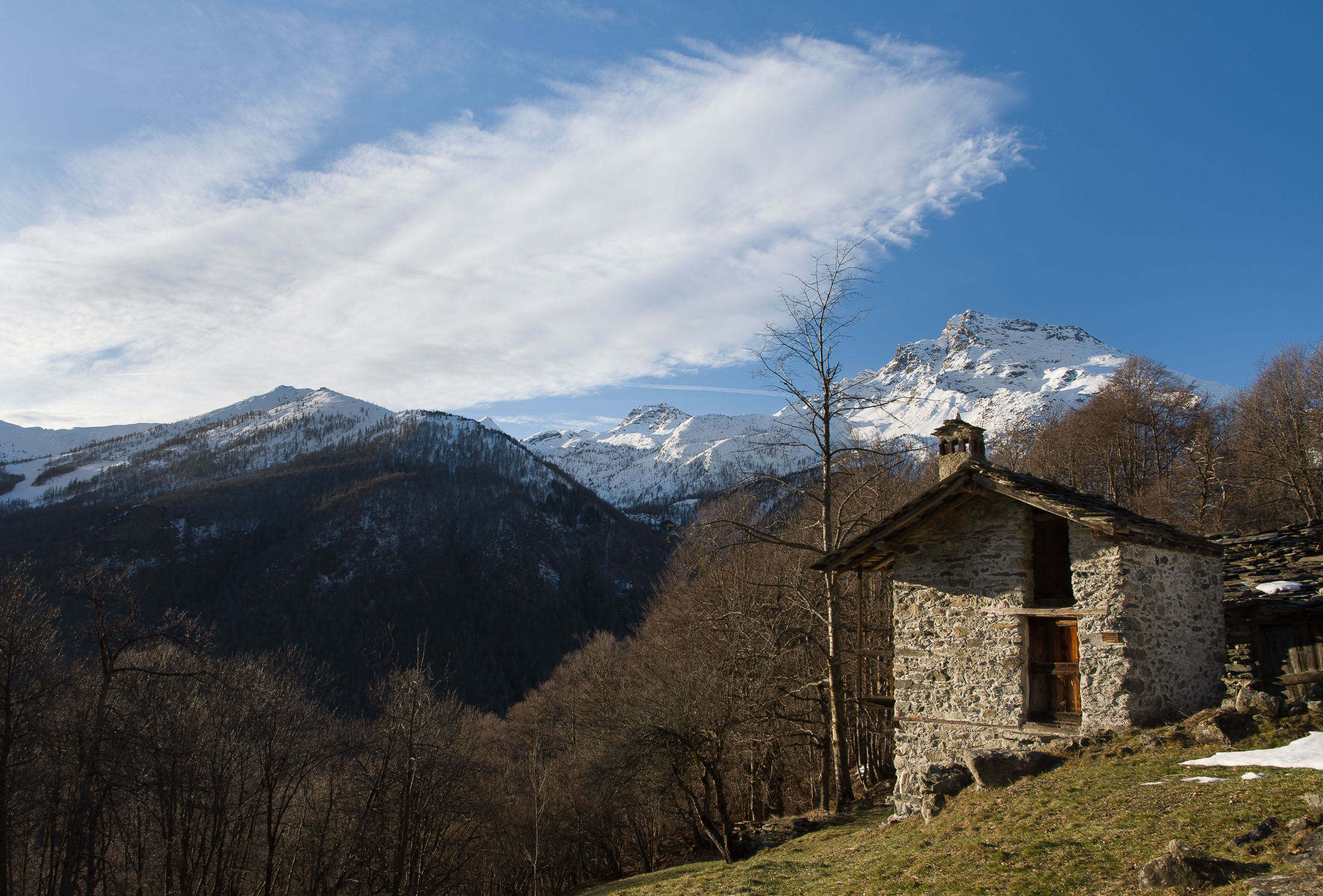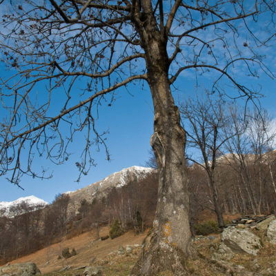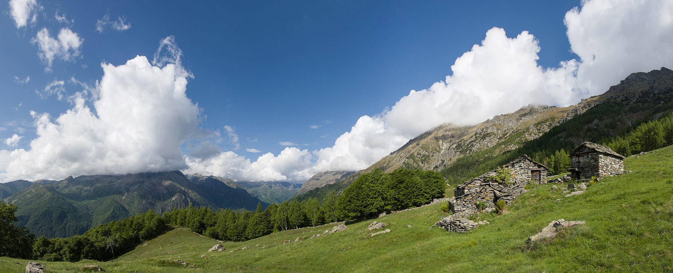 Vom grossen Dorfplatz im Ortskern von Ala di Stura (1075 m) folgt man zunächst etwa 500 m der Strasse talaufwärts bis zu einem restaurierten Bildstock. Dort beginnt ein unmarkierter alter Saumweg, der anfangs über kunstvoll angelegte Treppenstufen durch den Wald in einem Viertelstündchen nach Lombarda (1182 m) führt. Hier scheinen die Uhren stillzustehen, uralte Gemäuer, bröckelnder Putz, meterhohes Unkraut vor den Türen und Fenstern. Die meisten der Bauernhäuser wurden bereits vor Jahrzehnten verlassen, lediglich ein Anwesen ist noch dauerhaft bewohnt. Hinter den oberen Gebäuden mündet der Weg in ein unbefestigten Fahrweg, den man nur wenig später bei einem Wegweiser wieder verlässt. Auf einer wunderschönen alten Mulattiera (= Saumweg oder Maultierweg) geht es entlang von Trockensteinmauern in Kürze hinauf zur grossen Lichtung von Chiottero (1270 m), von den Einheimischen auch Ciautè genannt. Auch hier blickt man auf Ruinen, nur noch das kleine Kirchlein und ein einziges Gebäude werden heute noch instand gehalten. Der Weiterweg führt durch den Wald zum Pian d‘Attia (1382 m), eine ehemalige Temporärsiedlung am Rande einer aussichtsreichen kleine Hochfläche. Einige der Häuser und Ställe wurden bereits vor langer Zeit aufgegeben, andere wiederum sind hübsch renoviert und werden von den Einheimischen noch als Wochenendhäuschen genutzt. Wenige Schritte oberhalb am Waldrand kommt man zu einer unbeschilderten Weggabelung, wo es geradeaus (Richtung Norden) weitergeht, der Abzweig links Richtung Pianfè bleibt unbeachtet. Der Weiterweg führt nun durch dichten Buchenwald einen abschnittsweise steilen Rücken hinauf. Nach einer knappen Stunde liegt der Wald hinter einem und man erreicht die weitläufige Alpe d‘Attia (1740 m). Ein traumhaft schönes Fleckchen, hier kann man stundenlang verweilen und das tolle Panorama auf die Berge des Val d‘Ala geniessen. Die obere der beiden Gebäudegruppen wird auch heute noch in den Sommermonaten von einer sympathischen Familie aus dem Tal bewirtschaftet.