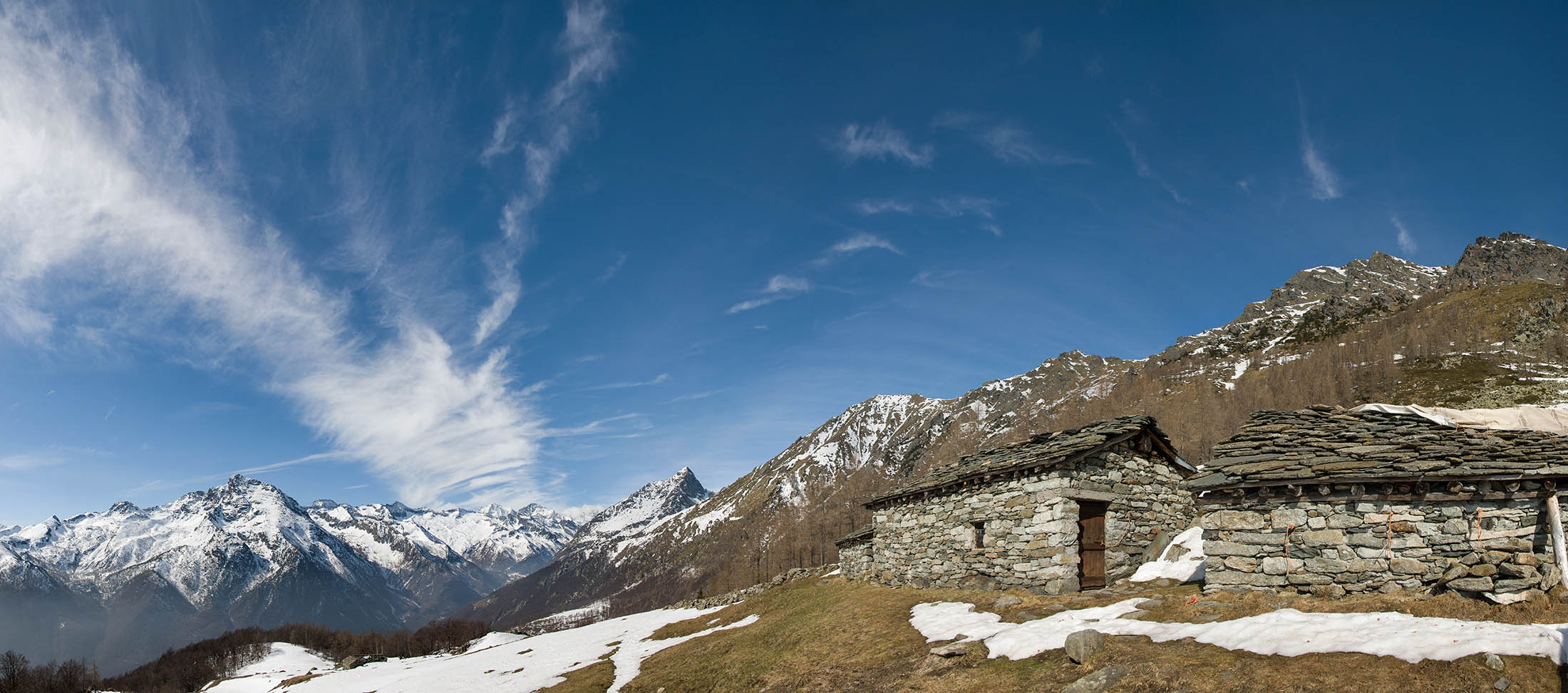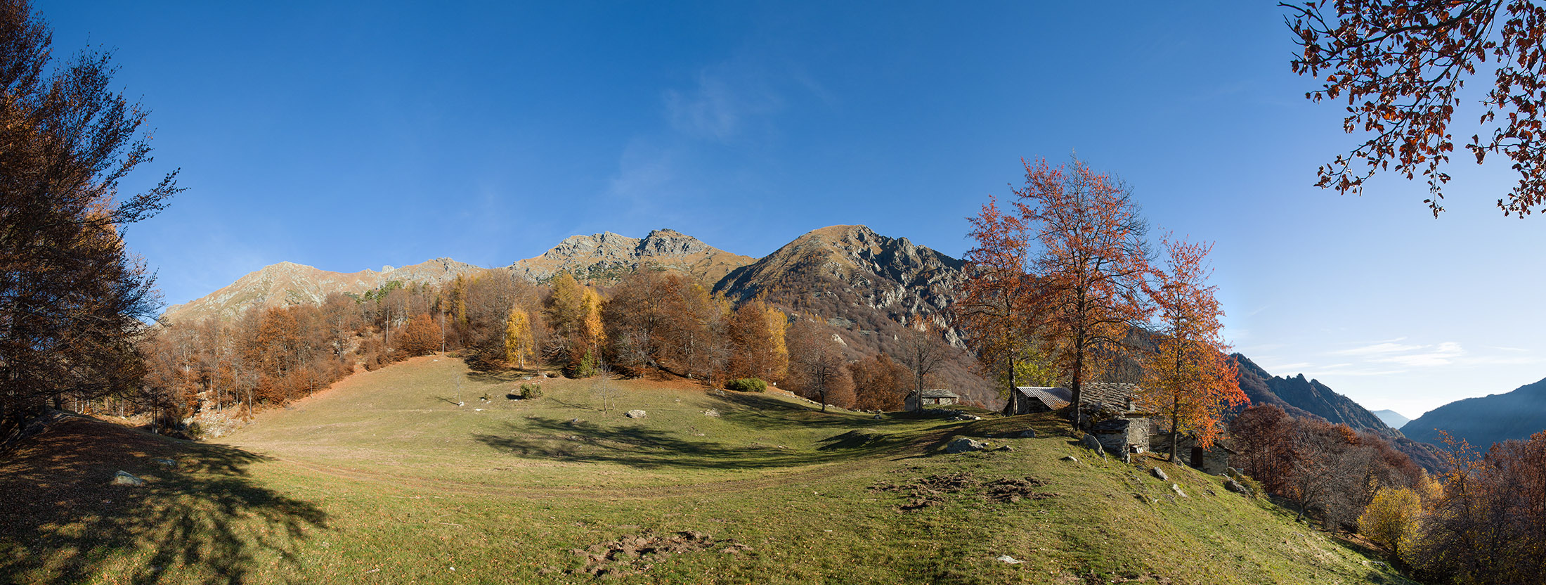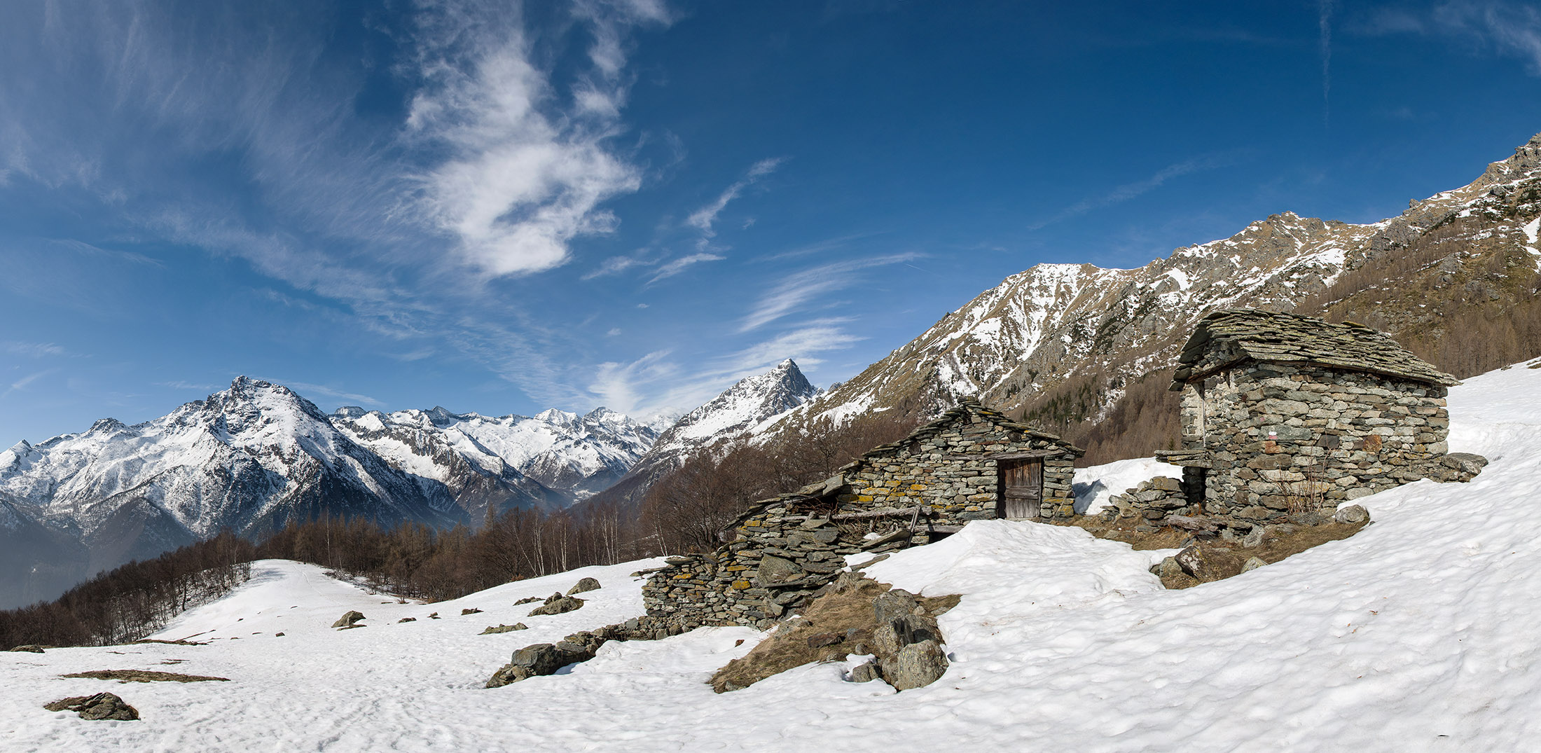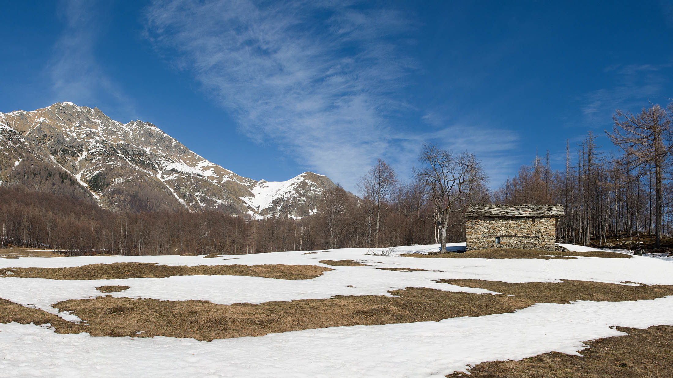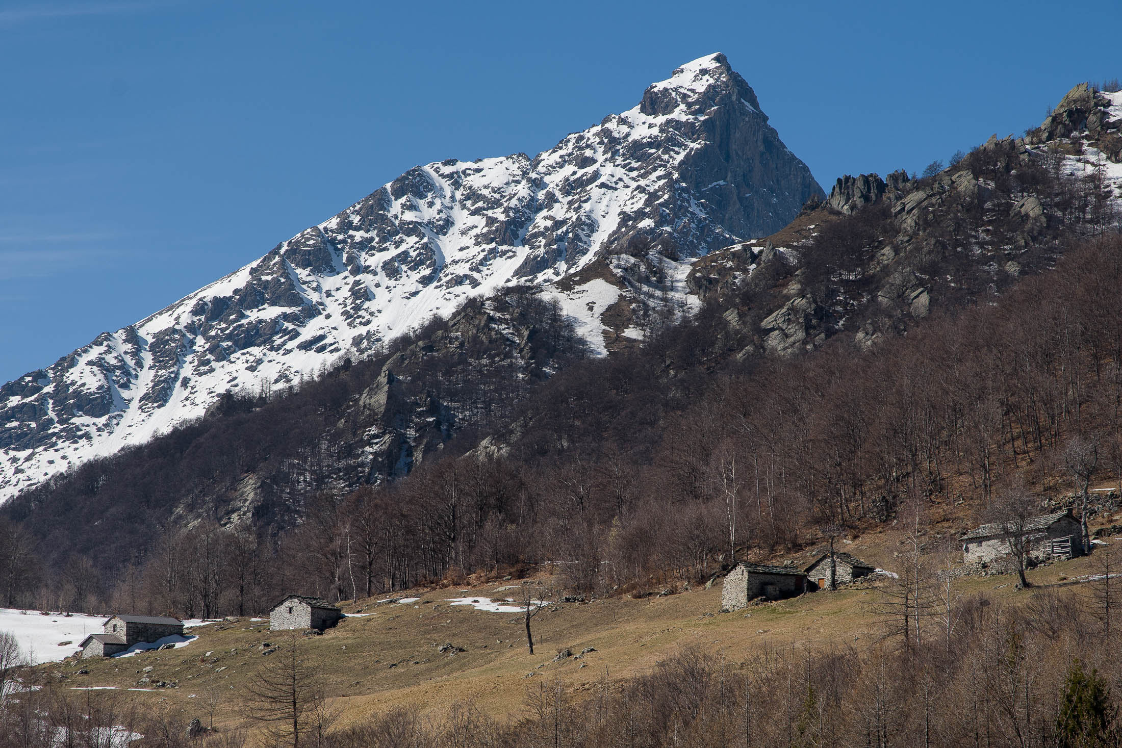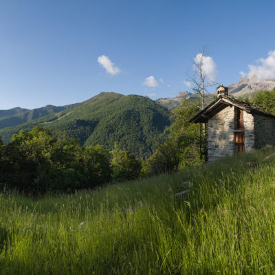 Vom grossen Dorfplatz im Ortskern von Ala di Stura (1075 m) folgt man zunächst etwa 500 m der Strasse talaufwärts bis zu einem restaurierten Bildstock. Dort beginnt ein unmarkierter alter Saumweg, der anfangs über kunstvoll angelegte Treppenstufen durch den Wald in einem Viertelstündchen nach Lombarda (1182 m) führt. Hier scheinen die Uhren stillzustehen, uralte Gemäuer, bröckelnder Putz, meterhohes Unkraut vor den Türen und Fenstern. Die meisten der Bauernhäuser wurden bereits vor Jahrzehnten verlassen, lediglich ein Anwesen ist noch dauerhaft bewohnt. Hinter den oberen Gebäuden mündet der Weg in ein unbefestigten Fahrweg, den man nur wenig später bei einem Wegweiser wieder verlässt. Auf einer wunderschönen alten Mulattiera (= Saumweg oder Maultierweg) geht es entlang von Trockensteinmauern in Kürze hinauf zur grossen Lichtung von Chiottero (1270 m), von den Einheimischen auch Ciautè genannt. Auch hier blickt man auf Ruinen, nur noch das kleine Kirchlein und ein einziges Gebäude werden heute noch instand gehalten. Der Weiterweg führt durch den Wald zum Pian d‘Attia (1382 m), eine ehemalige Temporärsiedlung am Rande einer aussichtsreichen kleine Hochfläche. Einige der Häuser und Ställe wurden bereits vor langer Zeit aufgegeben, andere wiederum sind hübsch renoviert und werden von den Einheimischen noch als Wochenendhäuschen genutzt. Wenige Schritte oberhalb am Waldrand kommt man zu einer unbeschilderten Weggabelung, wo es geradeaus (Richtung Norden) weitergeht, der Abzweig links Richtung Pianfè bleibt unbeachtet. Der Weiterweg führt nun durch dichten Buchenwald einen abschnittsweise steilen Rücken hinauf. Nach einer knappen Stunde liegt der Wald hinter einem und man erreicht die weitläufige Alpe d‘Attia (1740 m). Ein traumhaft schönes Fleckchen, hier kann man stundenlang verweilen und das tolle Panorama auf die Berge des Val d‘Ala geniessen. Die obere der beiden Gebäudegruppen wird auch heute noch in den Sommermonaten von einer sympathischen Familie aus dem Tal bewirtschaftet.