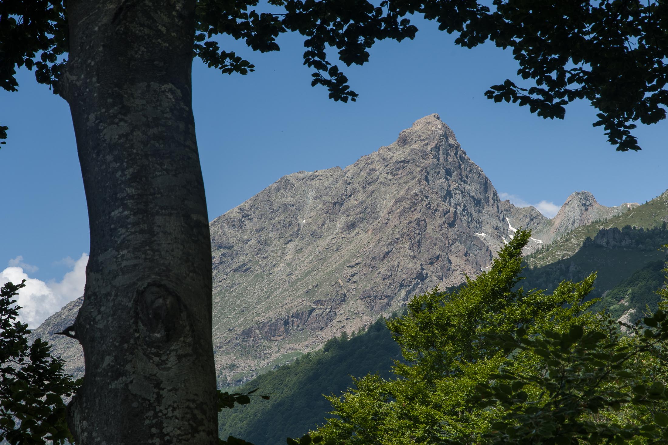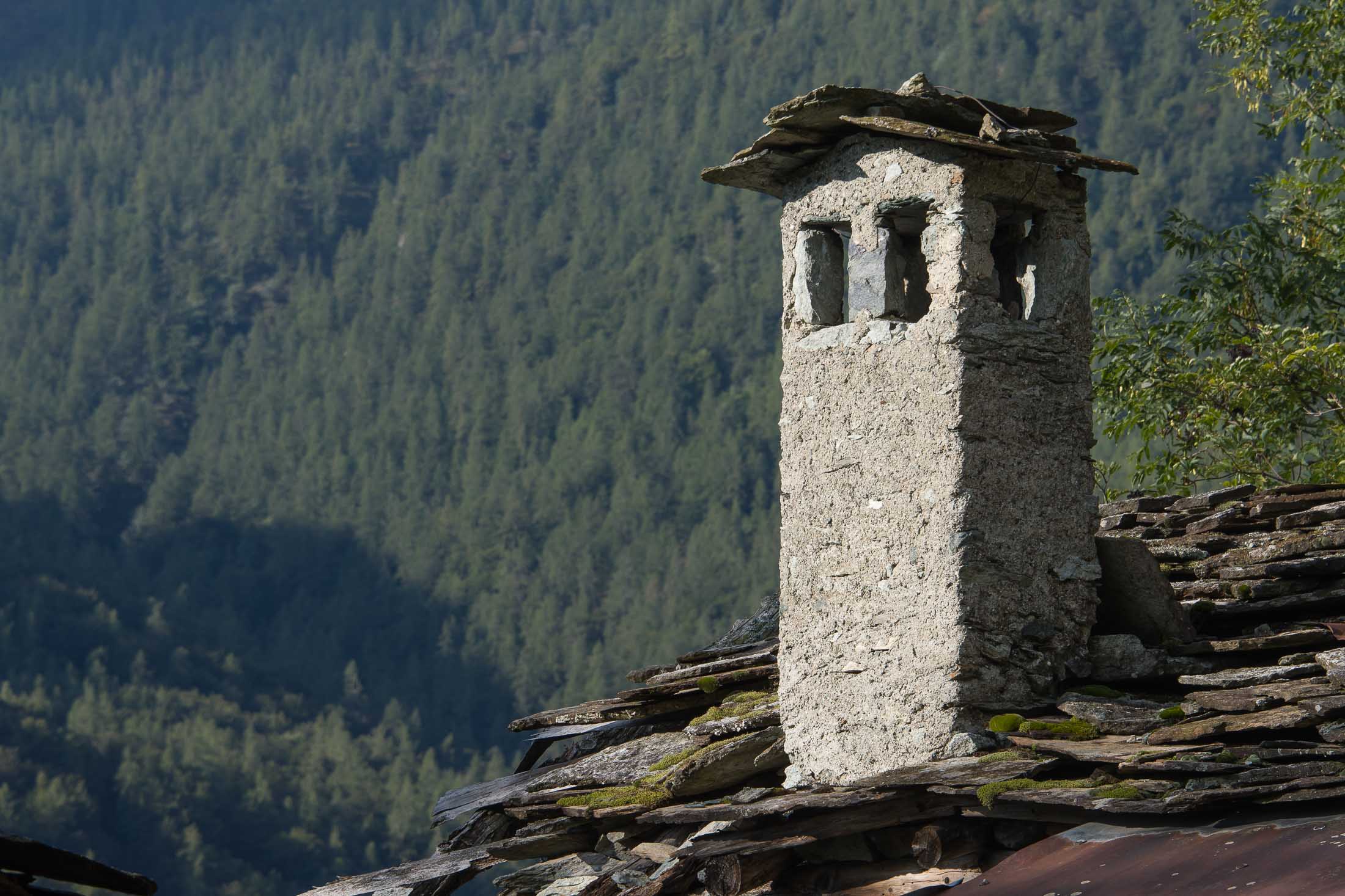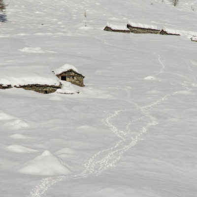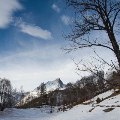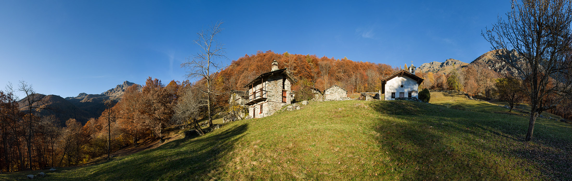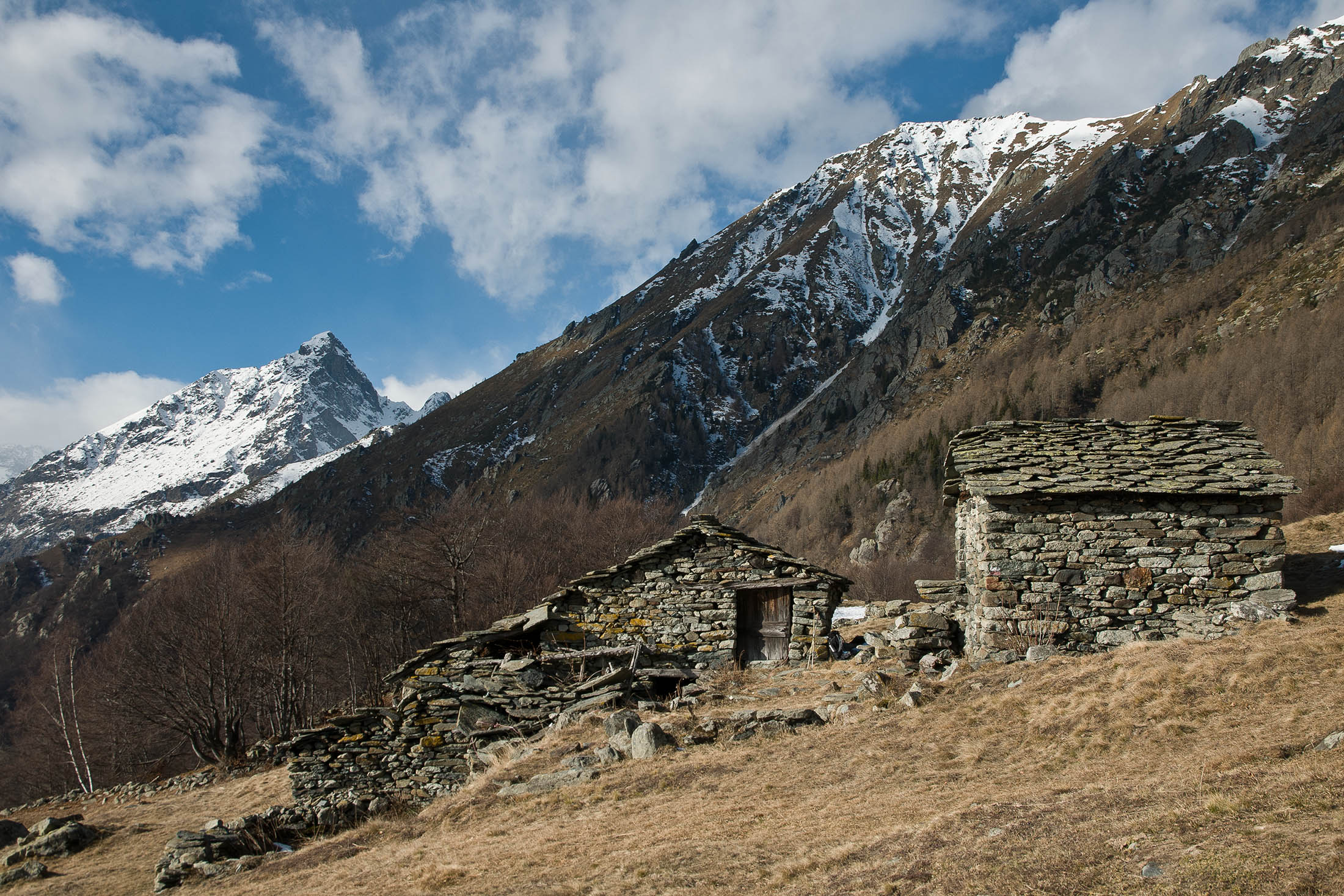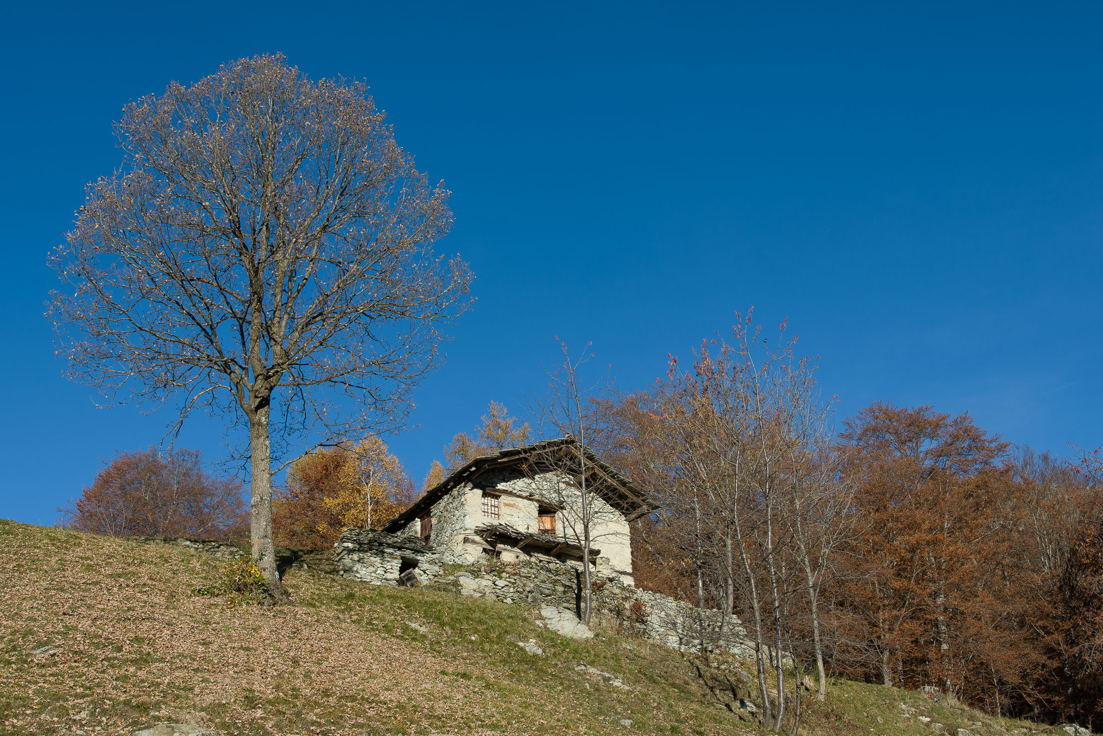 Vom grossen Dorfplatz im Ortskern von Ala di Stura (1075 m) folgt man zunächst etwa 500 m der Strasse talaufwärts bis zu einem restaurierten Bildstock. Dort beginnt ein unmarkierter alter Saumweg, der anfangs über kunstvoll angelegte Treppenstufen durch den Wald in einem Viertelstündchen nach Lombarda (1182 m) führt. Hier scheinen die Uhren stillzustehen, uralte Gemäuer, bröckelnder Putz, meterhohes Unkraut vor den Türen und Fenstern. Die meisten der Bauernhäuser wurden bereits vor Jahrzehnten verlassen, lediglich ein Anwesen ist noch dauerhaft bewohnt. Hinter den oberen Gebäuden mündet der Weg in ein unbefestigten Fahrweg, den man nur wenig später bei einem Wegweiser wieder verlässt. Auf einer wunderschönen alten Mulattiera (= Saumweg oder Maultierweg) geht es entlang von Trockensteinmauern in Kürze hinauf zur grossen Lichtung von Chiottero (1270 m), von den Einheimischen auch Ciautè genannt. Auch hier blickt man auf Ruinen, nur noch das kleine Kirchlein und ein einziges Gebäude werden heute noch instand gehalten. Der Weiterweg führt durch den Wald zum Pian d‘Attia (1382 m), eine ehemalige Temporärsiedlung am Rande einer aussichtsreichen kleine Hochfläche. Einige der Häuser und Ställe wurden bereits vor langer Zeit aufgegeben, andere wiederum sind hübsch renoviert und werden von den Einheimischen noch als Wochenendhäuschen genutzt. Wenige Schritte oberhalb am Waldrand kommt man zu einer unbeschilderten Weggabelung, wo es geradeaus (Richtung Norden) weitergeht, der Abzweig links Richtung Pianfè bleibt unbeachtet. Der Weiterweg führt nun durch dichten Buchenwald einen abschnittsweise steilen Rücken hinauf. Nach einer knappen Stunde liegt der Wald hinter einem und man erreicht die weitläufige Alpe d‘Attia (1740 m). Ein traumhaft schönes Fleckchen, hier kann man stundenlang verweilen und das tolle Panorama auf die Berge des Val d‘Ala geniessen. Die obere der beiden Gebäudegruppen wird auch heute noch in den Sommermonaten von einer sympathischen Familie aus dem Tal bewirtschaftet.