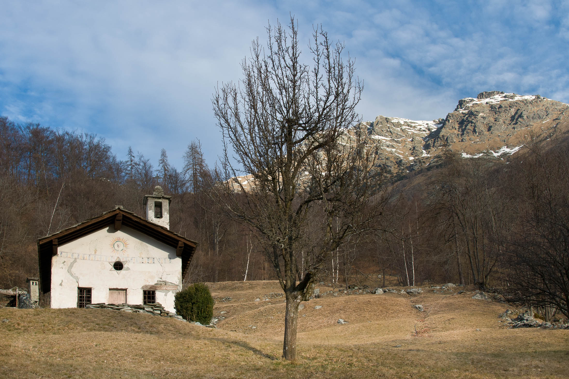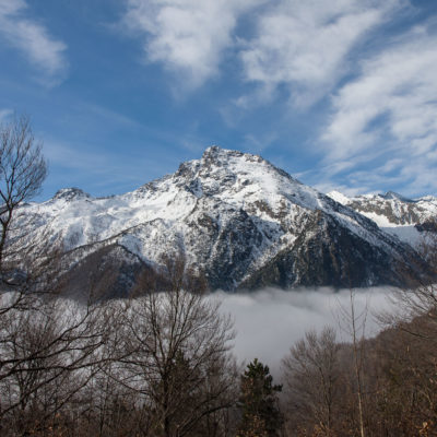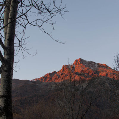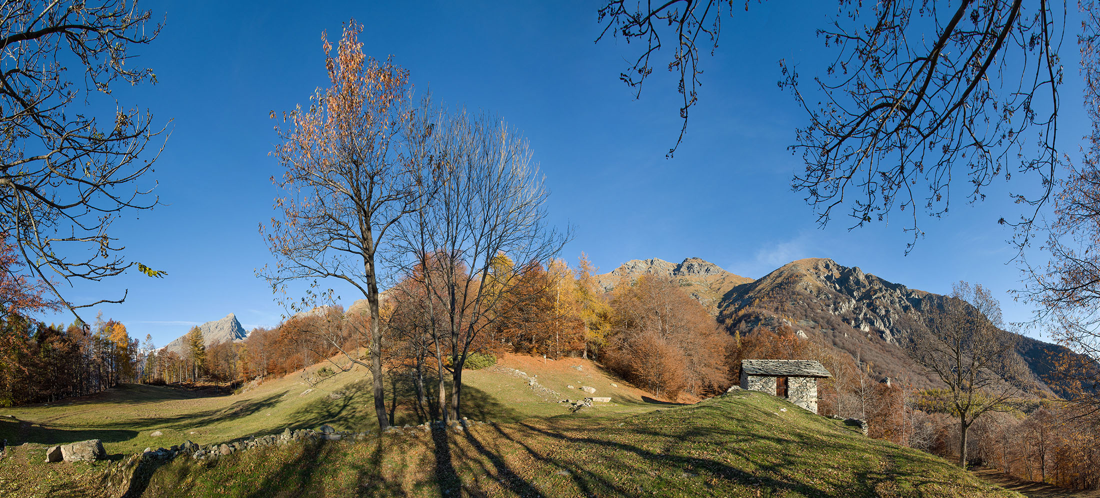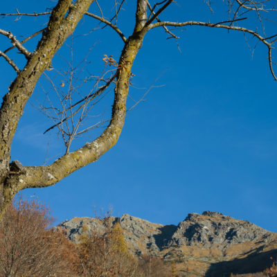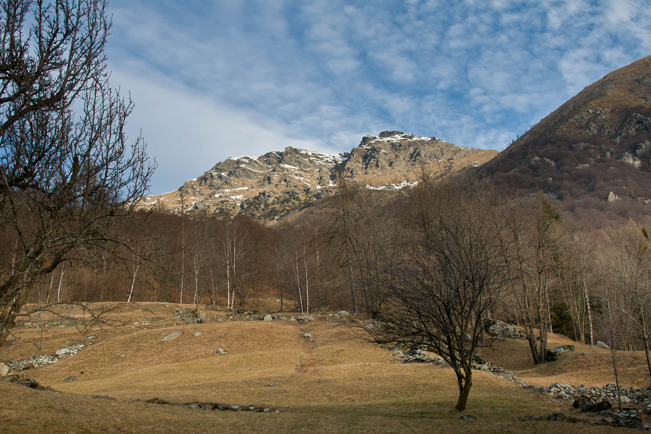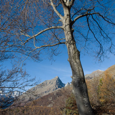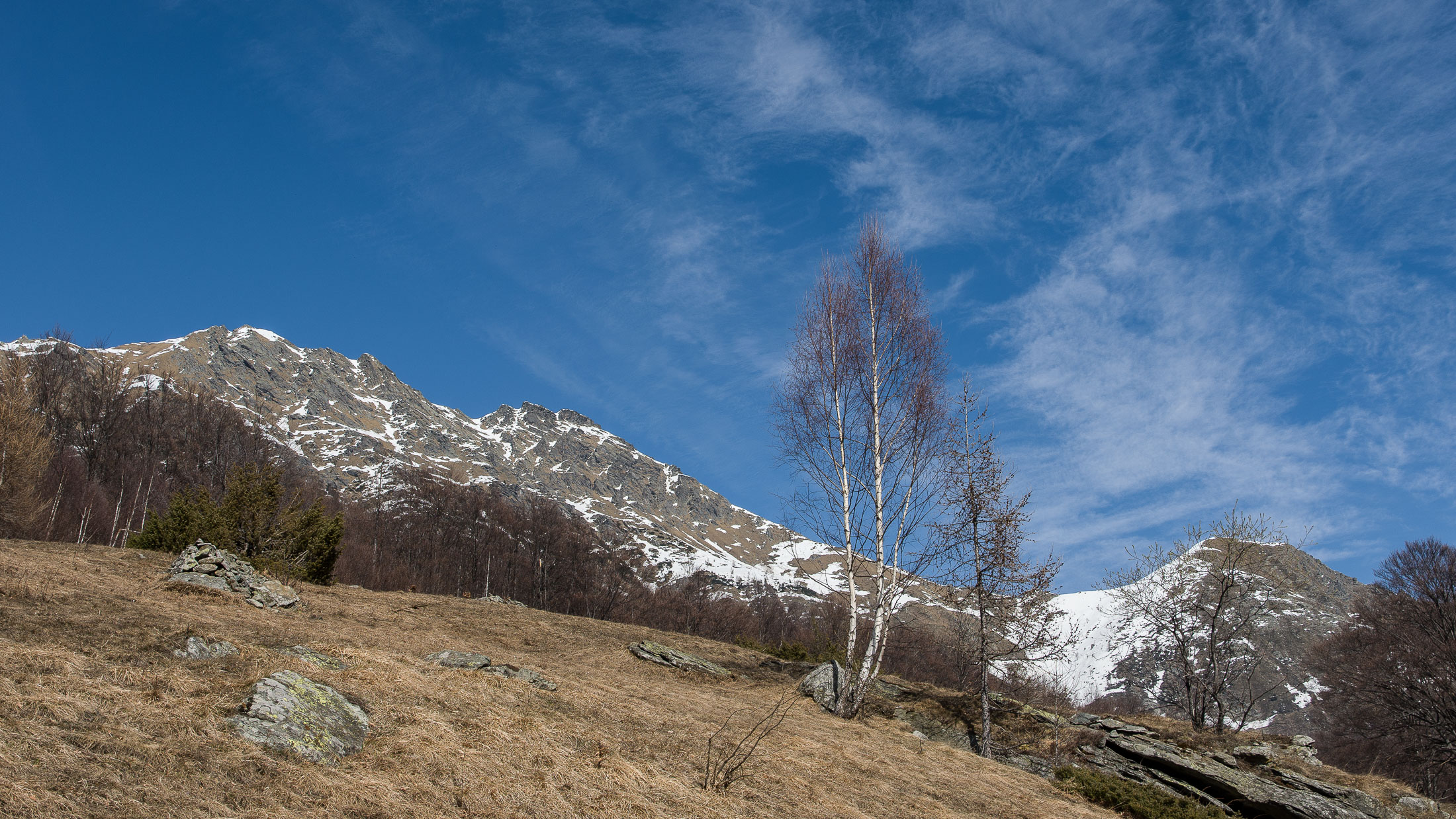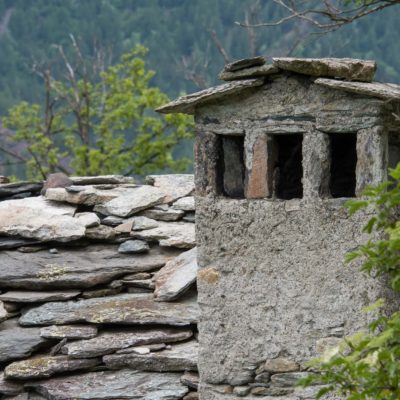 Vom grossen Dorfplatz im Ortskern von Ala di Stura (1075 m) folgt man zunächst etwa 500 m der Strasse talaufwärts bis zu einem restaurierten Bildstock. Dort beginnt ein unmarkierter alter Saumweg, der anfangs über kunstvoll angelegte Treppenstufen durch den Wald in einem Viertelstündchen nach Lombarda (1182 m) führt. Hier scheinen die Uhren stillzustehen, uralte Gemäuer, bröckelnder Putz, meterhohes Unkraut vor den Türen und Fenstern. Die meisten der Bauernhäuser wurden bereits vor Jahrzehnten verlassen, lediglich ein Anwesen ist noch dauerhaft bewohnt. Hinter den oberen Gebäuden mündet der Weg in ein unbefestigten Fahrweg, den man nur wenig später bei einem Wegweiser wieder verlässt. Auf einer wunderschönen alten Mulattiera (= Saumweg oder Maultierweg) geht es entlang von Trockensteinmauern in Kürze hinauf zur grossen Lichtung von Chiottero (1270 m), von den Einheimischen auch Ciautè genannt. Auch hier blickt man auf Ruinen, nur noch das kleine Kirchlein und ein einziges Gebäude werden heute noch instand gehalten. Der Weiterweg führt durch den Wald zum Pian d‘Attia (1382 m), eine ehemalige Temporärsiedlung am Rande einer aussichtsreichen kleine Hochfläche. Einige der Häuser und Ställe wurden bereits vor langer Zeit aufgegeben, andere wiederum sind hübsch renoviert und werden von den Einheimischen noch als Wochenendhäuschen genutzt. Wenige Schritte oberhalb am Waldrand kommt man zu einer unbeschilderten Weggabelung, wo es geradeaus (Richtung Norden) weitergeht, der Abzweig links Richtung Pianfè bleibt unbeachtet. Der Weiterweg führt nun durch dichten Buchenwald einen abschnittsweise steilen Rücken hinauf. Nach einer knappen Stunde liegt der Wald hinter einem und man erreicht die weitläufige Alpe d‘Attia (1740 m). Ein traumhaft schönes Fleckchen, hier kann man stundenlang verweilen und das tolle Panorama auf die Berge des Val d‘Ala geniessen. Die obere der beiden Gebäudegruppen wird auch heute noch in den Sommermonaten von einer sympathischen Familie aus dem Tal bewirtschaftet.