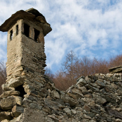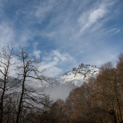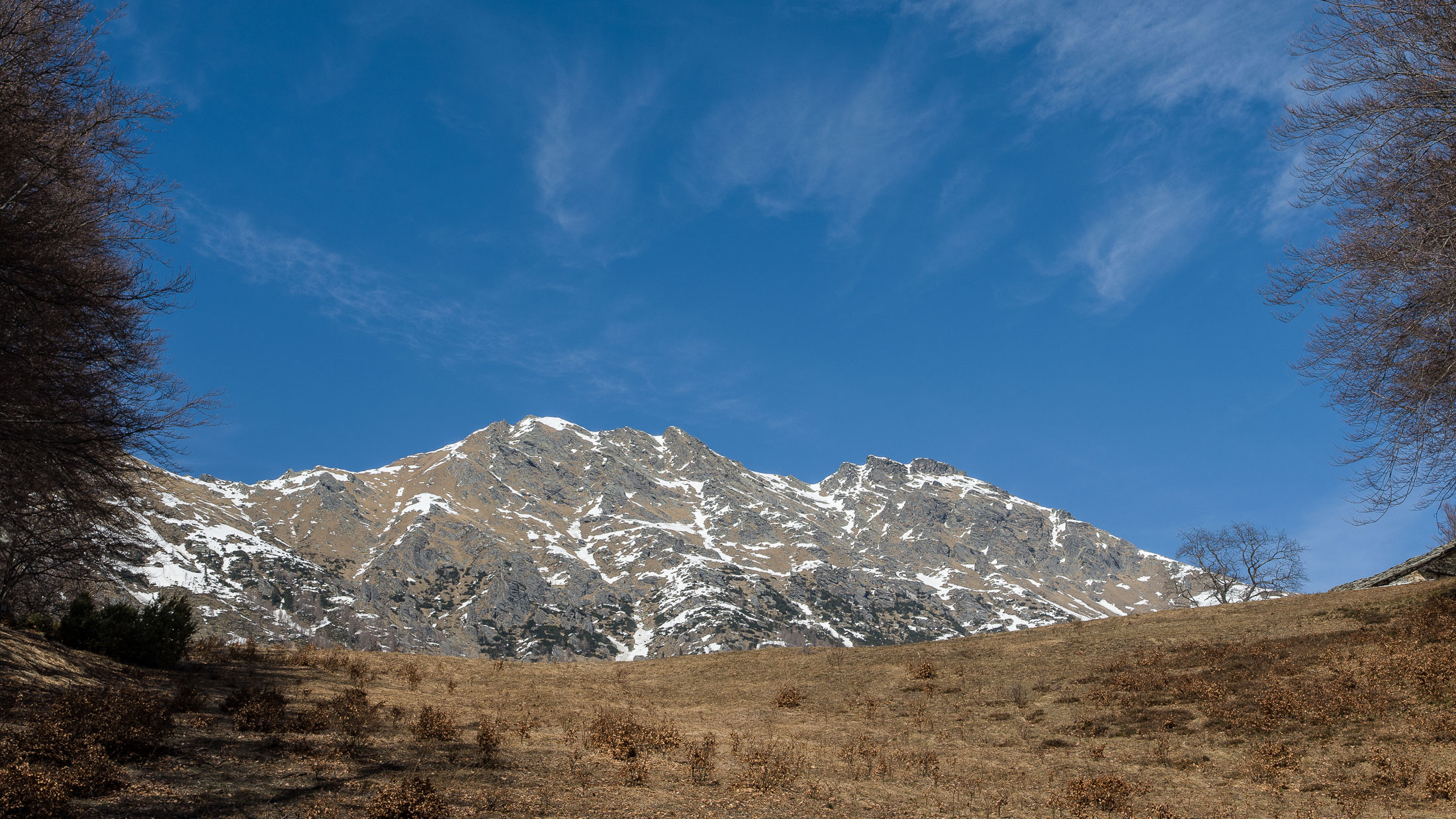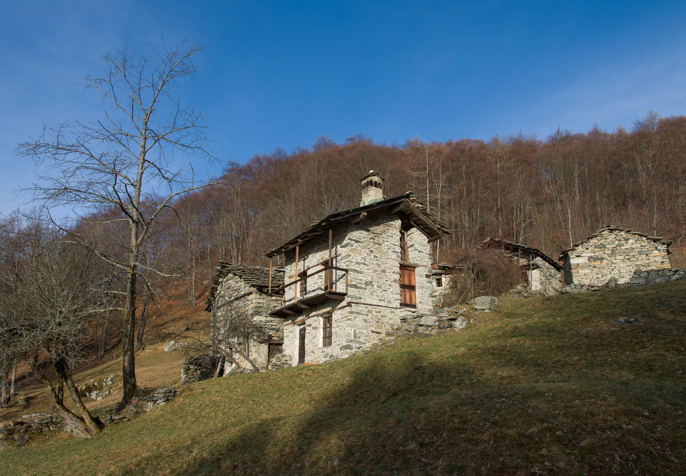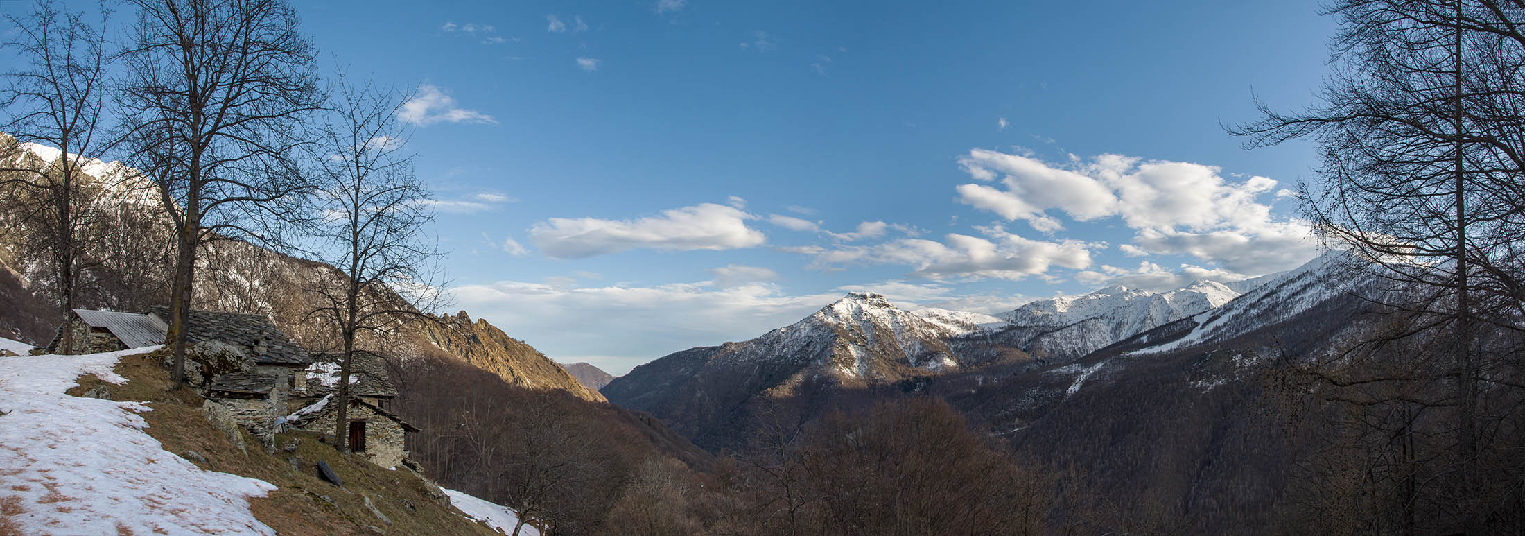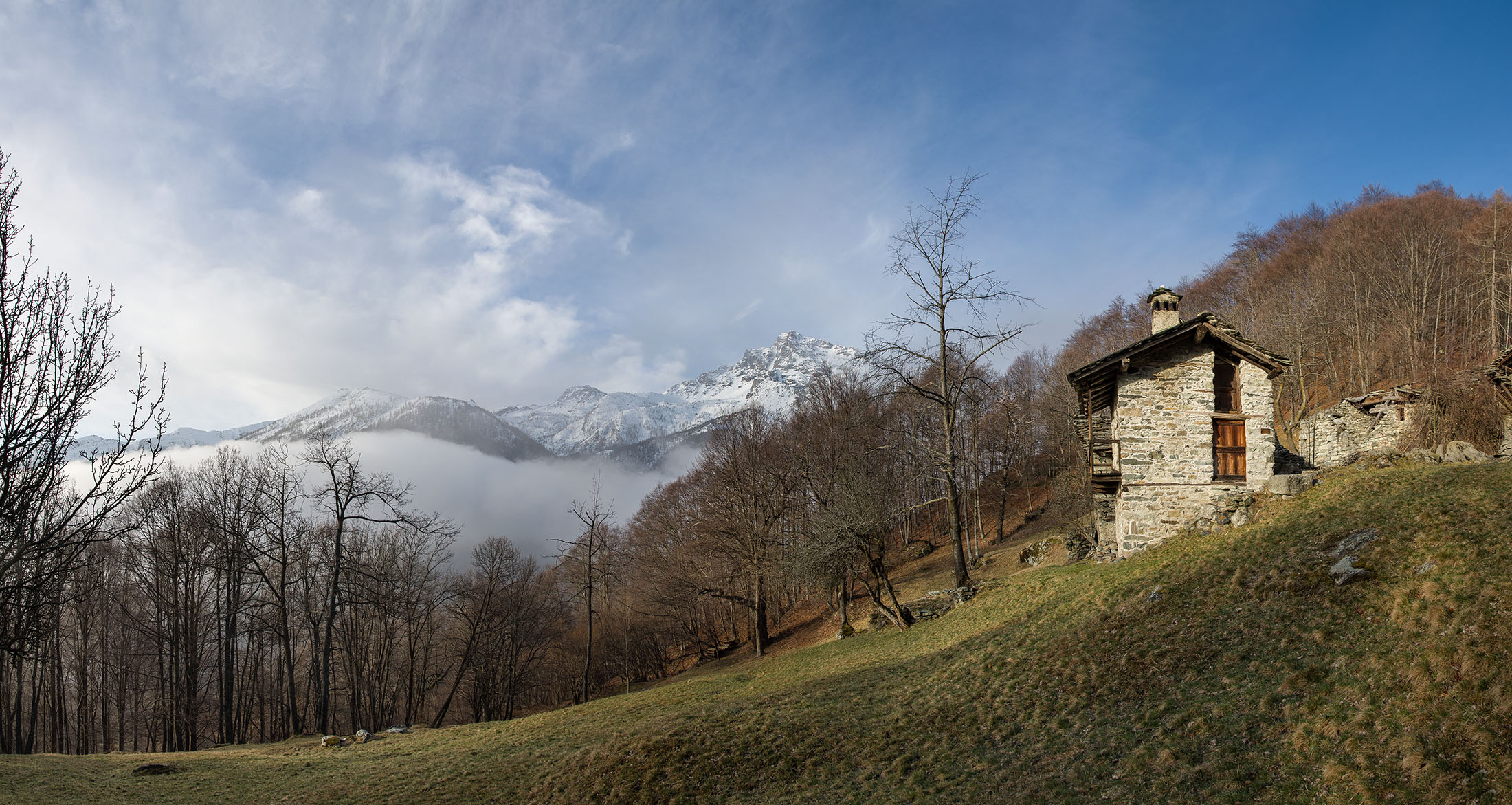 Vom grossen Dorfplatz im Ortskern von Ala di Stura (1075 m) folgt man zunächst etwa 500 m der Strasse talaufwärts bis zu einem restaurierten Bildstock. Dort beginnt ein unmarkierter alter Saumweg, der anfangs über kunstvoll angelegte Treppenstufen durch den Wald in einem Viertelstündchen nach Lombarda (1182 m) führt. Hier scheinen die Uhren stillzustehen, uralte Gemäuer, bröckelnder Putz, meterhohes Unkraut vor den Türen und Fenstern. Die meisten der Bauernhäuser wurden bereits vor Jahrzehnten verlassen, lediglich ein Anwesen ist noch dauerhaft bewohnt. Hinter den oberen Gebäuden mündet der Weg in ein unbefestigten Fahrweg, den man nur wenig später bei einem Wegweiser wieder verlässt. Auf einer wunderschönen alten Mulattiera (= Saumweg oder Maultierweg) geht es entlang von Trockensteinmauern in Kürze hinauf zur grossen Lichtung von Chiottero (1270 m), von den Einheimischen auch Ciautè genannt. Auch hier blickt man auf Ruinen, nur noch das kleine Kirchlein und ein einziges Gebäude werden heute noch instand gehalten. Der Weiterweg führt durch den Wald zum Pian d‘Attia (1382 m), eine ehemalige Temporärsiedlung am Rande einer aussichtsreichen kleine Hochfläche. Einige der Häuser und Ställe wurden bereits vor langer Zeit aufgegeben, andere wiederum sind hübsch renoviert und werden von den Einheimischen noch als Wochenendhäuschen genutzt. Wenige Schritte oberhalb am Waldrand kommt man zu einer unbeschilderten Weggabelung, wo es geradeaus (Richtung Norden) weitergeht, der Abzweig links Richtung Pianfè bleibt unbeachtet. Der Weiterweg führt nun durch dichten Buchenwald einen abschnittsweise steilen Rücken hinauf. Nach einer knappen Stunde liegt der Wald hinter einem und man erreicht die weitläufige Alpe d‘Attia (1740 m). Ein traumhaft schönes Fleckchen, hier kann man stundenlang verweilen und das tolle Panorama auf die Berge des Val d‘Ala geniessen. Die obere der beiden Gebäudegruppen wird auch heute noch in den Sommermonaten von einer sympathischen Familie aus dem Tal bewirtschaftet.