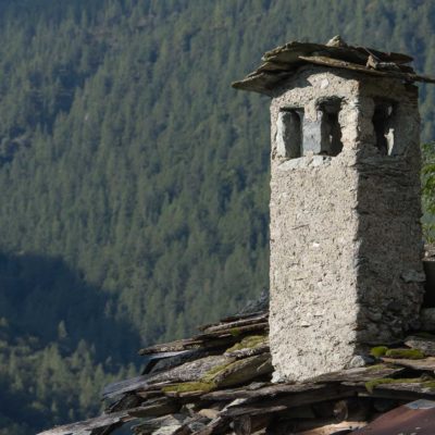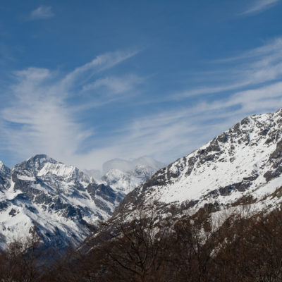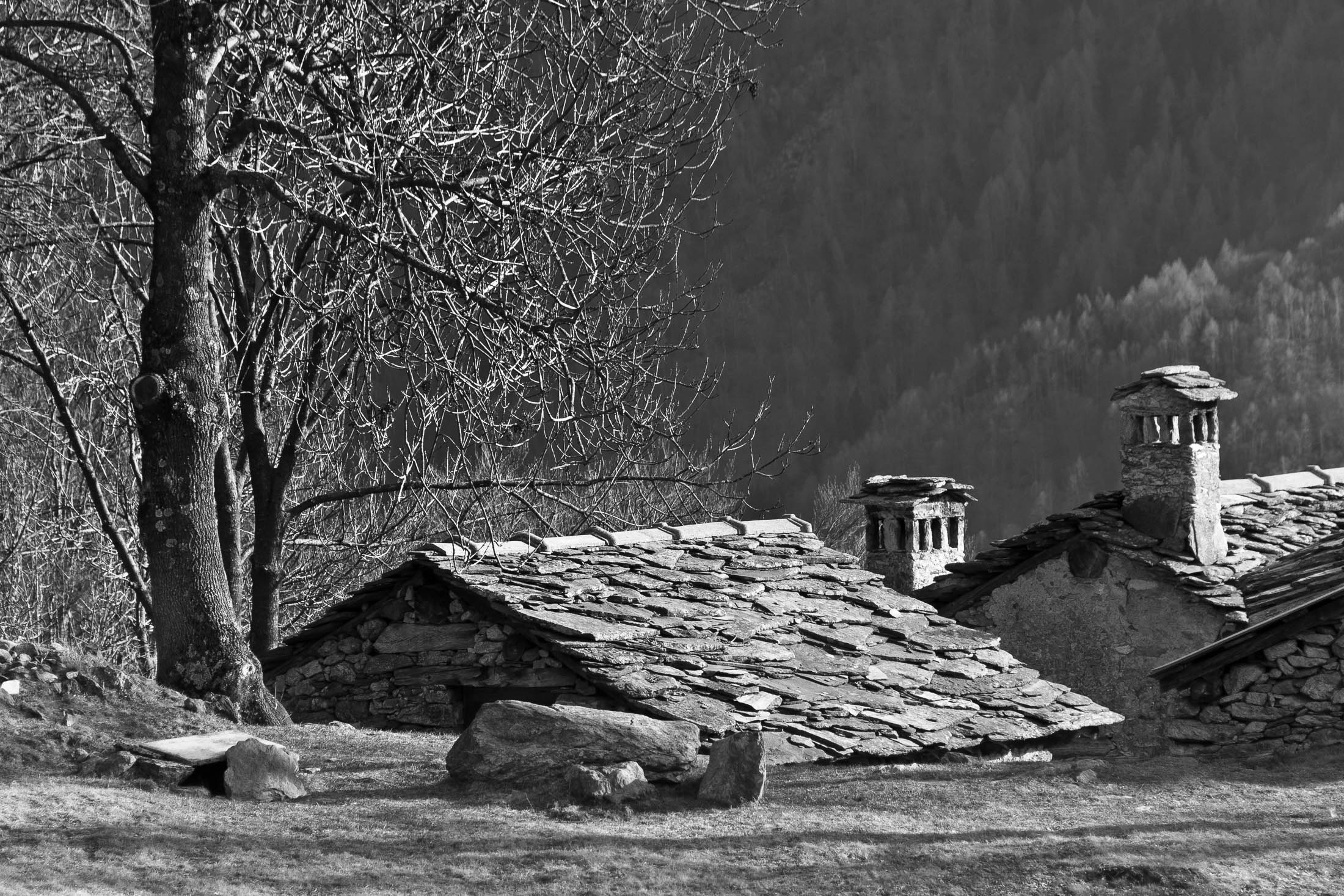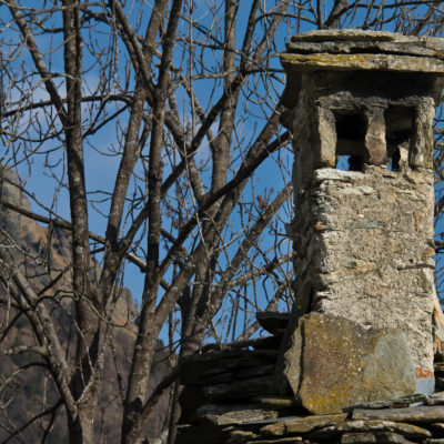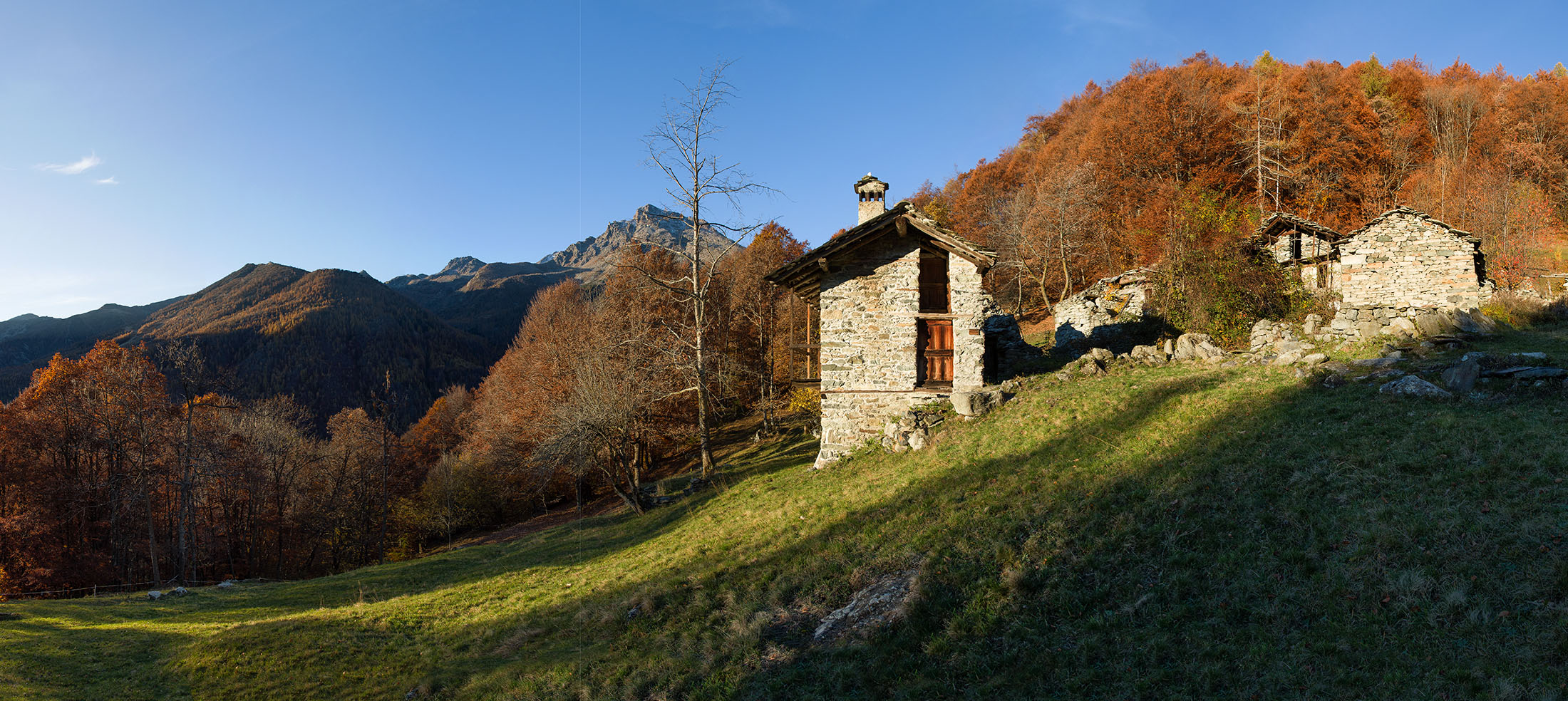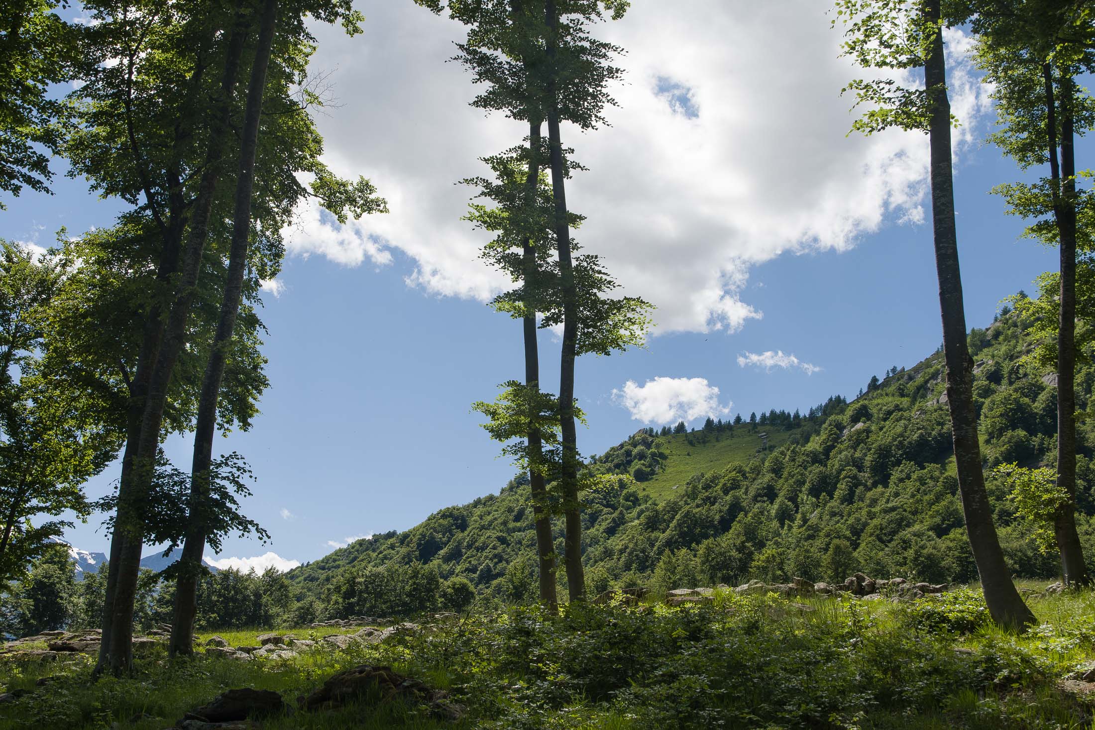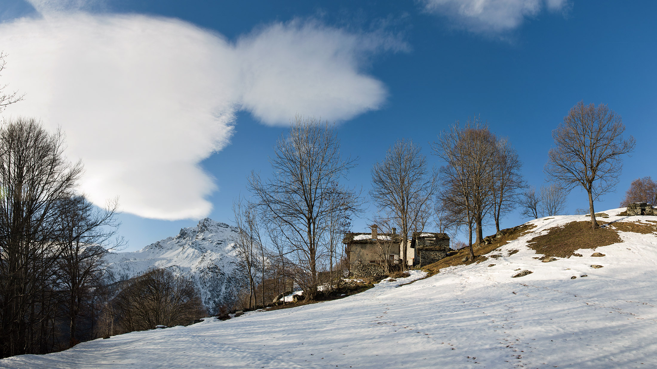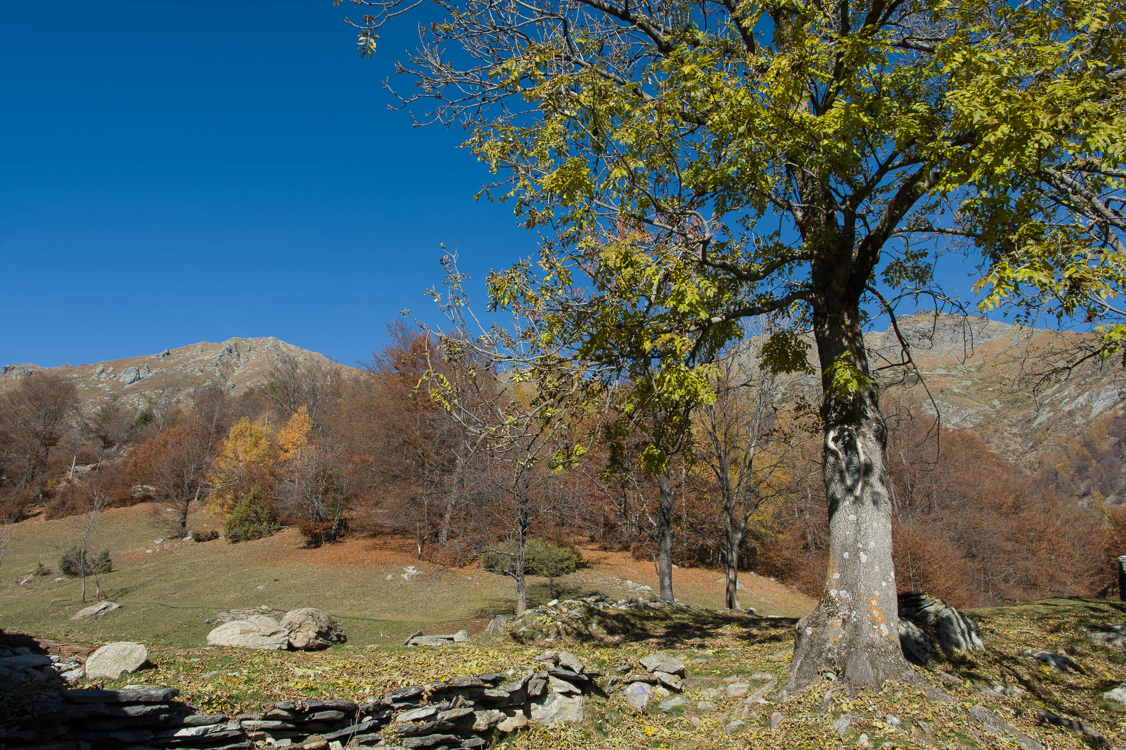 Vom grossen Dorfplatz im Ortskern von Ala di Stura (1075 m) folgt man zunächst etwa 500 m der Strasse talaufwärts bis zu einem restaurierten Bildstock. Dort beginnt ein unmarkierter alter Saumweg, der anfangs über kunstvoll angelegte Treppenstufen durch den Wald in einem Viertelstündchen nach Lombarda (1182 m) führt. Hier scheinen die Uhren stillzustehen, uralte Gemäuer, bröckelnder Putz, meterhohes Unkraut vor den Türen und Fenstern. Die meisten der Bauernhäuser wurden bereits vor Jahrzehnten verlassen, lediglich ein Anwesen ist noch dauerhaft bewohnt. Hinter den oberen Gebäuden mündet der Weg in ein unbefestigten Fahrweg, den man nur wenig später bei einem Wegweiser wieder verlässt. Auf einer wunderschönen alten Mulattiera (= Saumweg oder Maultierweg) geht es entlang von Trockensteinmauern in Kürze hinauf zur grossen Lichtung von Chiottero (1270 m), von den Einheimischen auch Ciautè genannt. Auch hier blickt man auf Ruinen, nur noch das kleine Kirchlein und ein einziges Gebäude werden heute noch instand gehalten. Der Weiterweg führt durch den Wald zum Pian d‘Attia (1382 m), eine ehemalige Temporärsiedlung am Rande einer aussichtsreichen kleine Hochfläche. Einige der Häuser und Ställe wurden bereits vor langer Zeit aufgegeben, andere wiederum sind hübsch renoviert und werden von den Einheimischen noch als Wochenendhäuschen genutzt. Wenige Schritte oberhalb am Waldrand kommt man zu einer unbeschilderten Weggabelung, wo es geradeaus (Richtung Norden) weitergeht, der Abzweig links Richtung Pianfè bleibt unbeachtet. Der Weiterweg führt nun durch dichten Buchenwald einen abschnittsweise steilen Rücken hinauf. Nach einer knappen Stunde liegt der Wald hinter einem und man erreicht die weitläufige Alpe d‘Attia (1740 m). Ein traumhaft schönes Fleckchen, hier kann man stundenlang verweilen und das tolle Panorama auf die Berge des Val d‘Ala geniessen. Die obere der beiden Gebäudegruppen wird auch heute noch in den Sommermonaten von einer sympathischen Familie aus dem Tal bewirtschaftet.