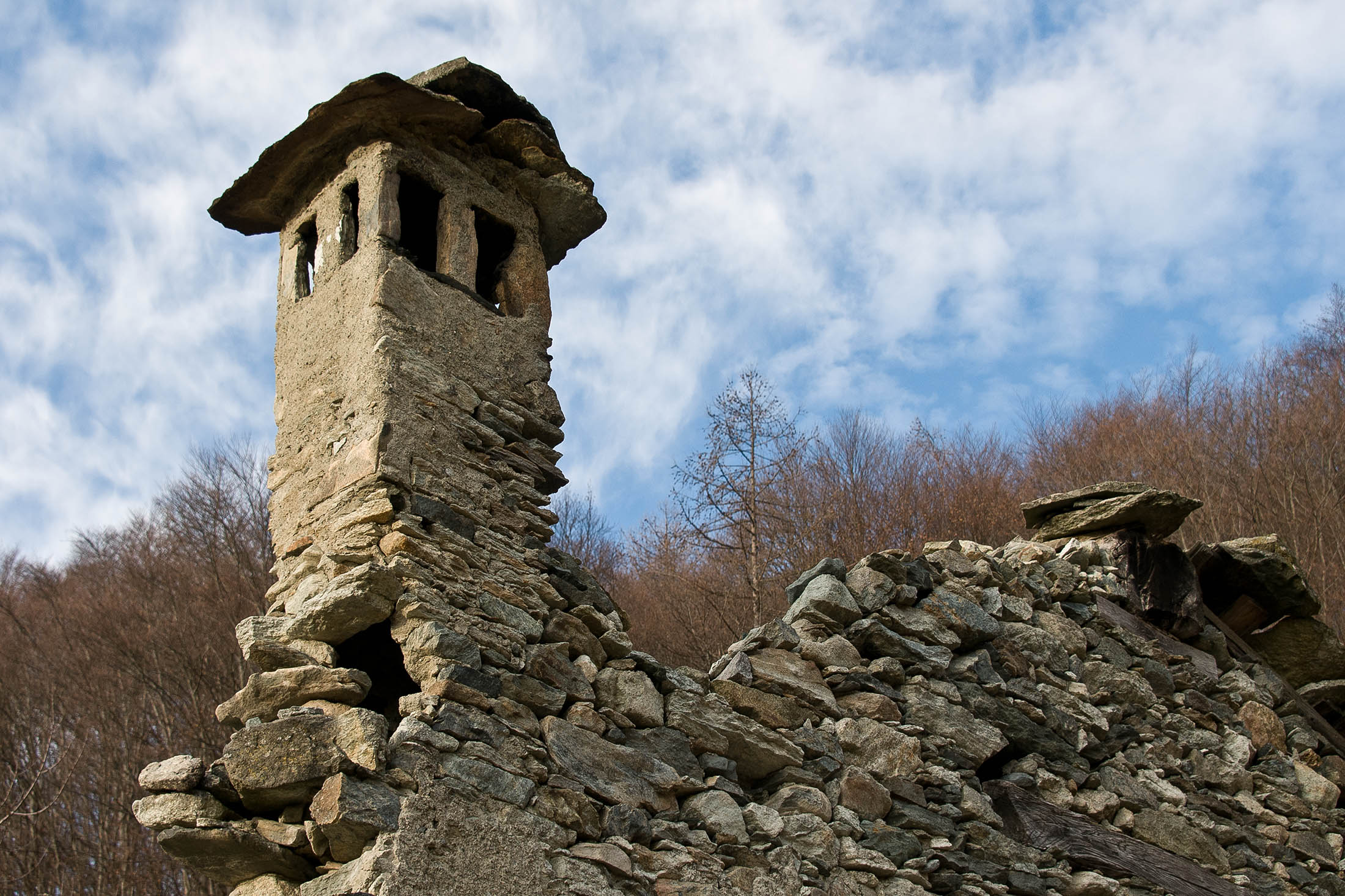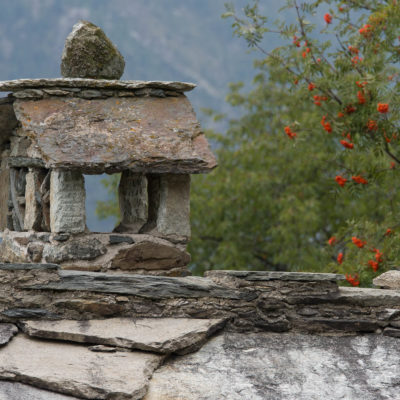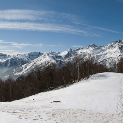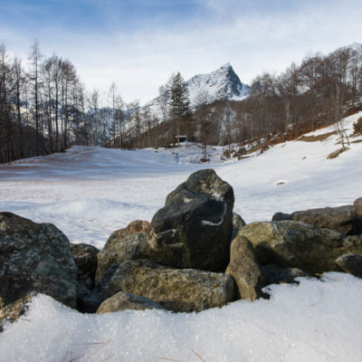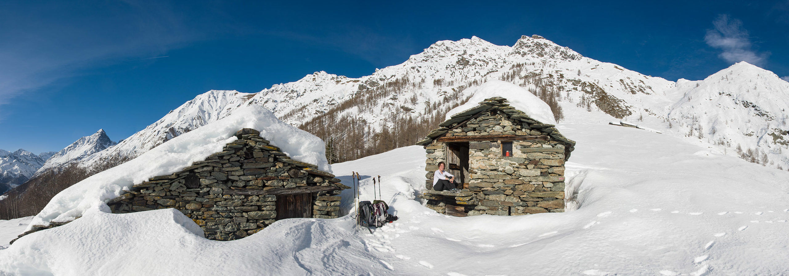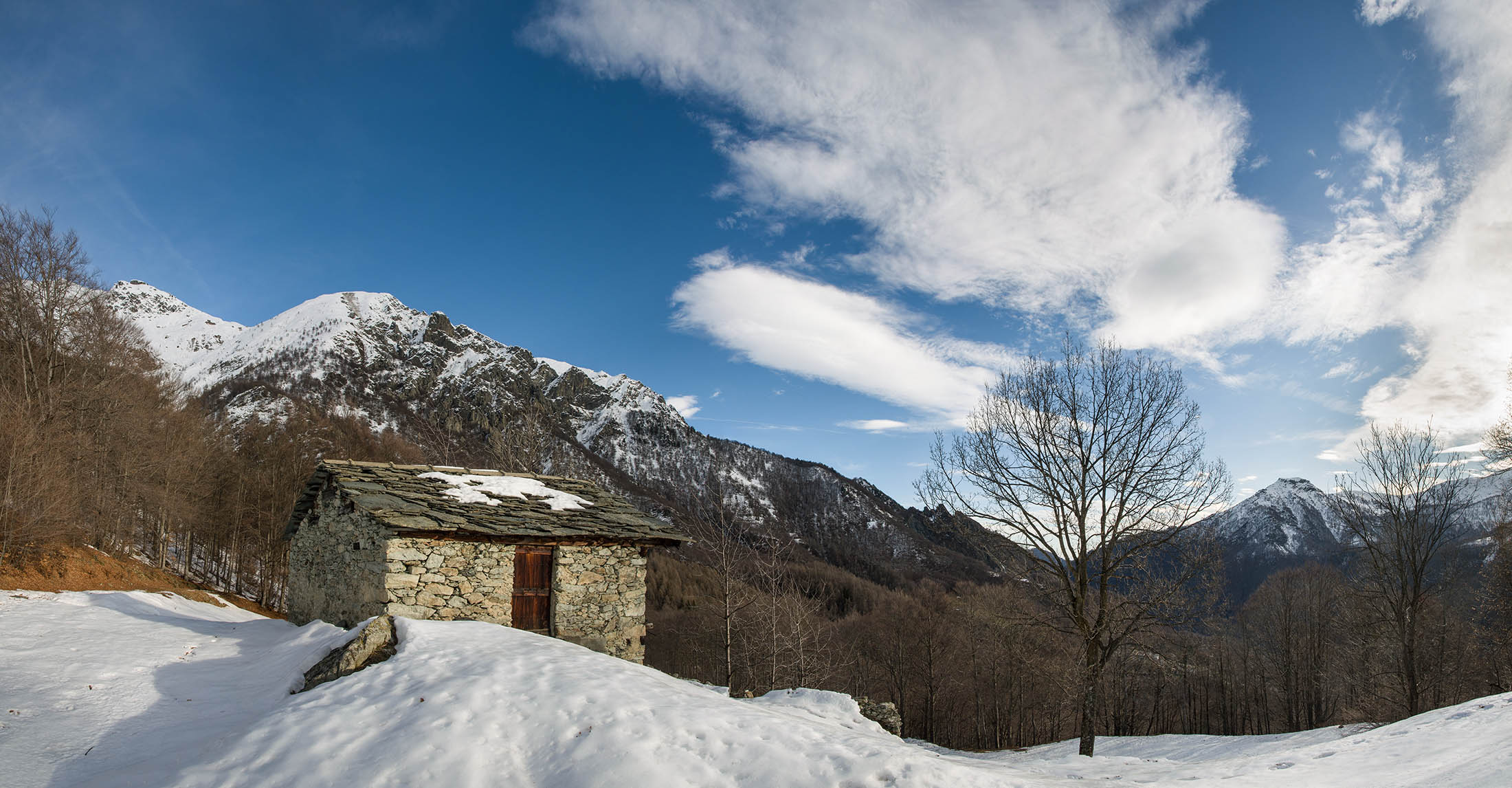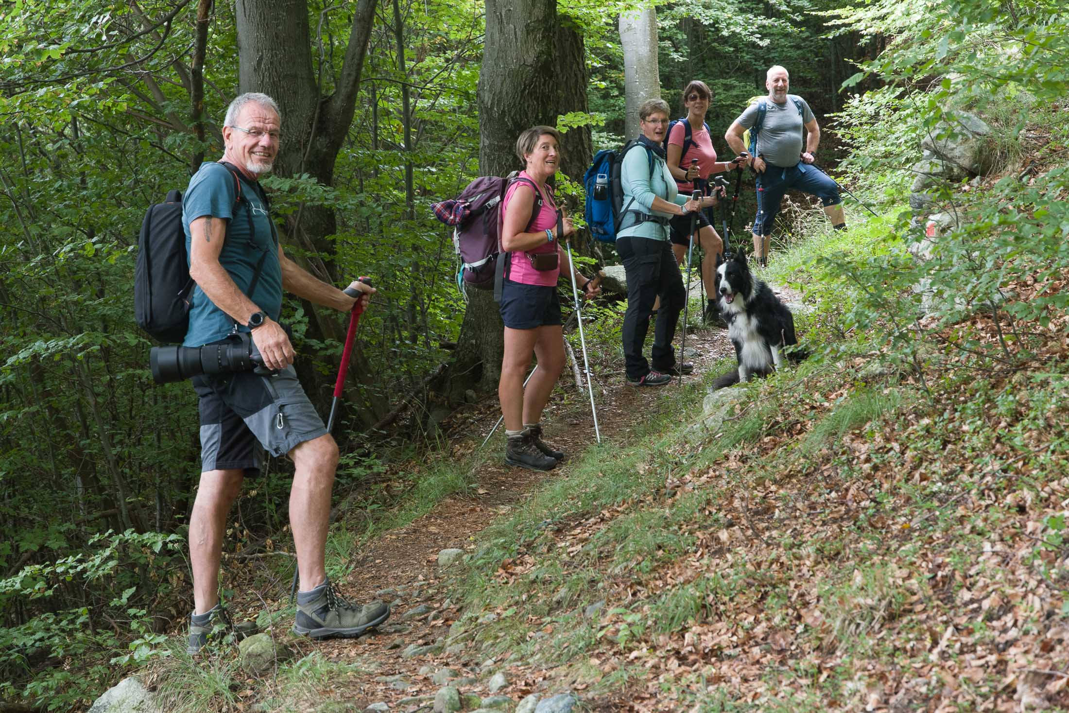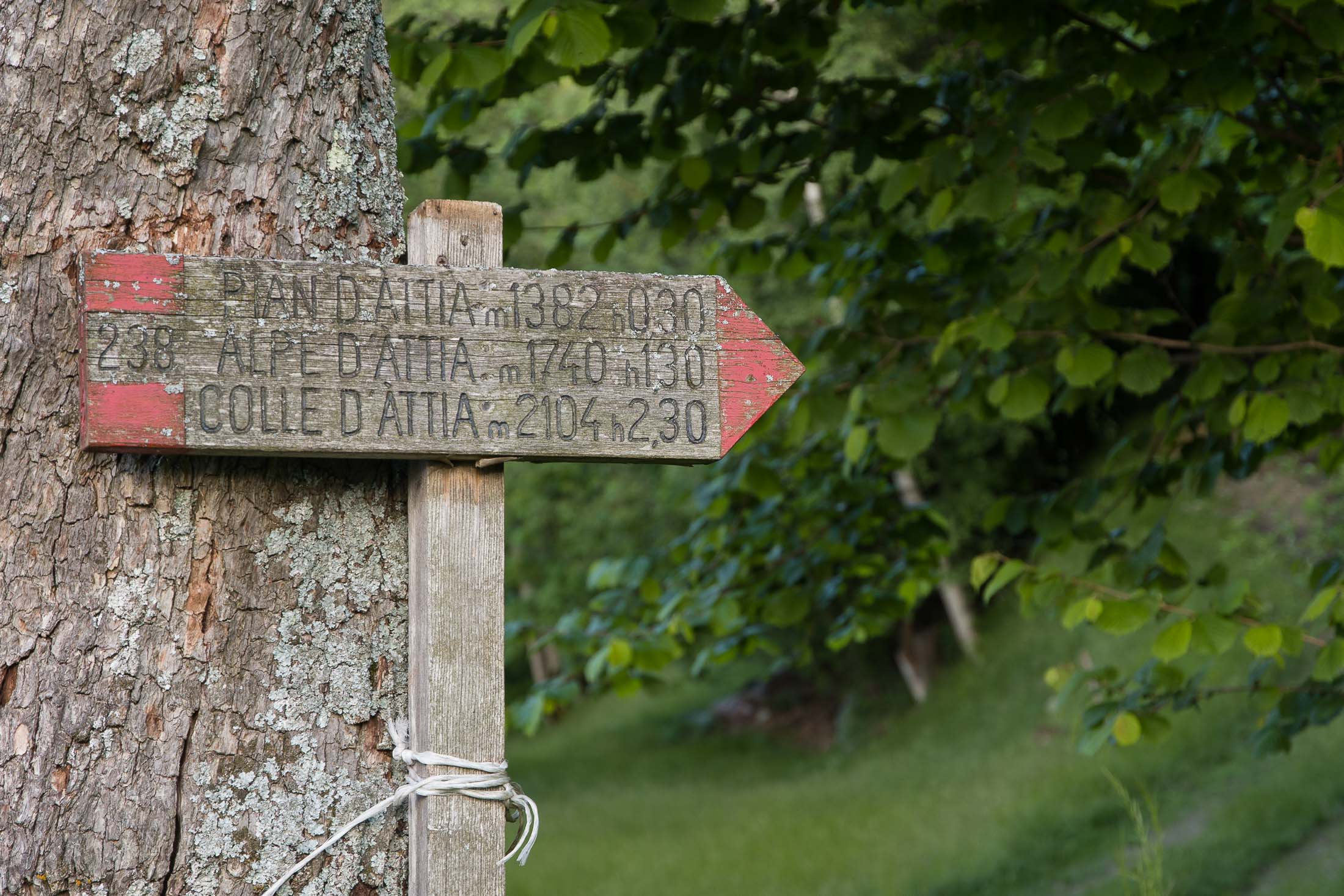 Vom grossen Dorfplatz im Ortskern von Ala di Stura (1075 m) folgt man zunächst etwa 500 m der Strasse talaufwärts bis zu einem restaurierten Bildstock. Dort beginnt ein unmarkierter alter Saumweg, der anfangs über kunstvoll angelegte Treppenstufen durch den Wald in einem Viertelstündchen nach Lombarda (1182 m) führt. Hier scheinen die Uhren stillzustehen, uralte Gemäuer, bröckelnder Putz, meterhohes Unkraut vor den Türen und Fenstern. Die meisten der Bauernhäuser wurden bereits vor Jahrzehnten verlassen, lediglich ein Anwesen ist noch dauerhaft bewohnt. Hinter den oberen Gebäuden mündet der Weg in ein unbefestigten Fahrweg, den man nur wenig später bei einem Wegweiser wieder verlässt. Auf einer wunderschönen alten Mulattiera (= Saumweg oder Maultierweg) geht es entlang von Trockensteinmauern in Kürze hinauf zur grossen Lichtung von Chiottero (1270 m), von den Einheimischen auch Ciautè genannt. Auch hier blickt man auf Ruinen, nur noch das kleine Kirchlein und ein einziges Gebäude werden heute noch instand gehalten. Der Weiterweg führt durch den Wald zum Pian d‘Attia (1382 m), eine ehemalige Temporärsiedlung am Rande einer aussichtsreichen kleine Hochfläche. Einige der Häuser und Ställe wurden bereits vor langer Zeit aufgegeben, andere wiederum sind hübsch renoviert und werden von den Einheimischen noch als Wochenendhäuschen genutzt. Wenige Schritte oberhalb am Waldrand kommt man zu einer unbeschilderten Weggabelung, wo es geradeaus (Richtung Norden) weitergeht, der Abzweig links Richtung Pianfè bleibt unbeachtet. Der Weiterweg führt nun durch dichten Buchenwald einen abschnittsweise steilen Rücken hinauf. Nach einer knappen Stunde liegt der Wald hinter einem und man erreicht die weitläufige Alpe d‘Attia (1740 m). Ein traumhaft schönes Fleckchen, hier kann man stundenlang verweilen und das tolle Panorama auf die Berge des Val d‘Ala geniessen. Die obere der beiden Gebäudegruppen wird auch heute noch in den Sommermonaten von einer sympathischen Familie aus dem Tal bewirtschaftet.