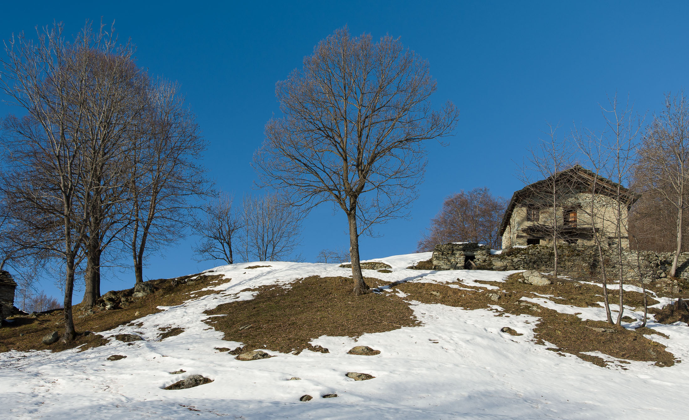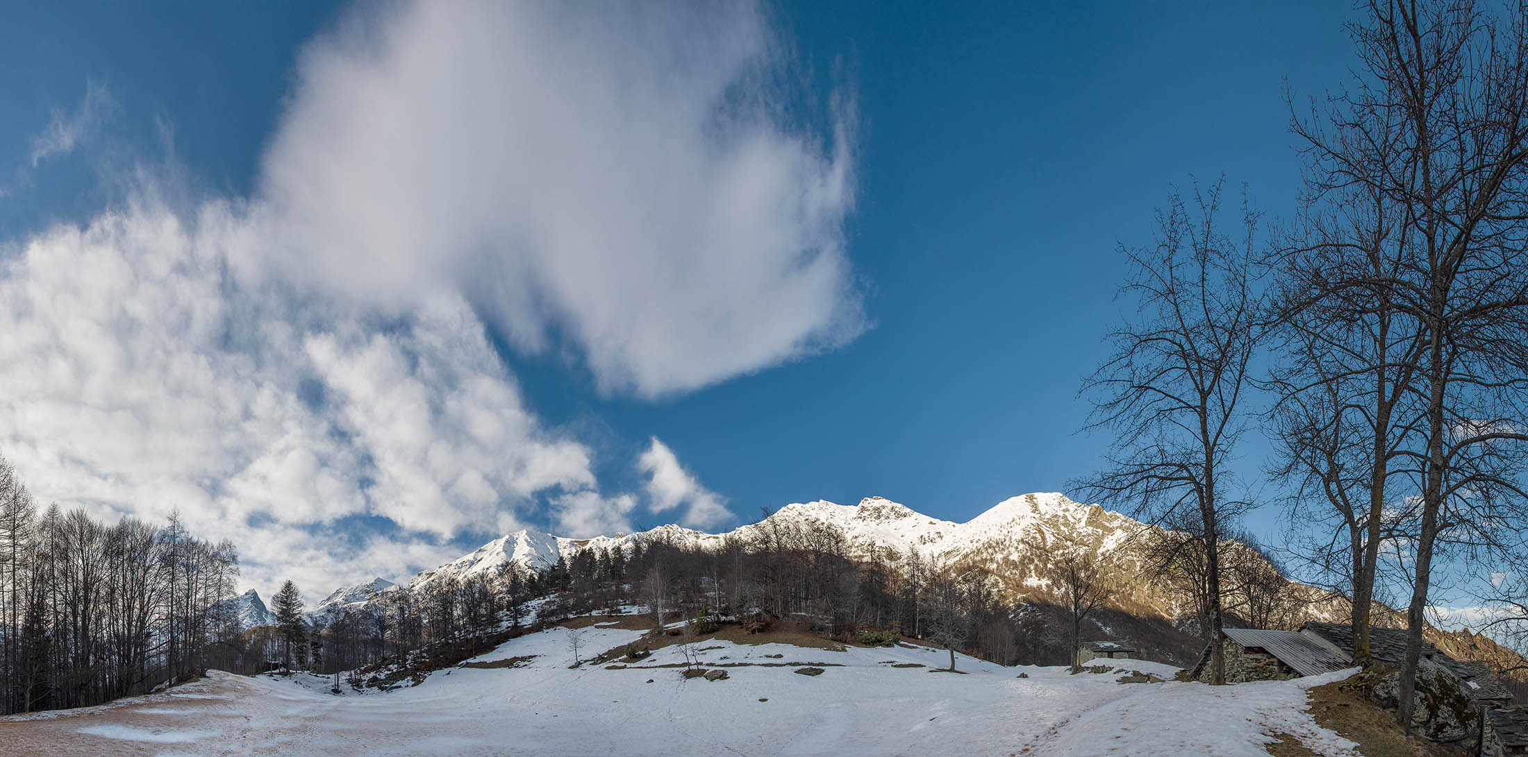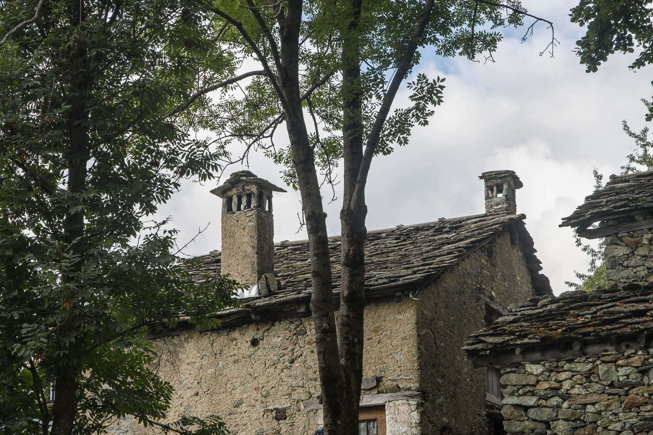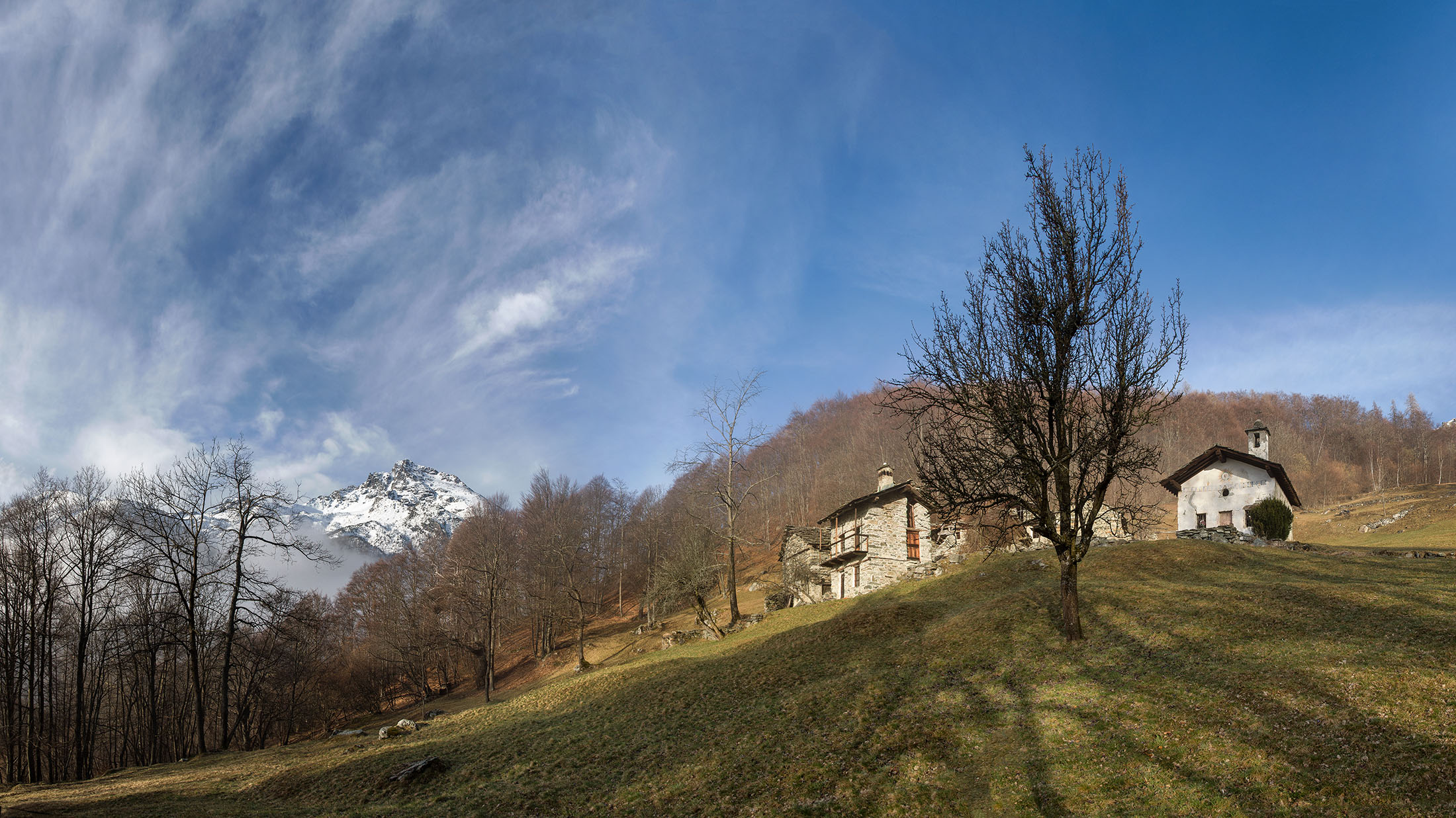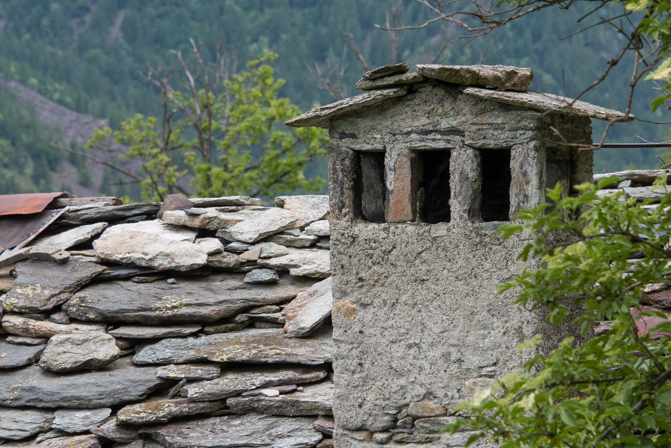 Vom grossen Dorfplatz im Ortskern von Ala di Stura (1075 m) folgt man zunächst etwa 500 m der Strasse talaufwärts bis zu einem restaurierten Bildstock. Dort beginnt ein unmarkierter alter Saumweg, der anfangs über kunstvoll angelegte Treppenstufen durch den Wald in einem Viertelstündchen nach Lombarda (1182 m) führt. Hier scheinen die Uhren stillzustehen, uralte Gemäuer, bröckelnder Putz, meterhohes Unkraut vor den Türen und Fenstern. Die meisten der Bauernhäuser wurden bereits vor Jahrzehnten verlassen, lediglich ein Anwesen ist noch dauerhaft bewohnt. Hinter den oberen Gebäuden mündet der Weg in ein unbefestigten Fahrweg, den man nur wenig später bei einem Wegweiser wieder verlässt. Auf einer wunderschönen alten Mulattiera (= Saumweg oder Maultierweg) geht es entlang von Trockensteinmauern in Kürze hinauf zur grossen Lichtung von Chiottero (1270 m), von den Einheimischen auch Ciautè genannt. Auch hier blickt man auf Ruinen, nur noch das kleine Kirchlein und ein einziges Gebäude werden heute noch instand gehalten. Der Weiterweg führt durch den Wald zum Pian d‘Attia (1382 m), eine ehemalige Temporärsiedlung am Rande einer aussichtsreichen kleine Hochfläche. Einige der Häuser und Ställe wurden bereits vor langer Zeit aufgegeben, andere wiederum sind hübsch renoviert und werden von den Einheimischen noch als Wochenendhäuschen genutzt. Wenige Schritte oberhalb am Waldrand kommt man zu einer unbeschilderten Weggabelung, wo es geradeaus (Richtung Norden) weitergeht, der Abzweig links Richtung Pianfè bleibt unbeachtet. Der Weiterweg führt nun durch dichten Buchenwald einen abschnittsweise steilen Rücken hinauf. Nach einer knappen Stunde liegt der Wald hinter einem und man erreicht die weitläufige Alpe d‘Attia (1740 m). Ein traumhaft schönes Fleckchen, hier kann man stundenlang verweilen und das tolle Panorama auf die Berge des Val d‘Ala geniessen. Die obere der beiden Gebäudegruppen wird auch heute noch in den Sommermonaten von einer sympathischen Familie aus dem Tal bewirtschaftet.
