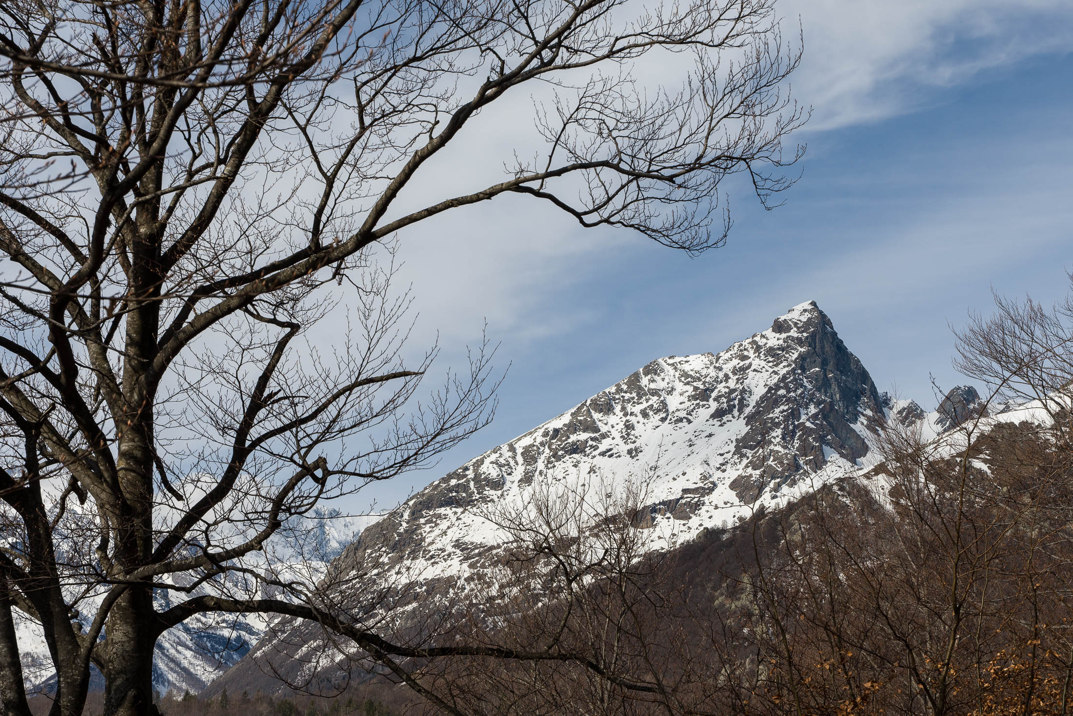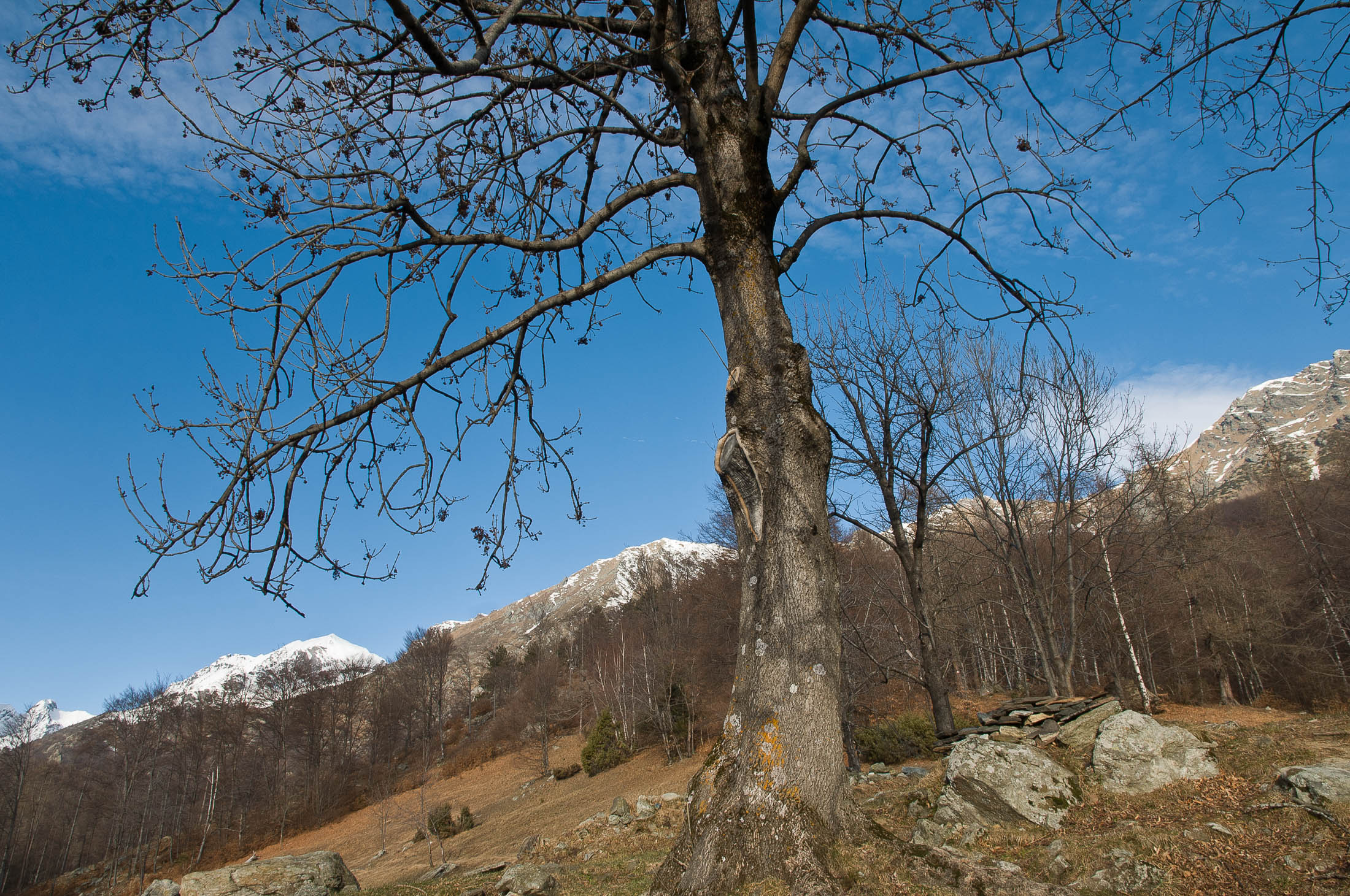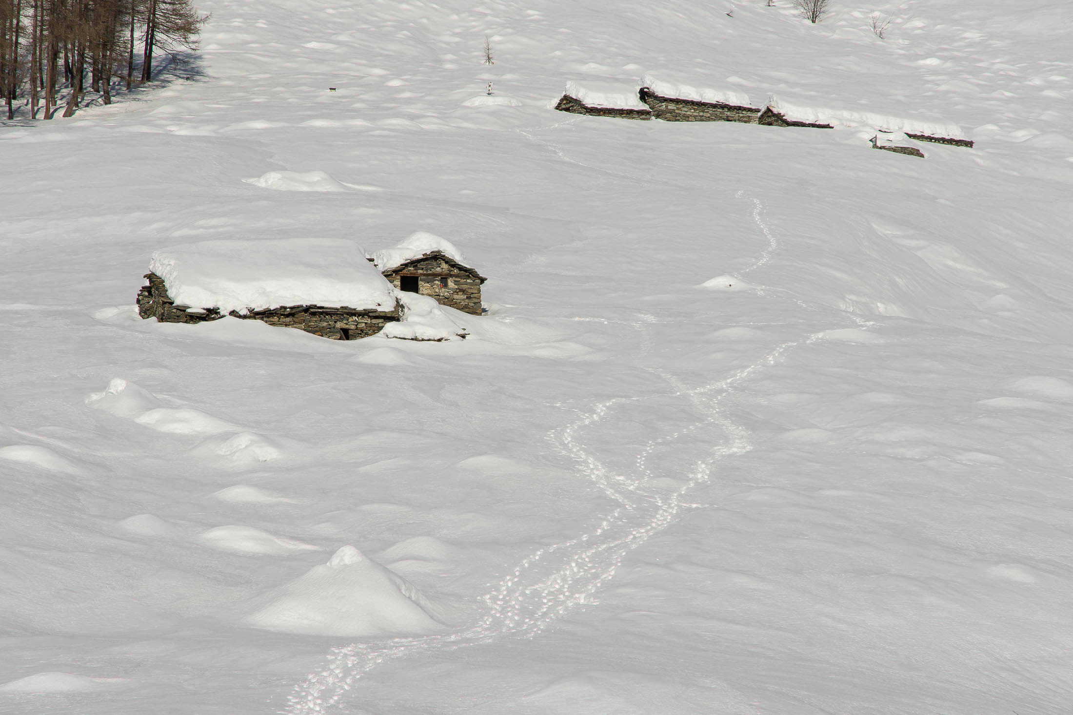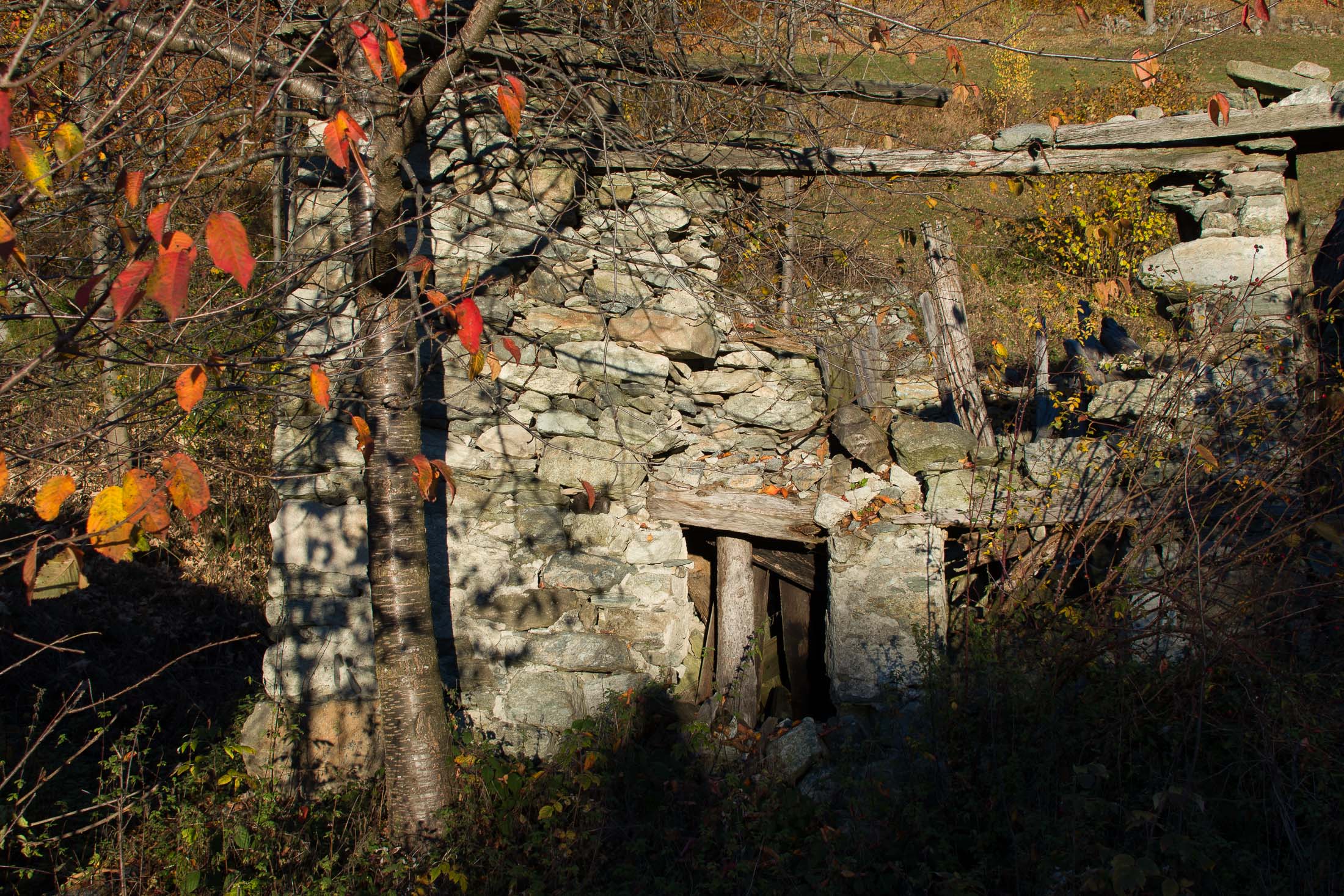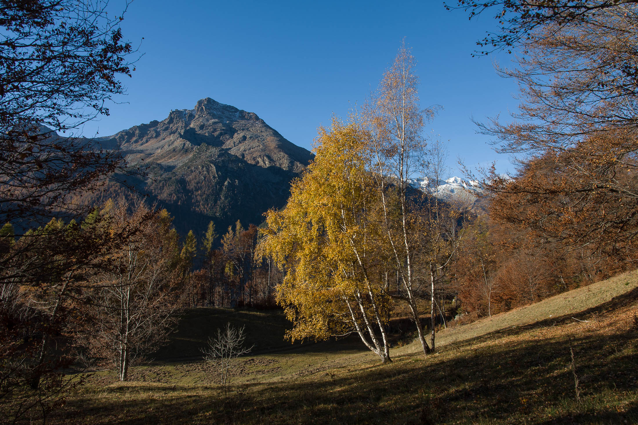 Vom grossen Dorfplatz im Ortskern von Ala di Stura (1075 m) folgt man zunächst etwa 500 m der Strasse talaufwärts bis zu einem restaurierten Bildstock. Dort beginnt ein unmarkierter alter Saumweg, der anfangs über kunstvoll angelegte Treppenstufen durch den Wald in einem Viertelstündchen nach Lombarda (1182 m) führt. Hier scheinen die Uhren stillzustehen, uralte Gemäuer, bröckelnder Putz, meterhohes Unkraut vor den Türen und Fenstern. Die meisten der Bauernhäuser wurden bereits vor Jahrzehnten verlassen, lediglich ein Anwesen ist noch dauerhaft bewohnt. Hinter den oberen Gebäuden mündet der Weg in ein unbefestigten Fahrweg, den man nur wenig später bei einem Wegweiser wieder verlässt. Auf einer wunderschönen alten Mulattiera (= Saumweg oder Maultierweg) geht es entlang von Trockensteinmauern in Kürze hinauf zur grossen Lichtung von Chiottero (1270 m), von den Einheimischen auch Ciautè genannt. Auch hier blickt man auf Ruinen, nur noch das kleine Kirchlein und ein einziges Gebäude werden heute noch instand gehalten. Der Weiterweg führt durch den Wald zum Pian d‘Attia (1382 m), eine ehemalige Temporärsiedlung am Rande einer aussichtsreichen kleine Hochfläche. Einige der Häuser und Ställe wurden bereits vor langer Zeit aufgegeben, andere wiederum sind hübsch renoviert und werden von den Einheimischen noch als Wochenendhäuschen genutzt. Wenige Schritte oberhalb am Waldrand kommt man zu einer unbeschilderten Weggabelung, wo es geradeaus (Richtung Norden) weitergeht, der Abzweig links Richtung Pianfè bleibt unbeachtet. Der Weiterweg führt nun durch dichten Buchenwald einen abschnittsweise steilen Rücken hinauf. Nach einer knappen Stunde liegt der Wald hinter einem und man erreicht die weitläufige Alpe d‘Attia (1740 m). Ein traumhaft schönes Fleckchen, hier kann man stundenlang verweilen und das tolle Panorama auf die Berge des Val d‘Ala geniessen. Die obere der beiden Gebäudegruppen wird auch heute noch in den Sommermonaten von einer sympathischen Familie aus dem Tal bewirtschaftet.