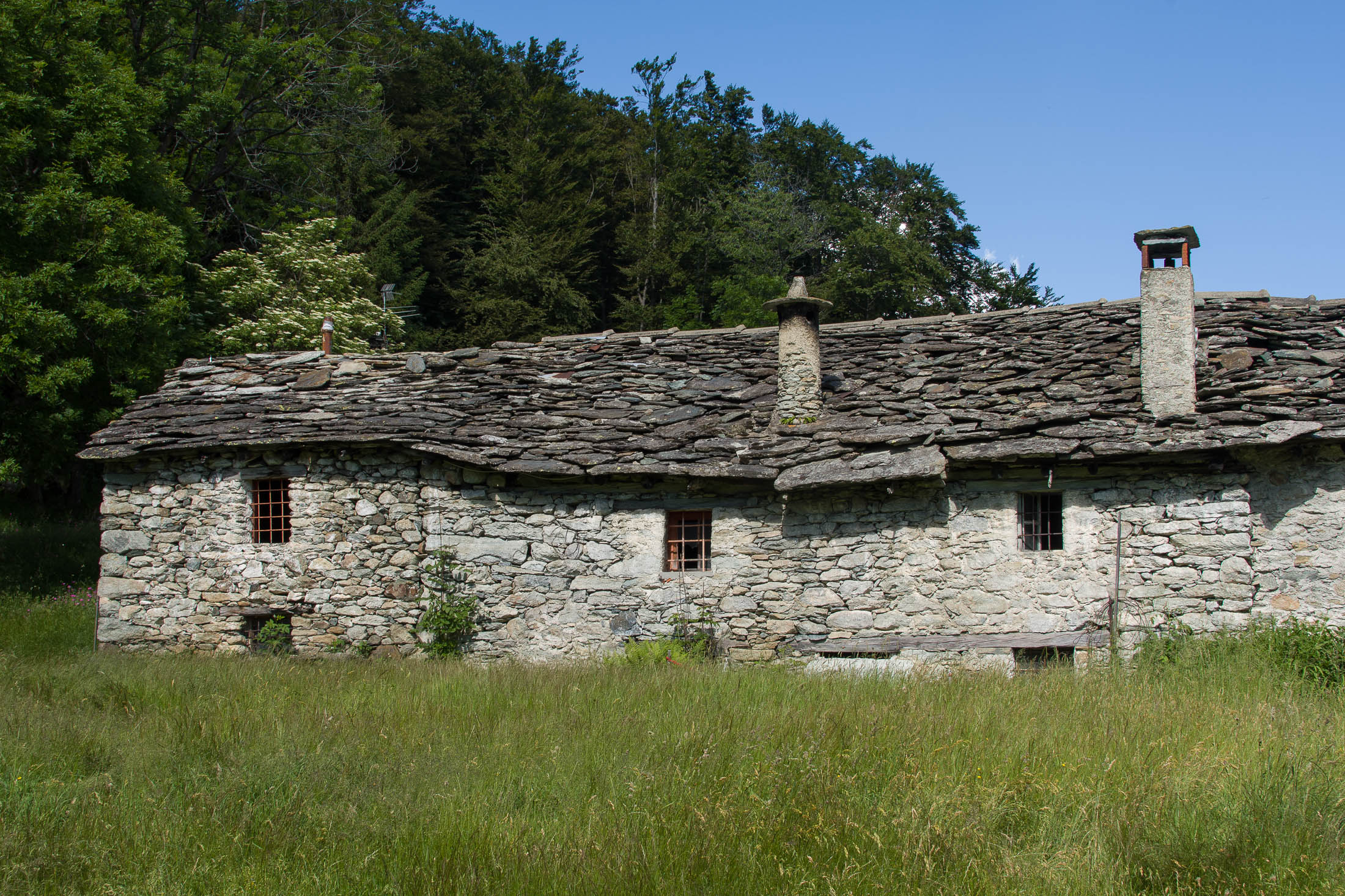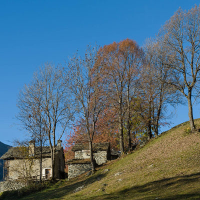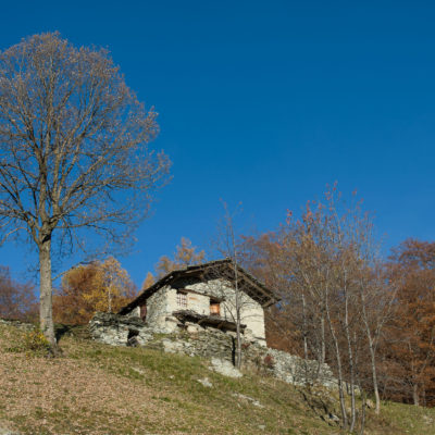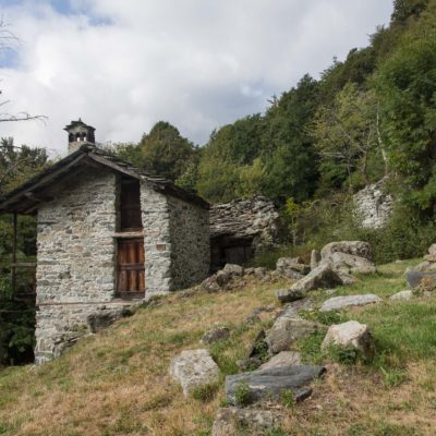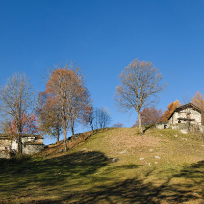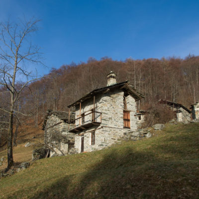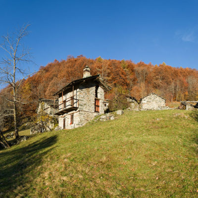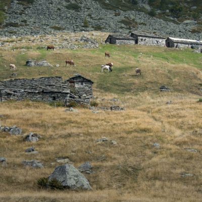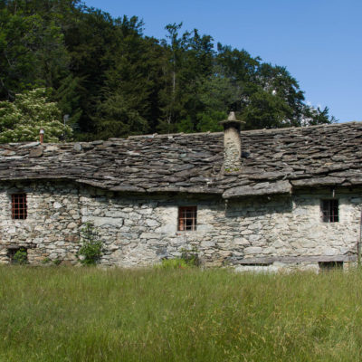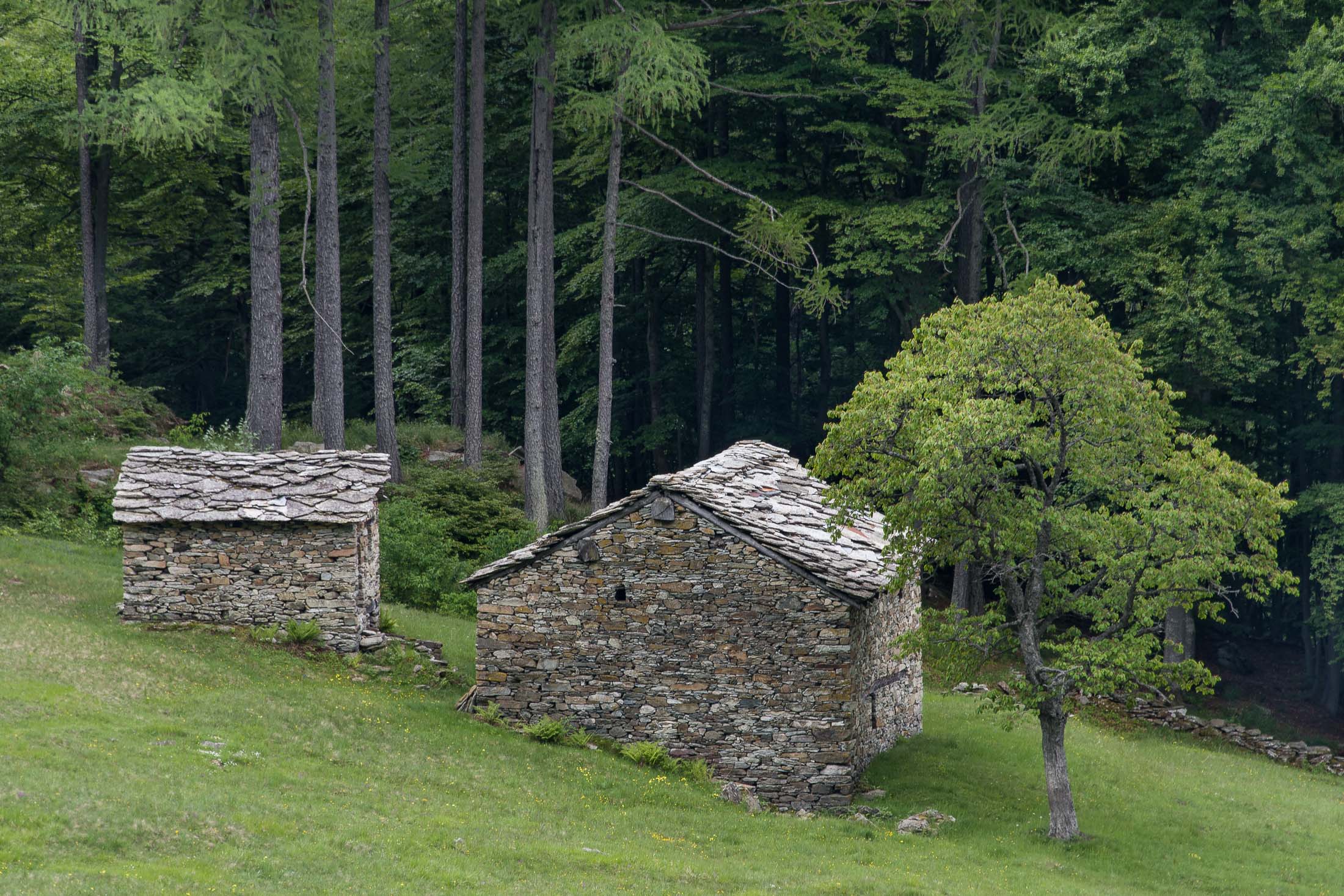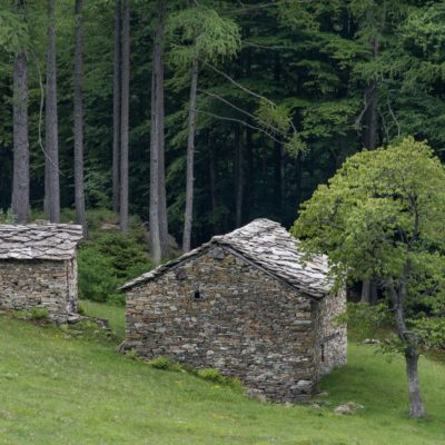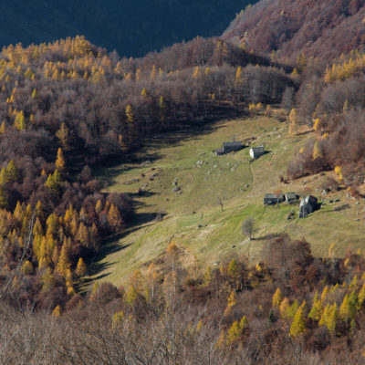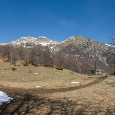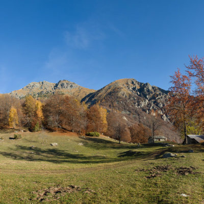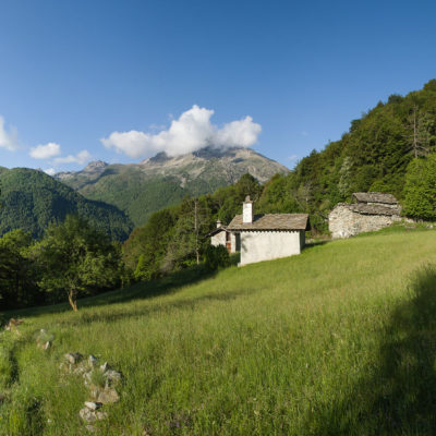 Der Abstieg von der Alpe d‘Attia führt von den oberen Alpgebäuden zunächst in einigem Auf und Ab durch Lärchenwald Richtung Westen. Zwischendurch werden einige Seitenbäche überquert, bei Regen bzw. Nässe kann es auf diesem Abschnitt hier und da rutschig sein. Schliesslich führt der Weg durch Buchenwald hinab zu den drei Hütten auf dem Pian Sarpeis (1596 m). Zwischen Juni und September kann man hier bei schöner Aussicht dem Geblöke und dem Gemecker der Schafe und Ziegen lauschen. Am Pian Sarpeis endet ein unbefestigter Fahrweg, auf dem man in Kürze zum Pianfè (1480 m) absteigt. Der Pianfè ist eine weitläufige Hochfläche mit vielen verstreuten Alpgebäuden, wo in den Sommermonaten noch zahlreiche Kühe und Rinder weiden. Bei einem Wegweiser verlässt man den Fahrweg und geht rechts, dann durch eine Lichtung bis zur westlichen Gebäudegruppe. Von dort weglos über die Weiden Richtung Süden, im Frühsommer wandert man hier durch einen farbenfrohen Blumenteppich. Bereits nach wenigen Metern trifft man wieder auf einen eindeutigen Pfad, der zunächst am Waldrand entlang führt und wenig später erneut in den parallel verlaufenden unbefestigen Fahrweg mündet. Auf diesem geht es nun etwa 20 Minuten bergab. In einer Linkskehre mit einem leicht zu übersehenden Wegweiser zweigt ein unmarkierter Pfad ab, der durch Buchenwald in weiteren 10 Minuten zu der Häusergruppe auf dem Pian della Pietra (1270 m) führt. Namensgebend für diesen abgeschiedenen Ort ist der auffällige einzelne riesige Stein (ital. = pietra), der mitten in der lieblichen Wiesenlandschaft herumliegt. Vom Pian della Pietra geht es auf der nahezu unbefahrenen Zufahrtsstrasse hinab in den Talboden des Val d‘Ala und von dort zurück zum Ausgangspunkt.