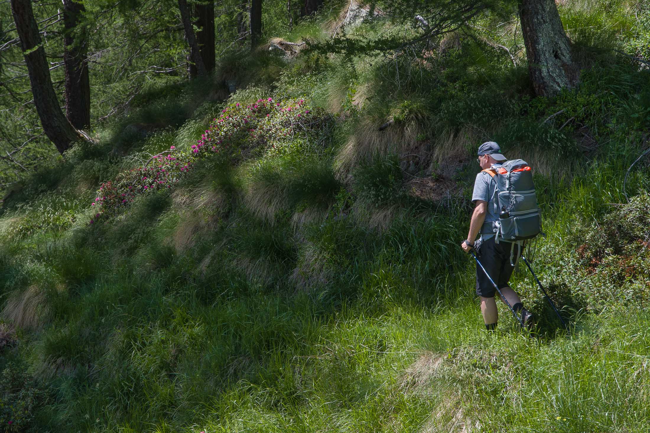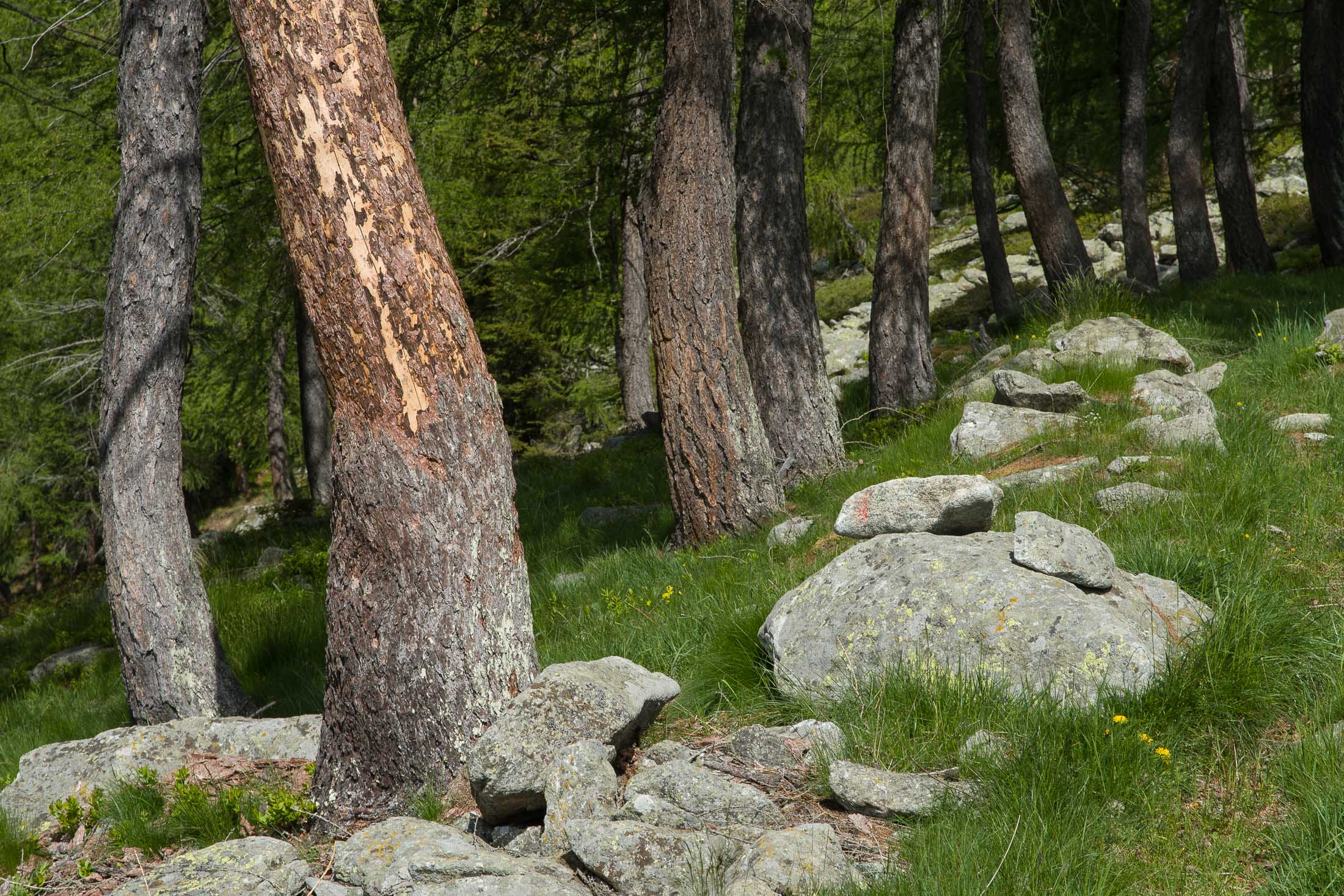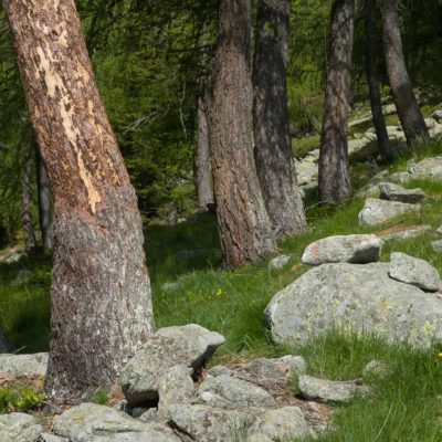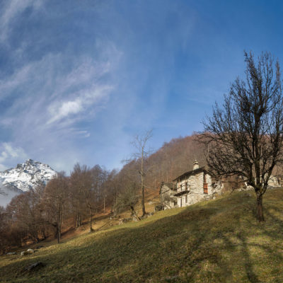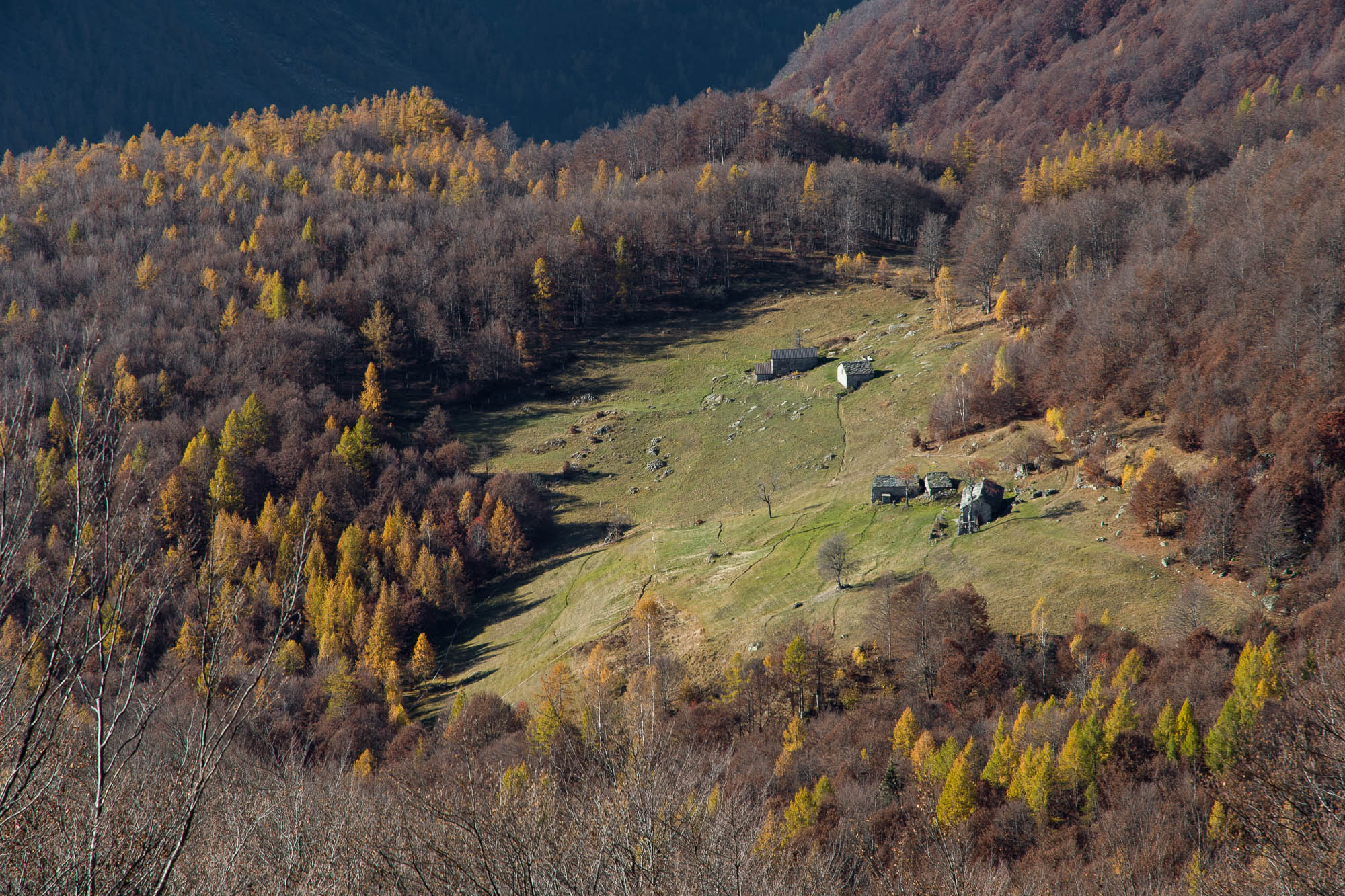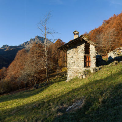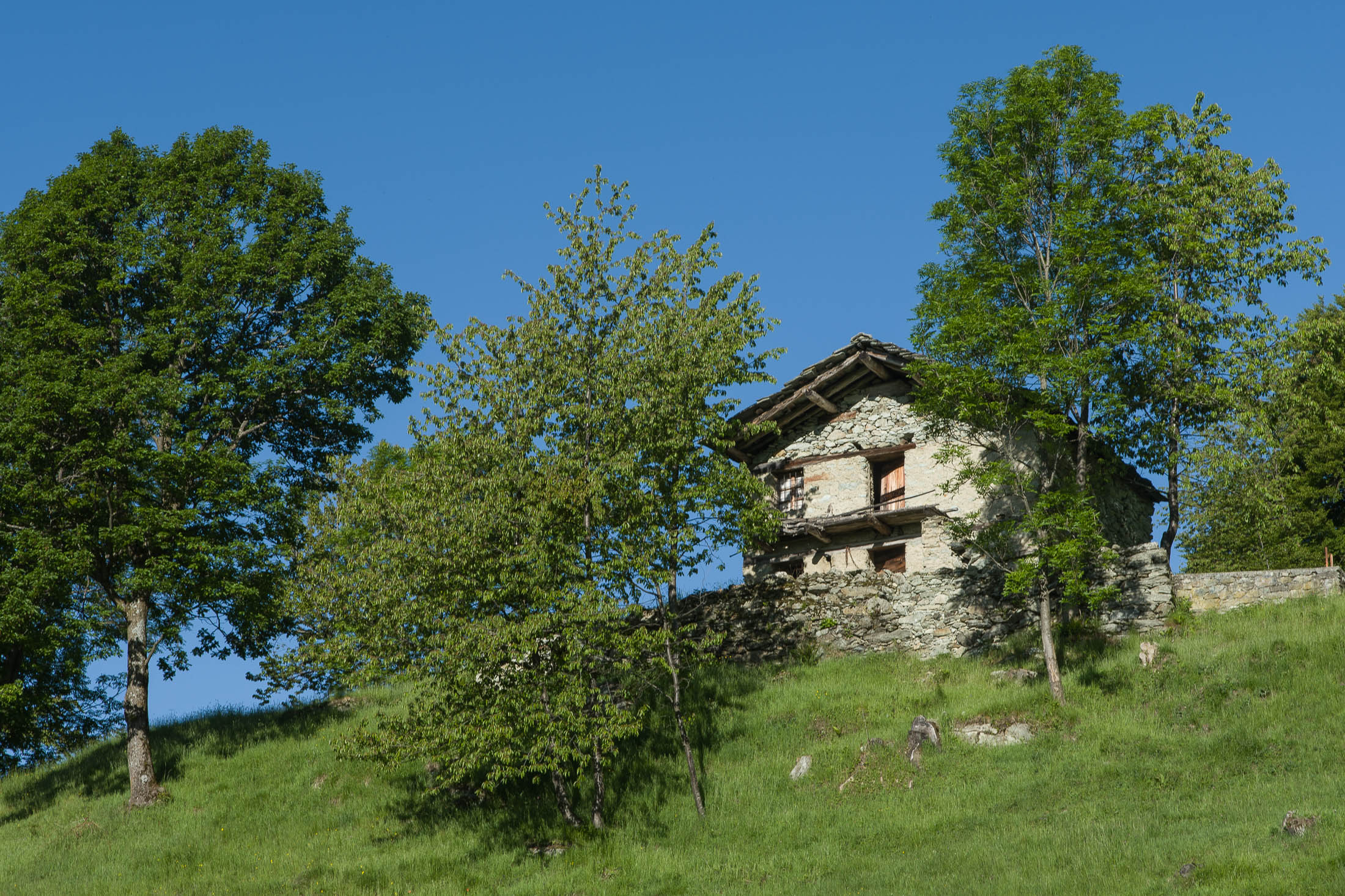 Der Abstieg von der Alpe d‘Attia führt von den oberen Alpgebäuden zunächst in einigem Auf und Ab durch Lärchenwald Richtung Westen. Zwischendurch werden einige Seitenbäche überquert, bei Regen bzw. Nässe kann es auf diesem Abschnitt hier und da rutschig sein. Schliesslich führt der Weg durch Buchenwald hinab zu den drei Hütten auf dem Pian Sarpeis (1596 m). Zwischen Juni und September kann man hier bei schöner Aussicht dem Geblöke und dem Gemecker der Schafe und Ziegen lauschen. Am Pian Sarpeis endet ein unbefestigter Fahrweg, auf dem man in Kürze zum Pianfè (1480 m) absteigt. Der Pianfè ist eine weitläufige Hochfläche mit vielen verstreuten Alpgebäuden, wo in den Sommermonaten noch zahlreiche Kühe und Rinder weiden. Bei einem Wegweiser verlässt man den Fahrweg und geht rechts, dann durch eine Lichtung bis zur westlichen Gebäudegruppe. Von dort weglos über die Weiden Richtung Süden, im Frühsommer wandert man hier durch einen farbenfrohen Blumenteppich. Bereits nach wenigen Metern trifft man wieder auf einen eindeutigen Pfad, der zunächst am Waldrand entlang führt und wenig später erneut in den parallel verlaufenden unbefestigen Fahrweg mündet. Auf diesem geht es nun etwa 20 Minuten bergab. In einer Linkskehre mit einem leicht zu übersehenden Wegweiser zweigt ein unmarkierter Pfad ab, der durch Buchenwald in weiteren 10 Minuten zu der Häusergruppe auf dem Pian della Pietra (1270 m) führt. Namensgebend für diesen abgeschiedenen Ort ist der auffällige einzelne riesige Stein (ital. = pietra), der mitten in der lieblichen Wiesenlandschaft herumliegt. Vom Pian della Pietra geht es auf der nahezu unbefahrenen Zufahrtsstrasse hinab in den Talboden des Val d‘Ala und von dort zurück zum Ausgangspunkt.