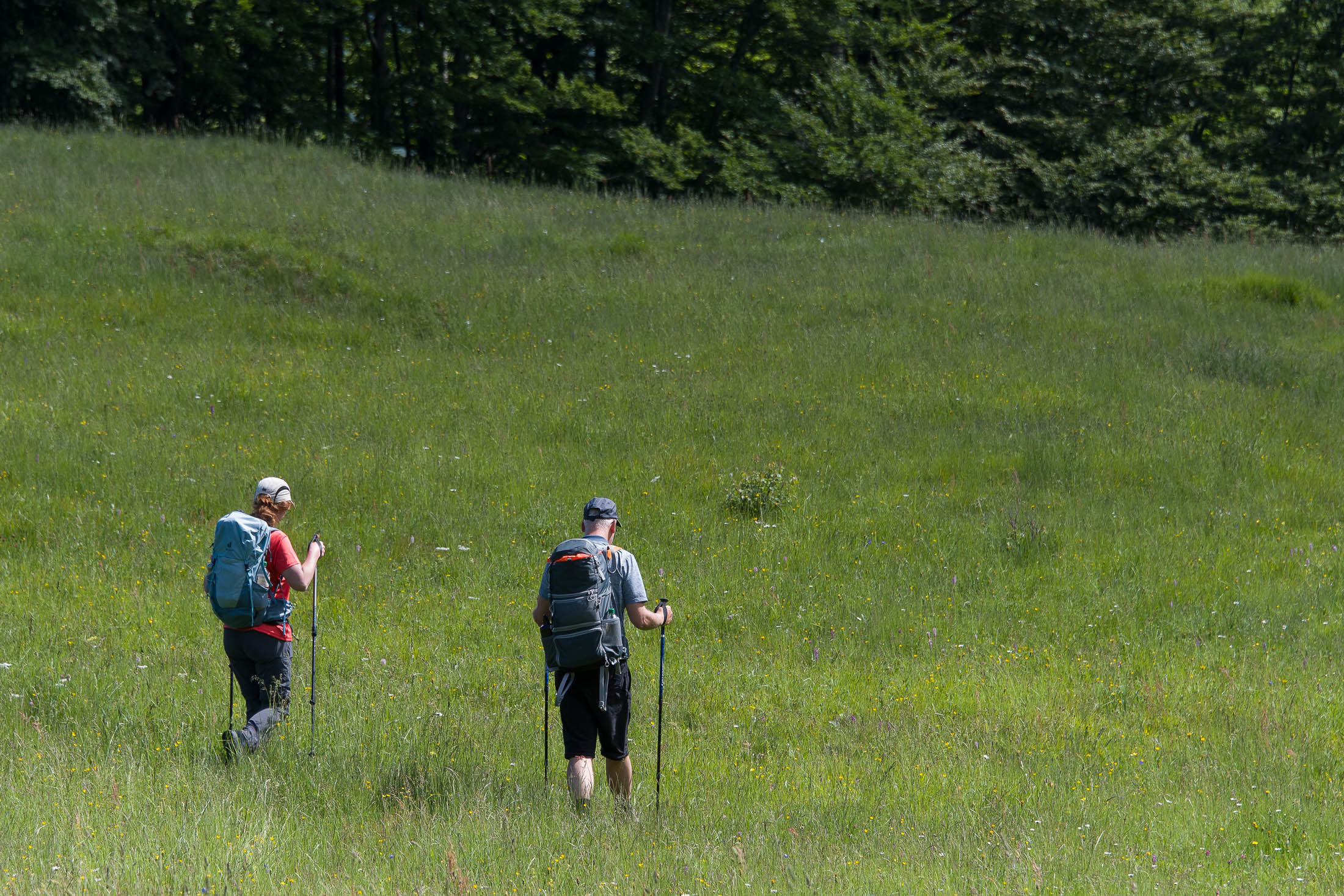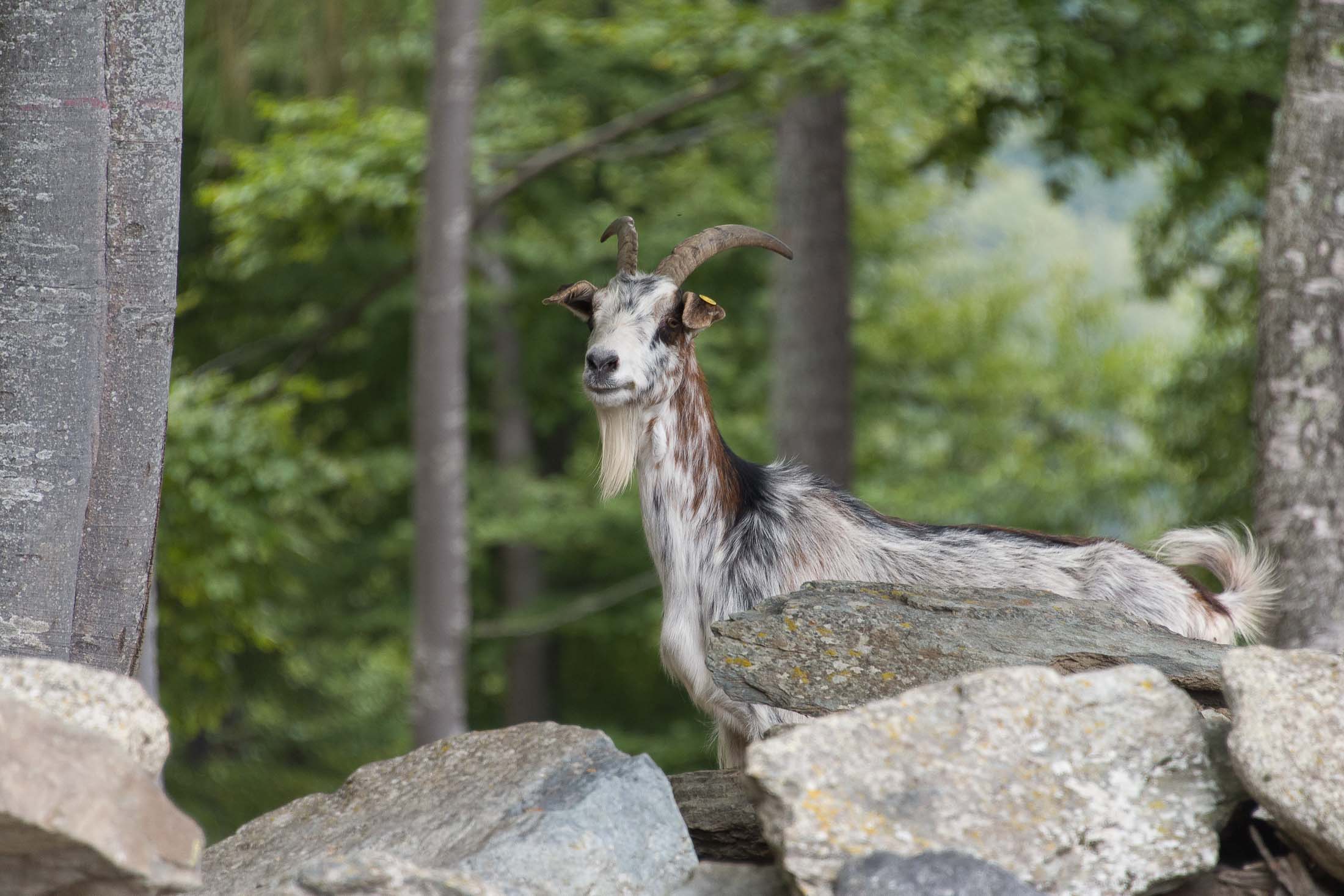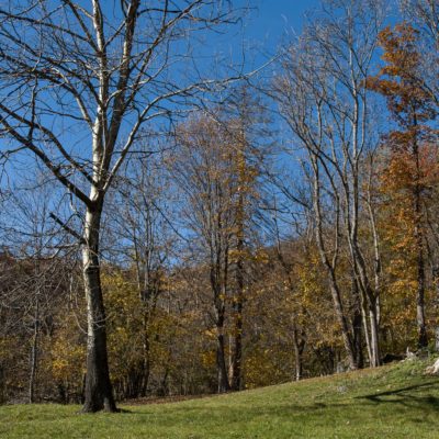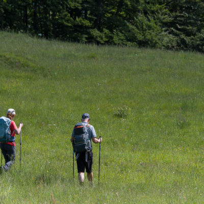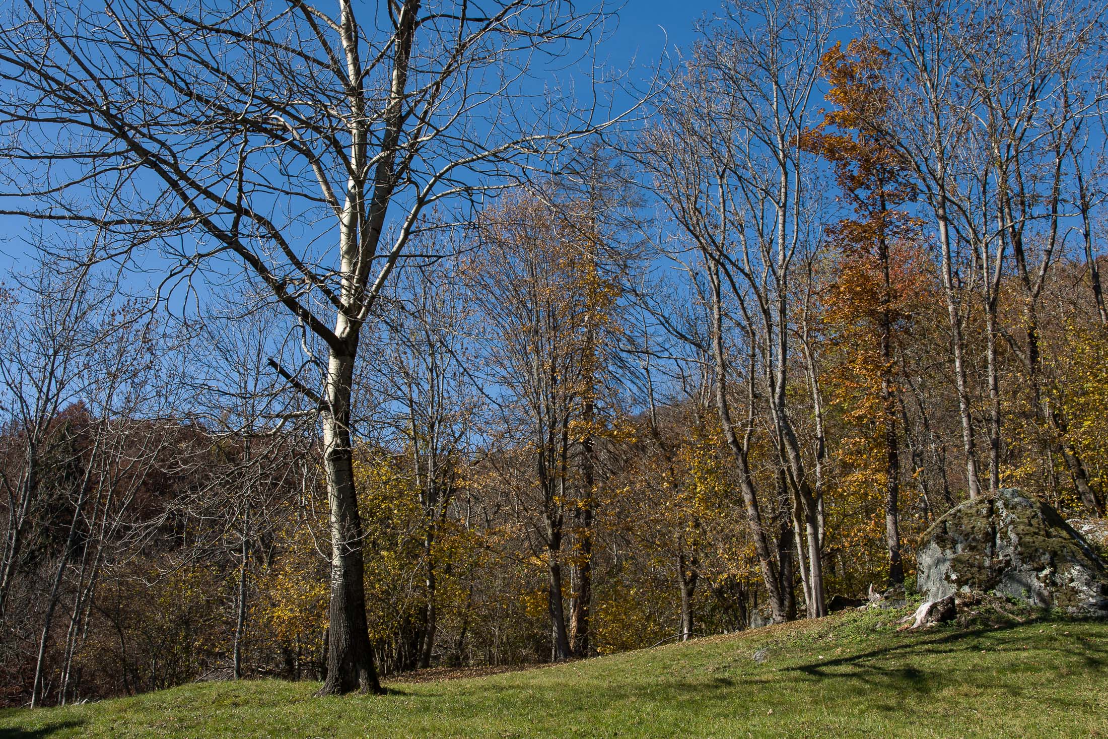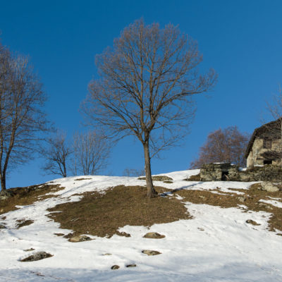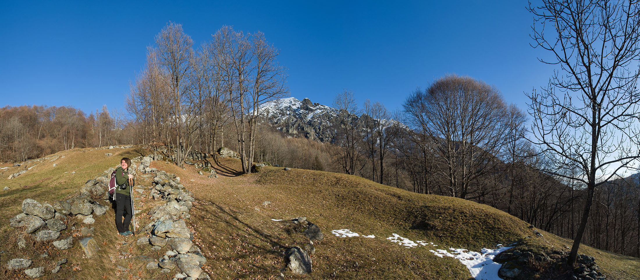 Der Abstieg von der Alpe d‘Attia führt von den oberen Alpgebäuden zunächst in einigem Auf und Ab durch Lärchenwald Richtung Westen. Zwischendurch werden einige Seitenbäche überquert, bei Regen bzw. Nässe kann es auf diesem Abschnitt hier und da rutschig sein. Schliesslich führt der Weg durch Buchenwald hinab zu den drei Hütten auf dem Pian Sarpeis (1596 m). Zwischen Juni und September kann man hier bei schöner Aussicht dem Geblöke und dem Gemecker der Schafe und Ziegen lauschen. Am Pian Sarpeis endet ein unbefestigter Fahrweg, auf dem man in Kürze zum Pianfè (1480 m) absteigt. Der Pianfè ist eine weitläufige Hochfläche mit vielen verstreuten Alpgebäuden, wo in den Sommermonaten noch zahlreiche Kühe und Rinder weiden. Bei einem Wegweiser verlässt man den Fahrweg und geht rechts, dann durch eine Lichtung bis zur westlichen Gebäudegruppe. Von dort weglos über die Weiden Richtung Süden, im Frühsommer wandert man hier durch einen farbenfrohen Blumenteppich. Bereits nach wenigen Metern trifft man wieder auf einen eindeutigen Pfad, der zunächst am Waldrand entlang führt und wenig später erneut in den parallel verlaufenden unbefestigen Fahrweg mündet. Auf diesem geht es nun etwa 20 Minuten bergab. In einer Linkskehre mit einem leicht zu übersehenden Wegweiser zweigt ein unmarkierter Pfad ab, der durch Buchenwald in weiteren 10 Minuten zu der Häusergruppe auf dem Pian della Pietra (1270 m) führt. Namensgebend für diesen abgeschiedenen Ort ist der auffällige einzelne riesige Stein (ital. = pietra), der mitten in der lieblichen Wiesenlandschaft herumliegt. Vom Pian della Pietra geht es auf der nahezu unbefahrenen Zufahrtsstrasse hinab in den Talboden des Val d‘Ala und von dort zurück zum Ausgangspunkt.