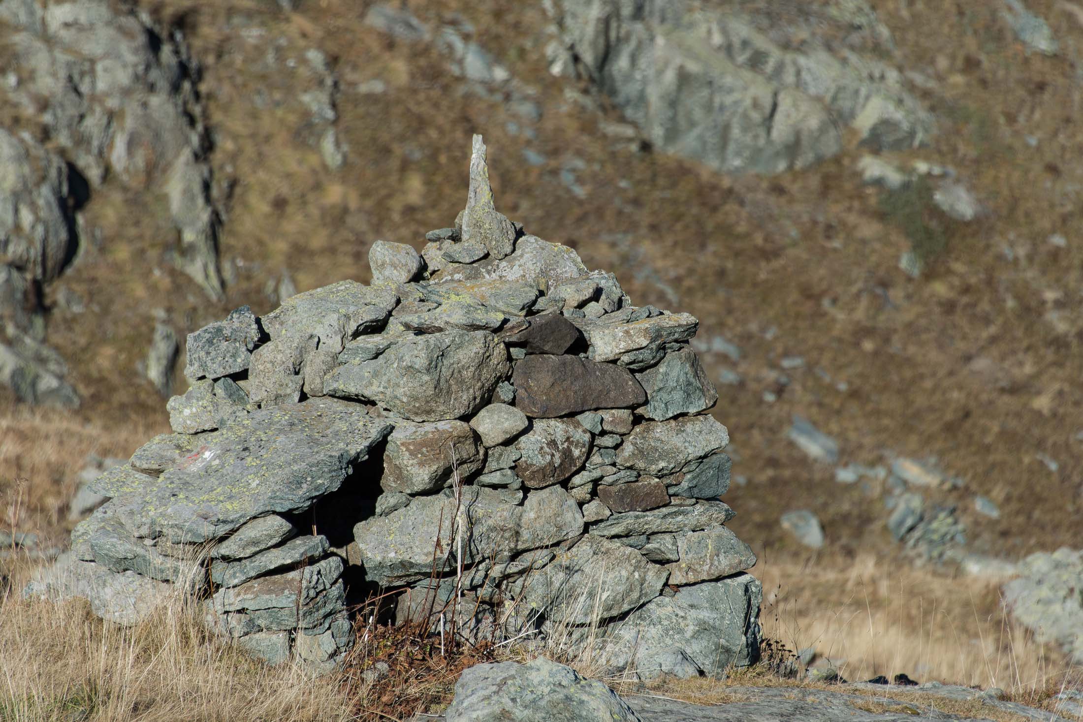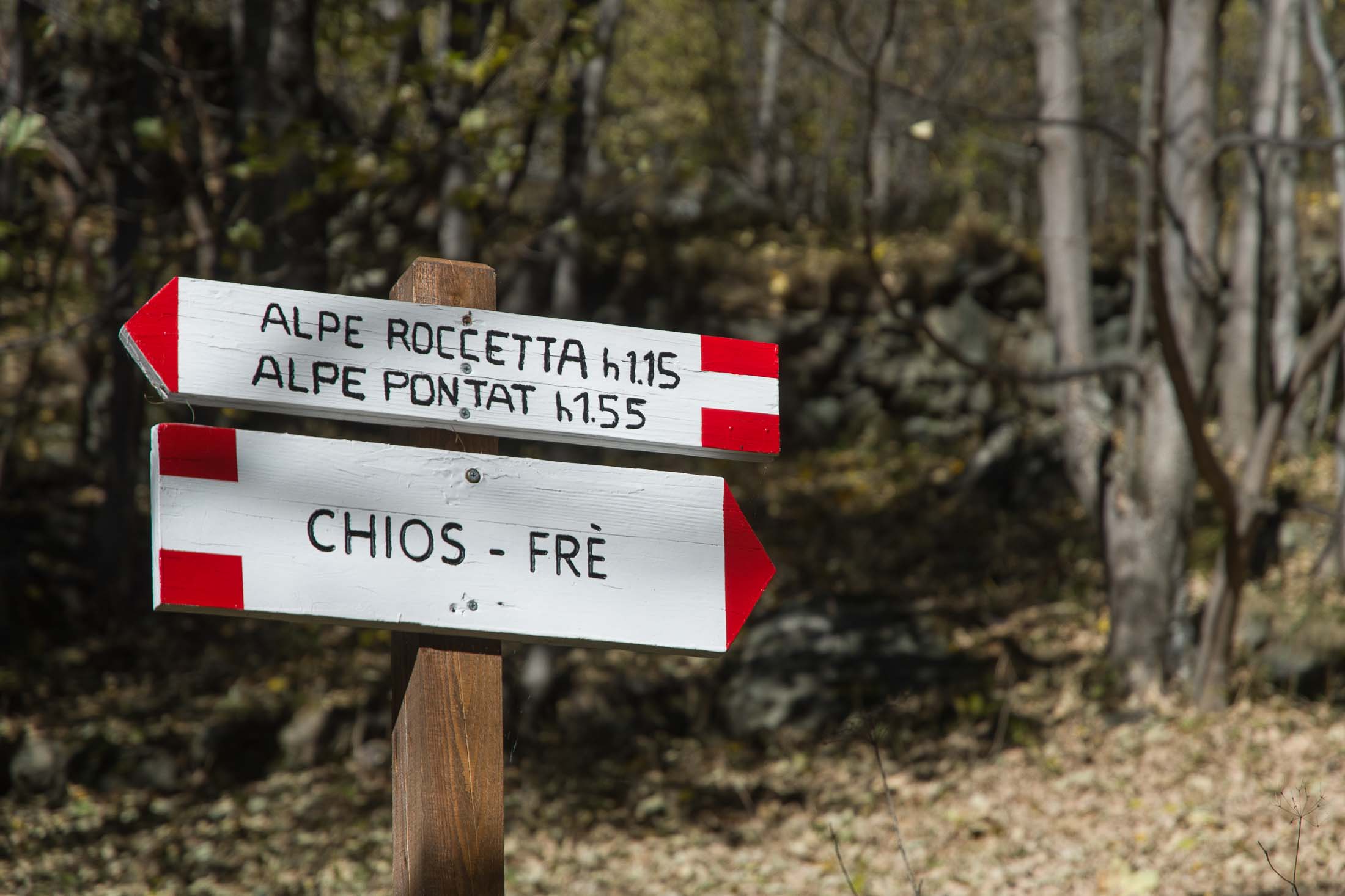 Die Wanderung beginnt bei der Häusergruppe von I Frè (1505 m), ein kleiner Weiler im stillen Val Servin, der heute nur noch von Mai bis Oktober von einer einzigen Bäuerin aus Balme bewohnt ist. Vor dem Ort befindet sich ein Wegweiser, von dort geht es über die Weiden Richtung Süden. Nach einem kurzen Anstieg erreicht man die hübsch renovierten Häuser von Chios (1557 m), dort lebt heute allerdings niemand mehr dauerhaft. Der Weg verschwindet alsbald im Wald, auf schöner Mulattiera geht es hinauf zur kleinen Lichtung der Alpe Rocco Piatto (1701 m), auch Roc Piat genannt, wo gelegentlich noch ein paar Kühe auf den Weiden stehen. Der Weg wird steiler, nach den Ruinen der Alpe Roccetta (1960 m) erreicht man die Baumgrenze und wandert aussichtsreich auf einem abschnittsweise gepflasterten historischen Alpweg zur Alpe Pontat (2181 m). Hier wurden über Generationen unzählige Kühe, Schafe und Ziegen hinaufgetrieben. Ein riesiges Alpgebiet inmitten einer endlosen Weite, mit tollem Panorama auf die umliegenden Berge. Einige Hinterlassenschaften lassen darauf schliessen, dass hier oben im Sommer noch einige Rinder weiden, die verstreuten Alphütten liegen allesamt in Ruinen. Von der Alpe Pontat geht es nun weglos, aber gut markiert weiterhin bergauf, nach 20 Minuten erreicht man eine weitere Alphochfläche mit den Überresten der Alpe Giasset (2290 m).