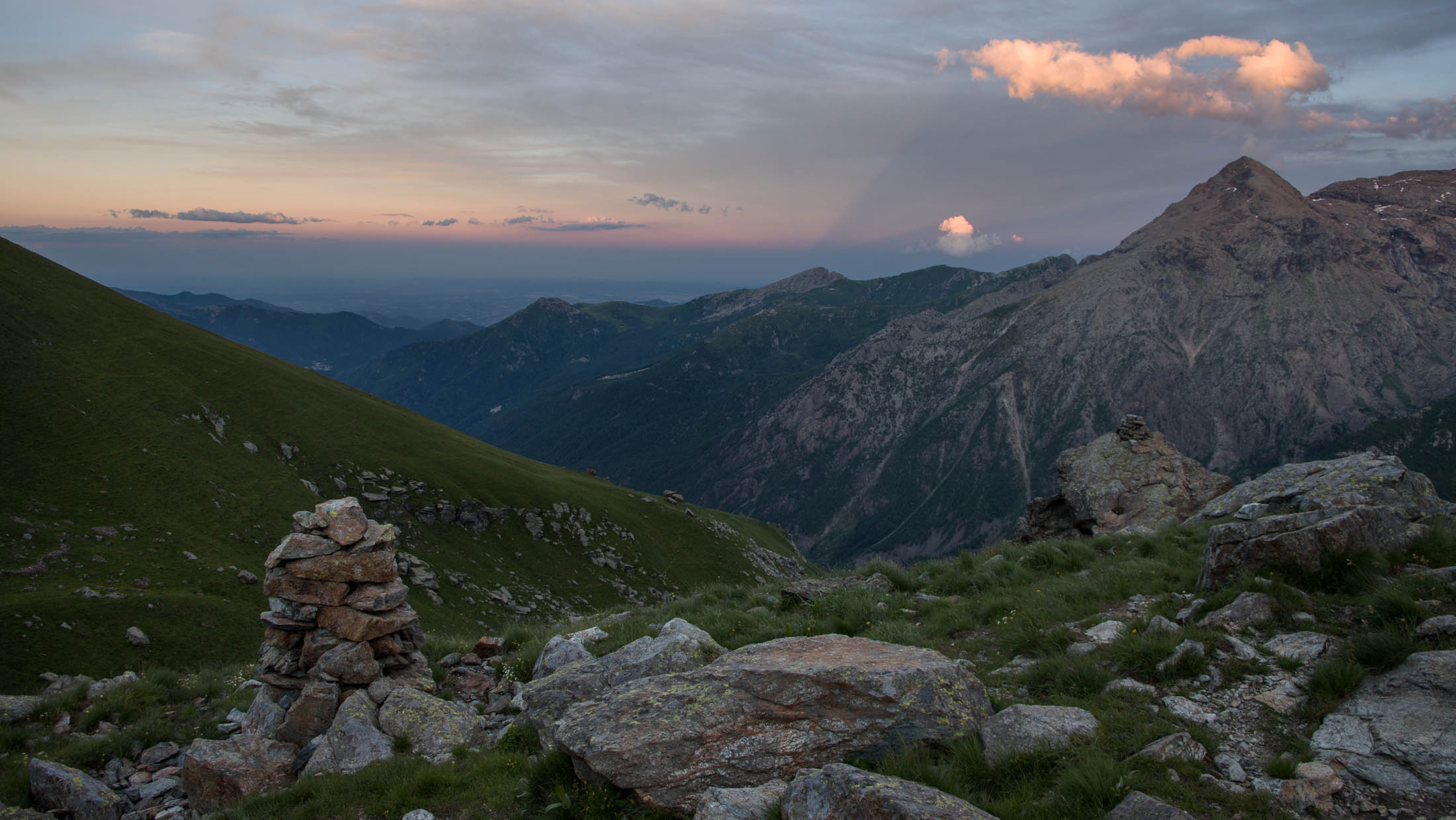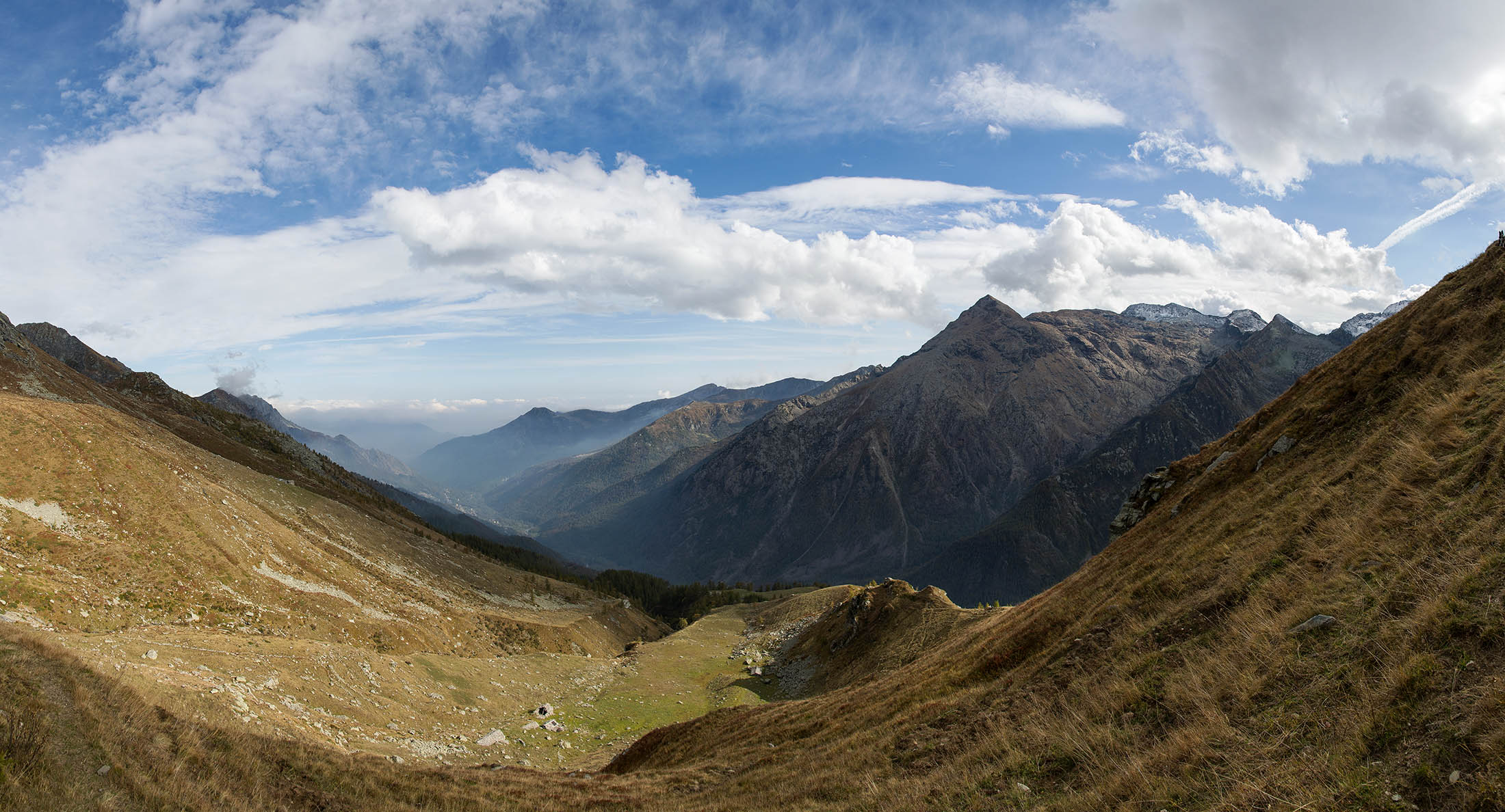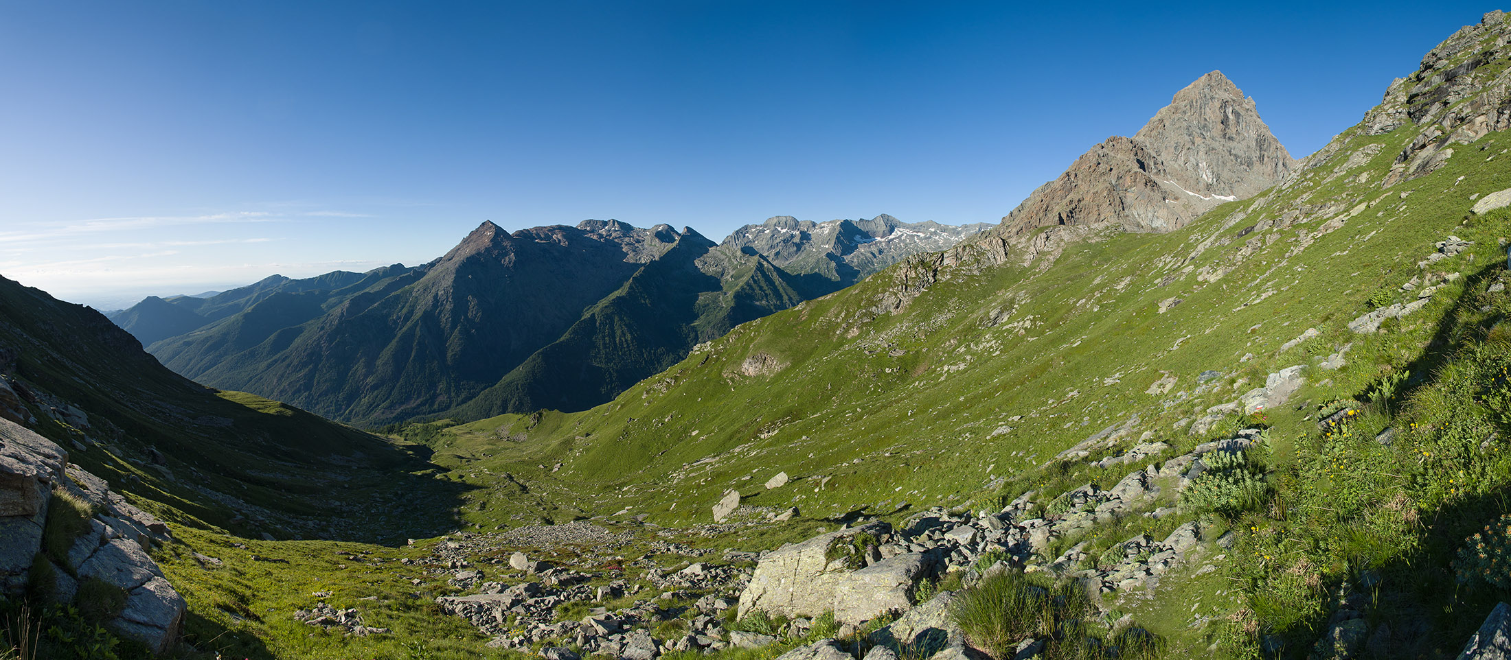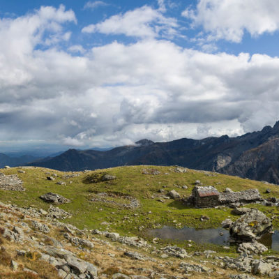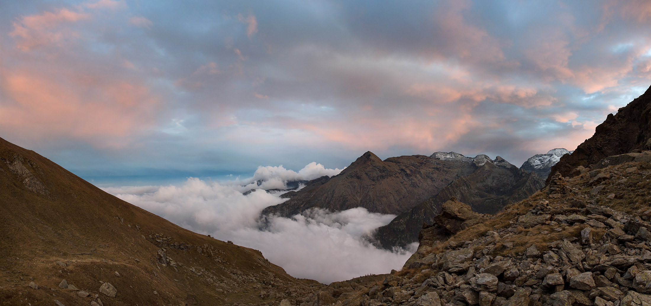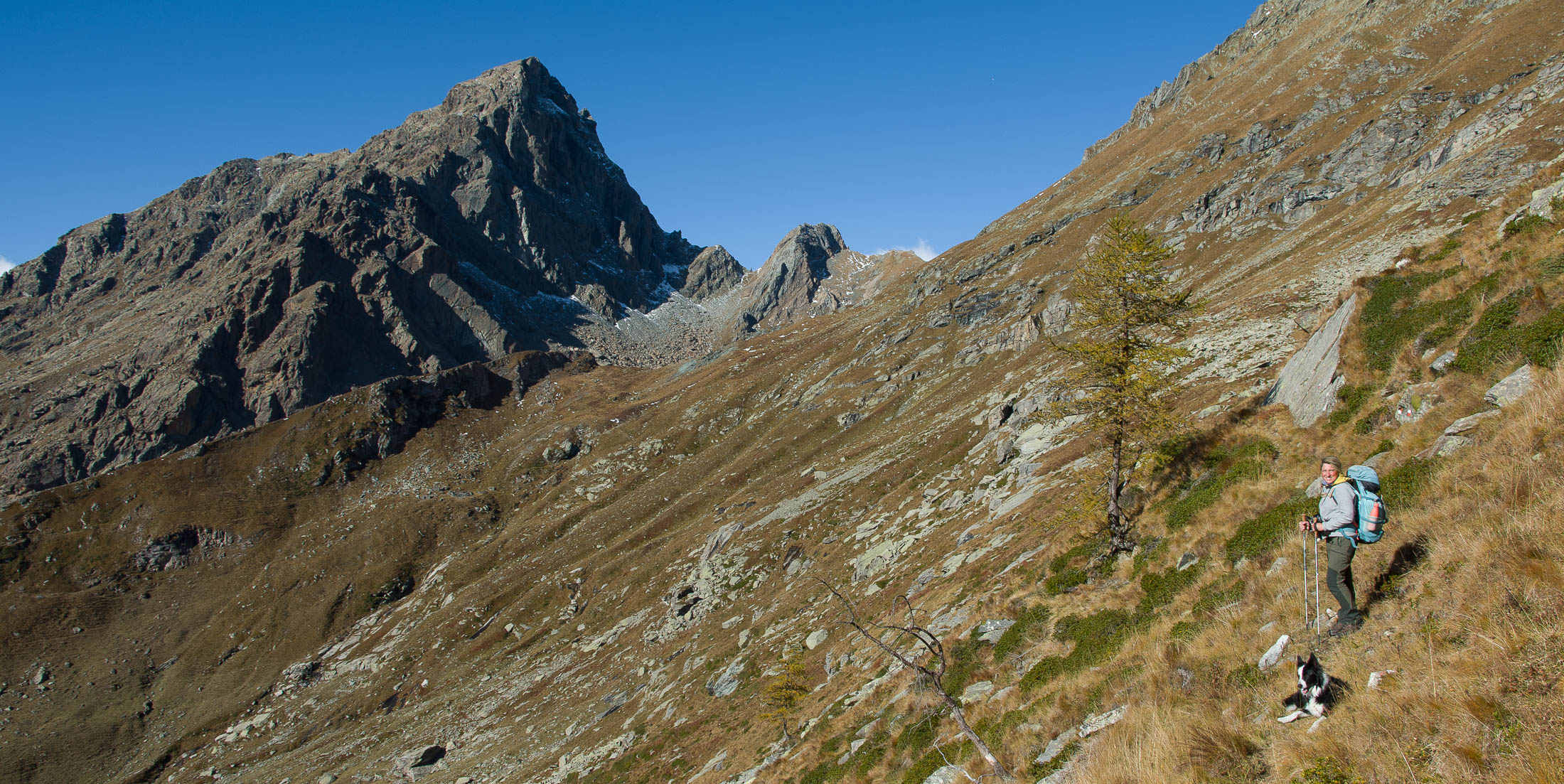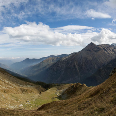 Bei schönem Wetter ist ein Sonnenaufgang am Bivacco Molino ein unvergessliches Erlebnis, ganz besonders im Herbst, wenn an manchen Tagen das Tal unter einer dichten Nebeldecke liegt. Von der Hütte steigt man mehr oder weniger weglos in einer Viertelstunde zum Sattel des Colletto della Pera Morta (2340 m). Von dort folgt man einem aussichtsreichen Höhenweg, dem sogenannten Sentiero Balcone des Val d‘Ala. Die undeutliche Pfadspur verliert sich hier und da im Gras, bei dem hier in Sommermonaten häufig vorkommenden Nebel sollten man aufpassen, dass man den Weg nicht verliert. Es geht kontinuierlich auf und ab, man kommt nur langsam voran, zwischendurch müssen einige kleinere Seitenbäche überquert werden. Für den etwa 3 km langen Wegabschnitt vergehen nahezu zwei Stunden, vermutlich auch, weil man immer wieder stehen bleibt, um die tolle Aussicht zu geniessen. Im weiteren Verlauf schlängelt sich der schmale Pfad ohne nennenswerte Höhenunterschiede um einen Bergrücken, dahinter geht es kurz bergab und man kommt zur schön gelegenen Alpe Pian del Lago (2225 m), die sich auf einer weitläufigen Hochfläche befindet. Hier trifft man auf den Weitwanderweg GTA (Grande Traversata delle Alpi), auf dem man in Kürze den in einer Talmulde liegende Lago Vasuero (2237 m) erreicht, ein malerischer Bergsee am Fuss der Cima Leitosa (2868 m). Der nun deutliche und gut markierte Weg führt in weiteren 45 Minuten zum Colle di Trione (2486 m), Wasserscheide zwischen dem Val d‘Ala und dem Val Grande di Lanzo. Ein malerisches Fleckchen, genau der richtige Ort zum Ausruhen, Innehalten und Geniessen, das Panorama ist eindrücklich, bei klarem Wetter zeigt sich im Norden das Gran Paradiso-Gruppe. Für eine noch umfassendere Aussicht lohnt ein kurzer Abstecher entlang des Grates bis zu einem kleinen Steinmann (ca. 2520 m).