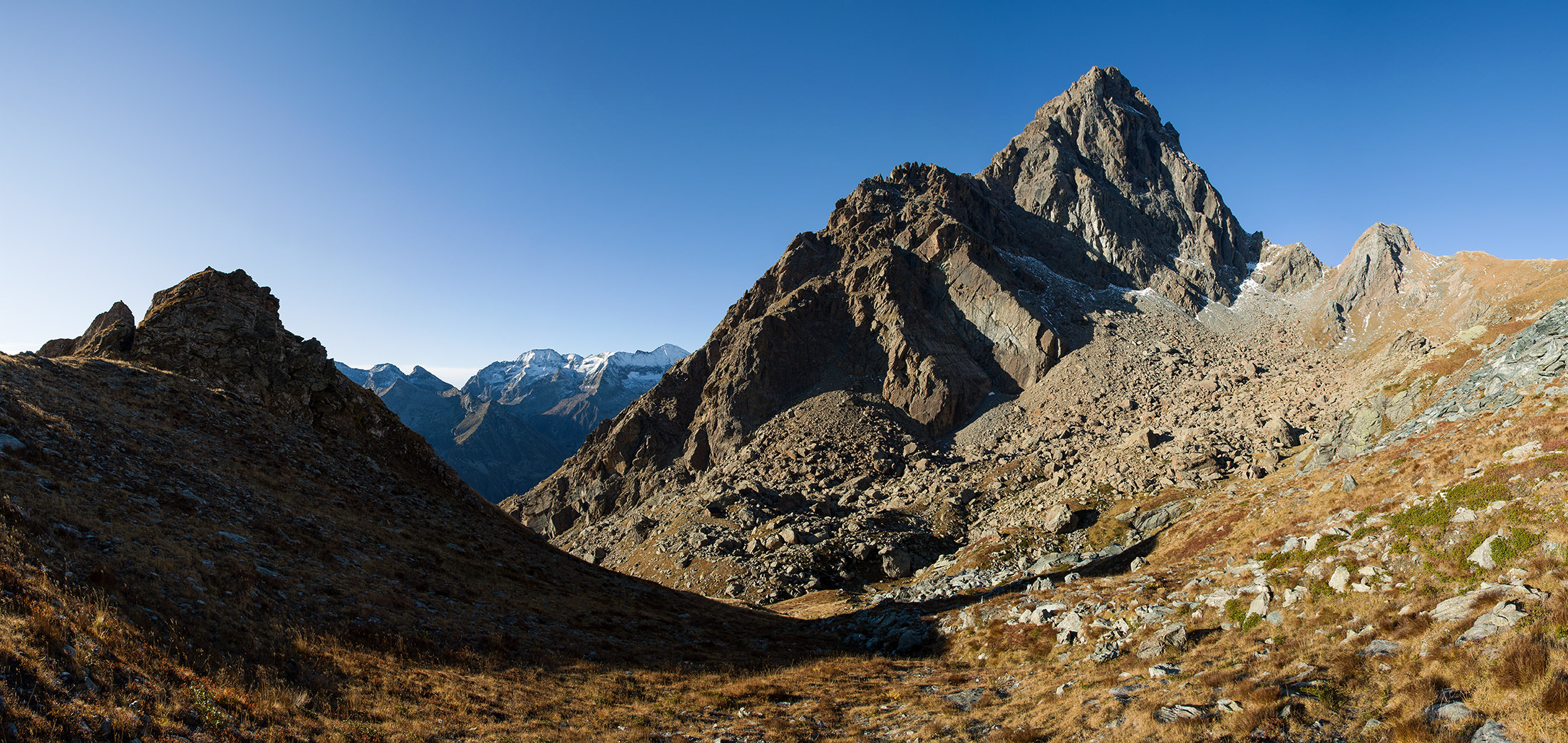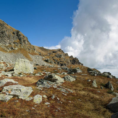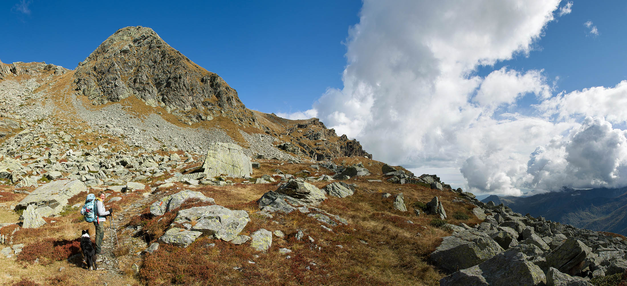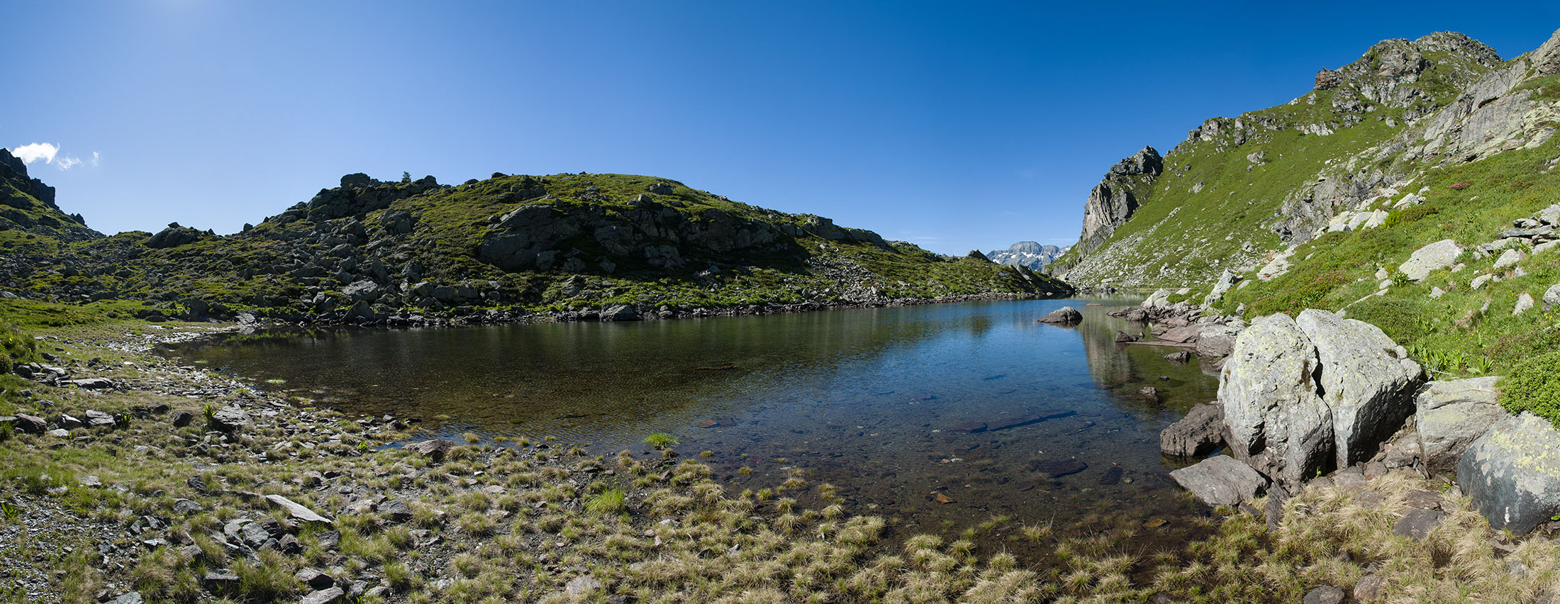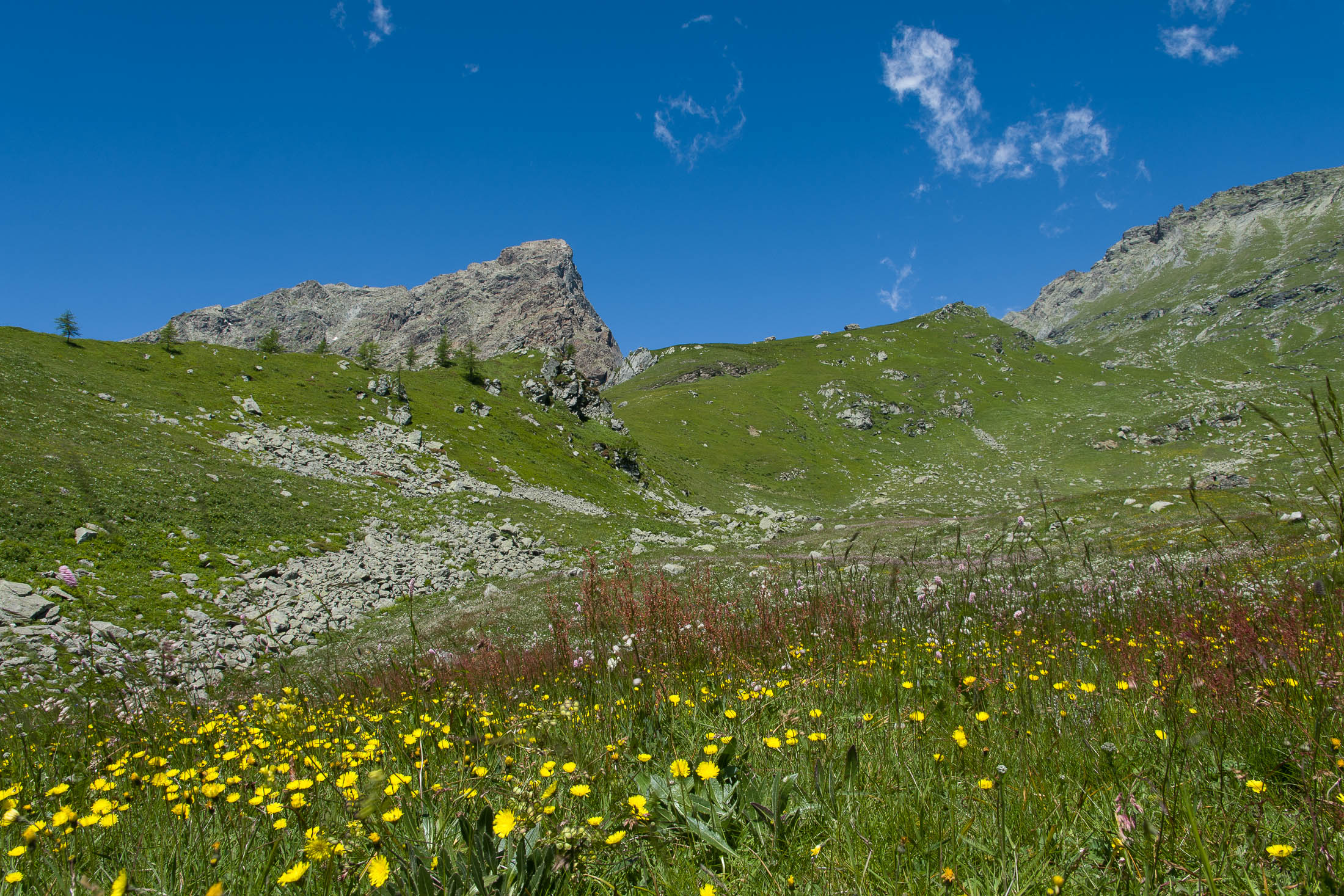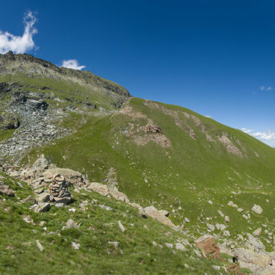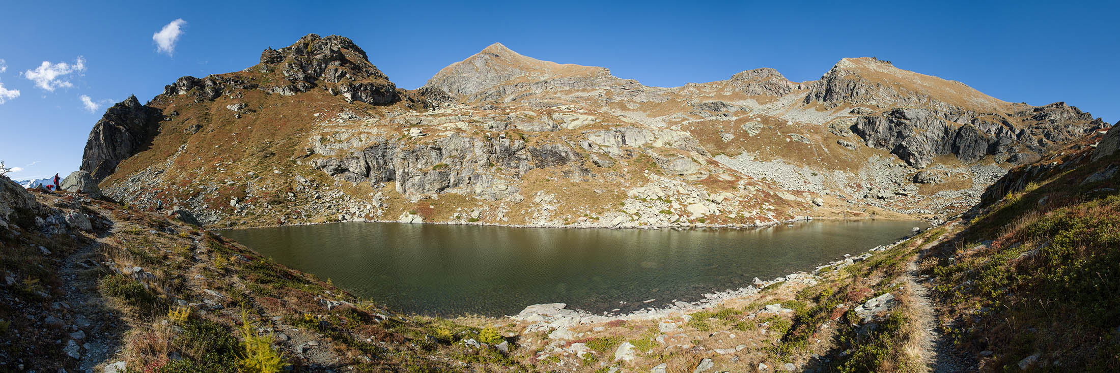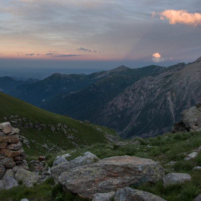 Bei schönem Wetter ist ein Sonnenaufgang am Bivacco Molino ein unvergessliches Erlebnis, ganz besonders im Herbst, wenn an manchen Tagen das Tal unter einer dichten Nebeldecke liegt. Von der Hütte steigt man mehr oder weniger weglos in einer Viertelstunde zum Sattel des Colletto della Pera Morta (2340 m). Von dort folgt man einem aussichtsreichen Höhenweg, dem sogenannten Sentiero Balcone des Val d‘Ala. Die undeutliche Pfadspur verliert sich hier und da im Gras, bei dem hier in Sommermonaten häufig vorkommenden Nebel sollten man aufpassen, dass man den Weg nicht verliert. Es geht kontinuierlich auf und ab, man kommt nur langsam voran, zwischendurch müssen einige kleinere Seitenbäche überquert werden. Für den etwa 3 km langen Wegabschnitt vergehen nahezu zwei Stunden, vermutlich auch, weil man immer wieder stehen bleibt, um die tolle Aussicht zu geniessen. Im weiteren Verlauf schlängelt sich der schmale Pfad ohne nennenswerte Höhenunterschiede um einen Bergrücken, dahinter geht es kurz bergab und man kommt zur schön gelegenen Alpe Pian del Lago (2225 m), die sich auf einer weitläufigen Hochfläche befindet. Hier trifft man auf den Weitwanderweg GTA (Grande Traversata delle Alpi), auf dem man in Kürze den in einer Talmulde liegende Lago Vasuero (2237 m) erreicht, ein malerischer Bergsee am Fuss der Cima Leitosa (2868 m). Der nun deutliche und gut markierte Weg führt in weiteren 45 Minuten zum Colle di Trione (2486 m), Wasserscheide zwischen dem Val d‘Ala und dem Val Grande di Lanzo. Ein malerisches Fleckchen, genau der richtige Ort zum Ausruhen, Innehalten und Geniessen, das Panorama ist eindrücklich, bei klarem Wetter zeigt sich im Norden das Gran Paradiso-Gruppe. Für eine noch umfassendere Aussicht lohnt ein kurzer Abstecher entlang des Grates bis zu einem kleinen Steinmann (ca. 2520 m).