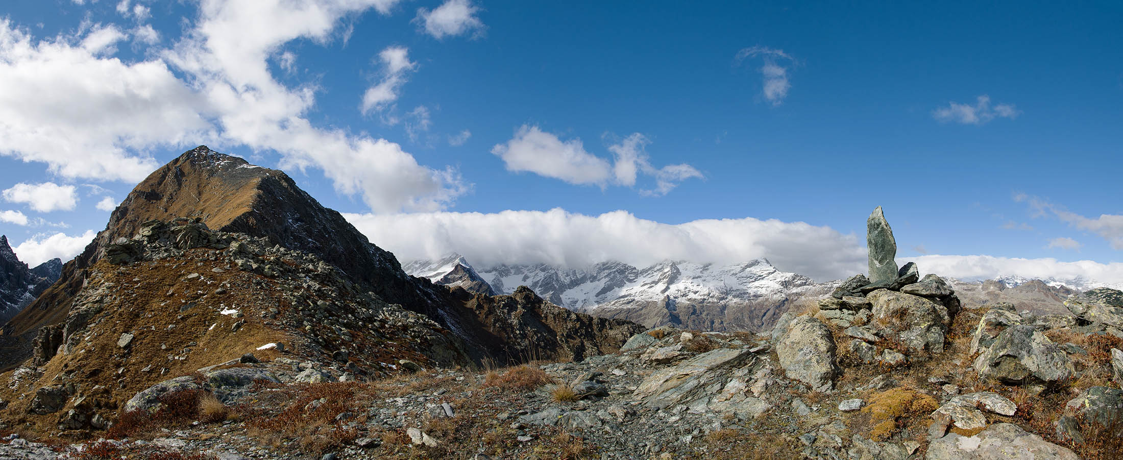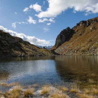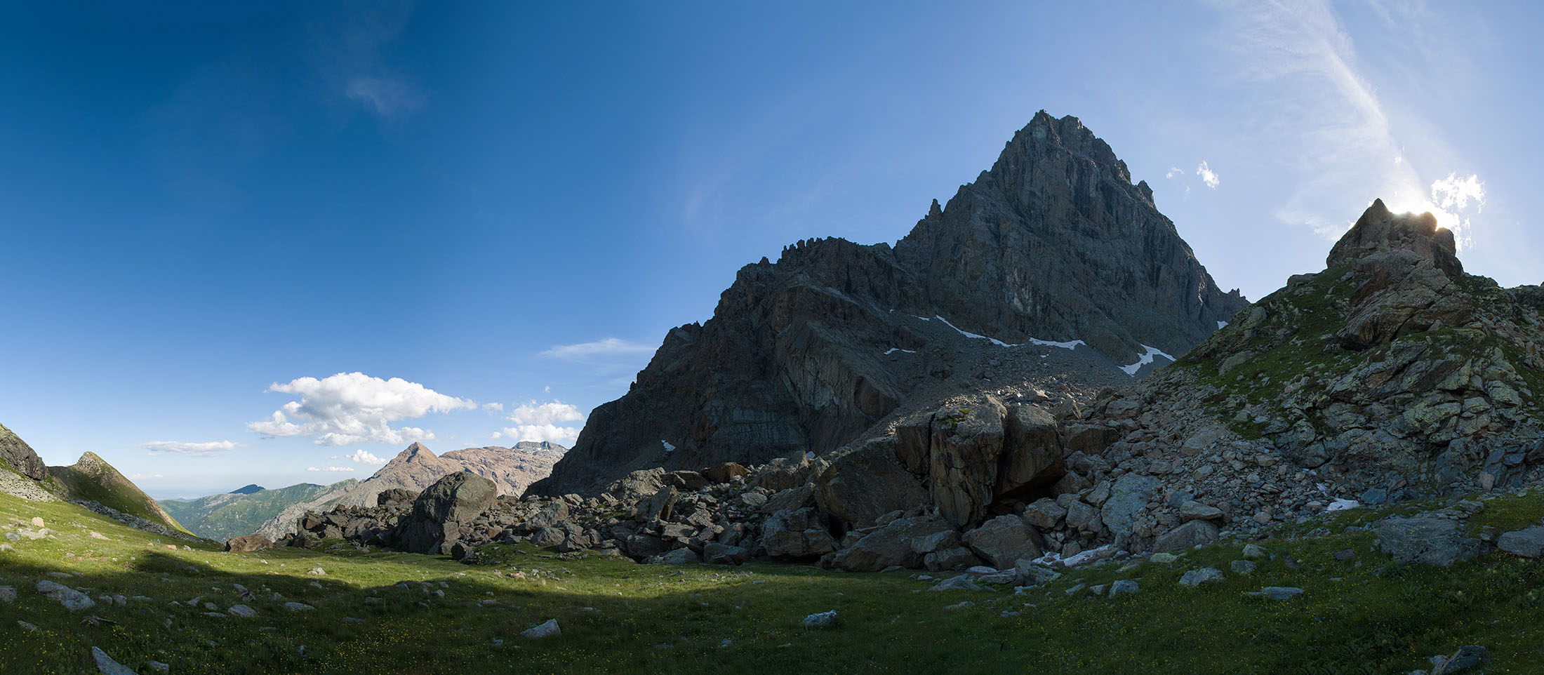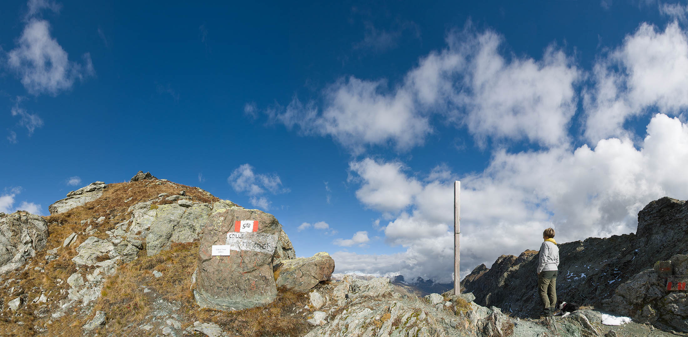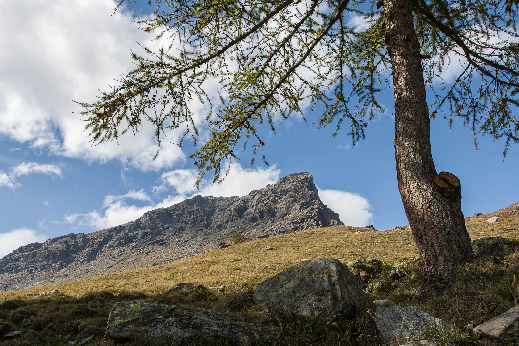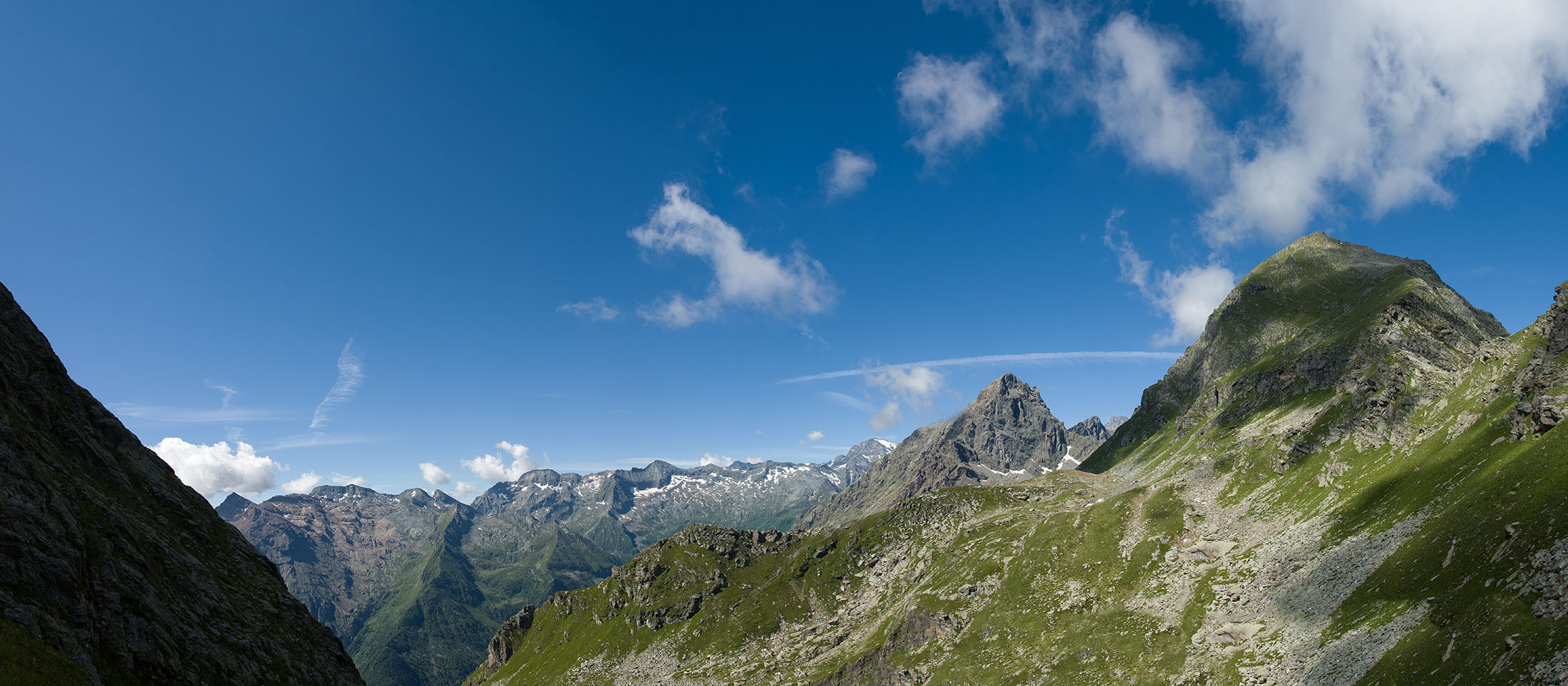 Bei schönem Wetter ist ein Sonnenaufgang am Bivacco Molino ein unvergessliches Erlebnis, ganz besonders im Herbst, wenn an manchen Tagen das Tal unter einer dichten Nebeldecke liegt. Von der Hütte steigt man mehr oder weniger weglos in einer Viertelstunde zum Sattel des Colletto della Pera Morta (2340 m). Von dort folgt man einem aussichtsreichen Höhenweg, dem sogenannten Sentiero Balcone des Val d‘Ala. Die undeutliche Pfadspur verliert sich hier und da im Gras, bei dem hier in Sommermonaten häufig vorkommenden Nebel sollten man aufpassen, dass man den Weg nicht verliert. Es geht kontinuierlich auf und ab, man kommt nur langsam voran, zwischendurch müssen einige kleinere Seitenbäche überquert werden. Für den etwa 3 km langen Wegabschnitt vergehen nahezu zwei Stunden, vermutlich auch, weil man immer wieder stehen bleibt, um die tolle Aussicht zu geniessen. Im weiteren Verlauf schlängelt sich der schmale Pfad ohne nennenswerte Höhenunterschiede um einen Bergrücken, dahinter geht es kurz bergab und man kommt zur schön gelegenen Alpe Pian del Lago (2225 m), die sich auf einer weitläufigen Hochfläche befindet. Hier trifft man auf den Weitwanderweg GTA (Grande Traversata delle Alpi), auf dem man in Kürze den in einer Talmulde liegende Lago Vasuero (2237 m) erreicht, ein malerischer Bergsee am Fuss der Cima Leitosa (2868 m). Der nun deutliche und gut markierte Weg führt in weiteren 45 Minuten zum Colle di Trione (2486 m), Wasserscheide zwischen dem Val d‘Ala und dem Val Grande di Lanzo. Ein malerisches Fleckchen, genau der richtige Ort zum Ausruhen, Innehalten und Geniessen, das Panorama ist eindrücklich, bei klarem Wetter zeigt sich im Norden das Gran Paradiso-Gruppe. Für eine noch umfassendere Aussicht lohnt ein kurzer Abstecher entlang des Grates bis zu einem kleinen Steinmann (ca. 2520 m).
