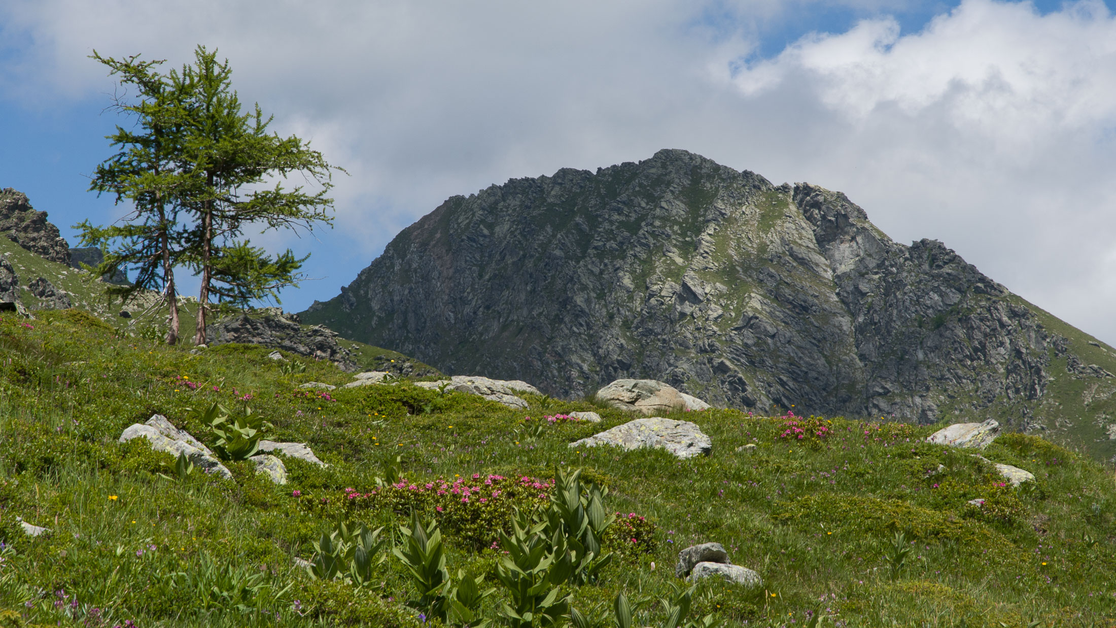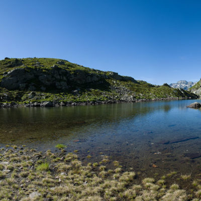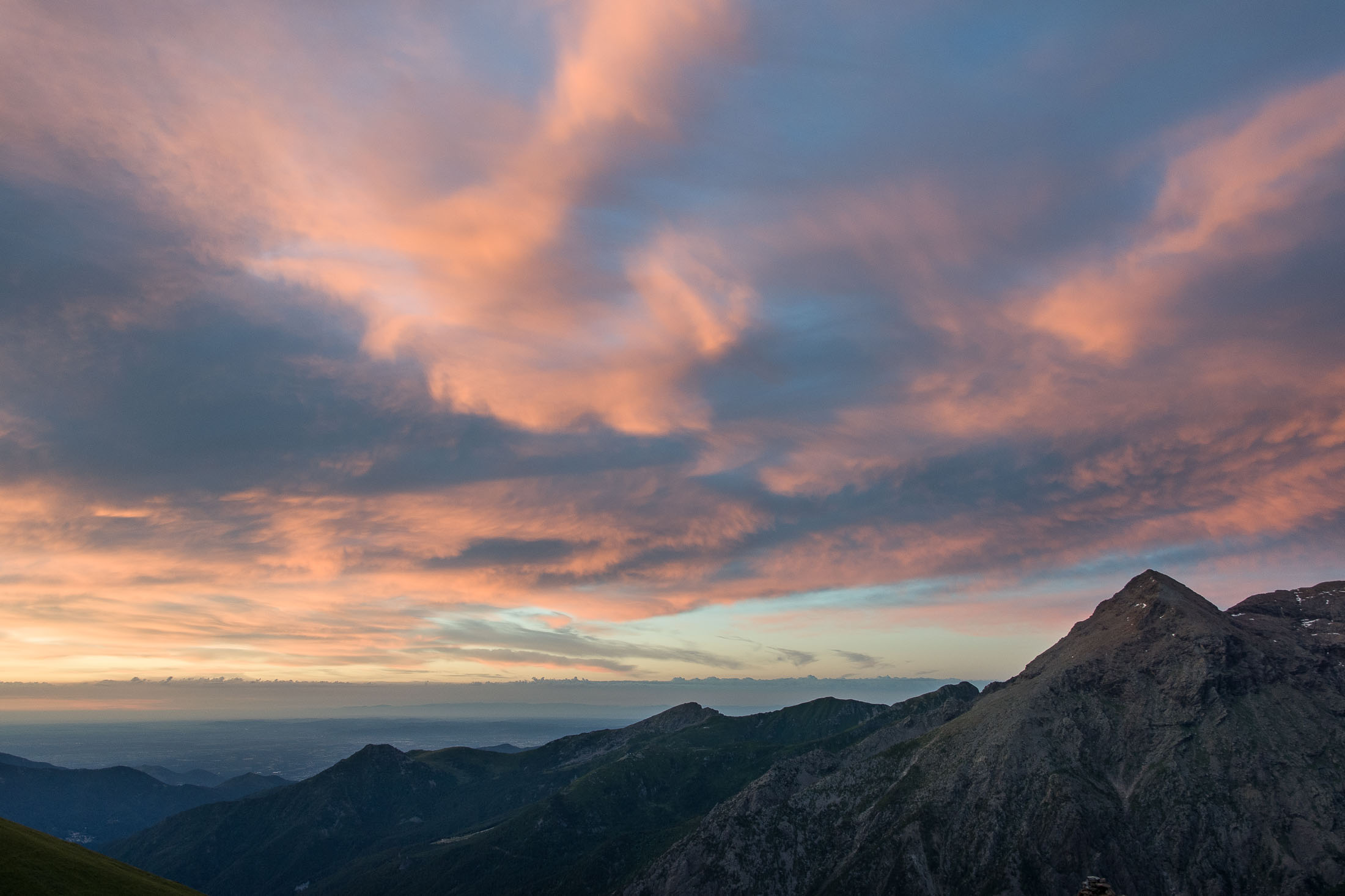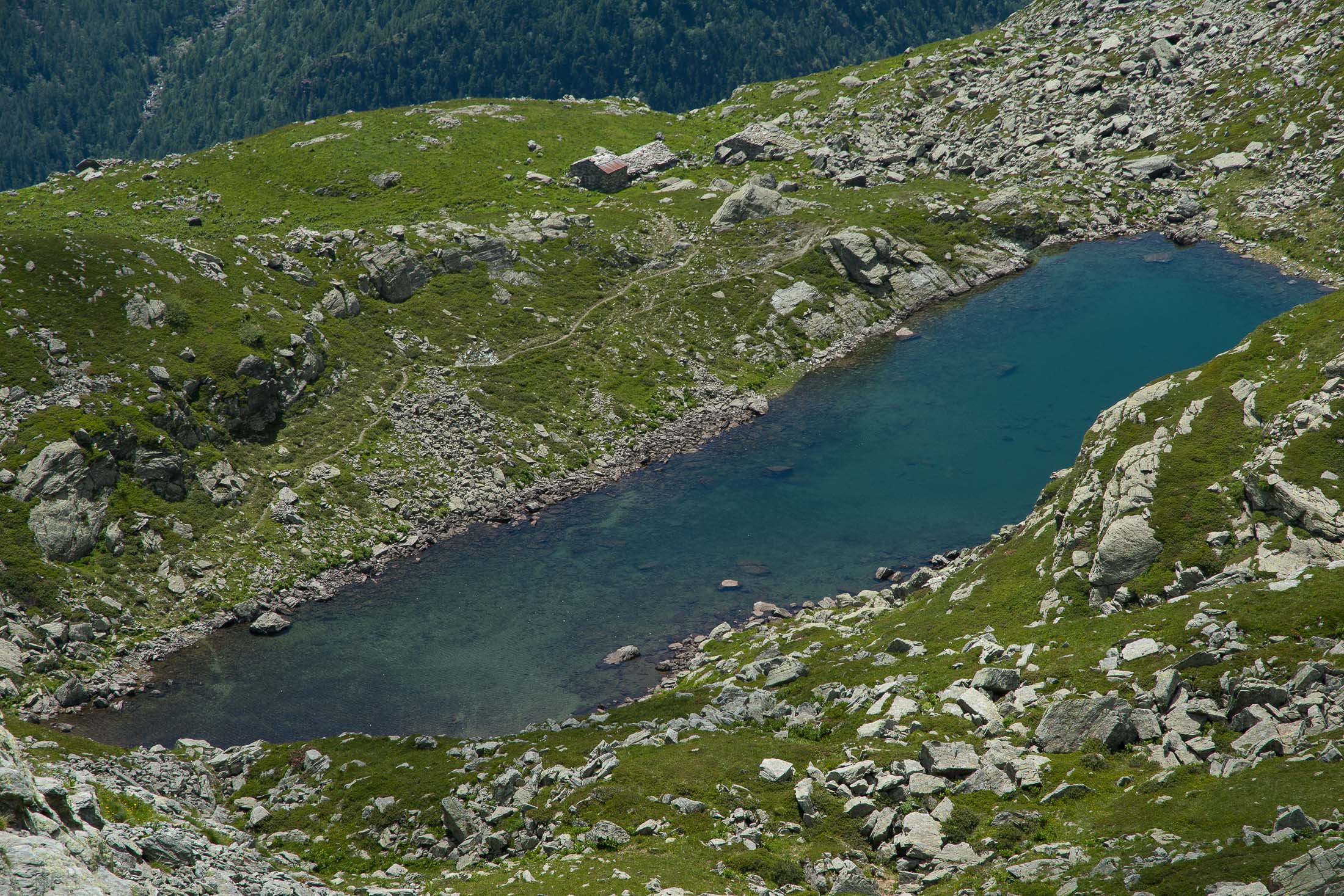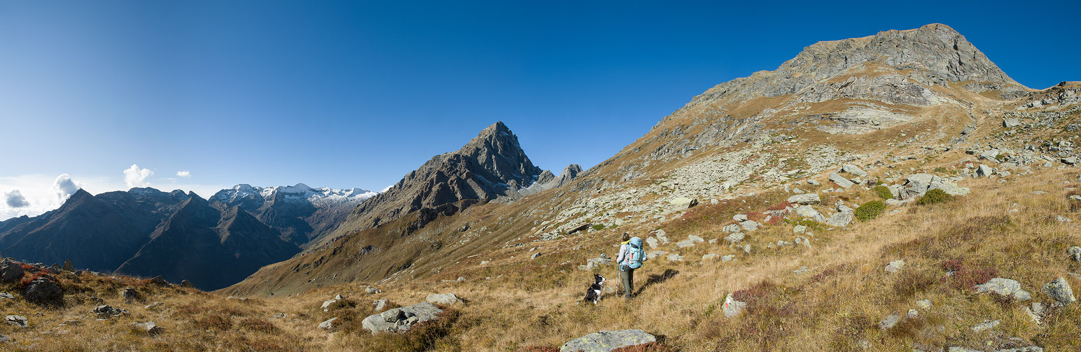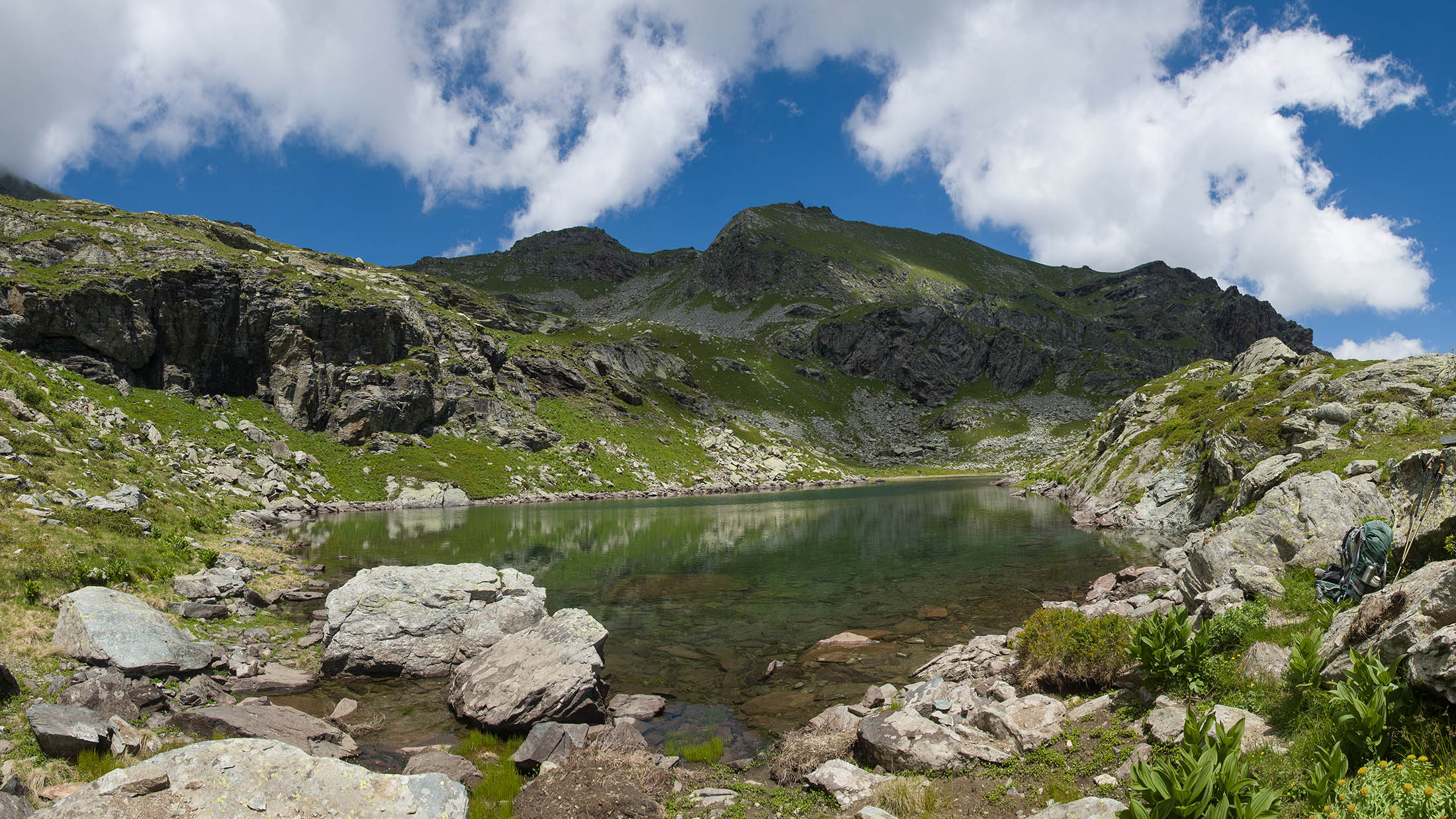 Bei schönem Wetter ist ein Sonnenaufgang am Bivacco Molino ein unvergessliches Erlebnis, ganz besonders im Herbst, wenn an manchen Tagen das Tal unter einer dichten Nebeldecke liegt. Von der Hütte steigt man mehr oder weniger weglos in einer Viertelstunde zum Sattel des Colletto della Pera Morta (2340 m). Von dort folgt man einem aussichtsreichen Höhenweg, dem sogenannten Sentiero Balcone des Val d‘Ala. Die undeutliche Pfadspur verliert sich hier und da im Gras, bei dem hier in Sommermonaten häufig vorkommenden Nebel sollten man aufpassen, dass man den Weg nicht verliert. Es geht kontinuierlich auf und ab, man kommt nur langsam voran, zwischendurch müssen einige kleinere Seitenbäche überquert werden. Für den etwa 3 km langen Wegabschnitt vergehen nahezu zwei Stunden, vermutlich auch, weil man immer wieder stehen bleibt, um die tolle Aussicht zu geniessen. Im weiteren Verlauf schlängelt sich der schmale Pfad ohne nennenswerte Höhenunterschiede um einen Bergrücken, dahinter geht es kurz bergab und man kommt zur schön gelegenen Alpe Pian del Lago (2225 m), die sich auf einer weitläufigen Hochfläche befindet. Hier trifft man auf den Weitwanderweg GTA (Grande Traversata delle Alpi), auf dem man in Kürze den in einer Talmulde liegende Lago Vasuero (2237 m) erreicht, ein malerischer Bergsee am Fuss der Cima Leitosa (2868 m). Der nun deutliche und gut markierte Weg führt in weiteren 45 Minuten zum Colle di Trione (2486 m), Wasserscheide zwischen dem Val d‘Ala und dem Val Grande di Lanzo. Ein malerisches Fleckchen, genau der richtige Ort zum Ausruhen, Innehalten und Geniessen, das Panorama ist eindrücklich, bei klarem Wetter zeigt sich im Norden das Gran Paradiso-Gruppe. Für eine noch umfassendere Aussicht lohnt ein kurzer Abstecher entlang des Grates bis zu einem kleinen Steinmann (ca. 2520 m).