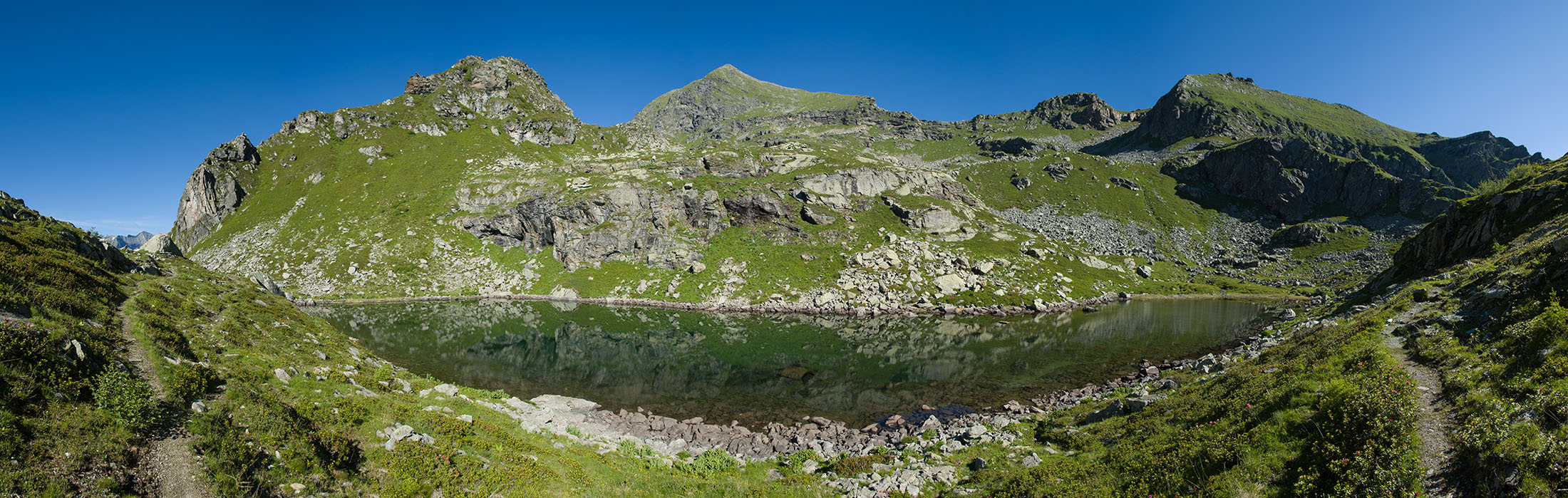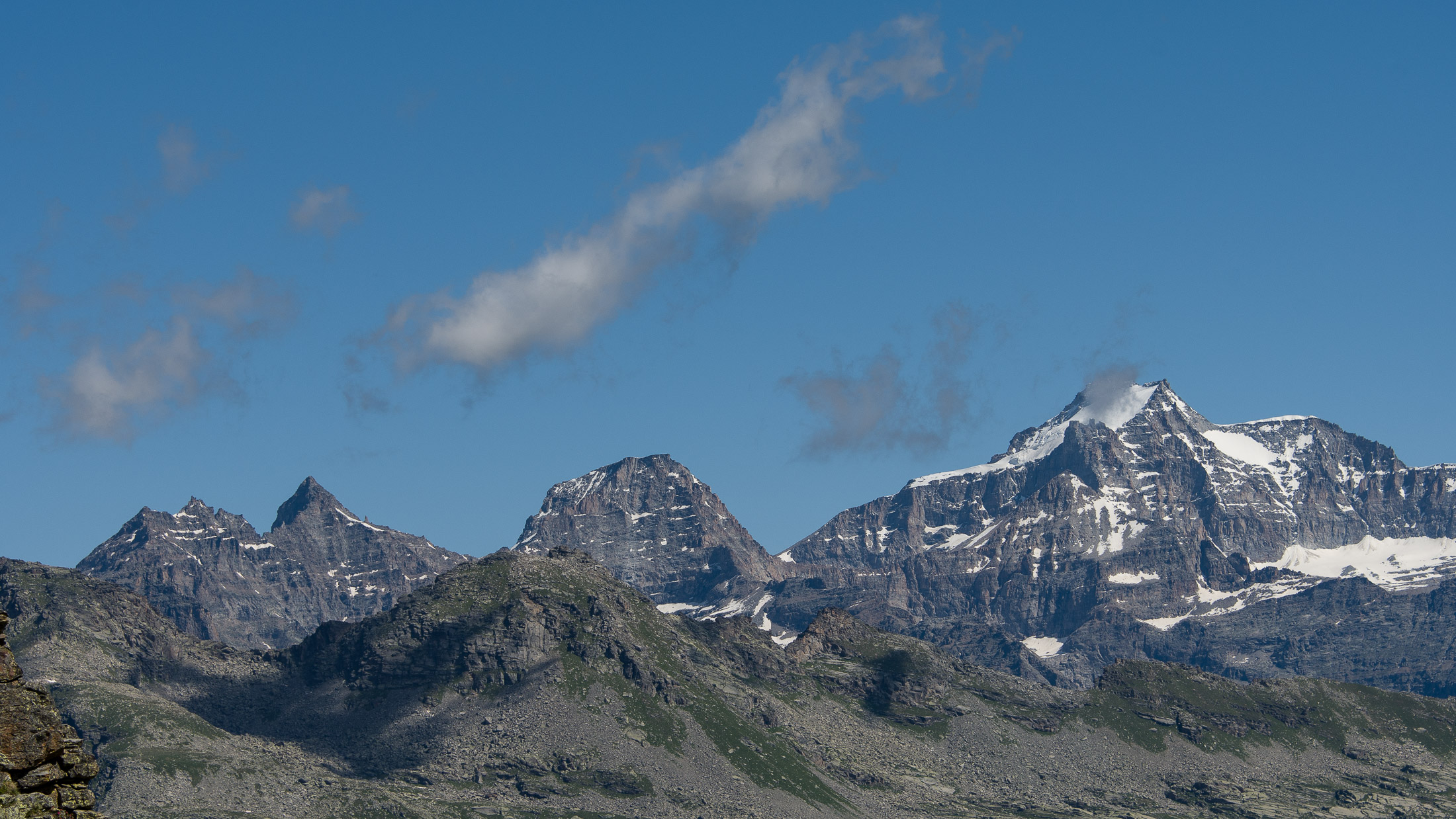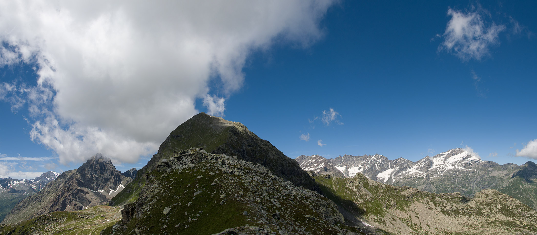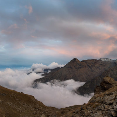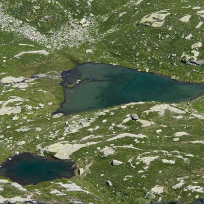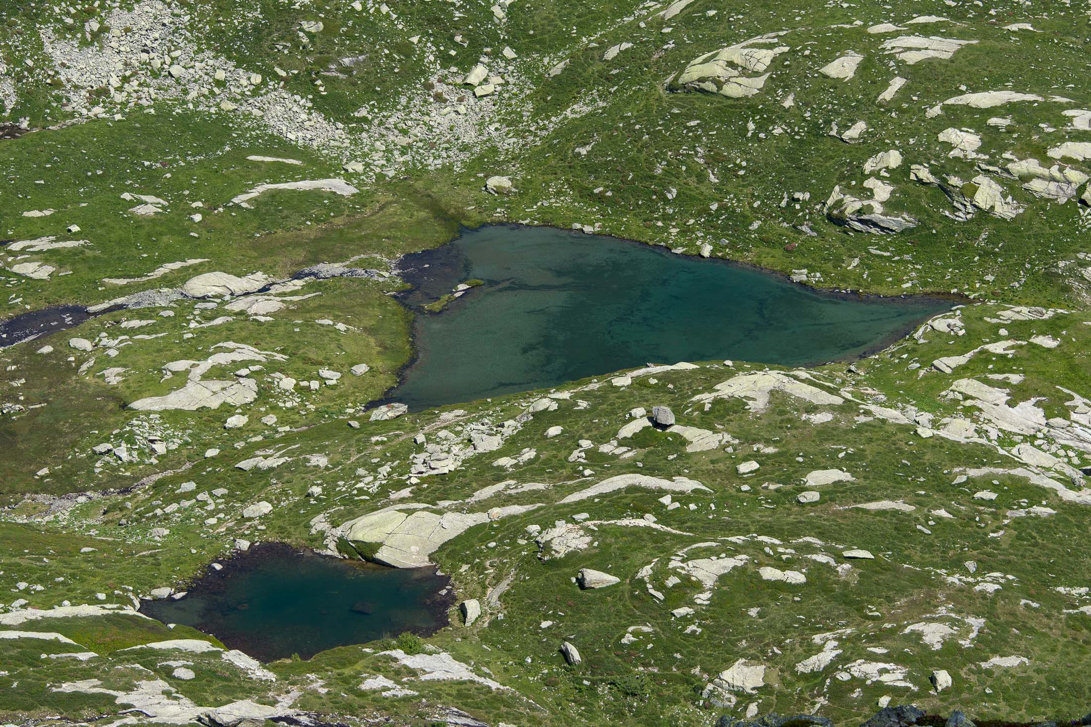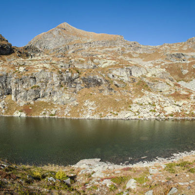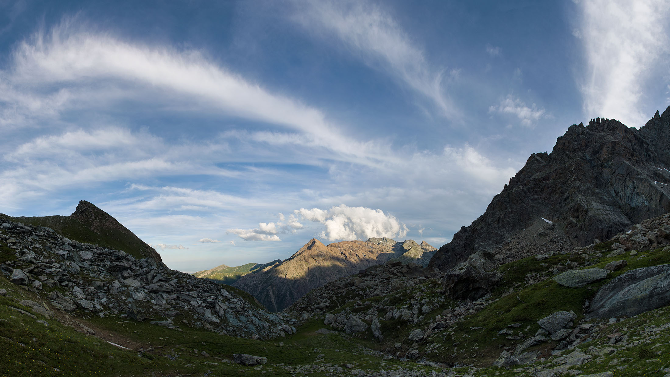 Bei schönem Wetter ist ein Sonnenaufgang am Bivacco Molino ein unvergessliches Erlebnis, ganz besonders im Herbst, wenn an manchen Tagen das Tal unter einer dichten Nebeldecke liegt. Von der Hütte steigt man mehr oder weniger weglos in einer Viertelstunde zum Sattel des Colletto della Pera Morta (2340 m). Von dort folgt man einem aussichtsreichen Höhenweg, dem sogenannten Sentiero Balcone des Val d‘Ala. Die undeutliche Pfadspur verliert sich hier und da im Gras, bei dem hier in Sommermonaten häufig vorkommenden Nebel sollten man aufpassen, dass man den Weg nicht verliert. Es geht kontinuierlich auf und ab, man kommt nur langsam voran, zwischendurch müssen einige kleinere Seitenbäche überquert werden. Für den etwa 3 km langen Wegabschnitt vergehen nahezu zwei Stunden, vermutlich auch, weil man immer wieder stehen bleibt, um die tolle Aussicht zu geniessen. Im weiteren Verlauf schlängelt sich der schmale Pfad ohne nennenswerte Höhenunterschiede um einen Bergrücken, dahinter geht es kurz bergab und man kommt zur schön gelegenen Alpe Pian del Lago (2225 m), die sich auf einer weitläufigen Hochfläche befindet. Hier trifft man auf den Weitwanderweg GTA (Grande Traversata delle Alpi), auf dem man in Kürze den in einer Talmulde liegende Lago Vasuero (2237 m) erreicht, ein malerischer Bergsee am Fuss der Cima Leitosa (2868 m). Der nun deutliche und gut markierte Weg führt in weiteren 45 Minuten zum Colle di Trione (2486 m), Wasserscheide zwischen dem Val d‘Ala und dem Val Grande di Lanzo. Ein malerisches Fleckchen, genau der richtige Ort zum Ausruhen, Innehalten und Geniessen, das Panorama ist eindrücklich, bei klarem Wetter zeigt sich im Norden das Gran Paradiso-Gruppe. Für eine noch umfassendere Aussicht lohnt ein kurzer Abstecher entlang des Grates bis zu einem kleinen Steinmann (ca. 2520 m).
