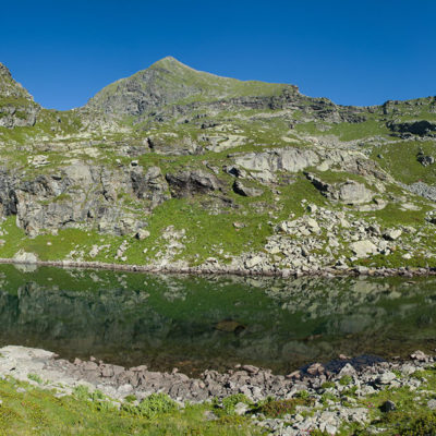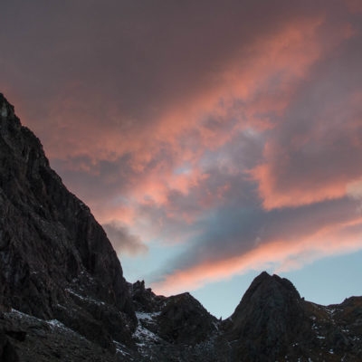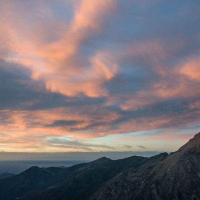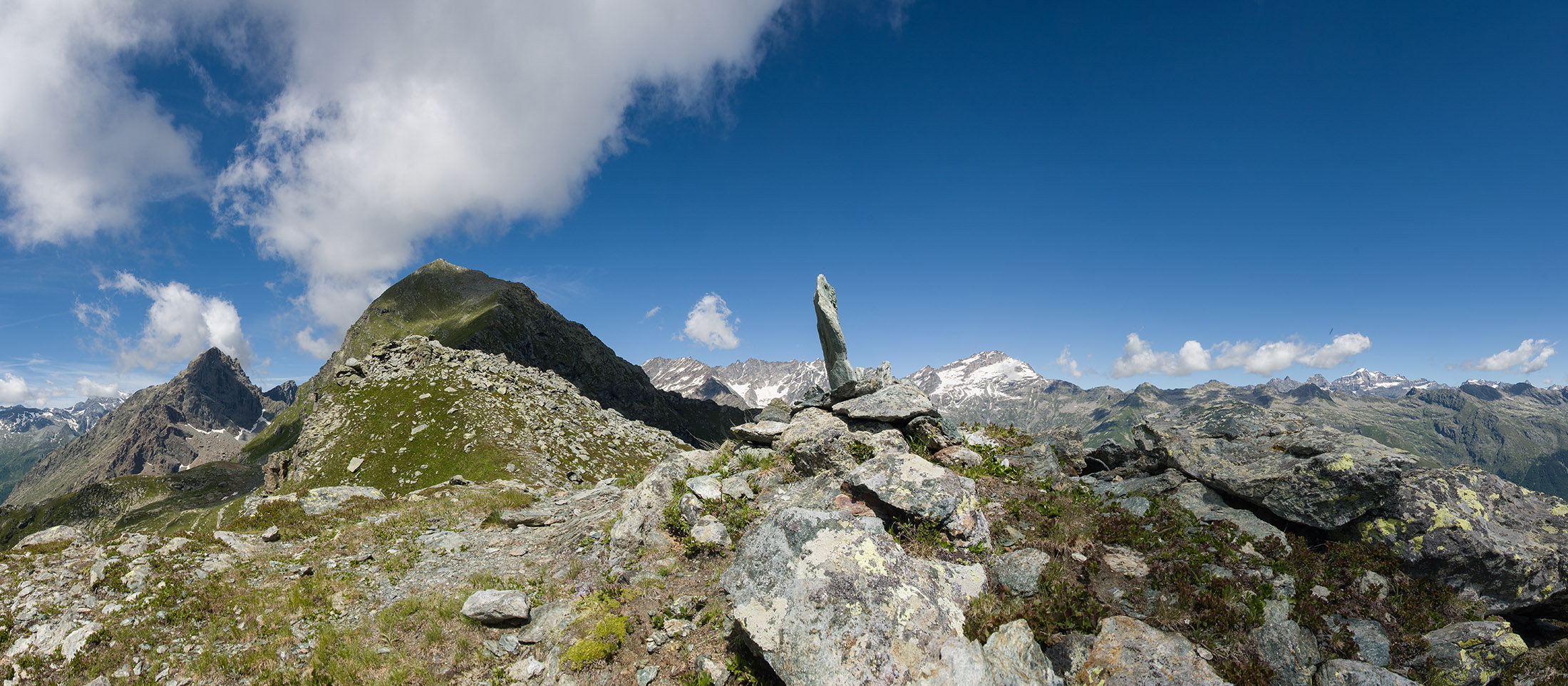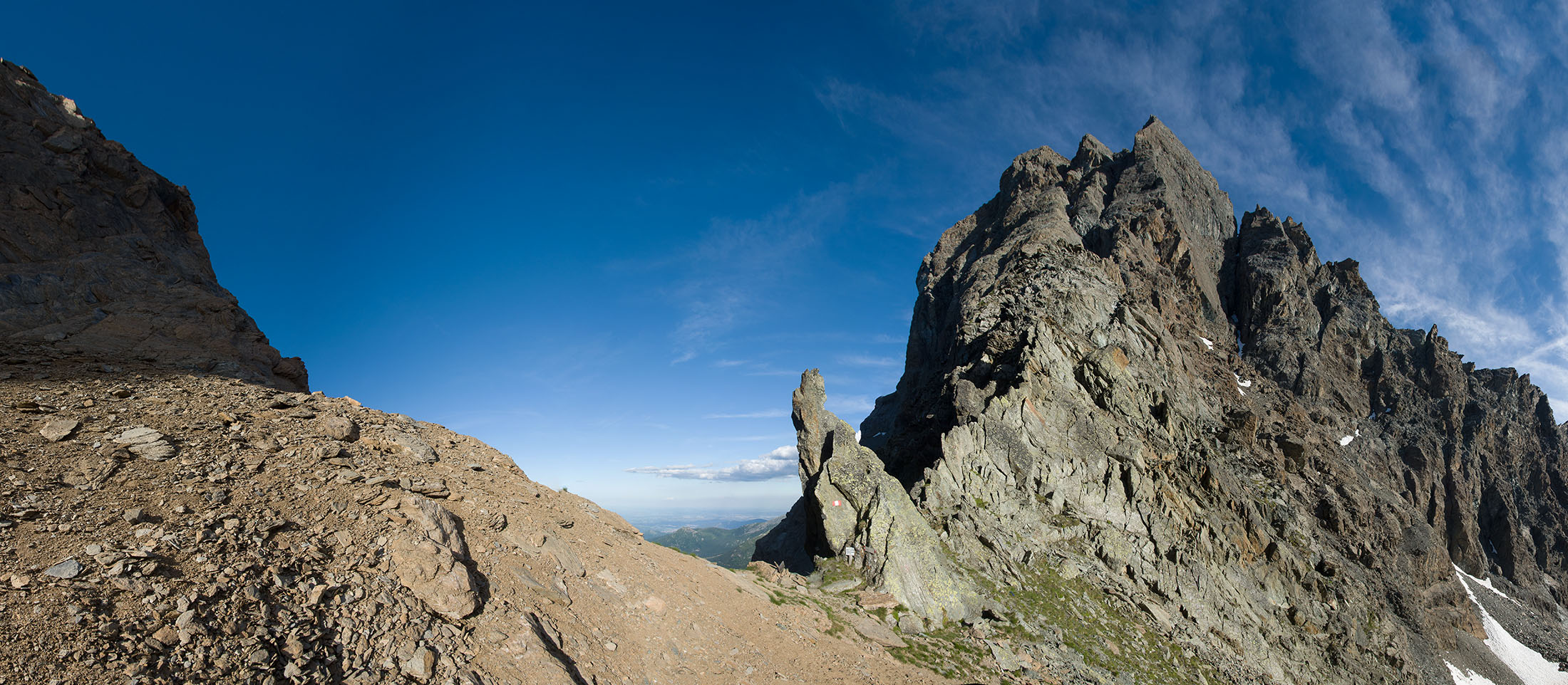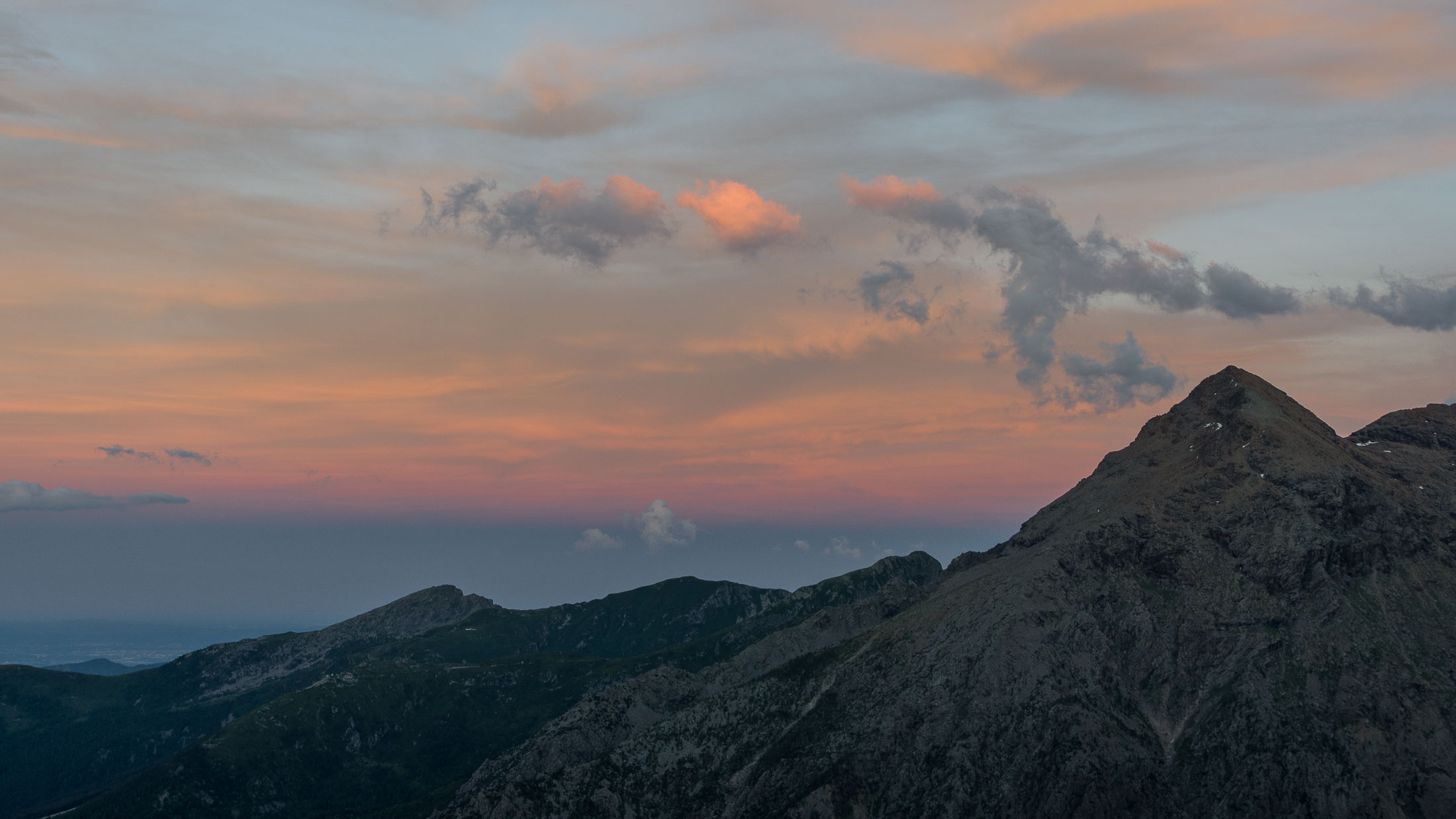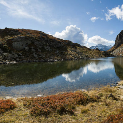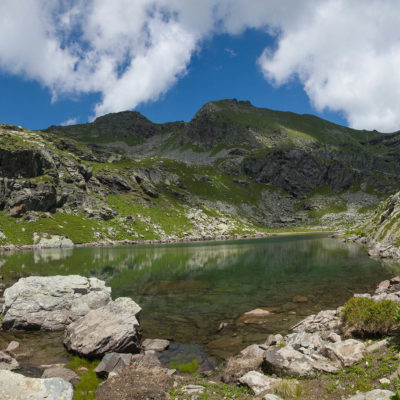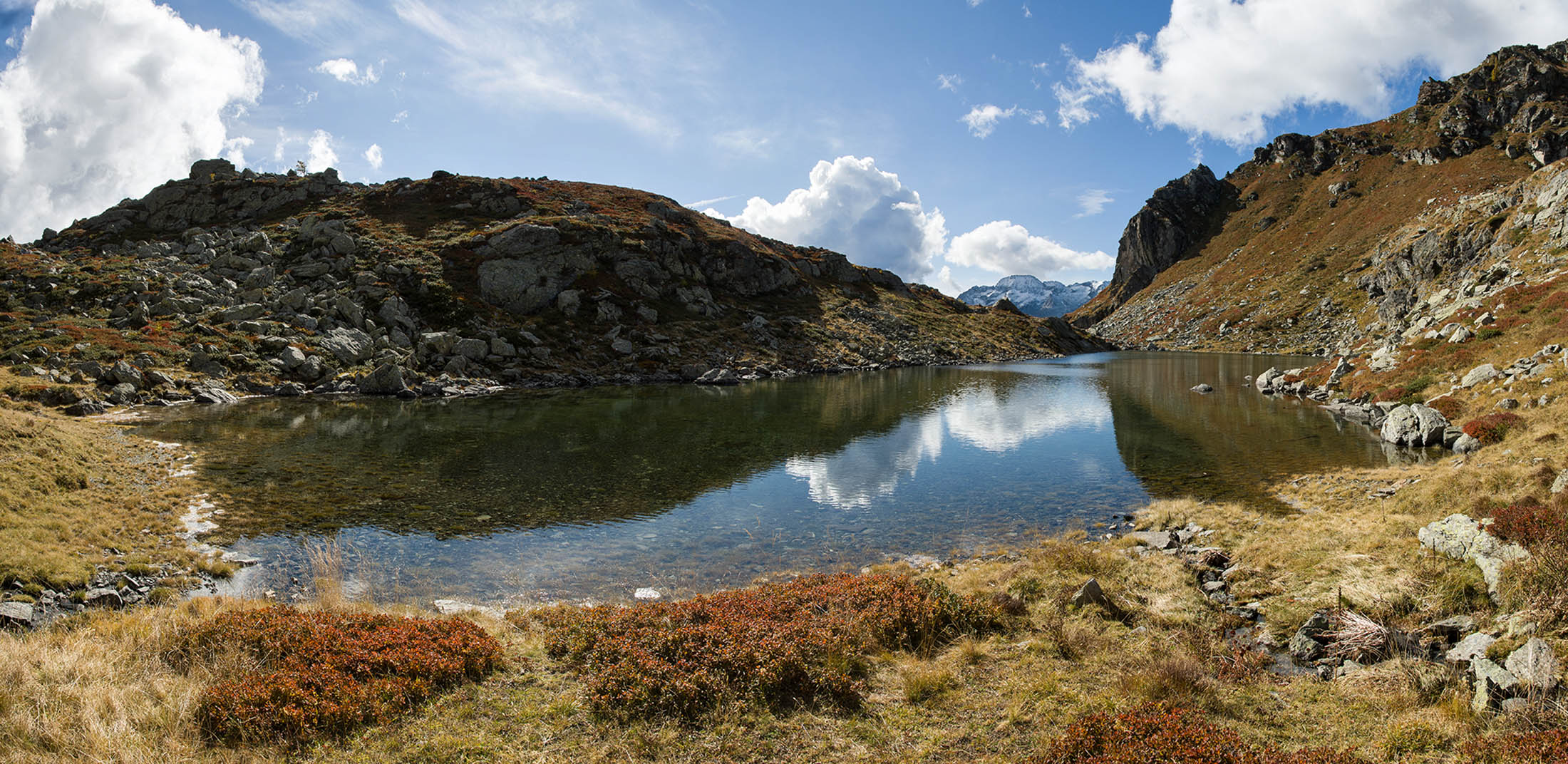 Bei schönem Wetter ist ein Sonnenaufgang am Bivacco Molino ein unvergessliches Erlebnis, ganz besonders im Herbst, wenn an manchen Tagen das Tal unter einer dichten Nebeldecke liegt. Von der Hütte steigt man mehr oder weniger weglos in einer Viertelstunde zum Sattel des Colletto della Pera Morta (2340 m). Von dort folgt man einem aussichtsreichen Höhenweg, dem sogenannten Sentiero Balcone des Val d‘Ala. Die undeutliche Pfadspur verliert sich hier und da im Gras, bei dem hier in Sommermonaten häufig vorkommenden Nebel sollten man aufpassen, dass man den Weg nicht verliert. Es geht kontinuierlich auf und ab, man kommt nur langsam voran, zwischendurch müssen einige kleinere Seitenbäche überquert werden. Für den etwa 3 km langen Wegabschnitt vergehen nahezu zwei Stunden, vermutlich auch, weil man immer wieder stehen bleibt, um die tolle Aussicht zu geniessen. Im weiteren Verlauf schlängelt sich der schmale Pfad ohne nennenswerte Höhenunterschiede um einen Bergrücken, dahinter geht es kurz bergab und man kommt zur schön gelegenen Alpe Pian del Lago (2225 m), die sich auf einer weitläufigen Hochfläche befindet. Hier trifft man auf den Weitwanderweg GTA (Grande Traversata delle Alpi), auf dem man in Kürze den in einer Talmulde liegende Lago Vasuero (2237 m) erreicht, ein malerischer Bergsee am Fuss der Cima Leitosa (2868 m). Der nun deutliche und gut markierte Weg führt in weiteren 45 Minuten zum Colle di Trione (2486 m), Wasserscheide zwischen dem Val d‘Ala und dem Val Grande di Lanzo. Ein malerisches Fleckchen, genau der richtige Ort zum Ausruhen, Innehalten und Geniessen, das Panorama ist eindrücklich, bei klarem Wetter zeigt sich im Norden das Gran Paradiso-Gruppe. Für eine noch umfassendere Aussicht lohnt ein kurzer Abstecher entlang des Grates bis zu einem kleinen Steinmann (ca. 2520 m).