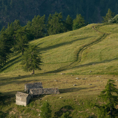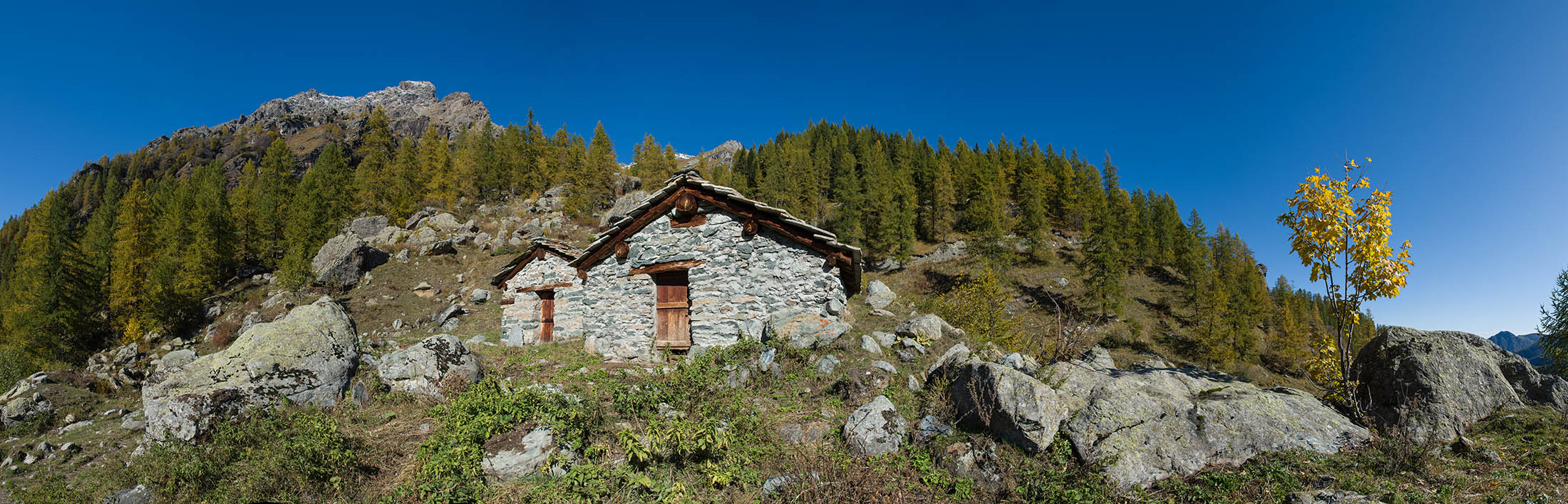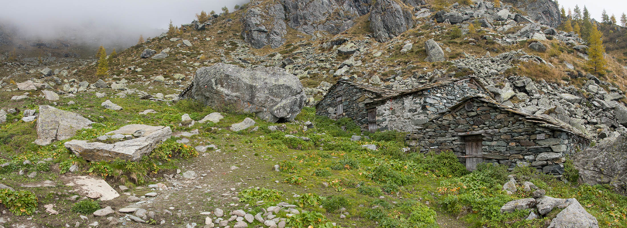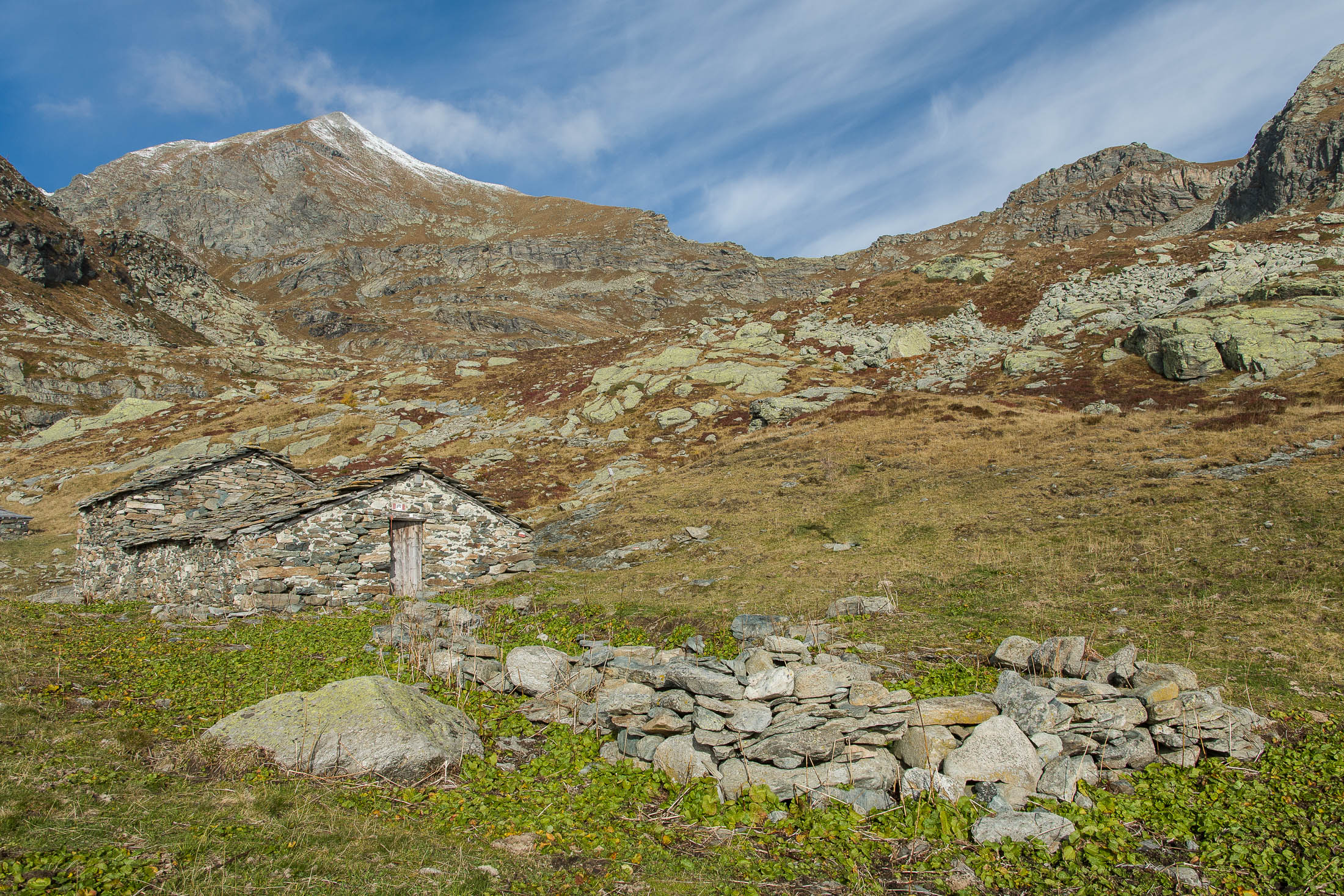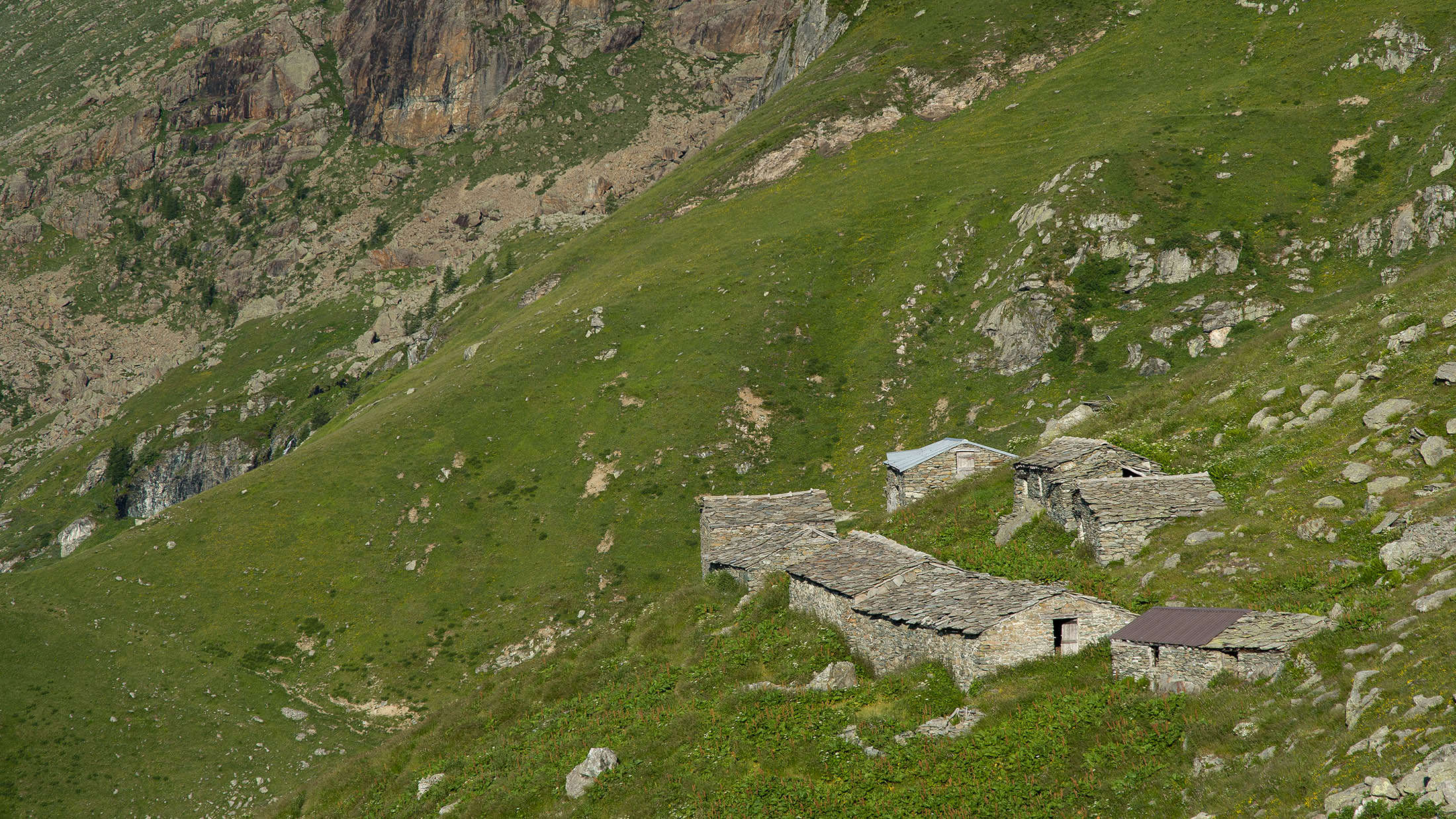 Vom Lago Vasuero geht es zunächst zurück zur Alpe Pian del Lago (2225 m). Im weiteren Verlauf folgt man einem panoramareichen Höhenweg, dem sogenannten Sentiero Balcone des Val d‘Ala. Die anfangs spärliche Pfadspur führt sanft fallend zu den Alphütten von Arp d‘Padrucc (2188 m), wo im Sommer noch Tiere hinaufgetrieben werden. Die Marschrichtung lautet nun bergab, von Alp zu Alp. Vorbei an den Überresten der Alpe Malzè (2100 m), von dort wenige Höhenmeter abwärts zur Alpe Pian Comune (2060 m), auch hier trifft man nur noch auf Ruinen und verbuschendes Weideland. Nach einem kurzen Abstieg erreicht man eine weitere Verebnungsfläche mit den Hütten der Alpe Ciavanis (1880 m). Auch hier weiden seit geraumer Zeit keine Kühe und Rinder mehr, die Alpgebäude haben schon bessere Zeiten gesehen, die Umgebung der Hütten ist von Ampfer und Gestrüpp überwuchert. Über einen lärchengesäumten Rücken geht es hinab zur Alpe Prato di sopra (1745 m), in manchen Karten auch Prà d‘Souri genannt. Die Alp ist in den Sommermonaten bestossen, Hundegebell, Kuhgebimmel und eine energische Hirtin, die nicht immer freundlich daherkommt. Trotzdem ein beschauliches Fleckchen mit schönem Panorama. Nur wenige Meter unterhalb der beiden Alpgebäude verlässt man den markierten Weg, über grasige Matten geht es Richtung Westen zu den bereits sichtbaren Hütten von Vertea (1742 m), wo man wieder auf Markierungen stösst. Von dort durch lauschigen Lärchenwald weiter abwärts bis zur grossen Alphochfläche von Laietto (1527 m). Die ehemalige Temporärsiedlung (auch Sommersiedlung oder Maiensäß genannt) befindet sich am Rand einer weiten und aussichtsreichen Alphochfläche. Die wenigen Häuser und Ställe liegen in Ruinen, die kleine Kirchenkapelle ist das einzige noch intakte Gebäude. Scheinbar eine friedliche Idylle mit dem Charme des Vergänglichen. Oder ein trauriger gottverlassener Ort? Vielleicht von beidem etwas. Nichts desto trotz kann man hier stundenlang verweilen und sich treiben lassen. Der verbleibende Abstieg bis Martassina ist gemütliches Auslaufen auf einem grasigen Alpsträsschen.