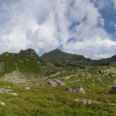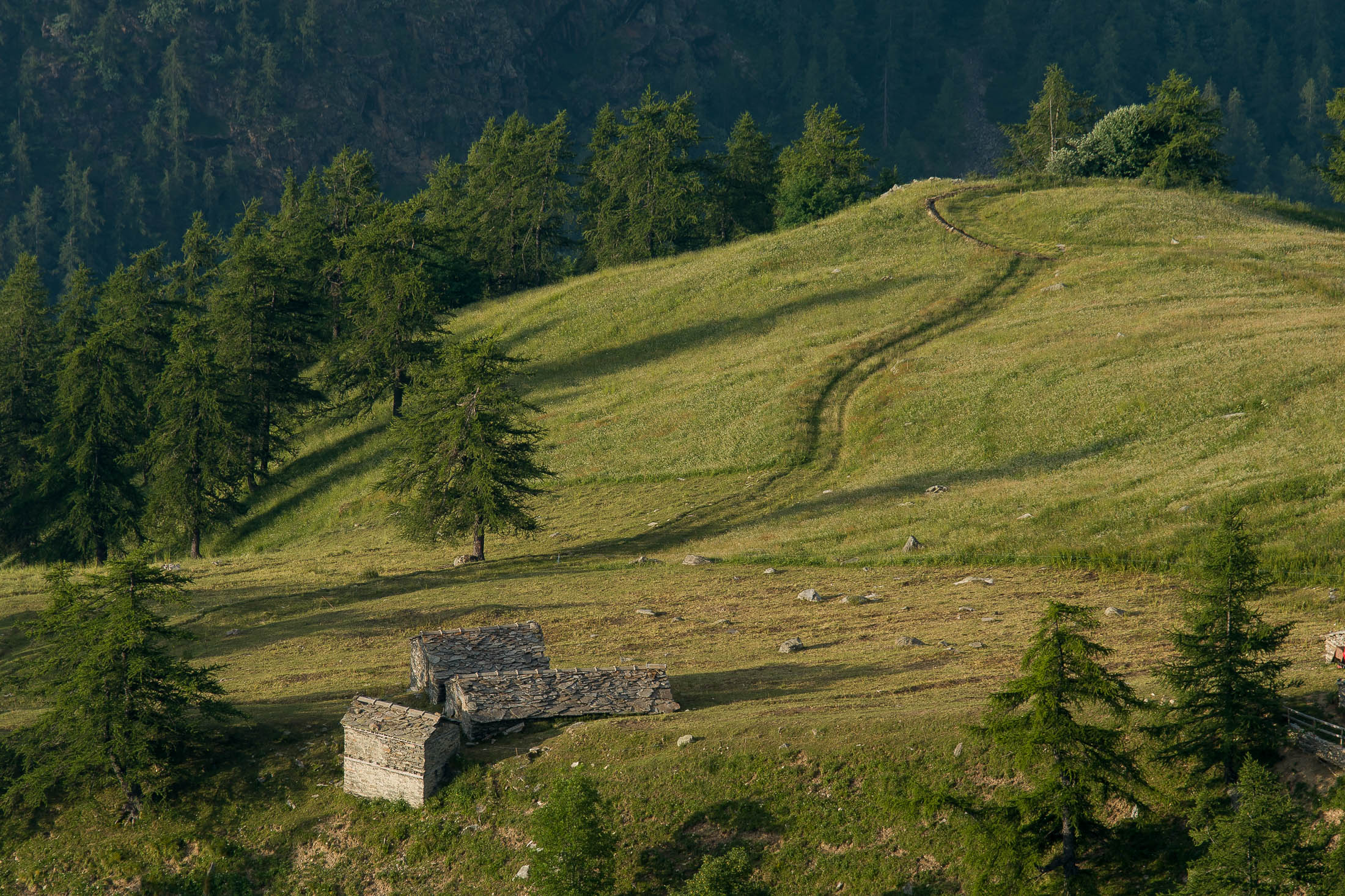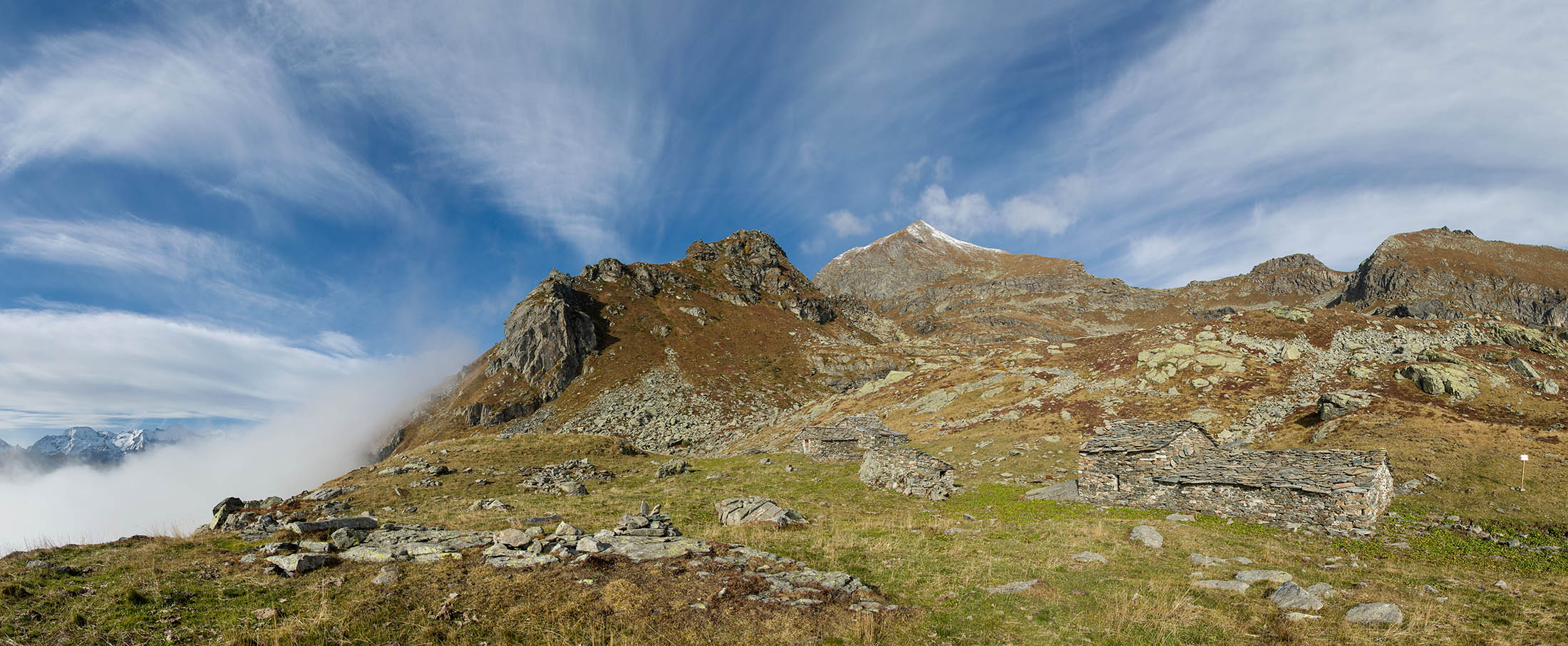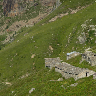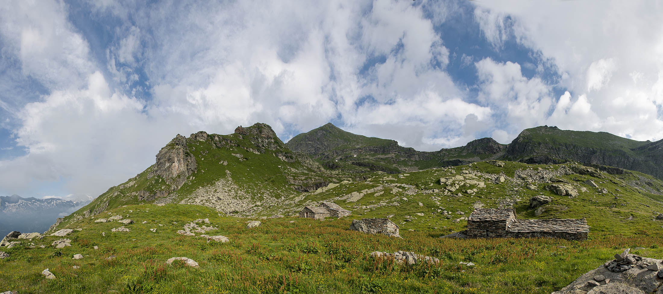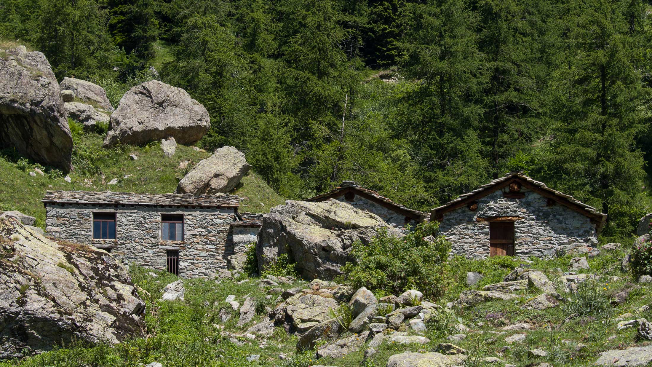 Vom Lago Vasuero geht es zunächst zurück zur Alpe Pian del Lago (2225 m). Im weiteren Verlauf folgt man einem panoramareichen Höhenweg, dem sogenannten Sentiero Balcone des Val d‘Ala. Die anfangs spärliche Pfadspur führt sanft fallend zu den Alphütten von Arp d‘Padrucc (2188 m), wo im Sommer noch Tiere hinaufgetrieben werden. Die Marschrichtung lautet nun bergab, von Alp zu Alp. Vorbei an den Überresten der Alpe Malzè (2100 m), von dort wenige Höhenmeter abwärts zur Alpe Pian Comune (2060 m), auch hier trifft man nur noch auf Ruinen und verbuschendes Weideland. Nach einem kurzen Abstieg erreicht man eine weitere Verebnungsfläche mit den Hütten der Alpe Ciavanis (1880 m). Auch hier weiden seit geraumer Zeit keine Kühe und Rinder mehr, die Alpgebäude haben schon bessere Zeiten gesehen, die Umgebung der Hütten ist von Ampfer und Gestrüpp überwuchert. Über einen lärchengesäumten Rücken geht es hinab zur Alpe Prato di sopra (1745 m), in manchen Karten auch Prà d‘Souri genannt. Die Alp ist in den Sommermonaten bestossen, Hundegebell, Kuhgebimmel und eine energische Hirtin, die nicht immer freundlich daherkommt. Trotzdem ein beschauliches Fleckchen mit schönem Panorama. Nur wenige Meter unterhalb der beiden Alpgebäude verlässt man den markierten Weg, über grasige Matten geht es Richtung Westen zu den bereits sichtbaren Hütten von Vertea (1742 m), wo man wieder auf Markierungen stösst. Von dort durch lauschigen Lärchenwald weiter abwärts bis zur grossen Alphochfläche von Laietto (1527 m). Die ehemalige Temporärsiedlung (auch Sommersiedlung oder Maiensäß genannt) befindet sich am Rand einer weiten und aussichtsreichen Alphochfläche. Die wenigen Häuser und Ställe liegen in Ruinen, die kleine Kirchenkapelle ist das einzige noch intakte Gebäude. Scheinbar eine friedliche Idylle mit dem Charme des Vergänglichen. Oder ein trauriger gottverlassener Ort? Vielleicht von beidem etwas. Nichts desto trotz kann man hier stundenlang verweilen und sich treiben lassen. Der verbleibende Abstieg bis Martassina ist gemütliches Auslaufen auf einem grasigen Alpsträsschen.
