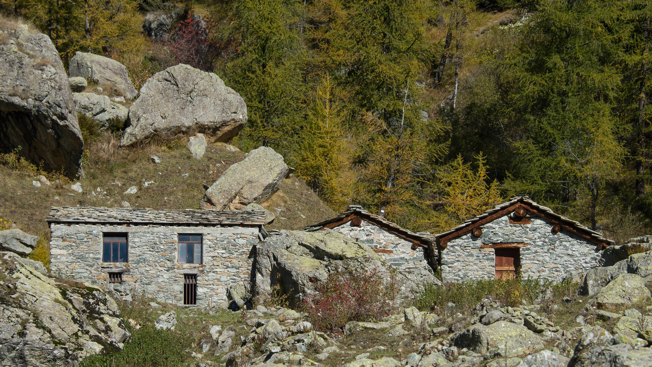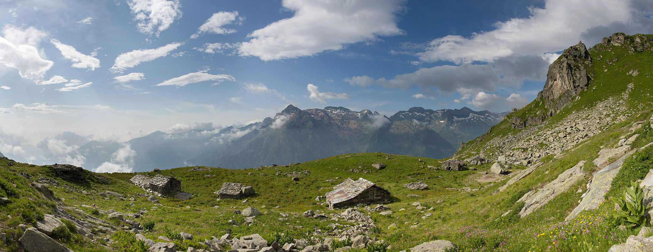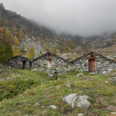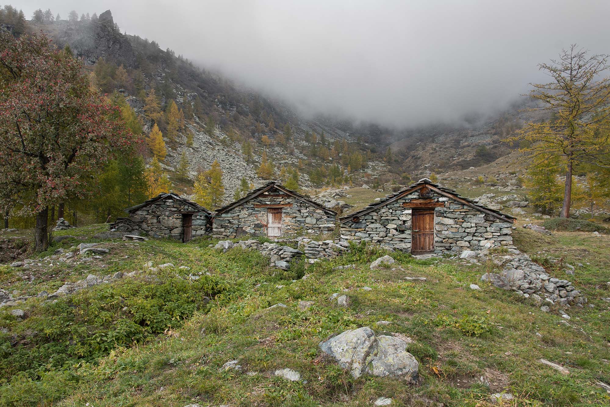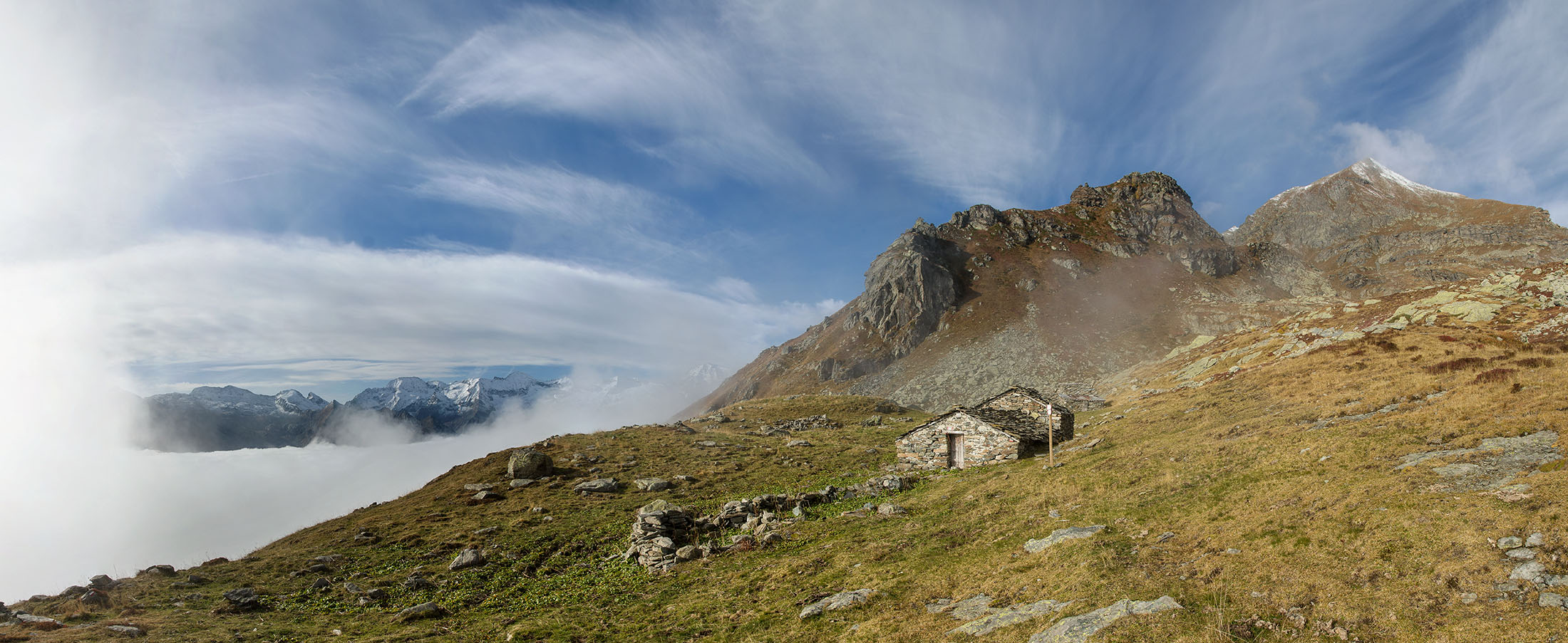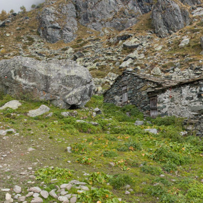 Vom Lago Vasuero geht es zunächst zurück zur Alpe Pian del Lago (2225 m). Im weiteren Verlauf folgt man einem panoramareichen Höhenweg, dem sogenannten Sentiero Balcone des Val d‘Ala. Die anfangs spärliche Pfadspur führt sanft fallend zu den Alphütten von Arp d‘Padrucc (2188 m), wo im Sommer noch Tiere hinaufgetrieben werden. Die Marschrichtung lautet nun bergab, von Alp zu Alp. Vorbei an den Überresten der Alpe Malzè (2100 m), von dort wenige Höhenmeter abwärts zur Alpe Pian Comune (2060 m), auch hier trifft man nur noch auf Ruinen und verbuschendes Weideland. Nach einem kurzen Abstieg erreicht man eine weitere Verebnungsfläche mit den Hütten der Alpe Ciavanis (1880 m). Auch hier weiden seit geraumer Zeit keine Kühe und Rinder mehr, die Alpgebäude haben schon bessere Zeiten gesehen, die Umgebung der Hütten ist von Ampfer und Gestrüpp überwuchert. Über einen lärchengesäumten Rücken geht es hinab zur Alpe Prato di sopra (1745 m), in manchen Karten auch Prà d‘Souri genannt. Die Alp ist in den Sommermonaten bestossen, Hundegebell, Kuhgebimmel und eine energische Hirtin, die nicht immer freundlich daherkommt. Trotzdem ein beschauliches Fleckchen mit schönem Panorama. Nur wenige Meter unterhalb der beiden Alpgebäude verlässt man den markierten Weg, über grasige Matten geht es Richtung Westen zu den bereits sichtbaren Hütten von Vertea (1742 m), wo man wieder auf Markierungen stösst. Von dort durch lauschigen Lärchenwald weiter abwärts bis zur grossen Alphochfläche von Laietto (1527 m). Die ehemalige Temporärsiedlung (auch Sommersiedlung oder Maiensäß genannt) befindet sich am Rand einer weiten und aussichtsreichen Alphochfläche. Die wenigen Häuser und Ställe liegen in Ruinen, die kleine Kirchenkapelle ist das einzige noch intakte Gebäude. Scheinbar eine friedliche Idylle mit dem Charme des Vergänglichen. Oder ein trauriger gottverlassener Ort? Vielleicht von beidem etwas. Nichts desto trotz kann man hier stundenlang verweilen und sich treiben lassen. Der verbleibende Abstieg bis Martassina ist gemütliches Auslaufen auf einem grasigen Alpsträsschen.