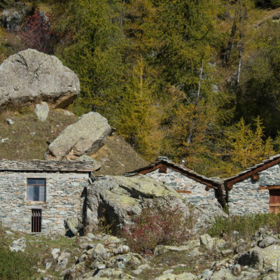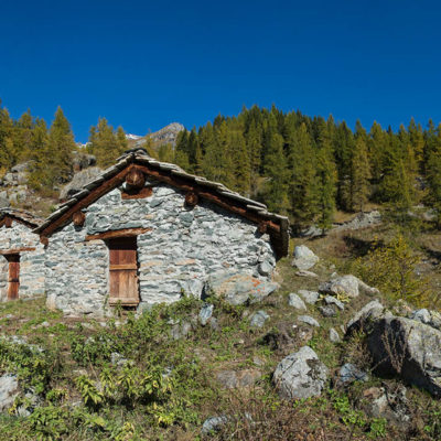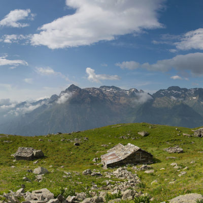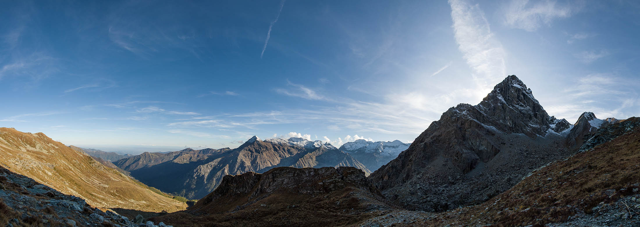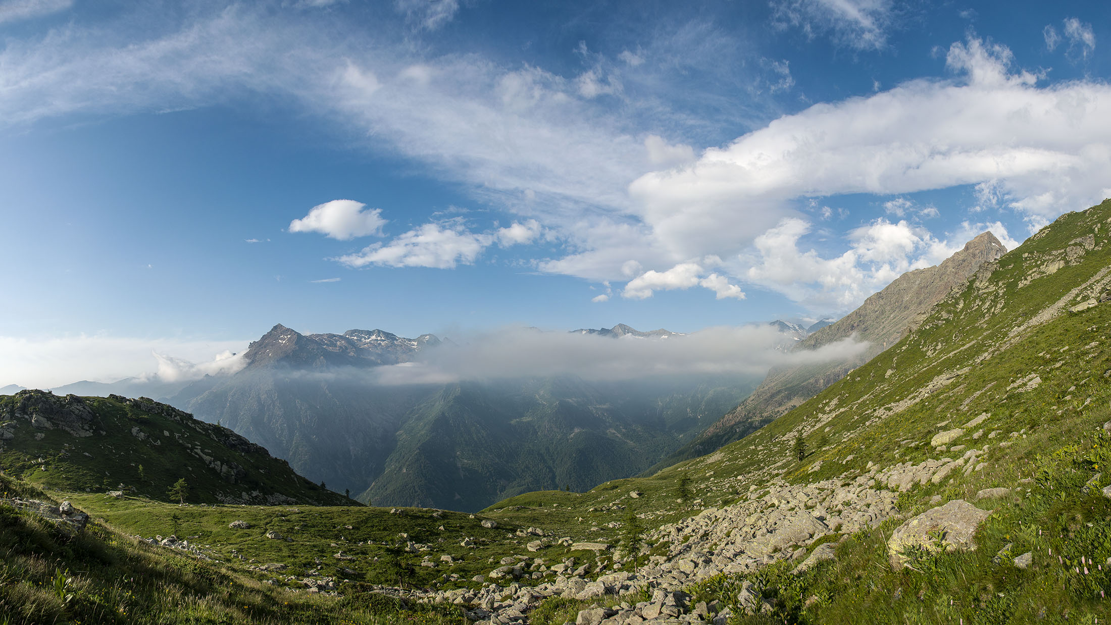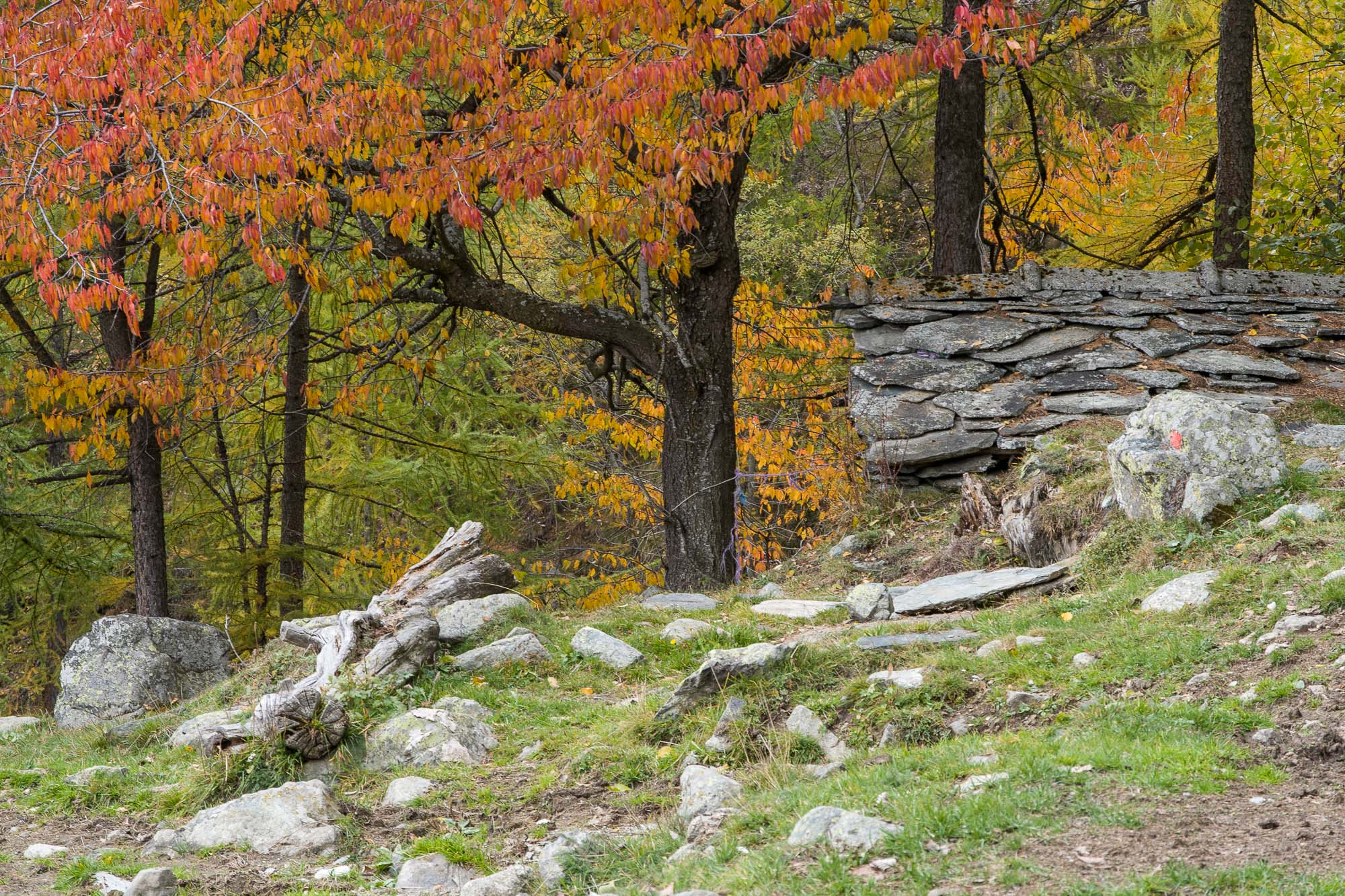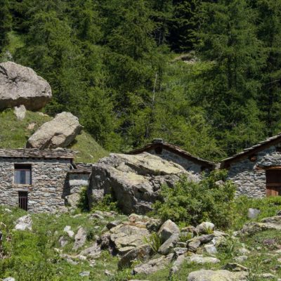 Vom Lago Vasuero geht es zunächst zurück zur Alpe Pian del Lago (2225 m). Im weiteren Verlauf folgt man einem panoramareichen Höhenweg, dem sogenannten Sentiero Balcone des Val d‘Ala. Die anfangs spärliche Pfadspur führt sanft fallend zu den Alphütten von Arp d‘Padrucc (2188 m), wo im Sommer noch Tiere hinaufgetrieben werden. Die Marschrichtung lautet nun bergab, von Alp zu Alp. Vorbei an den Überresten der Alpe Malzè (2100 m), von dort wenige Höhenmeter abwärts zur Alpe Pian Comune (2060 m), auch hier trifft man nur noch auf Ruinen und verbuschendes Weideland. Nach einem kurzen Abstieg erreicht man eine weitere Verebnungsfläche mit den Hütten der Alpe Ciavanis (1880 m). Auch hier weiden seit geraumer Zeit keine Kühe und Rinder mehr, die Alpgebäude haben schon bessere Zeiten gesehen, die Umgebung der Hütten ist von Ampfer und Gestrüpp überwuchert. Über einen lärchengesäumten Rücken geht es hinab zur Alpe Prato di sopra (1745 m), in manchen Karten auch Prà d‘Souri genannt. Die Alp ist in den Sommermonaten bestossen, Hundegebell, Kuhgebimmel und eine energische Hirtin, die nicht immer freundlich daherkommt. Trotzdem ein beschauliches Fleckchen mit schönem Panorama. Nur wenige Meter unterhalb der beiden Alpgebäude verlässt man den markierten Weg, über grasige Matten geht es Richtung Westen zu den bereits sichtbaren Hütten von Vertea (1742 m), wo man wieder auf Markierungen stösst. Von dort durch lauschigen Lärchenwald weiter abwärts bis zur grossen Alphochfläche von Laietto (1527 m). Die ehemalige Temporärsiedlung (auch Sommersiedlung oder Maiensäß genannt) befindet sich am Rand einer weiten und aussichtsreichen Alphochfläche. Die wenigen Häuser und Ställe liegen in Ruinen, die kleine Kirchenkapelle ist das einzige noch intakte Gebäude. Scheinbar eine friedliche Idylle mit dem Charme des Vergänglichen. Oder ein trauriger gottverlassener Ort? Vielleicht von beidem etwas. Nichts desto trotz kann man hier stundenlang verweilen und sich treiben lassen. Der verbleibende Abstieg bis Martassina ist gemütliches Auslaufen auf einem grasigen Alpsträsschen.