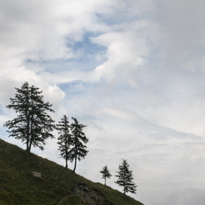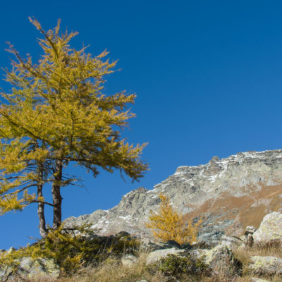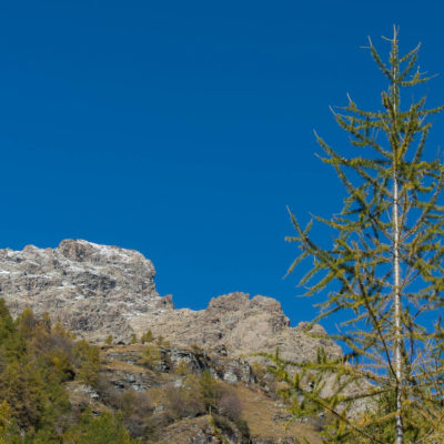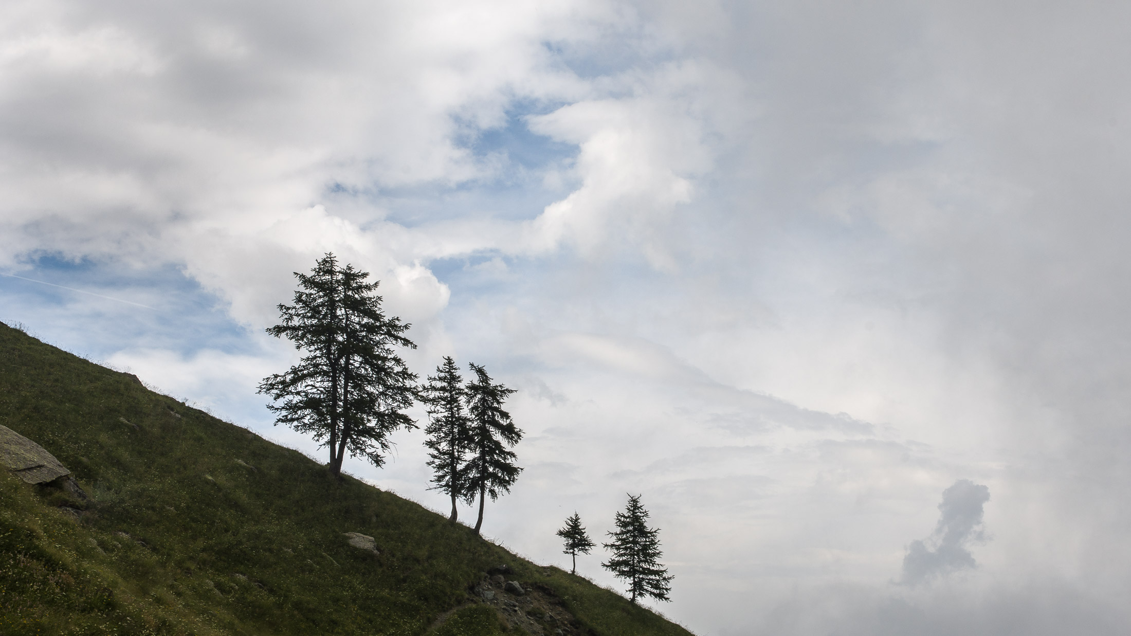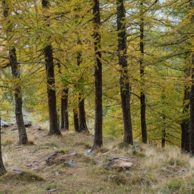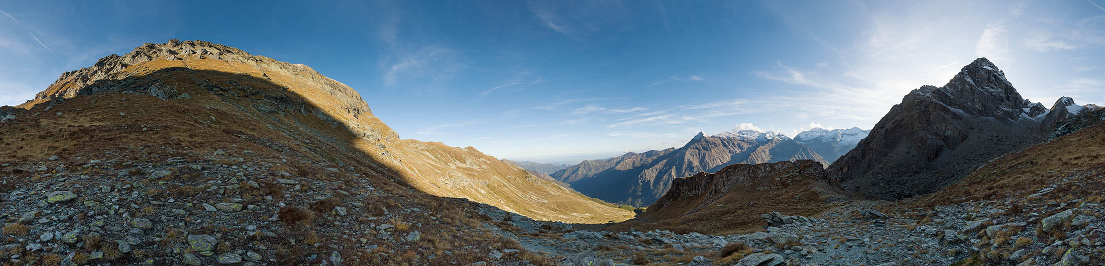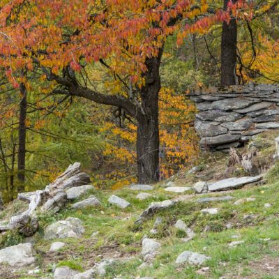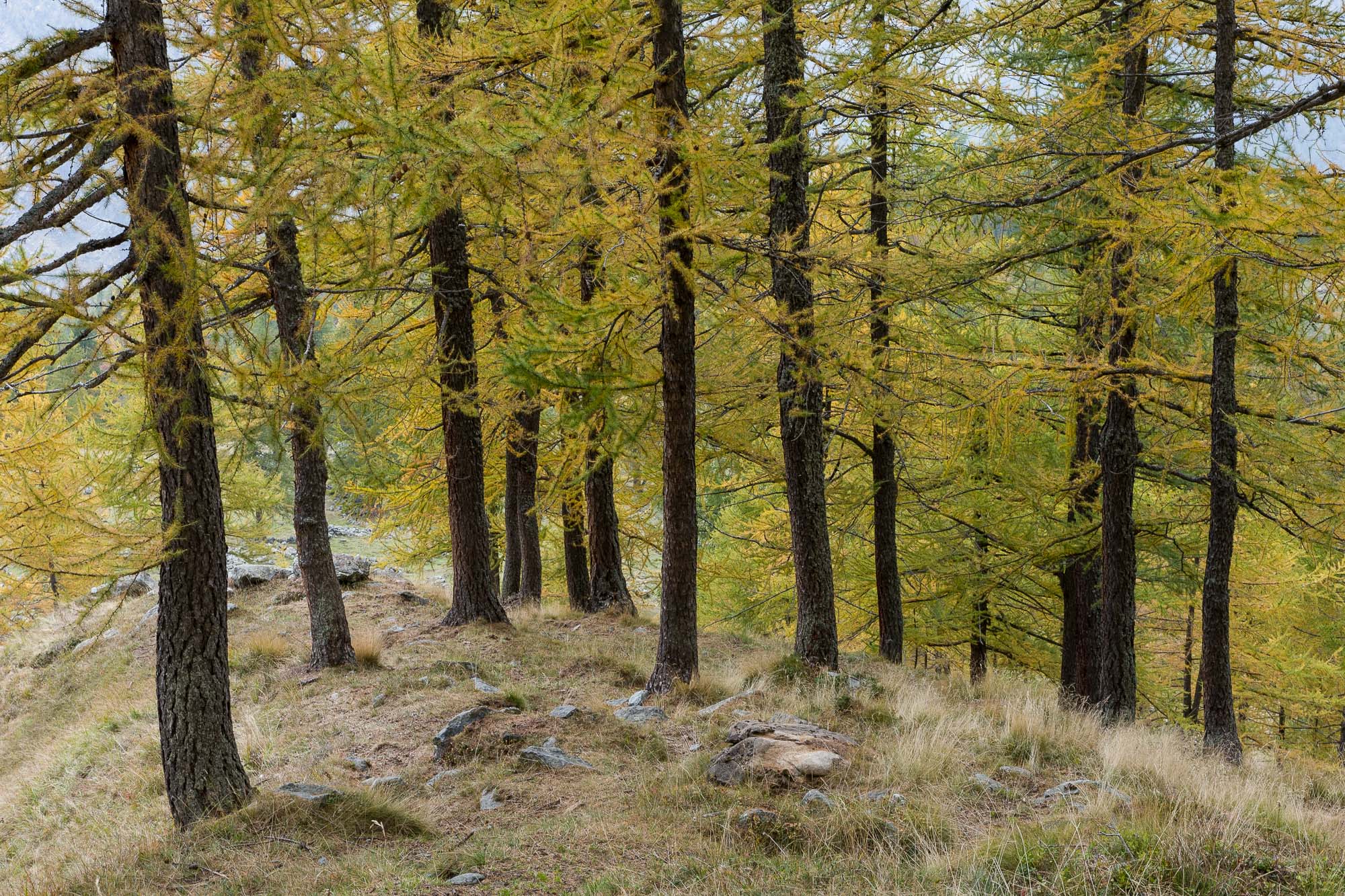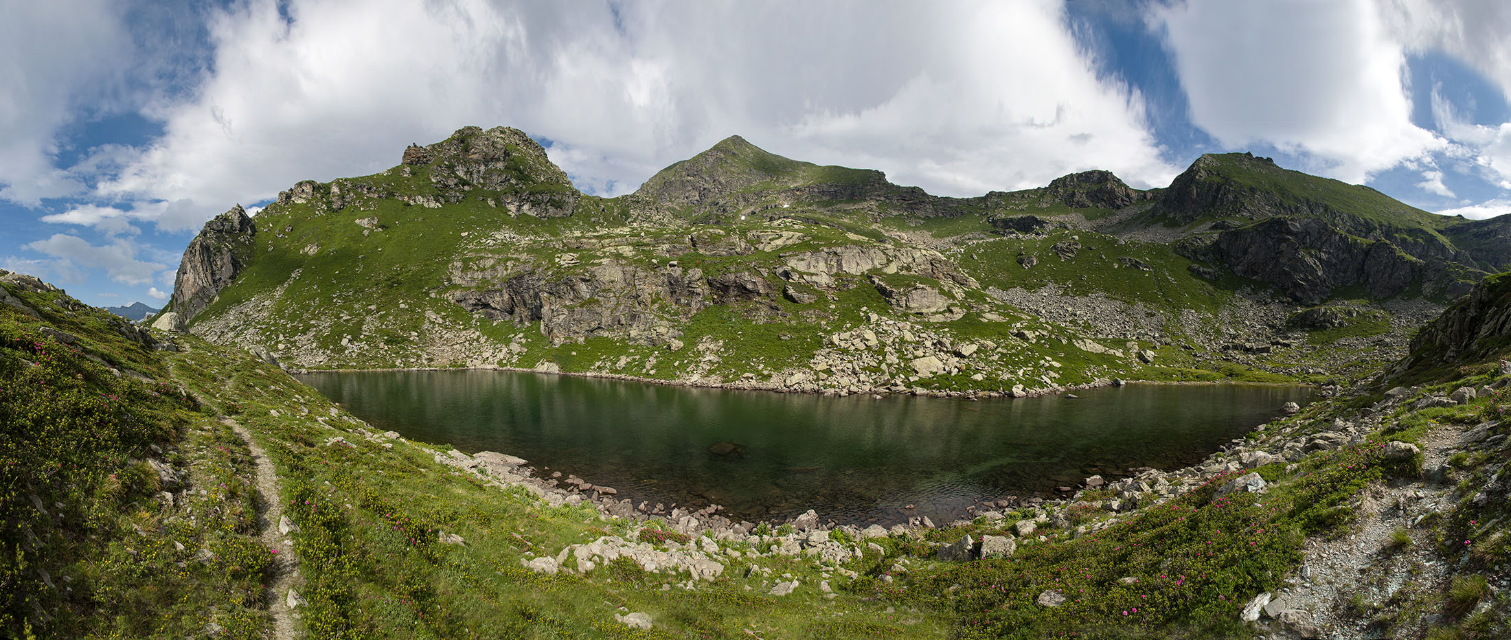 Vom Lago Vasuero geht es zunächst zurück zur Alpe Pian del Lago (2225 m). Im weiteren Verlauf folgt man einem panoramareichen Höhenweg, dem sogenannten Sentiero Balcone des Val d‘Ala. Die anfangs spärliche Pfadspur führt sanft fallend zu den Alphütten von Arp d‘Padrucc (2188 m), wo im Sommer noch Tiere hinaufgetrieben werden. Die Marschrichtung lautet nun bergab, von Alp zu Alp. Vorbei an den Überresten der Alpe Malzè (2100 m), von dort wenige Höhenmeter abwärts zur Alpe Pian Comune (2060 m), auch hier trifft man nur noch auf Ruinen und verbuschendes Weideland. Nach einem kurzen Abstieg erreicht man eine weitere Verebnungsfläche mit den Hütten der Alpe Ciavanis (1880 m). Auch hier weiden seit geraumer Zeit keine Kühe und Rinder mehr, die Alpgebäude haben schon bessere Zeiten gesehen, die Umgebung der Hütten ist von Ampfer und Gestrüpp überwuchert. Über einen lärchengesäumten Rücken geht es hinab zur Alpe Prato di sopra (1745 m), in manchen Karten auch Prà d‘Souri genannt. Die Alp ist in den Sommermonaten bestossen, Hundegebell, Kuhgebimmel und eine energische Hirtin, die nicht immer freundlich daherkommt. Trotzdem ein beschauliches Fleckchen mit schönem Panorama. Nur wenige Meter unterhalb der beiden Alpgebäude verlässt man den markierten Weg, über grasige Matten geht es Richtung Westen zu den bereits sichtbaren Hütten von Vertea (1742 m), wo man wieder auf Markierungen stösst. Von dort durch lauschigen Lärchenwald weiter abwärts bis zur grossen Alphochfläche von Laietto (1527 m). Die ehemalige Temporärsiedlung (auch Sommersiedlung oder Maiensäß genannt) befindet sich am Rand einer weiten und aussichtsreichen Alphochfläche. Die wenigen Häuser und Ställe liegen in Ruinen, die kleine Kirchenkapelle ist das einzige noch intakte Gebäude. Scheinbar eine friedliche Idylle mit dem Charme des Vergänglichen. Oder ein trauriger gottverlassener Ort? Vielleicht von beidem etwas. Nichts desto trotz kann man hier stundenlang verweilen und sich treiben lassen. Der verbleibende Abstieg bis Martassina ist gemütliches Auslaufen auf einem grasigen Alpsträsschen.