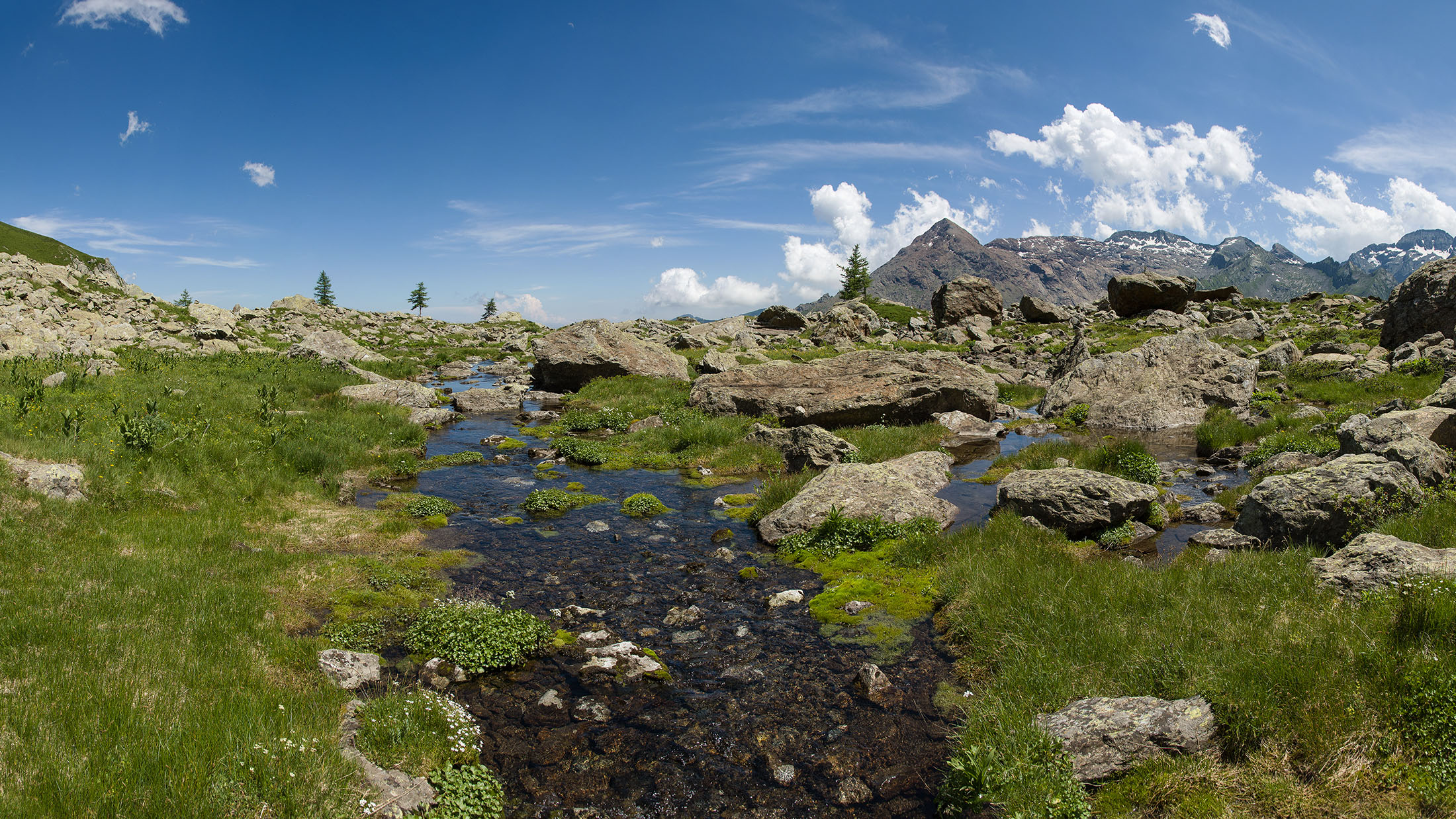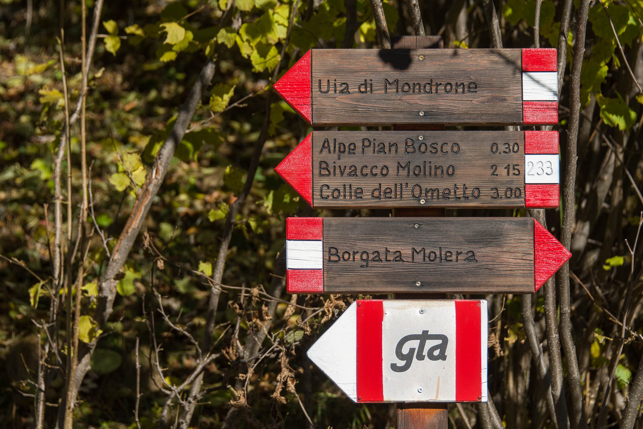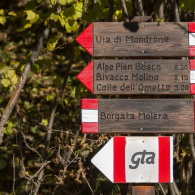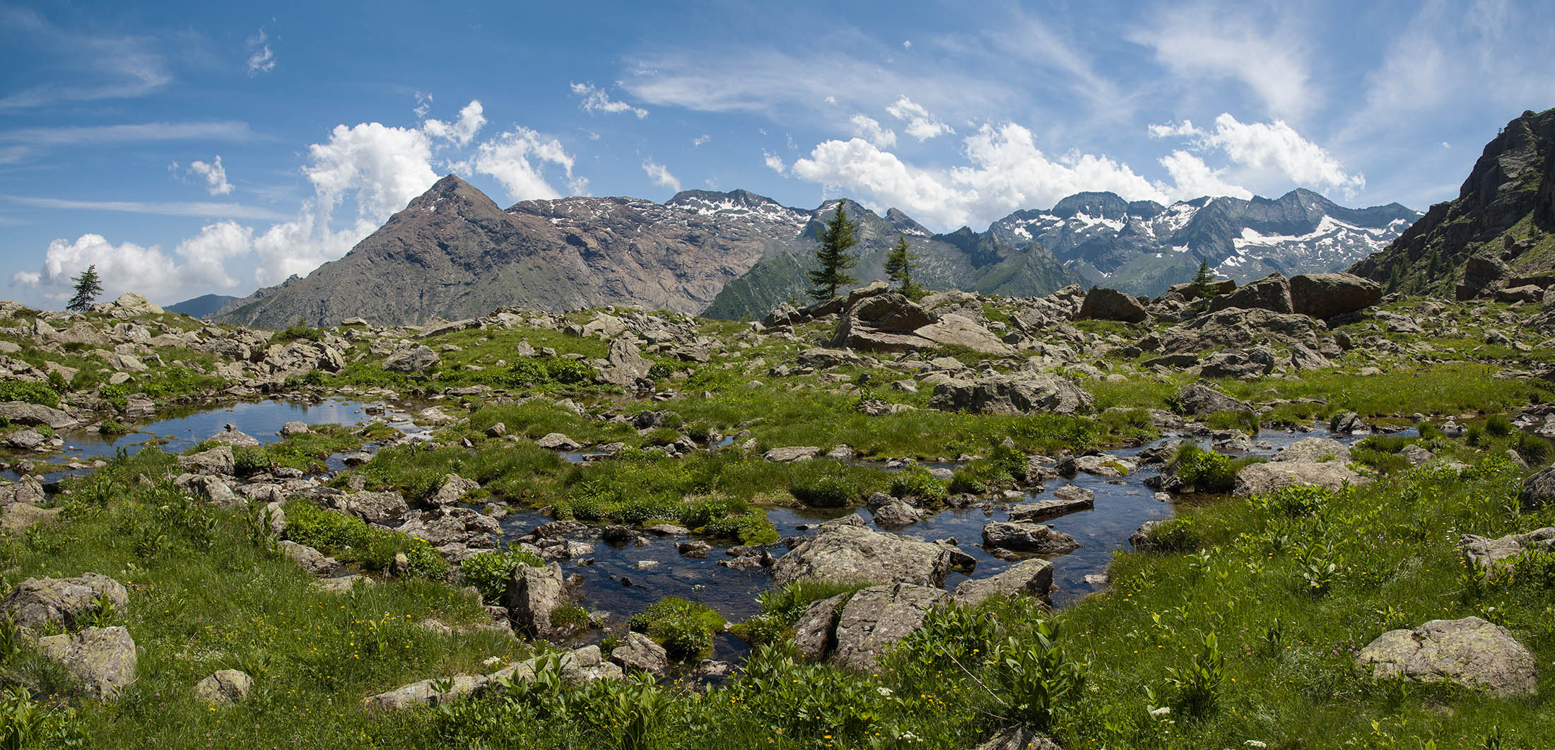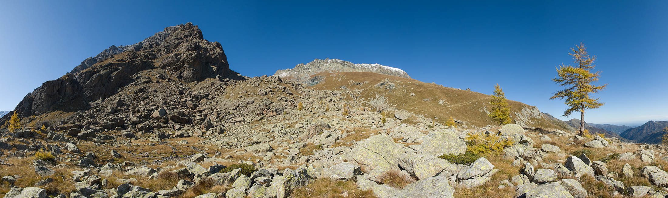 Die Wanderung beginnt bei dem kleinen Weiler Molera (1458 m), ein abgelegener Ortsteil von Balme, der heute in den Wintermonaten nicht mehr bewohnt ist. Einige der Häuser werden noch instandgehalten und als Wochenend- oder Feriendomizil genutzt. Zunächst geht es auf der geteerten Fahrstrasse ca. 50 Meter abwärts, dann nimmt man den breiten grasigen Weg, der rechts abzweigt. Nach wenigen Schritten erreicht man einen Wegweiser. Auf anfangs steilem Pfad folgt man dem Weitwanderweg GTA Richtung Norden und wandert durch lauschigen Buchenwald, weiter oben dominieren die Lärchen. Nach einer Weile überquert man einen unbefestigten Fahrweg und kommt zur hübsch gelegenene Alpe Pian Bosco (1653 m), die im Sommer noch zeitweise bewirtschaftet wird. Hinter den obersten Alpgebäude verlässt man die GTA und geht an der Weggabelung links, der deutlich sichtbare und gut markierte Pfad windet sich in einigen Serpentinen eine steile Geländestufe hinauf. Im weiteren Verlauf überquert man drei Mal den Rio Paian, während der Schneeschmelze oder nach längeren Regenfällen stürzt hier einiges an Wasser zu Tal. Jenseits der Waldgrenze liegen bizarre Felsbrocken in der Landschaft herum, mittendrin die Ruinen der Alpe le Piane (2030 m). Weiter oben erreicht man eine kleine Hochfläche, die von einem gemächlich dahinplätschernden Bergbach durchflossen wird. Im Frühling und während der Schneeschmelze bildet sich hier eine idyllische Wasserlandschaft. Im Juni und Juli blühen auf den Feuchtwiesen ringsherum unzählige Bergblumen, Trollblumen und Alpen-Küchenschellen geben sich ein farbenfrohes Stelldichein. Wenig später überquert man erneut den Rio Maian, der 45-minütige Schlussanstieg verläuft auf der orografisch linken Seite des Baches, der in den Sommermonaten oft austrocknet.