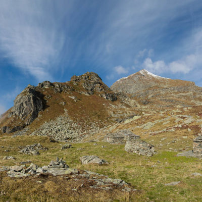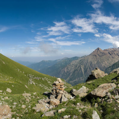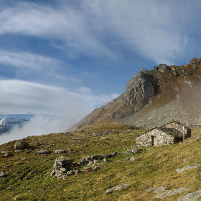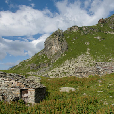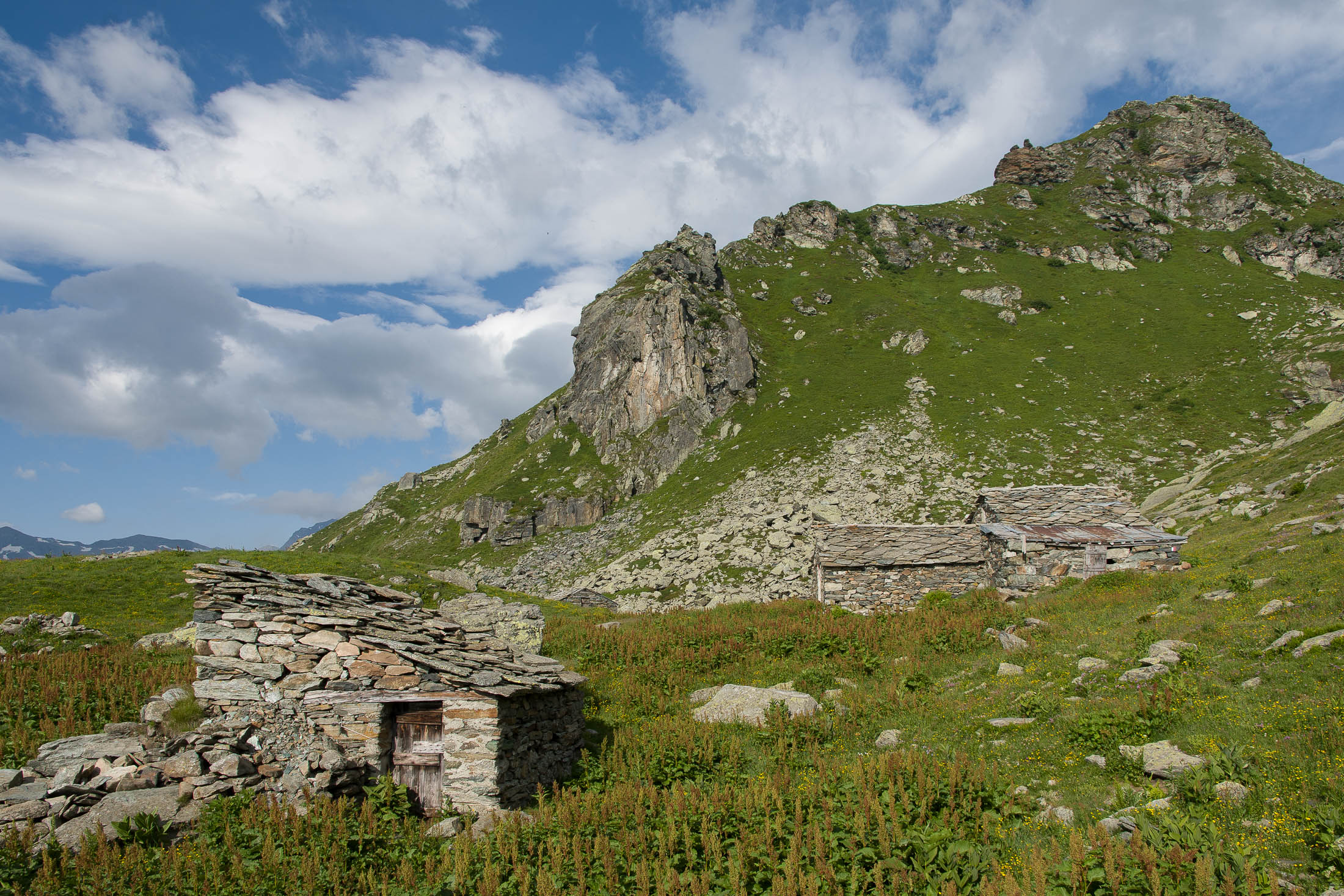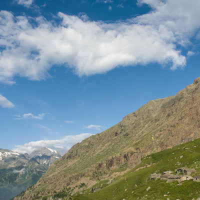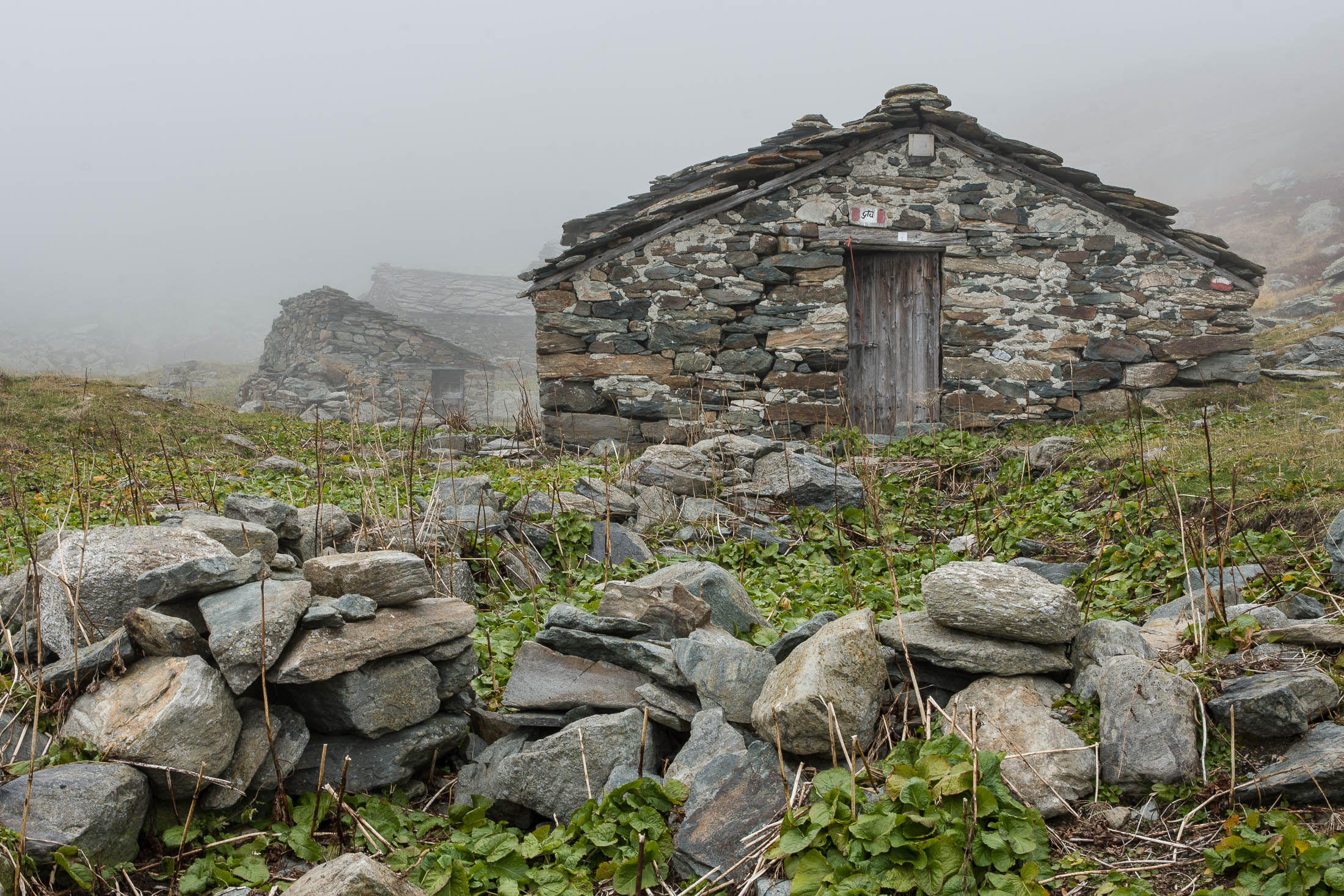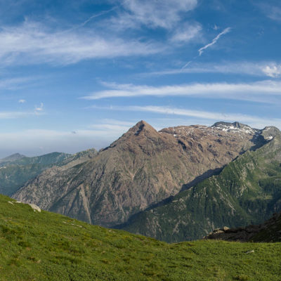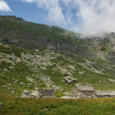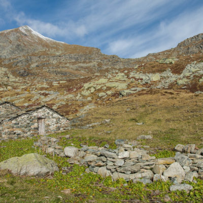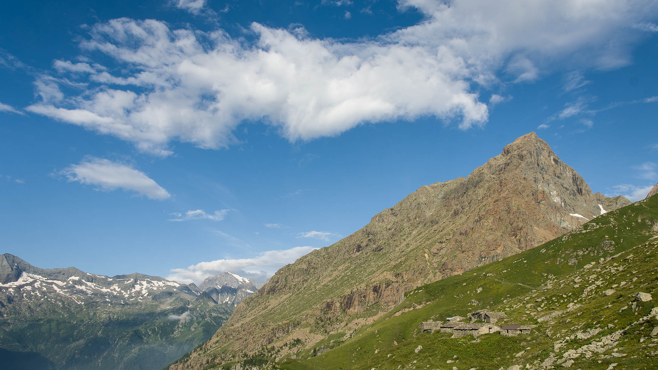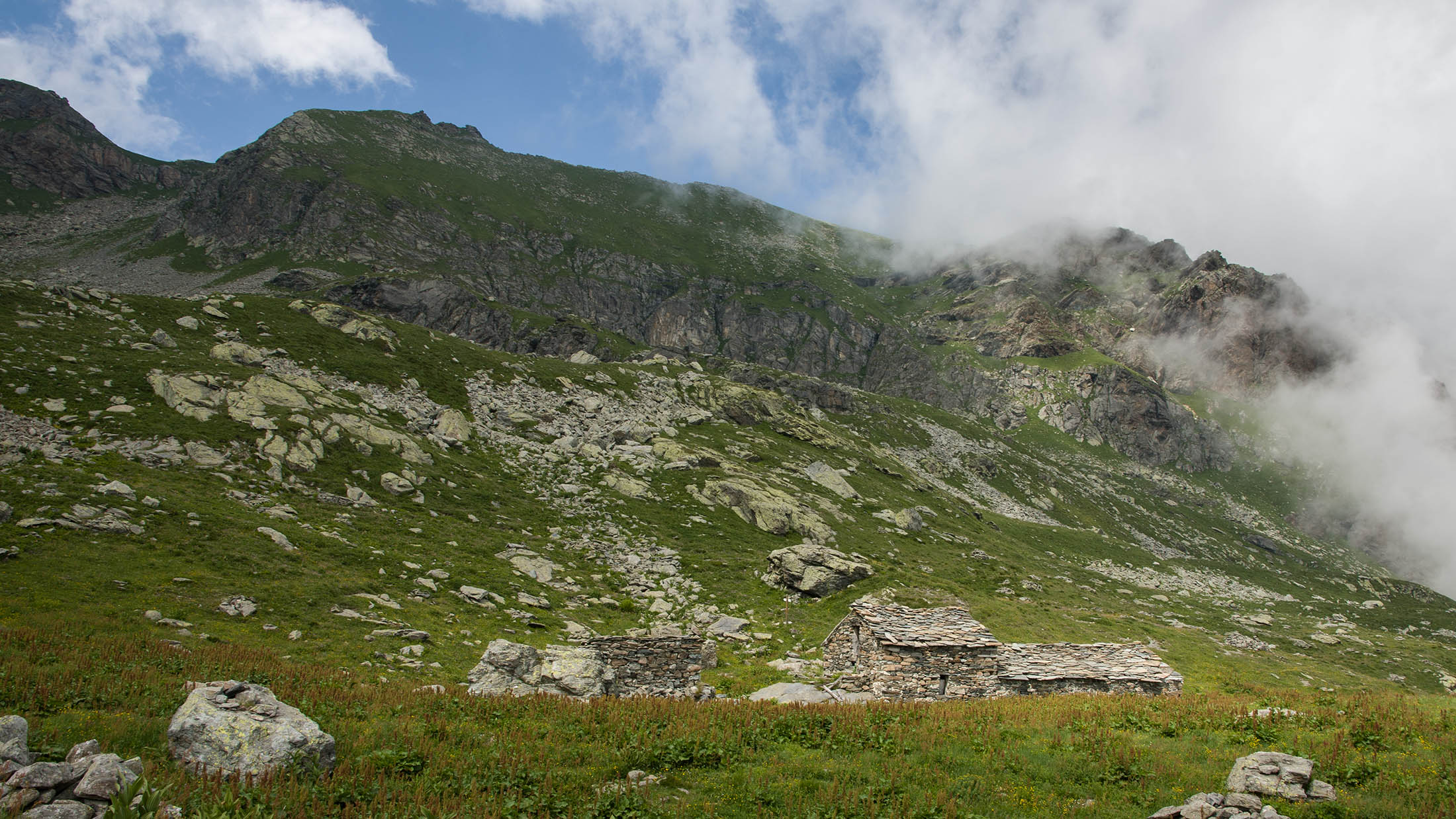 Am nächsten Morgen geht es zunächst 20 Minuten auf dem Weg des Vortags zurück. An einer Gabelung knickt die Pfadspur Richtung Osten ab und führt aussichtsreich hinab zur Alpe Pian delle Mule (2078 m). Die markante Spitze der Uja di Mondrone (2964 m) erhebt sich von hier zum Greifen nah, eine gewaltige Kulisse, besonders eindrücklich, wenn man früh aufsteht und bereits bei Sonnenaufgang unterwegs ist. Von der Alpe Pian delle Mule sind nur noch wenige Gebäude intakt, im Sommer grast noch eine Ziegenherde auf den von vielen Steinen und Felsbrocken übersäten Weiden. Eine vergessene Welt inmitten der Stille. Von dort weiter Richtung Osten (nicht zur Alpe Pian Pra absteigen!), der spärliche und unmarkierte Weg führt ohne nennenswerte Höhenunterschiede zur bereits sichtbaren Alpe Vasuera di sopra (1997 m). Jenseits der Hütten trifft man auf die GTA (Grande Traversata delle Alpi), ein Weitwanderweg durch die piemontesischen Alpen mit nahezu 70 Etappen. Nach einem 45-minütigen Gegenanstieg erreicht man die weitläufige und aussichtsreiche Hochfläche der Alpe Pian del Lago (2225 m). Nur fünf Gehminuten entfernt befindet sich der malerische Lago Vasuero (2237 m) am Fuss der Cima Leitosa (2868 m). Der herrlich gelegene Bergsee kann nach längeren Trockenperioden in den Sommermonaten gelegentlich austrocknen. Pause. Rucksack absetzen und die Füsse ins eiskalte Wasser strecken. Die Gedanken sind frei.