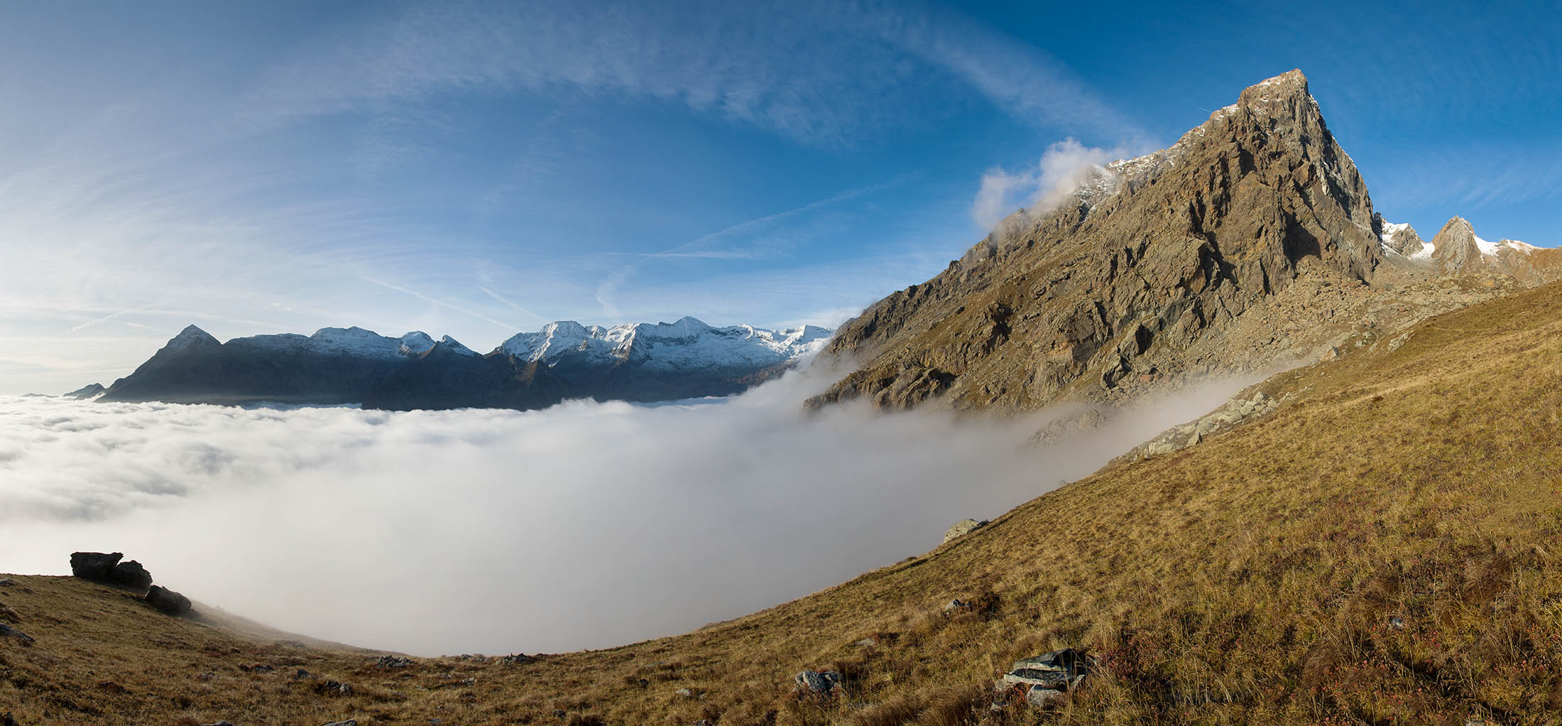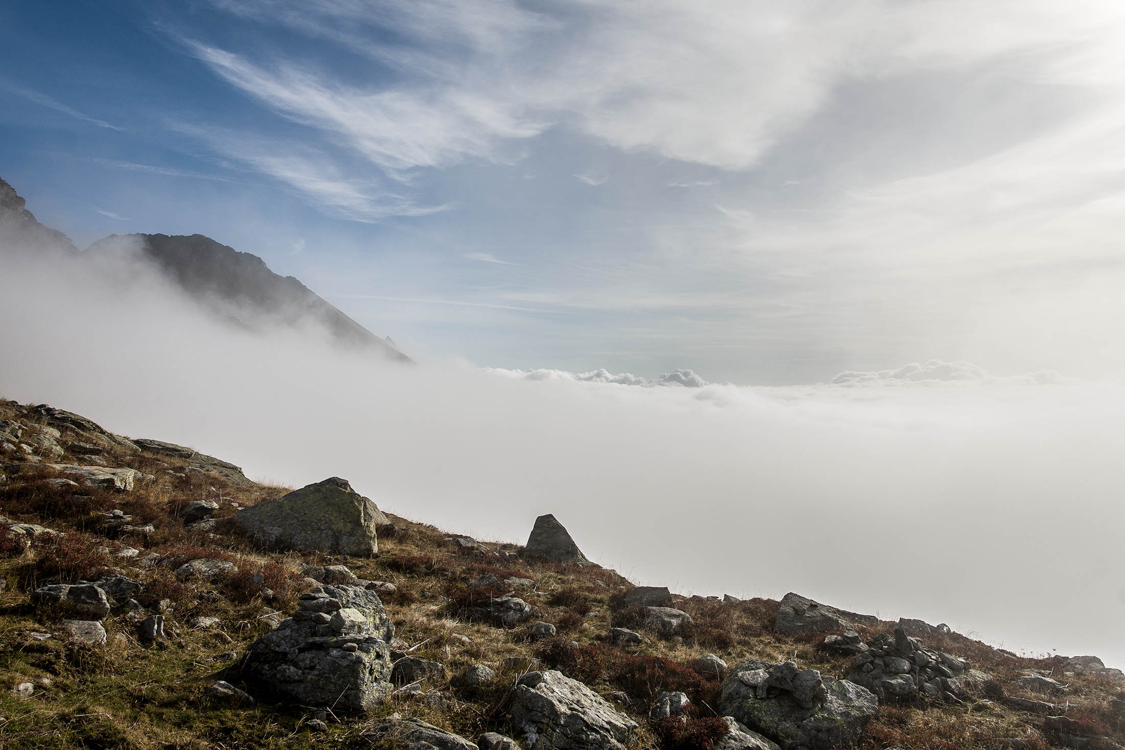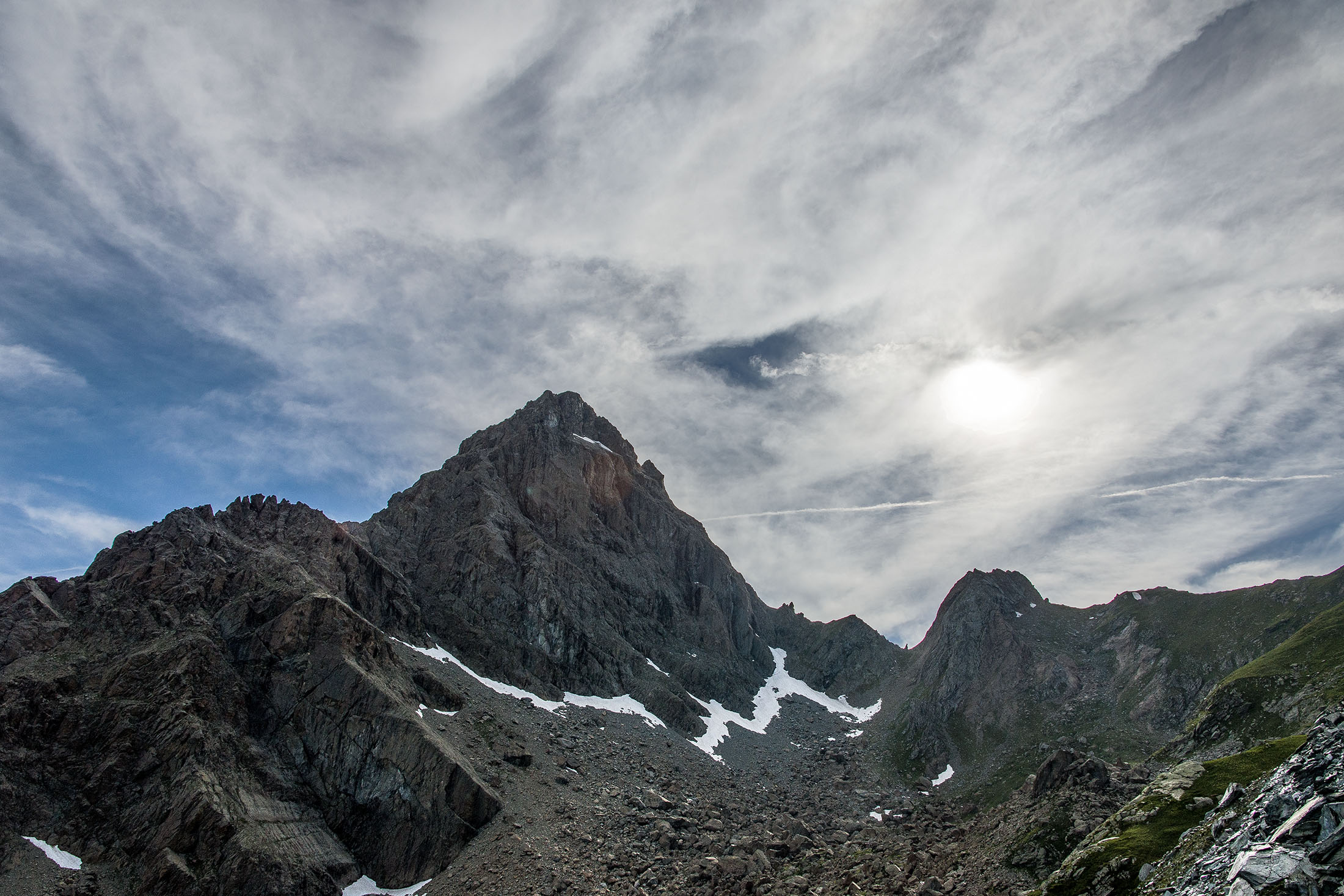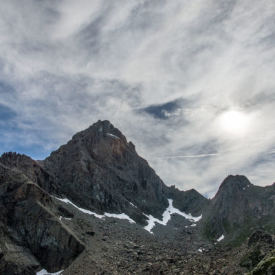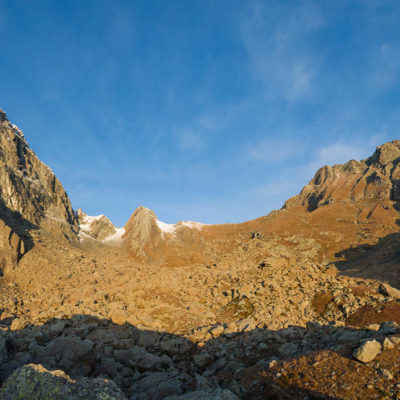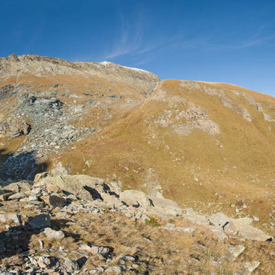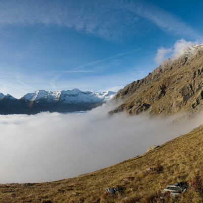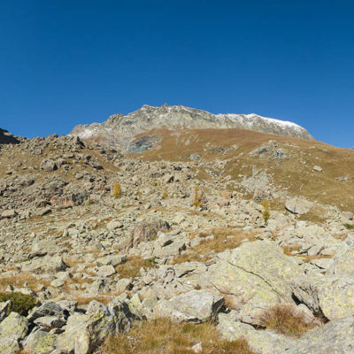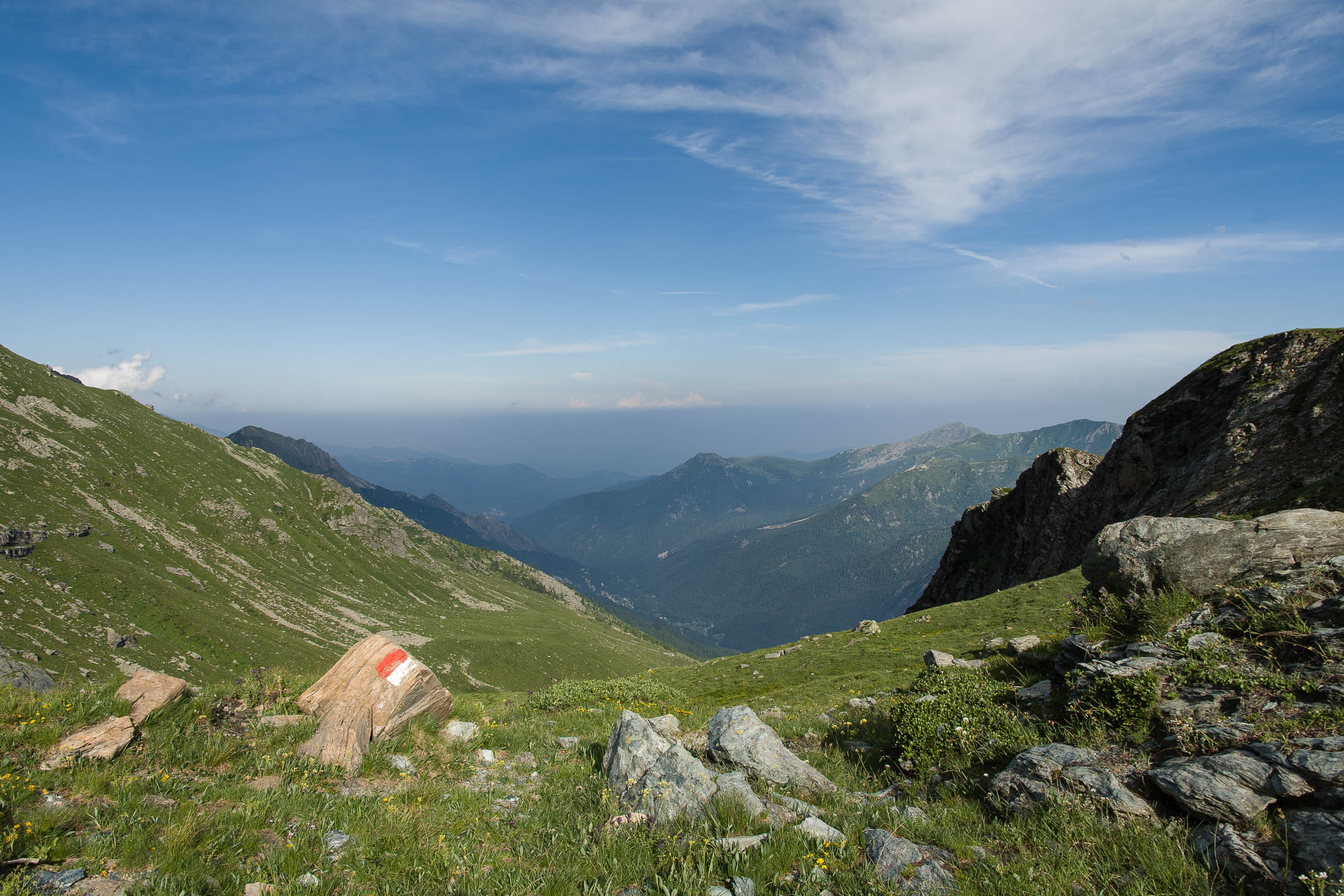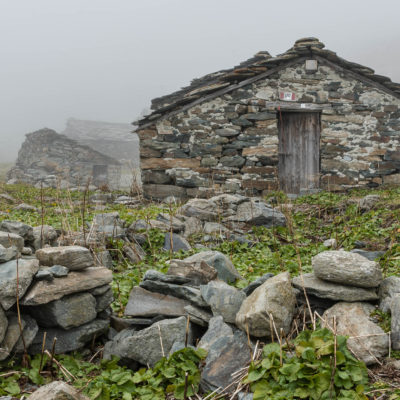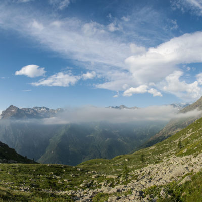 Am nächsten Morgen geht es zunächst 20 Minuten auf dem Weg des Vortags zurück. An einer Gabelung knickt die Pfadspur Richtung Osten ab und führt aussichtsreich hinab zur Alpe Pian delle Mule (2078 m). Die markante Spitze der Uja di Mondrone (2964 m) erhebt sich von hier zum Greifen nah, eine gewaltige Kulisse, besonders eindrücklich, wenn man früh aufsteht und bereits bei Sonnenaufgang unterwegs ist. Von der Alpe Pian delle Mule sind nur noch wenige Gebäude intakt, im Sommer grast noch eine Ziegenherde auf den von vielen Steinen und Felsbrocken übersäten Weiden. Eine vergessene Welt inmitten der Stille. Von dort weiter Richtung Osten (nicht zur Alpe Pian Pra absteigen!), der spärliche und unmarkierte Weg führt ohne nennenswerte Höhenunterschiede zur bereits sichtbaren Alpe Vasuera di sopra (1997 m). Jenseits der Hütten trifft man auf die GTA (Grande Traversata delle Alpi), ein Weitwanderweg durch die piemontesischen Alpen mit nahezu 70 Etappen. Nach einem 45-minütigen Gegenanstieg erreicht man die weitläufige und aussichtsreiche Hochfläche der Alpe Pian del Lago (2225 m). Nur fünf Gehminuten entfernt befindet sich der malerische Lago Vasuero (2237 m) am Fuss der Cima Leitosa (2868 m). Der herrlich gelegene Bergsee kann nach längeren Trockenperioden in den Sommermonaten gelegentlich austrocknen. Pause. Rucksack absetzen und die Füsse ins eiskalte Wasser strecken. Die Gedanken sind frei.