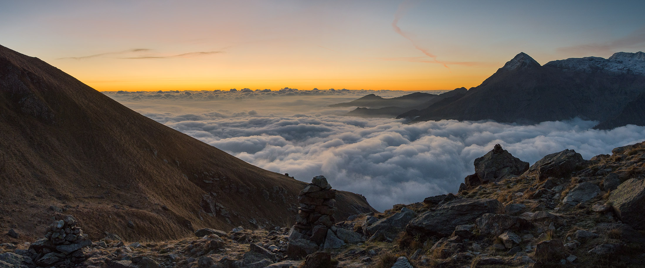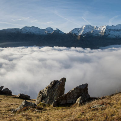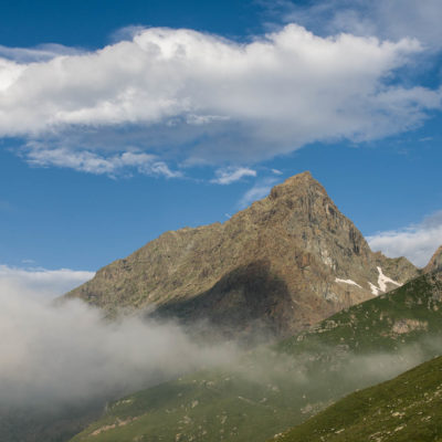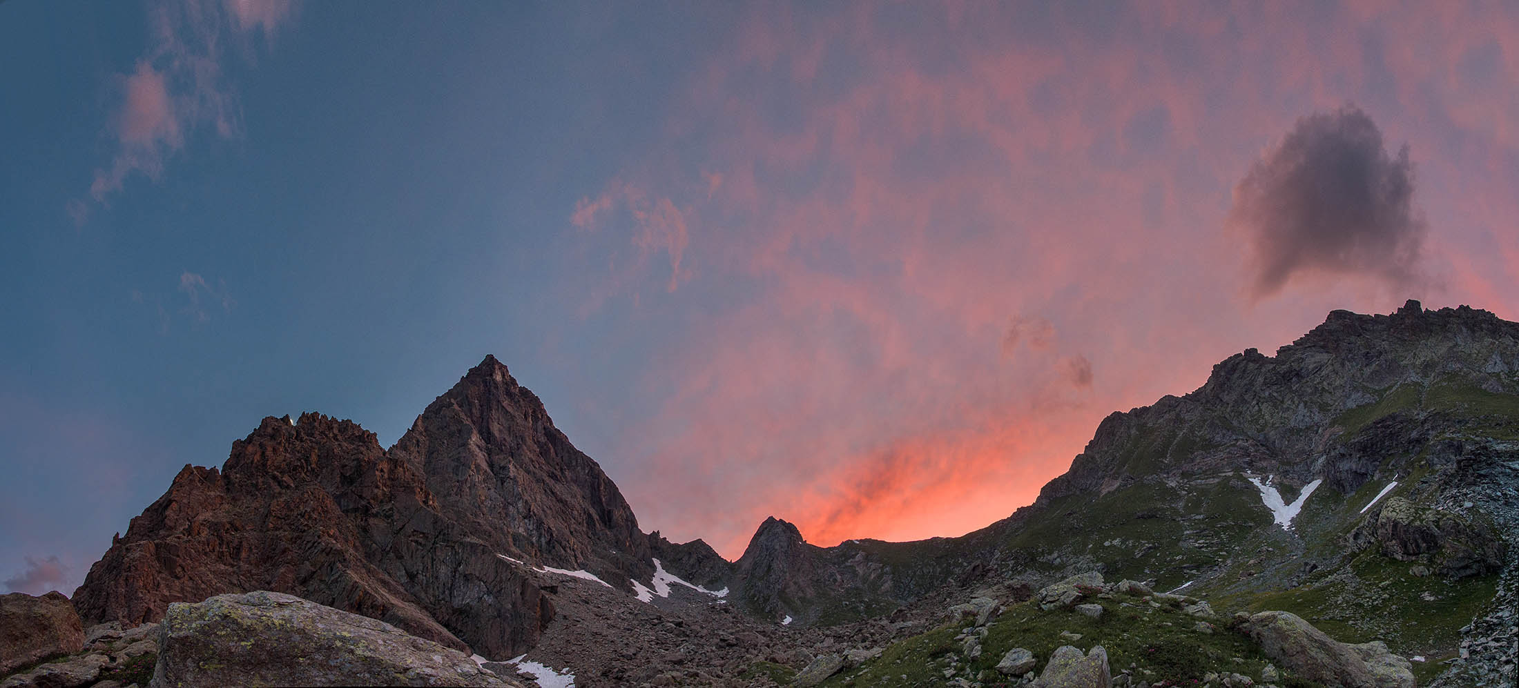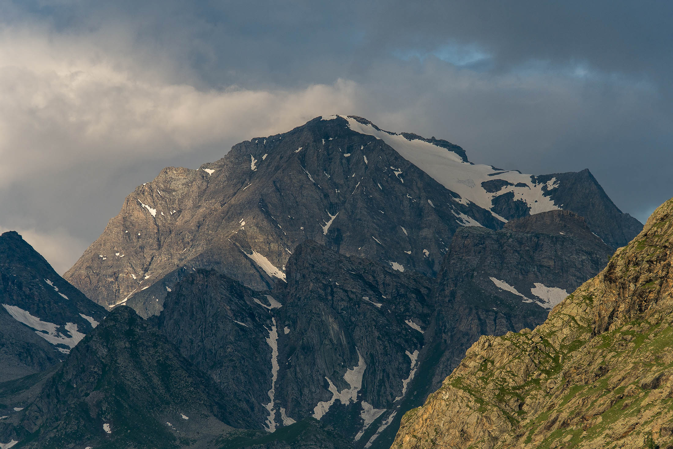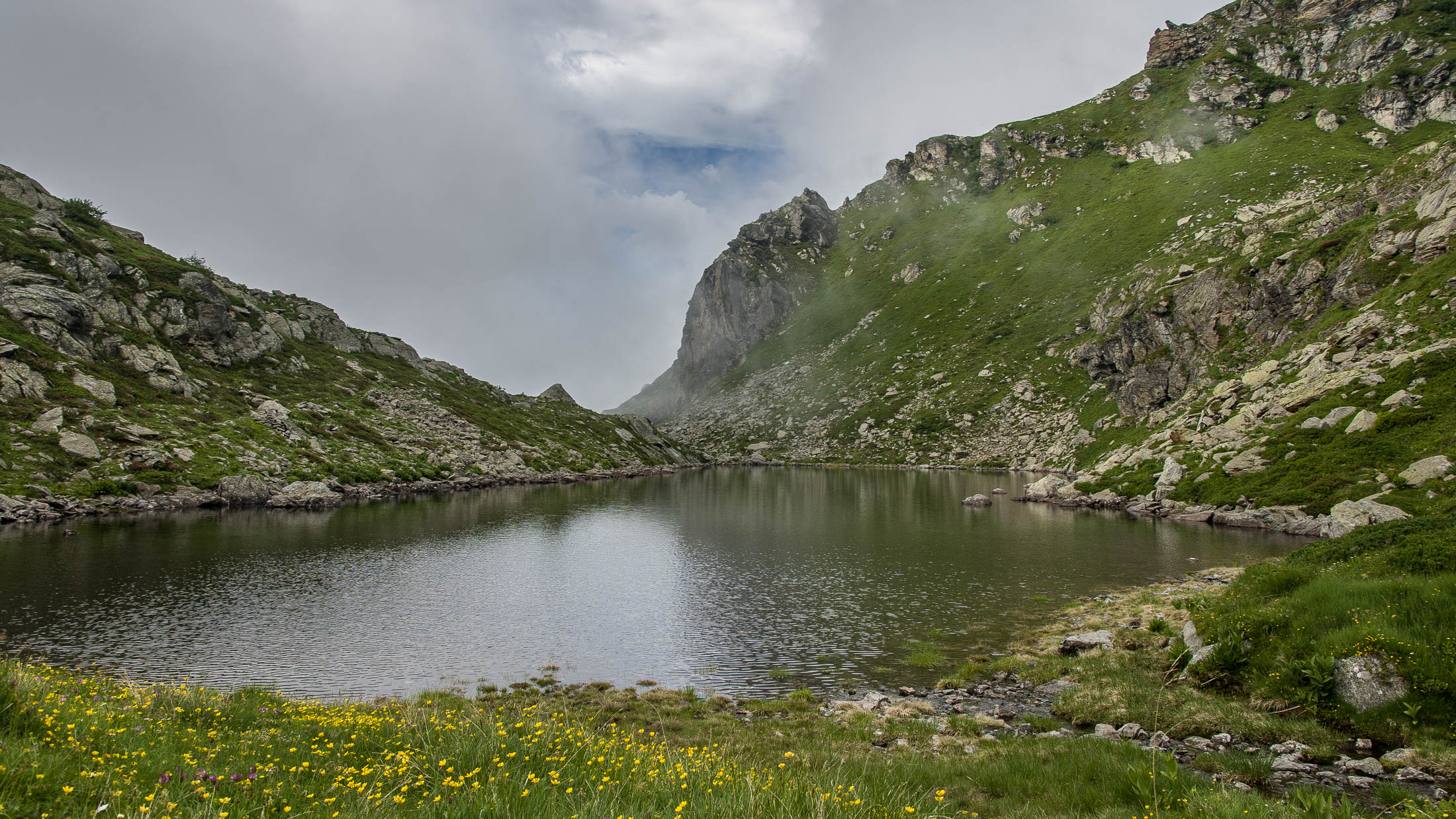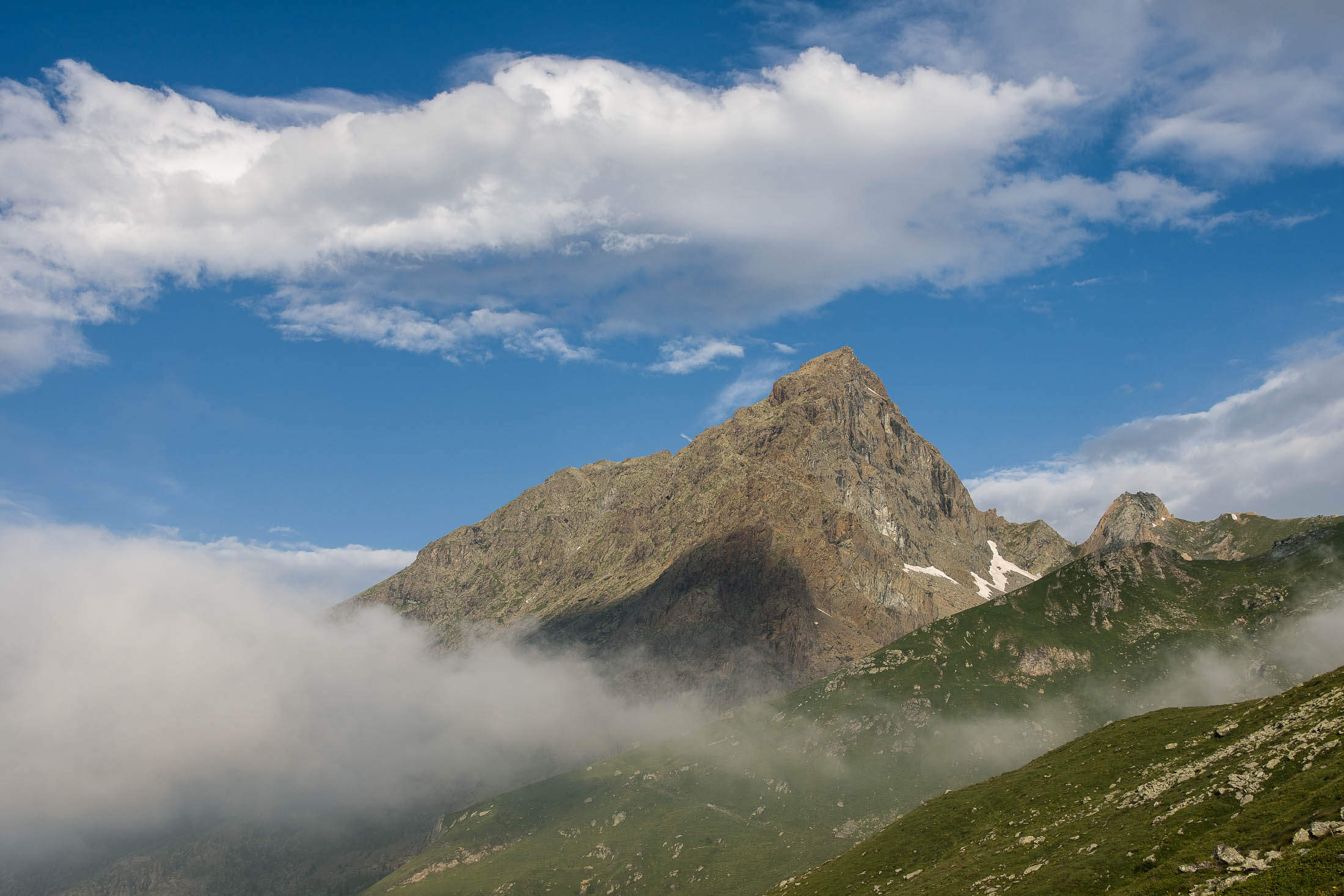 Am nächsten Morgen geht es zunächst 20 Minuten auf dem Weg des Vortags zurück. An einer Gabelung knickt die Pfadspur Richtung Osten ab und führt aussichtsreich hinab zur Alpe Pian delle Mule (2078 m). Die markante Spitze der Uja di Mondrone (2964 m) erhebt sich von hier zum Greifen nah, eine gewaltige Kulisse, besonders eindrücklich, wenn man früh aufsteht und bereits bei Sonnenaufgang unterwegs ist. Von der Alpe Pian delle Mule sind nur noch wenige Gebäude intakt, im Sommer grast noch eine Ziegenherde auf den von vielen Steinen und Felsbrocken übersäten Weiden. Eine vergessene Welt inmitten der Stille. Von dort weiter Richtung Osten (nicht zur Alpe Pian Pra absteigen!), der spärliche und unmarkierte Weg führt ohne nennenswerte Höhenunterschiede zur bereits sichtbaren Alpe Vasuera di sopra (1997 m). Jenseits der Hütten trifft man auf die GTA (Grande Traversata delle Alpi), ein Weitwanderweg durch die piemontesischen Alpen mit nahezu 70 Etappen. Nach einem 45-minütigen Gegenanstieg erreicht man die weitläufige und aussichtsreiche Hochfläche der Alpe Pian del Lago (2225 m). Nur fünf Gehminuten entfernt befindet sich der malerische Lago Vasuero (2237 m) am Fuss der Cima Leitosa (2868 m). Der herrlich gelegene Bergsee kann nach längeren Trockenperioden in den Sommermonaten gelegentlich austrocknen. Pause. Rucksack absetzen und die Füsse ins eiskalte Wasser strecken. Die Gedanken sind frei.