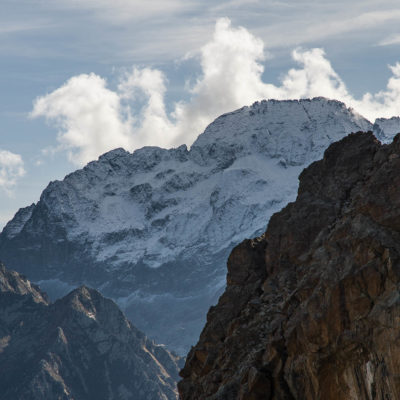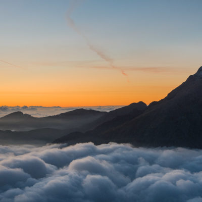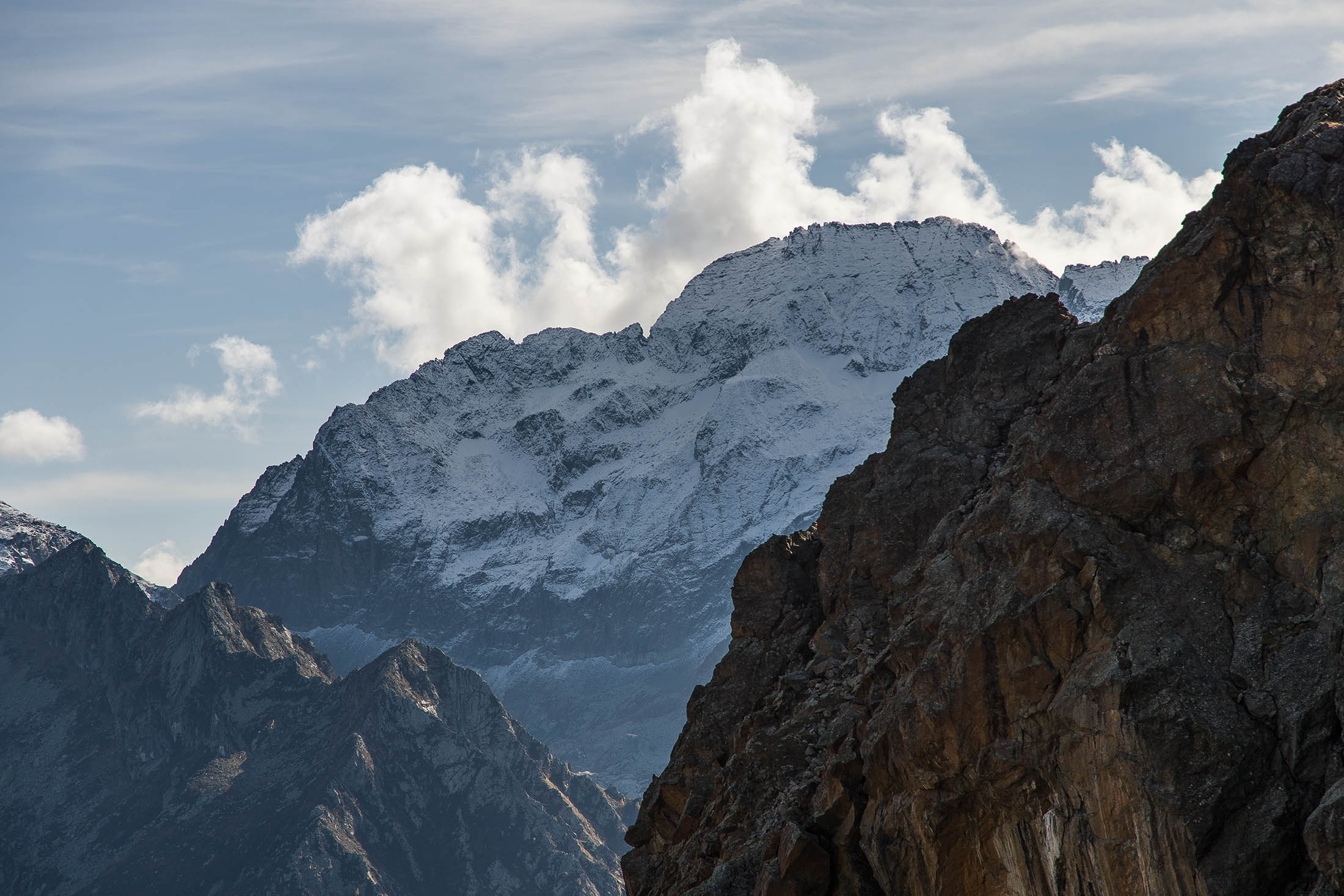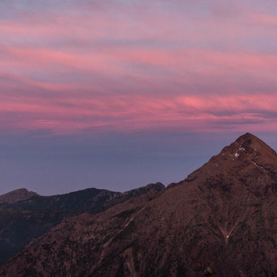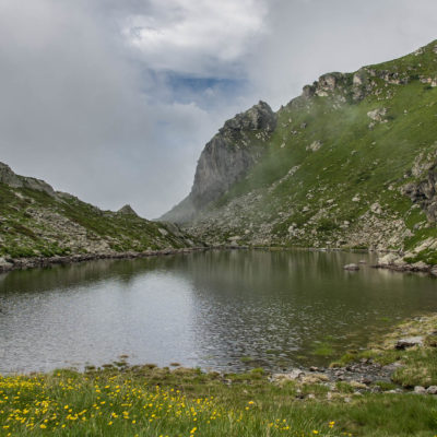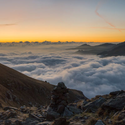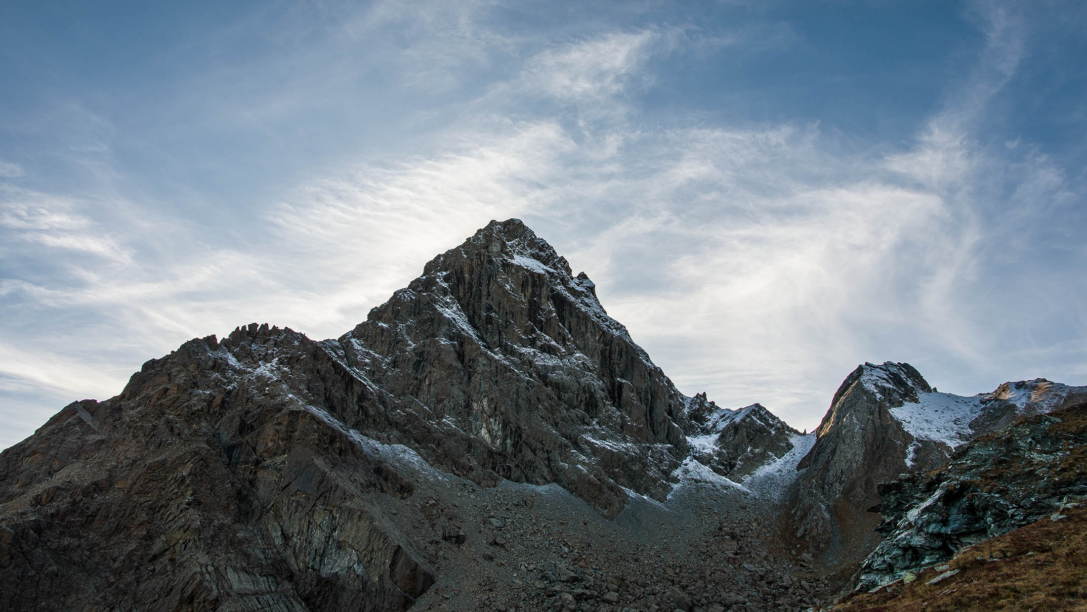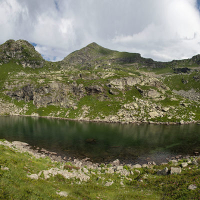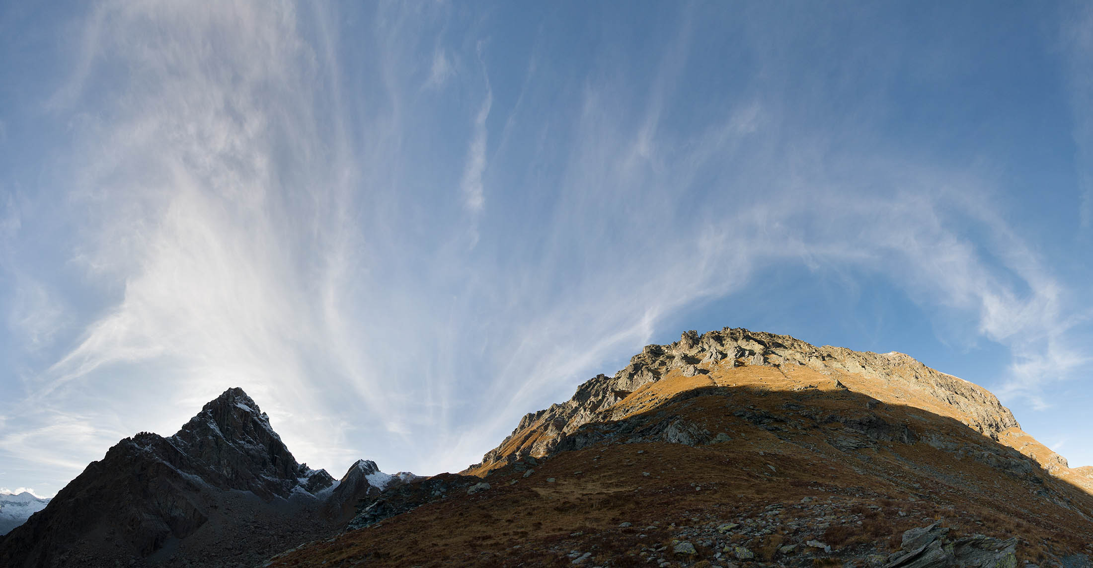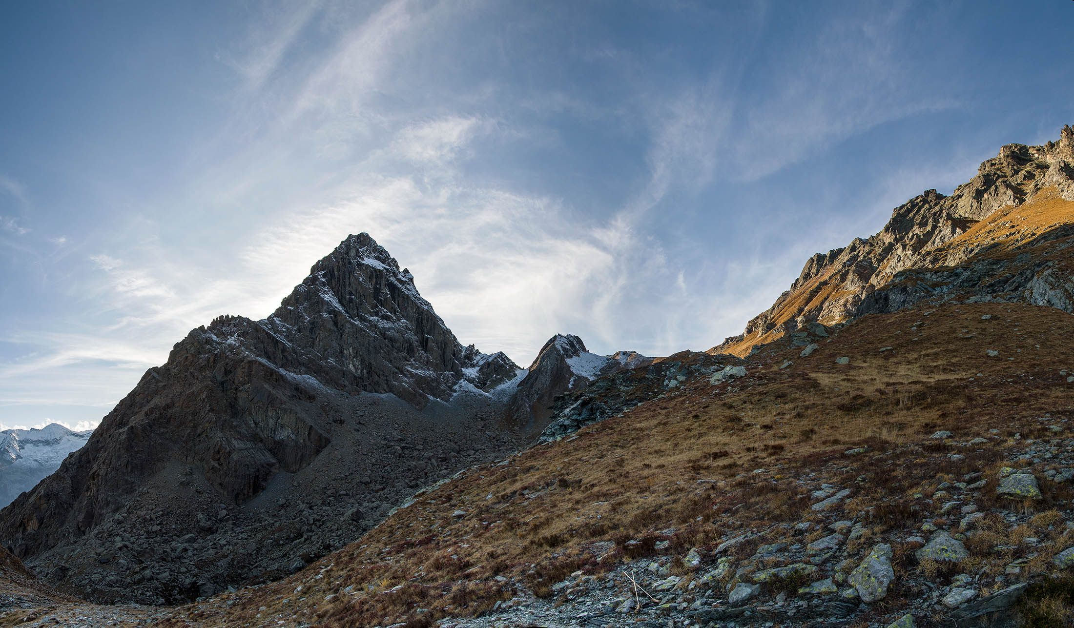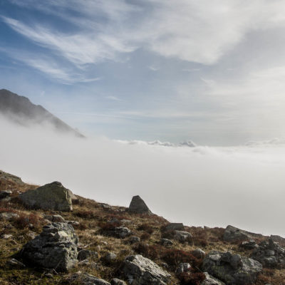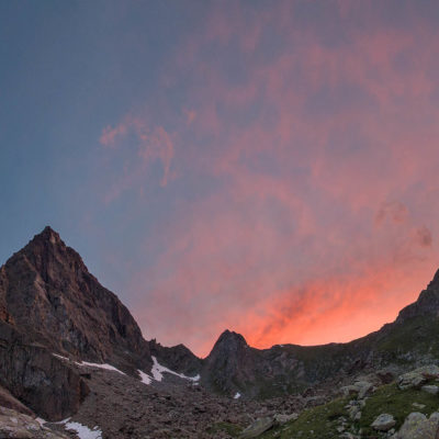 Am nächsten Morgen geht es zunächst 20 Minuten auf dem Weg des Vortags zurück. An einer Gabelung knickt die Pfadspur Richtung Osten ab und führt aussichtsreich hinab zur Alpe Pian delle Mule (2078 m). Die markante Spitze der Uja di Mondrone (2964 m) erhebt sich von hier zum Greifen nah, eine gewaltige Kulisse, besonders eindrücklich, wenn man früh aufsteht und bereits bei Sonnenaufgang unterwegs ist. Von der Alpe Pian delle Mule sind nur noch wenige Gebäude intakt, im Sommer grast noch eine Ziegenherde auf den von vielen Steinen und Felsbrocken übersäten Weiden. Eine vergessene Welt inmitten der Stille. Von dort weiter Richtung Osten (nicht zur Alpe Pian Pra absteigen!), der spärliche und unmarkierte Weg führt ohne nennenswerte Höhenunterschiede zur bereits sichtbaren Alpe Vasuera di sopra (1997 m). Jenseits der Hütten trifft man auf die GTA (Grande Traversata delle Alpi), ein Weitwanderweg durch die piemontesischen Alpen mit nahezu 70 Etappen. Nach einem 45-minütigen Gegenanstieg erreicht man die weitläufige und aussichtsreiche Hochfläche der Alpe Pian del Lago (2225 m). Nur fünf Gehminuten entfernt befindet sich der malerische Lago Vasuero (2237 m) am Fuss der Cima Leitosa (2868 m). Der herrlich gelegene Bergsee kann nach längeren Trockenperioden in den Sommermonaten gelegentlich austrocknen. Pause. Rucksack absetzen und die Füsse ins eiskalte Wasser strecken. Die Gedanken sind frei.