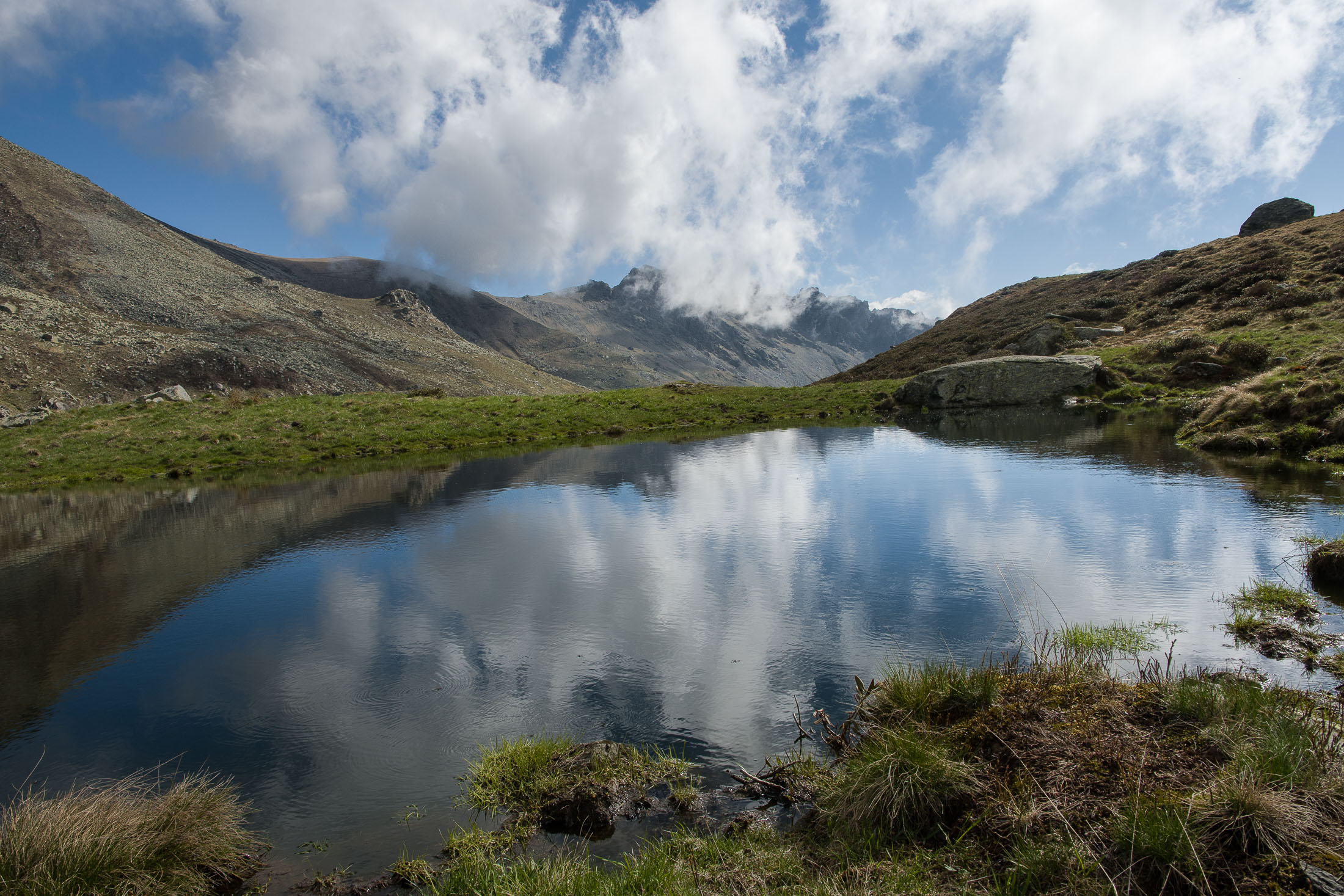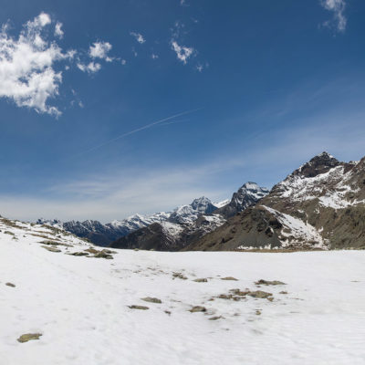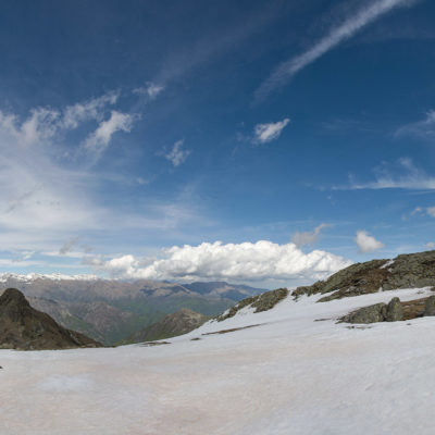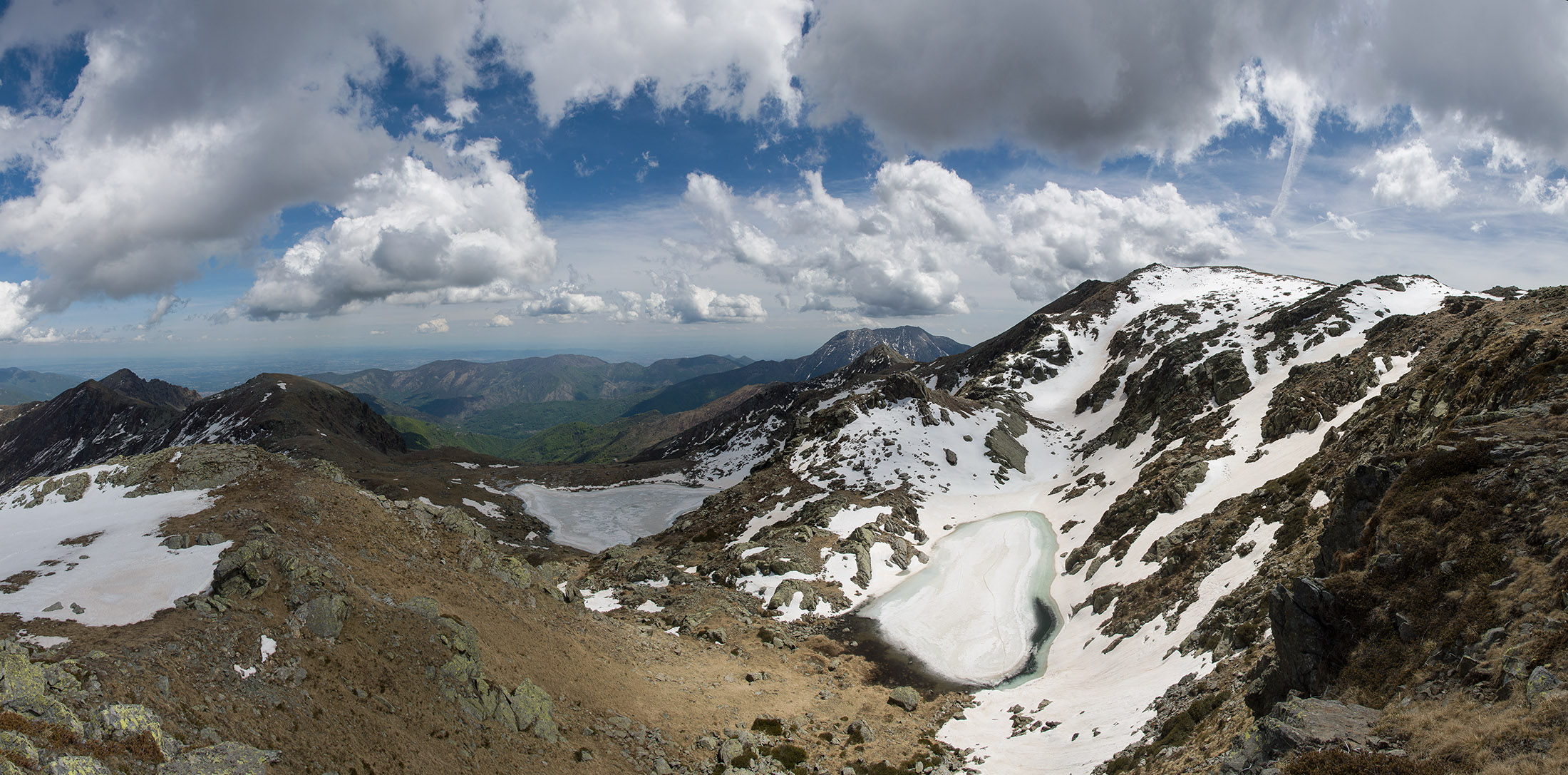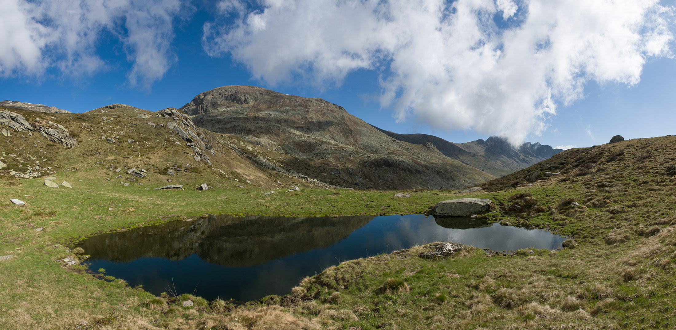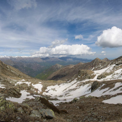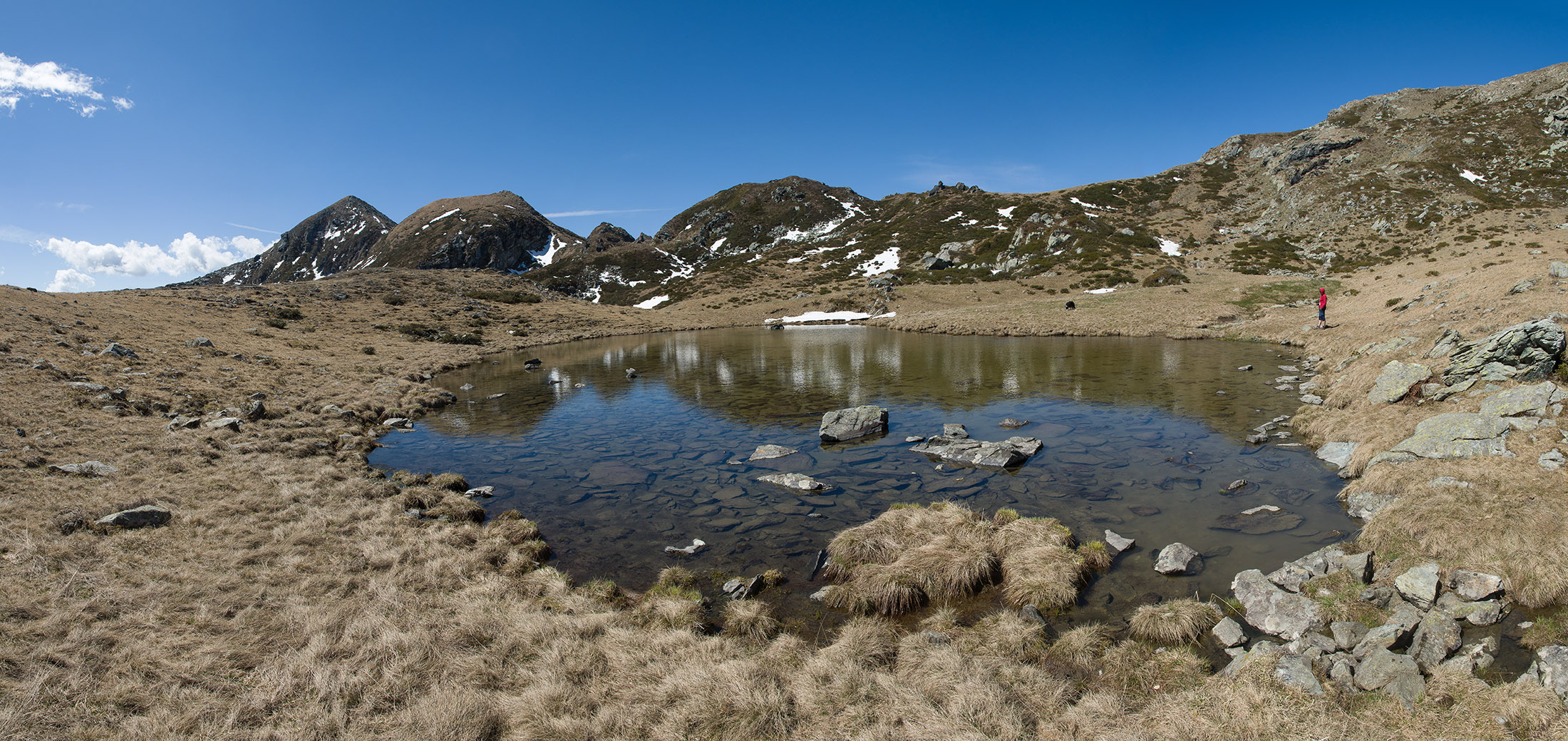 Der Abstieg vom Gipfel des Ciarm del Prete zum Lago di Viana führt zunächst mehr oder weniger weglos über den steinigen Nordgrat. Hier und da weisen Steinmänner den Weg, bei dichtem Nebel sollte man hier die Orientierung nicht verlieren, eine felsige Stelle sollte man besser links (westlich) umgehen. Nach einer halben Stunde erreicht man grasige Matten und folgt den vereinzelten Steinmänner Richtung Osten. Durch einen steinigen Kanal geht es auf nun klar erkennbarem Weg steil hinab zum Lago Panè (2284 m), der oft bis weit in den Mai hinein noch zugefroren ist. Von dem kleinen See steigt man in Kürze zum Colle del Lago di Viana ab (2218 m, im Gelände auch als Colle dei Tre Lajet bezeichnet), Wasserscheide zwischen dem Valle di Viù und dem nördlich gelegenen Val d‘Ala. Das Panorama von diesem weltabgeschiedenen Ort ist dementsprechend eindrücklich. Vom Pass sind es nur noch wenige Schritte bis zum Ufer des Lago di Viana (2201 m), ein malerischer Bergsee am Fuss des Ciarm del Prete. Hier lohnt es sich, ein wenig länger zu verweilen, um in aller Ruhe die beeindruckende Umgebung und die tolle Aussicht zu geniessen. Vom Lago di Viana wandert man in etwa 40 Minuten zurück zum Lago Vailet (2065 m), der verbleibende, knapp zweistündige Abstieg ist identisch mit dem Aufstiegsweg.