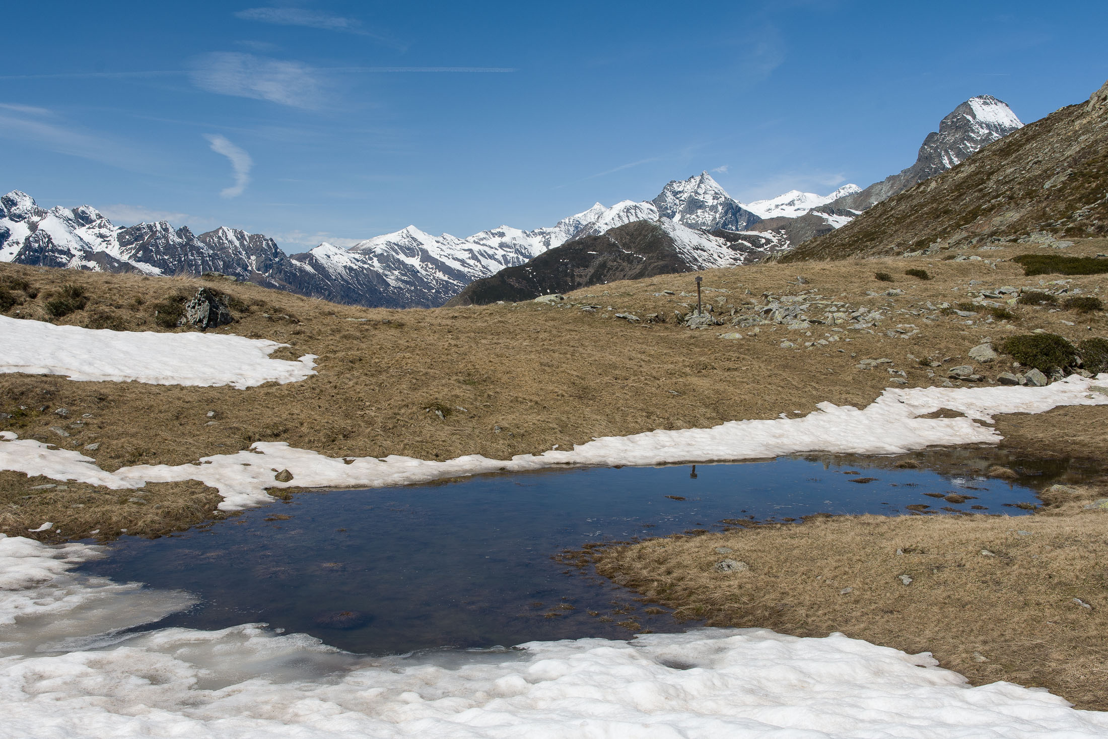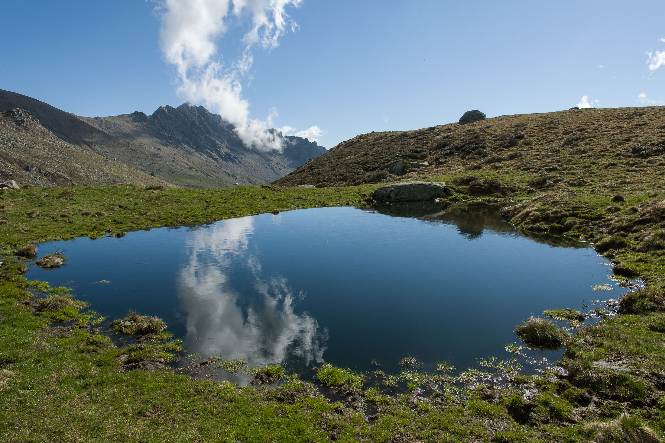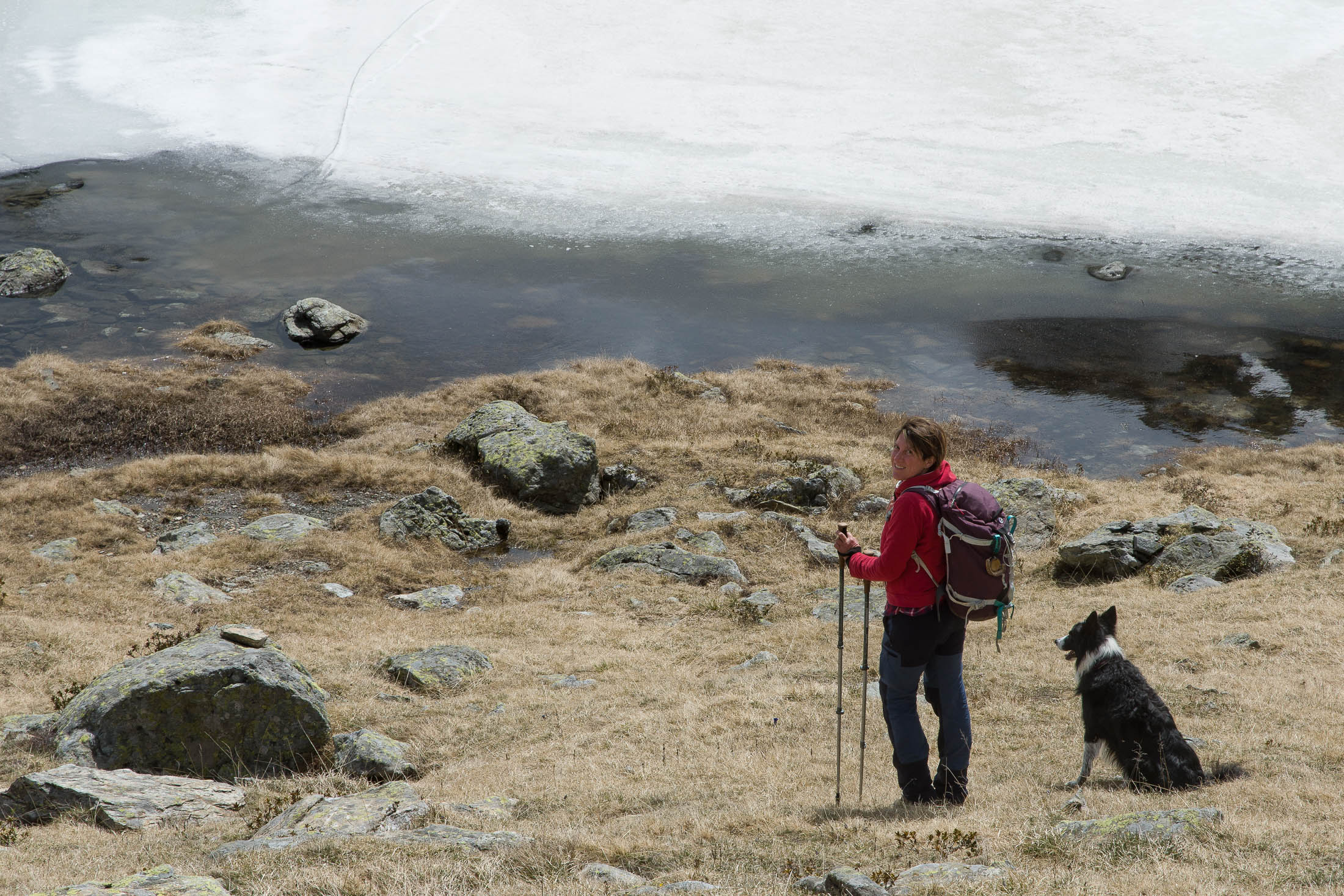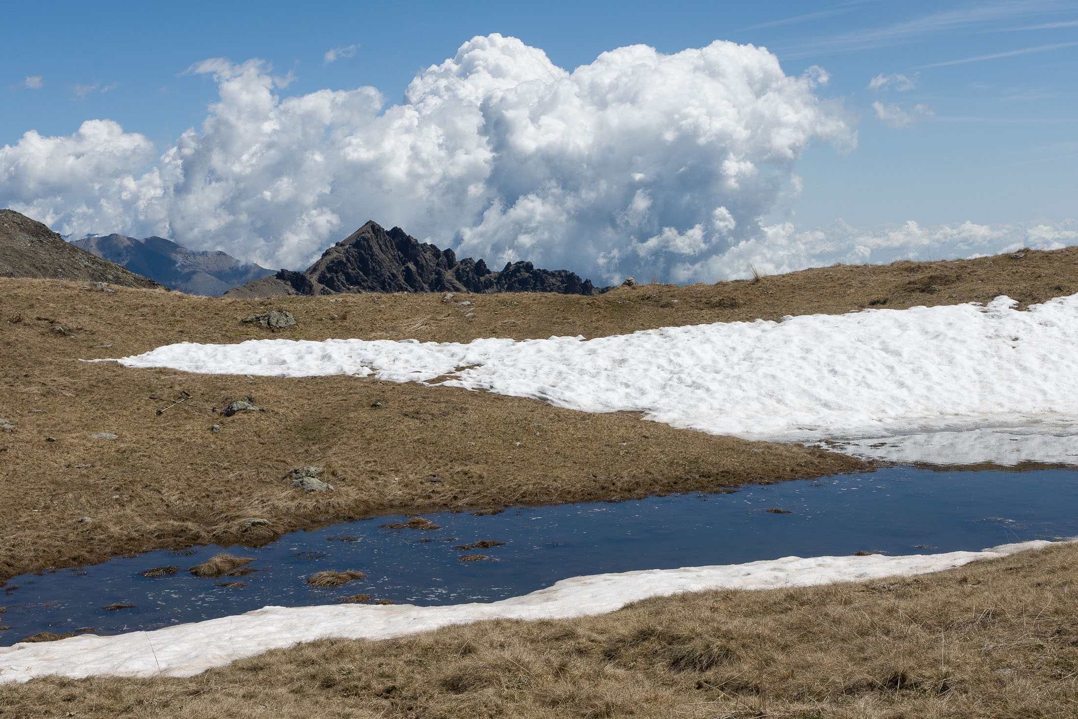 Der Abstieg vom Gipfel des Ciarm del Prete zum Lago di Viana führt zunächst mehr oder weniger weglos über den steinigen Nordgrat. Hier und da weisen Steinmänner den Weg, bei dichtem Nebel sollte man hier die Orientierung nicht verlieren, eine felsige Stelle sollte man besser links (westlich) umgehen. Nach einer halben Stunde erreicht man grasige Matten und folgt den vereinzelten Steinmänner Richtung Osten. Durch einen steinigen Kanal geht es auf nun klar erkennbarem Weg steil hinab zum Lago Panè (2284 m), der oft bis weit in den Mai hinein noch zugefroren ist. Von dem kleinen See steigt man in Kürze zum Colle del Lago di Viana ab (2218 m, im Gelände auch als Colle dei Tre Lajet bezeichnet), Wasserscheide zwischen dem Valle di Viù und dem nördlich gelegenen Val d‘Ala. Das Panorama von diesem weltabgeschiedenen Ort ist dementsprechend eindrücklich. Vom Pass sind es nur noch wenige Schritte bis zum Ufer des Lago di Viana (2201 m), ein malerischer Bergsee am Fuss des Ciarm del Prete. Hier lohnt es sich, ein wenig länger zu verweilen, um in aller Ruhe die beeindruckende Umgebung und die tolle Aussicht zu geniessen. Vom Lago di Viana wandert man in etwa 40 Minuten zurück zum Lago Vailet (2065 m), der verbleibende, knapp zweistündige Abstieg ist identisch mit dem Aufstiegsweg.