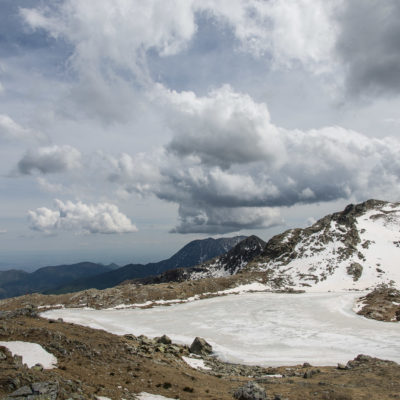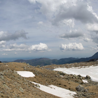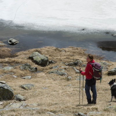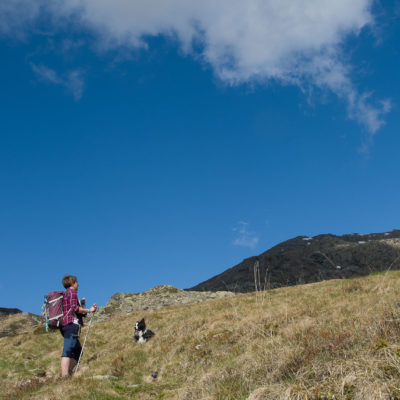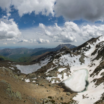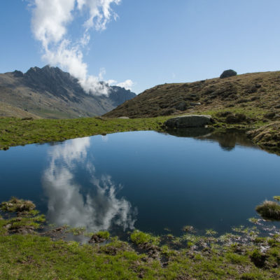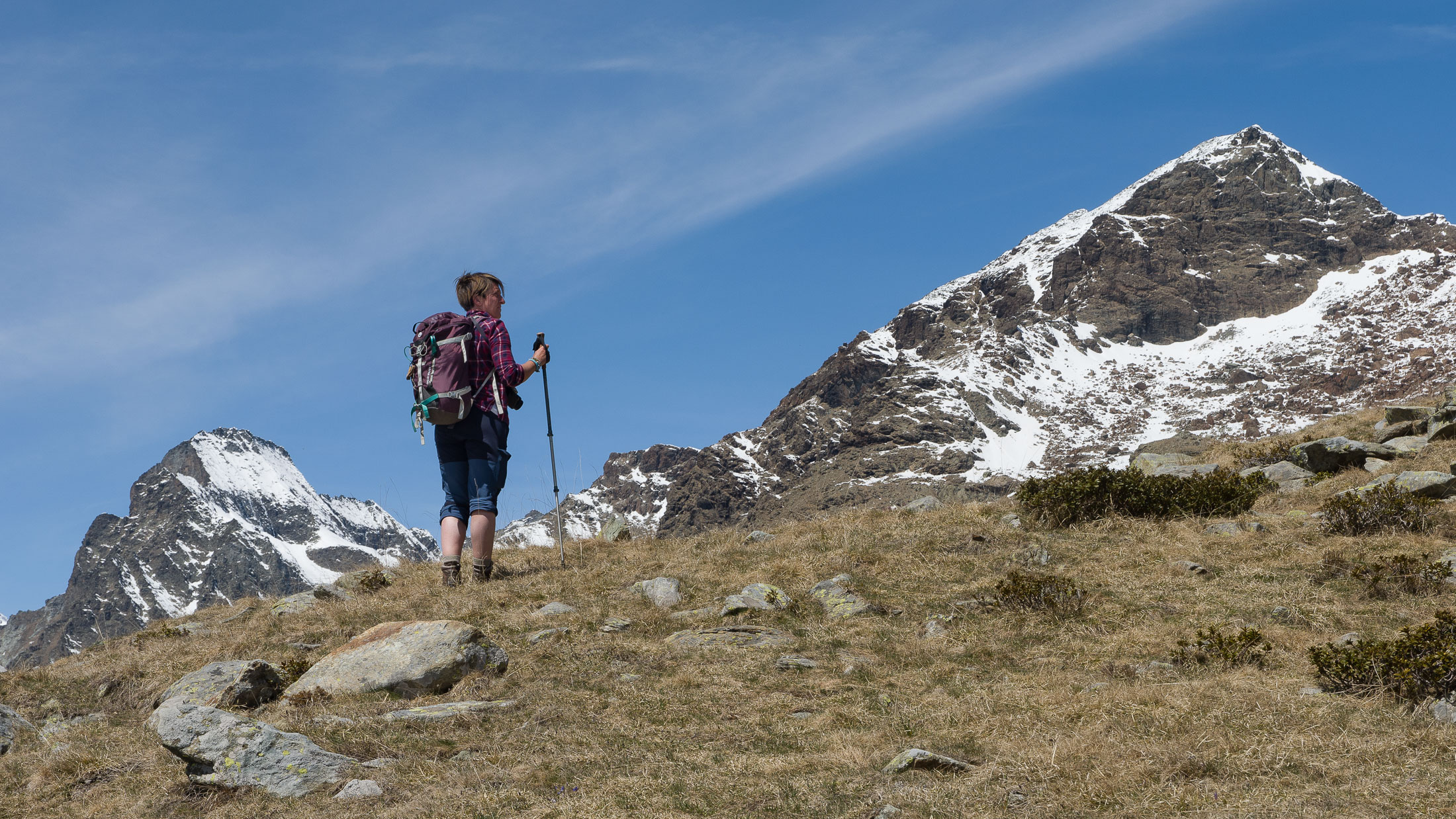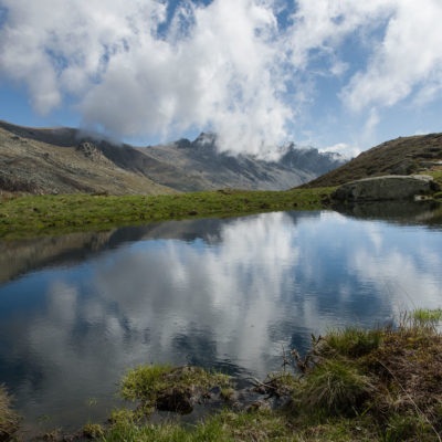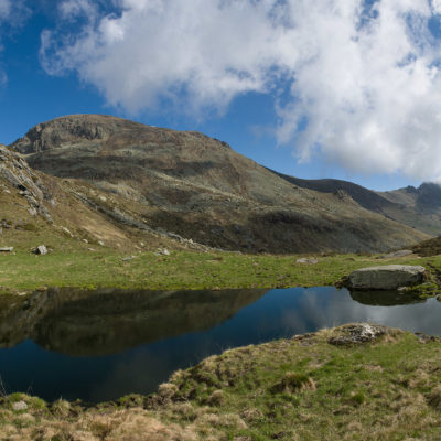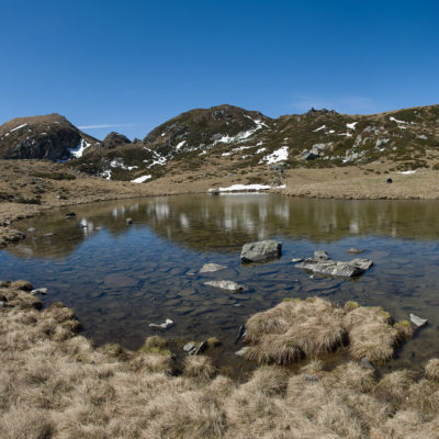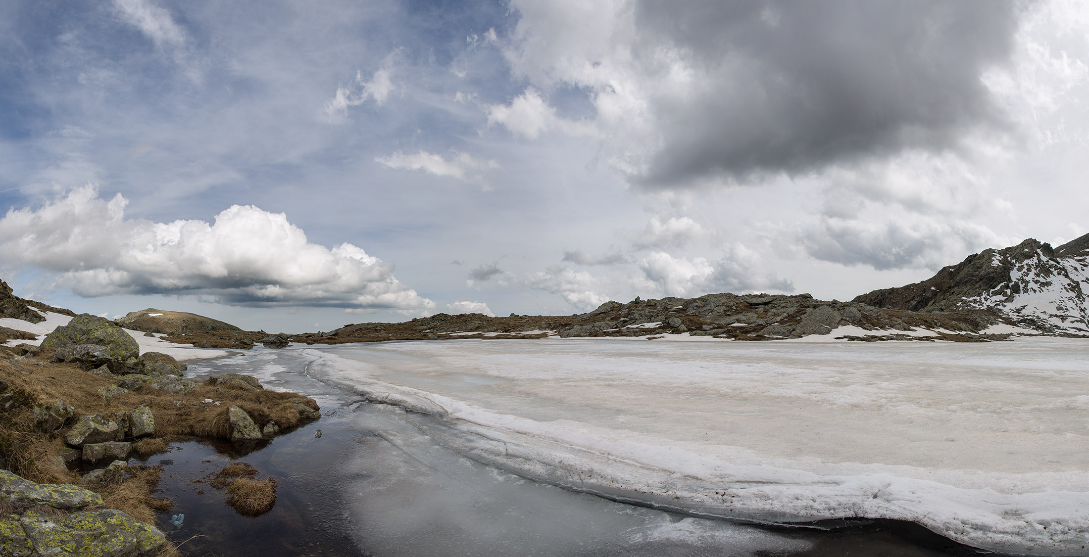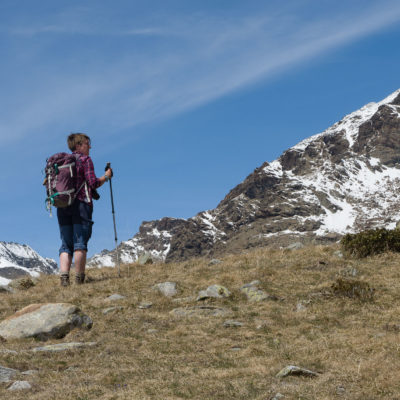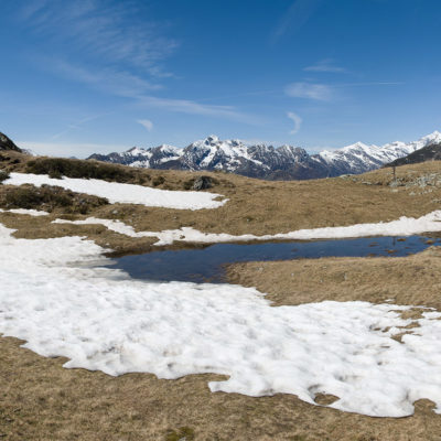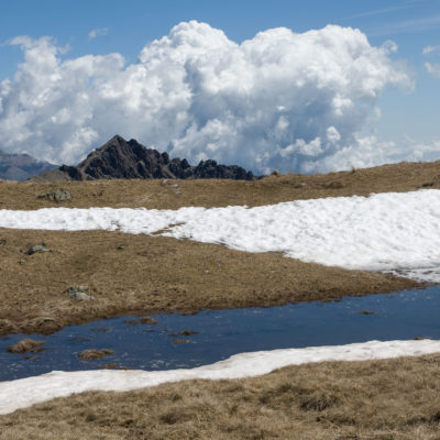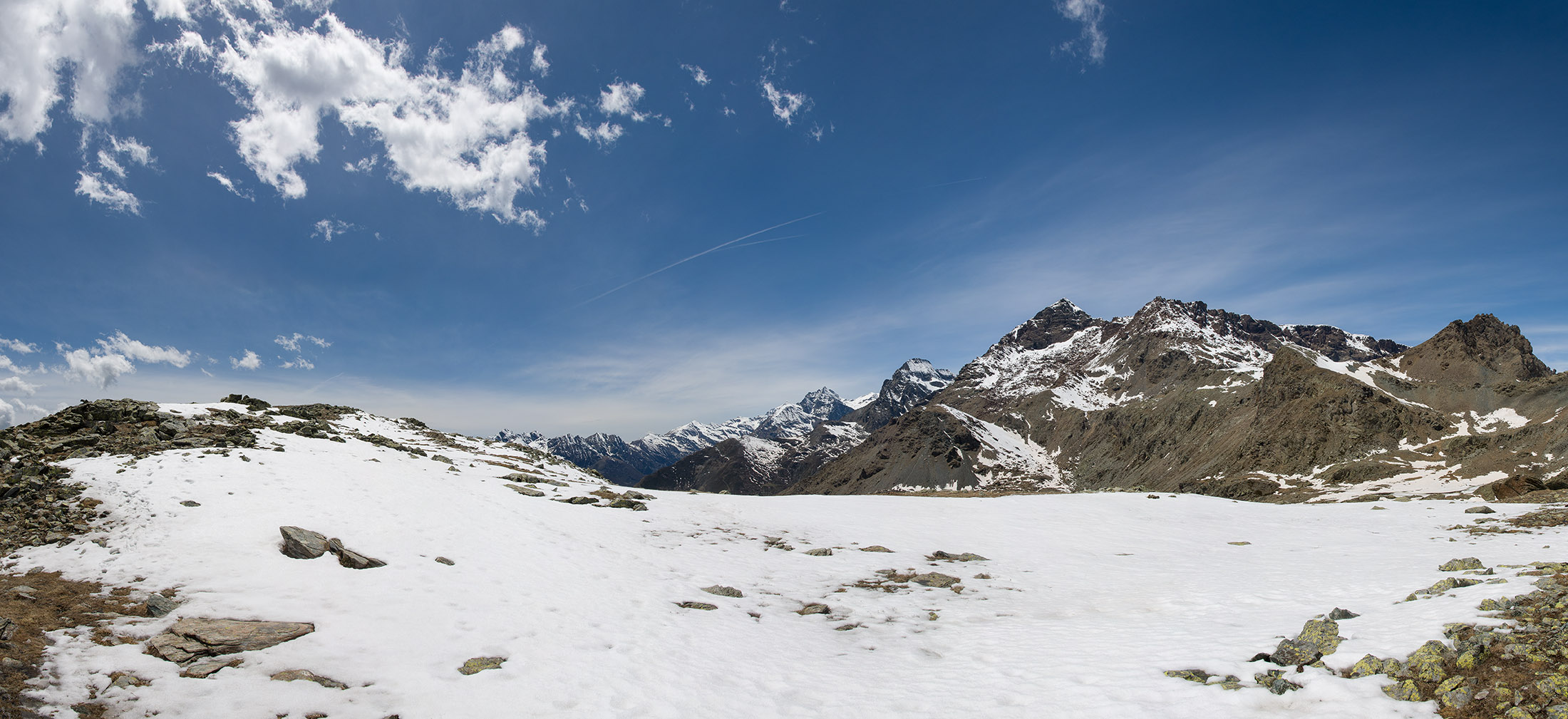 Der Abstieg vom Gipfel des Ciarm del Prete zum Lago di Viana führt zunächst mehr oder weniger weglos über den steinigen Nordgrat. Hier und da weisen Steinmänner den Weg, bei dichtem Nebel sollte man hier die Orientierung nicht verlieren, eine felsige Stelle sollte man besser links (westlich) umgehen. Nach einer halben Stunde erreicht man grasige Matten und folgt den vereinzelten Steinmänner Richtung Osten. Durch einen steinigen Kanal geht es auf nun klar erkennbarem Weg steil hinab zum Lago Panè (2284 m), der oft bis weit in den Mai hinein noch zugefroren ist. Von dem kleinen See steigt man in Kürze zum Colle del Lago di Viana ab (2218 m, im Gelände auch als Colle dei Tre Lajet bezeichnet), Wasserscheide zwischen dem Valle di Viù und dem nördlich gelegenen Val d‘Ala. Das Panorama von diesem weltabgeschiedenen Ort ist dementsprechend eindrücklich. Vom Pass sind es nur noch wenige Schritte bis zum Ufer des Lago di Viana (2201 m), ein malerischer Bergsee am Fuss des Ciarm del Prete. Hier lohnt es sich, ein wenig länger zu verweilen, um in aller Ruhe die beeindruckende Umgebung und die tolle Aussicht zu geniessen. Vom Lago di Viana wandert man in etwa 40 Minuten zurück zum Lago Vailet (2065 m), der verbleibende, knapp zweistündige Abstieg ist identisch mit dem Aufstiegsweg.